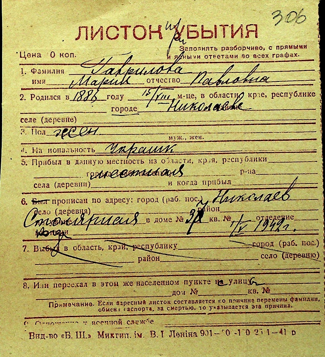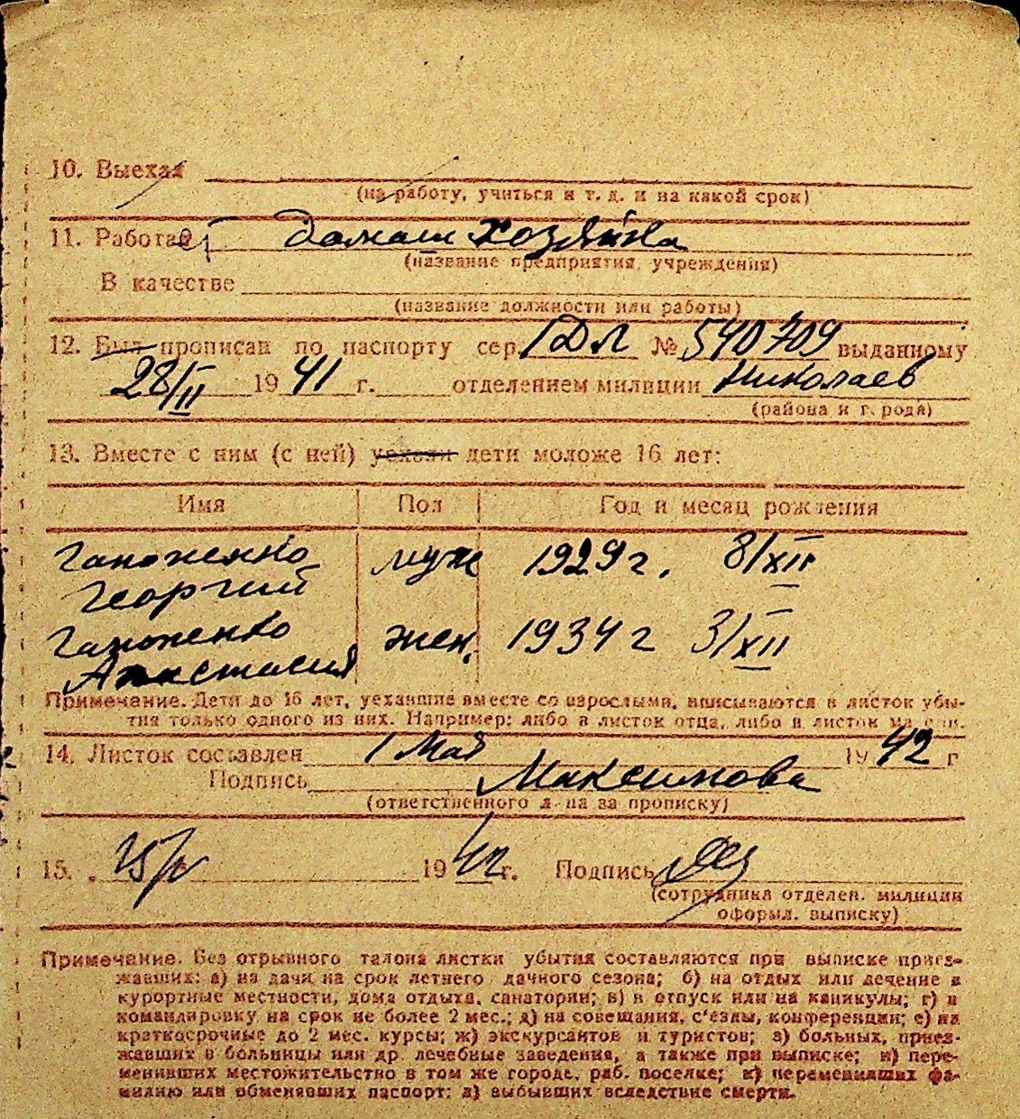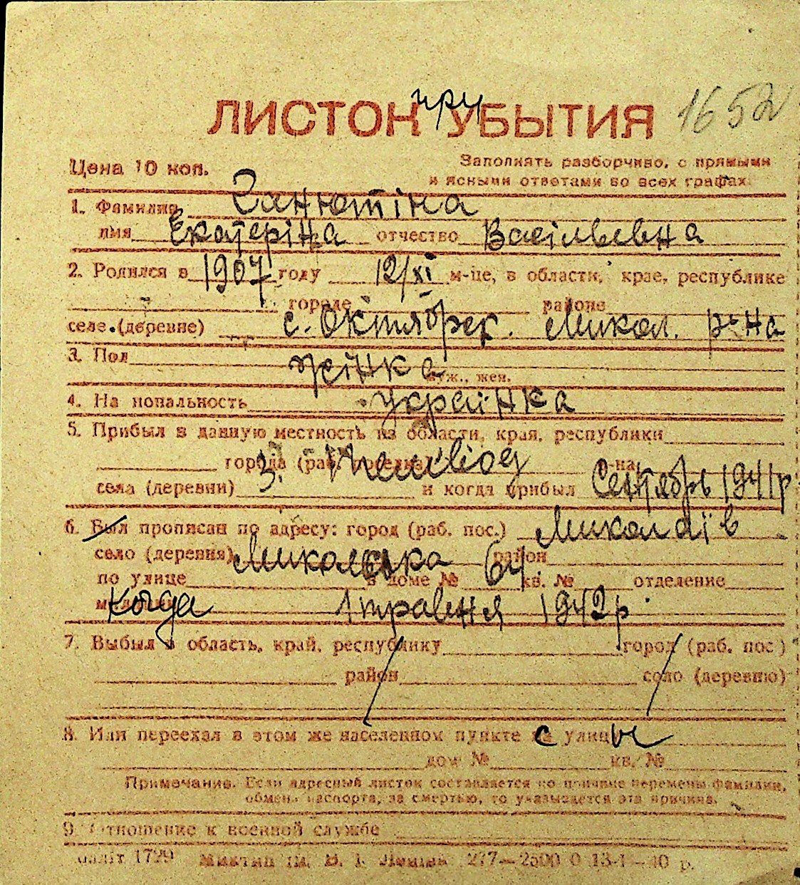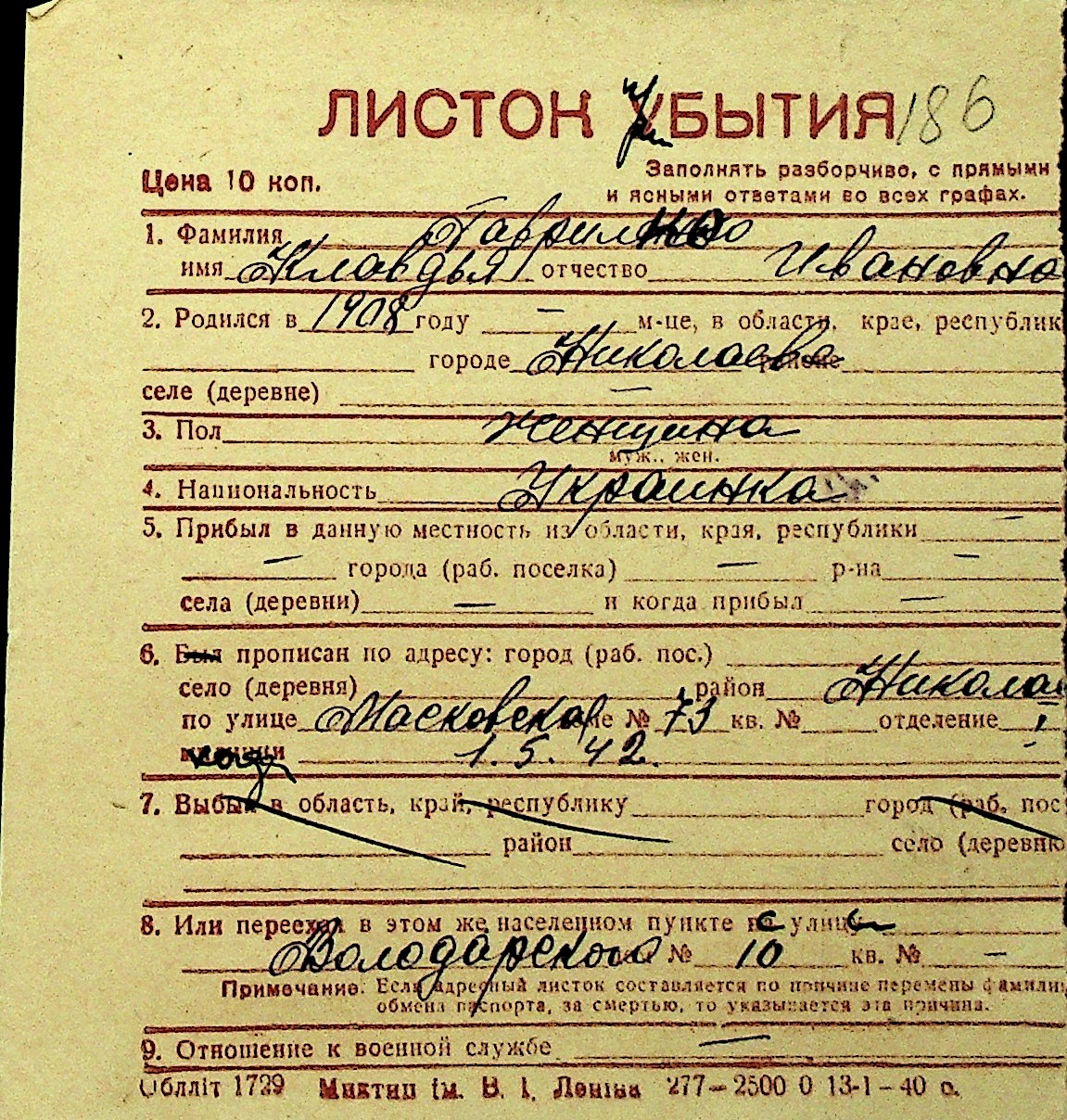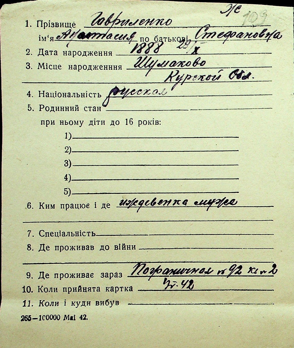 • • Перелік карток до фонду № Н-1016