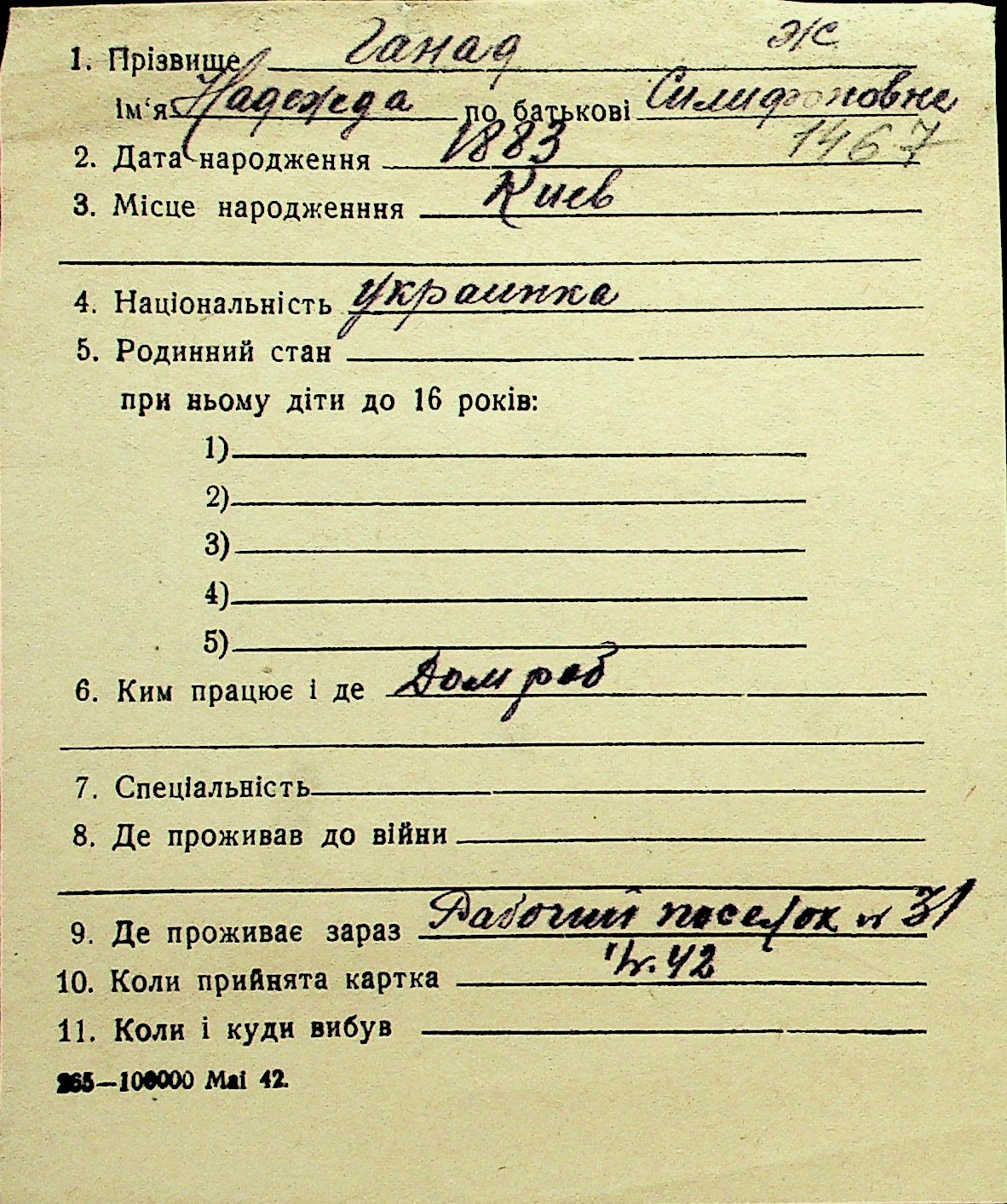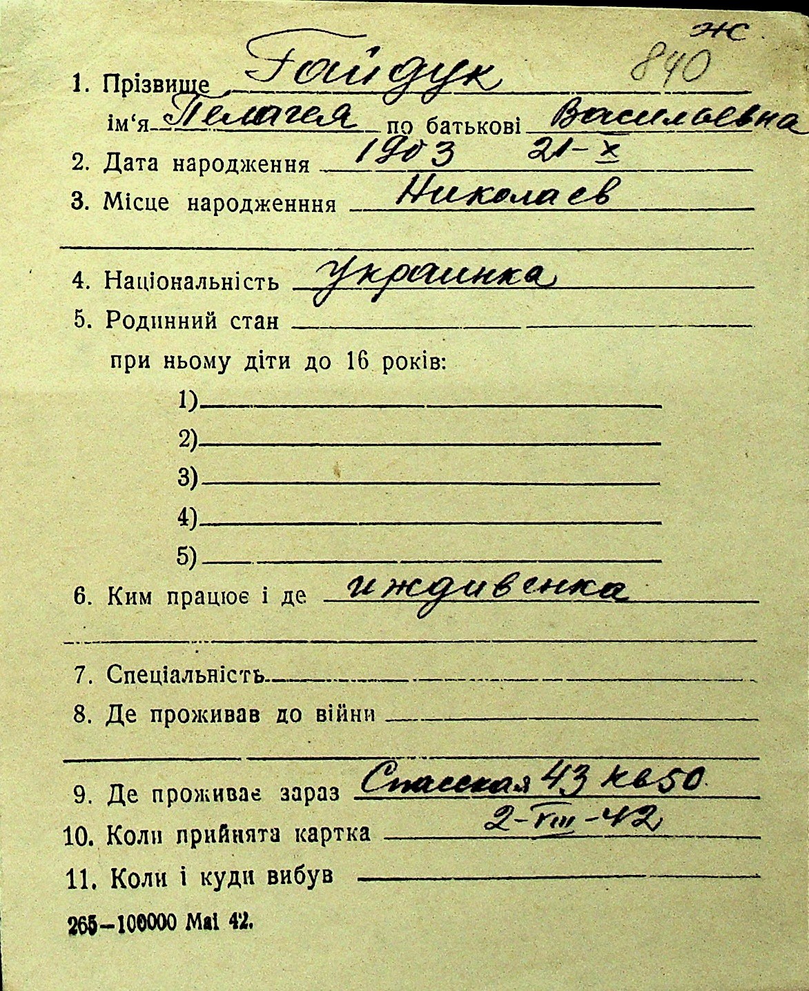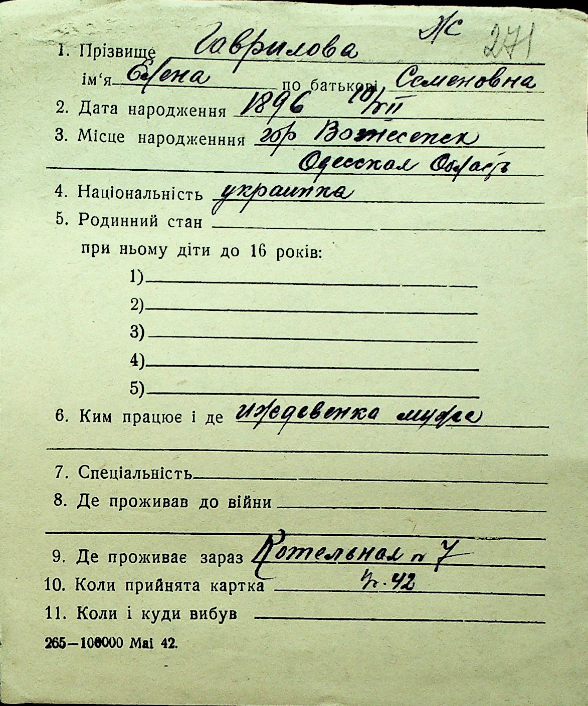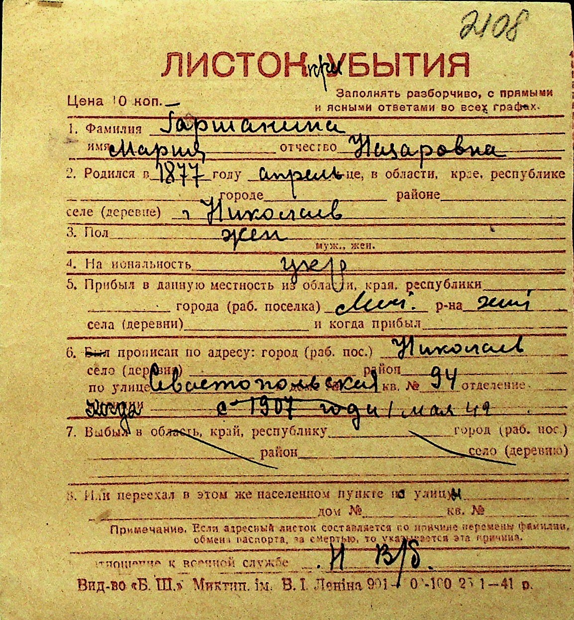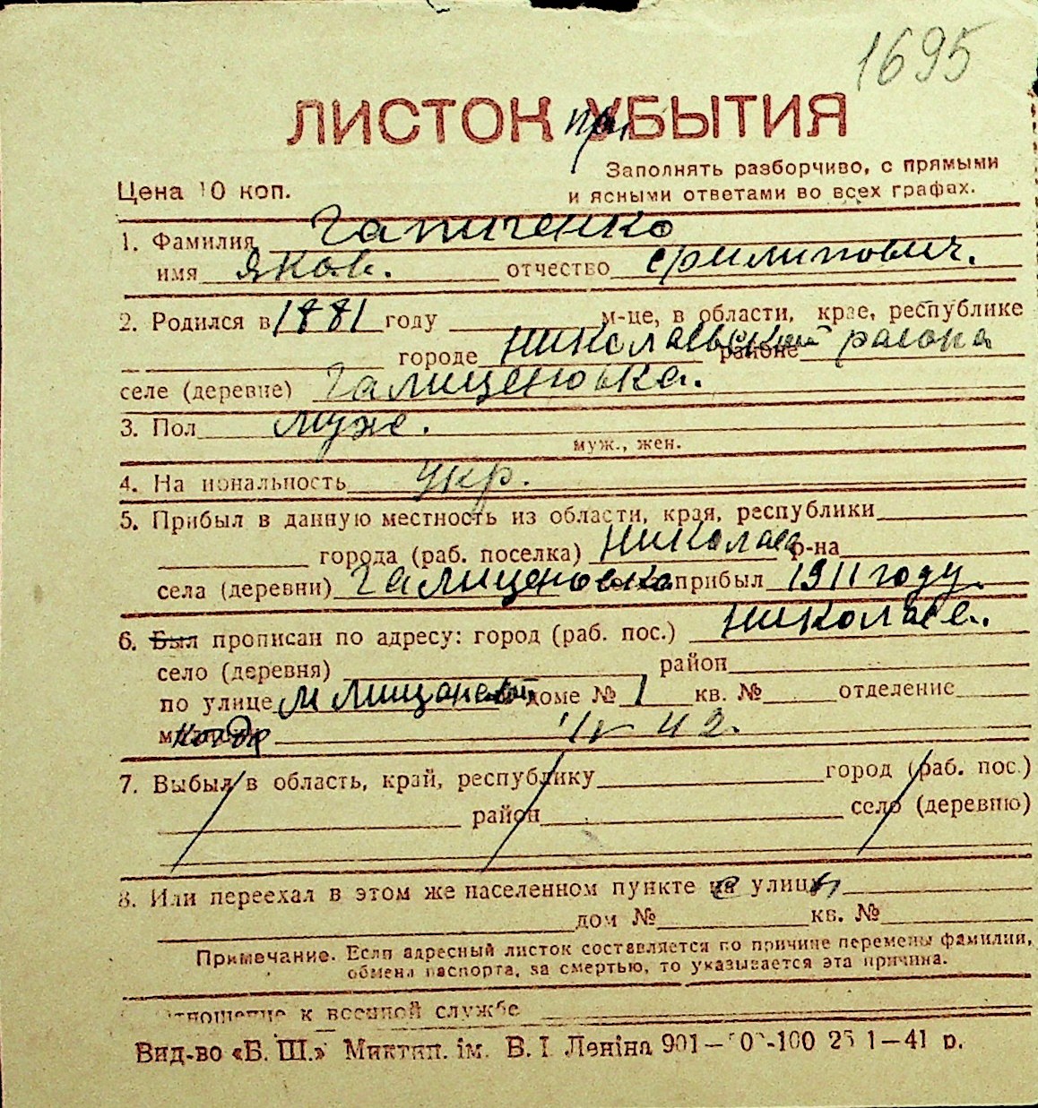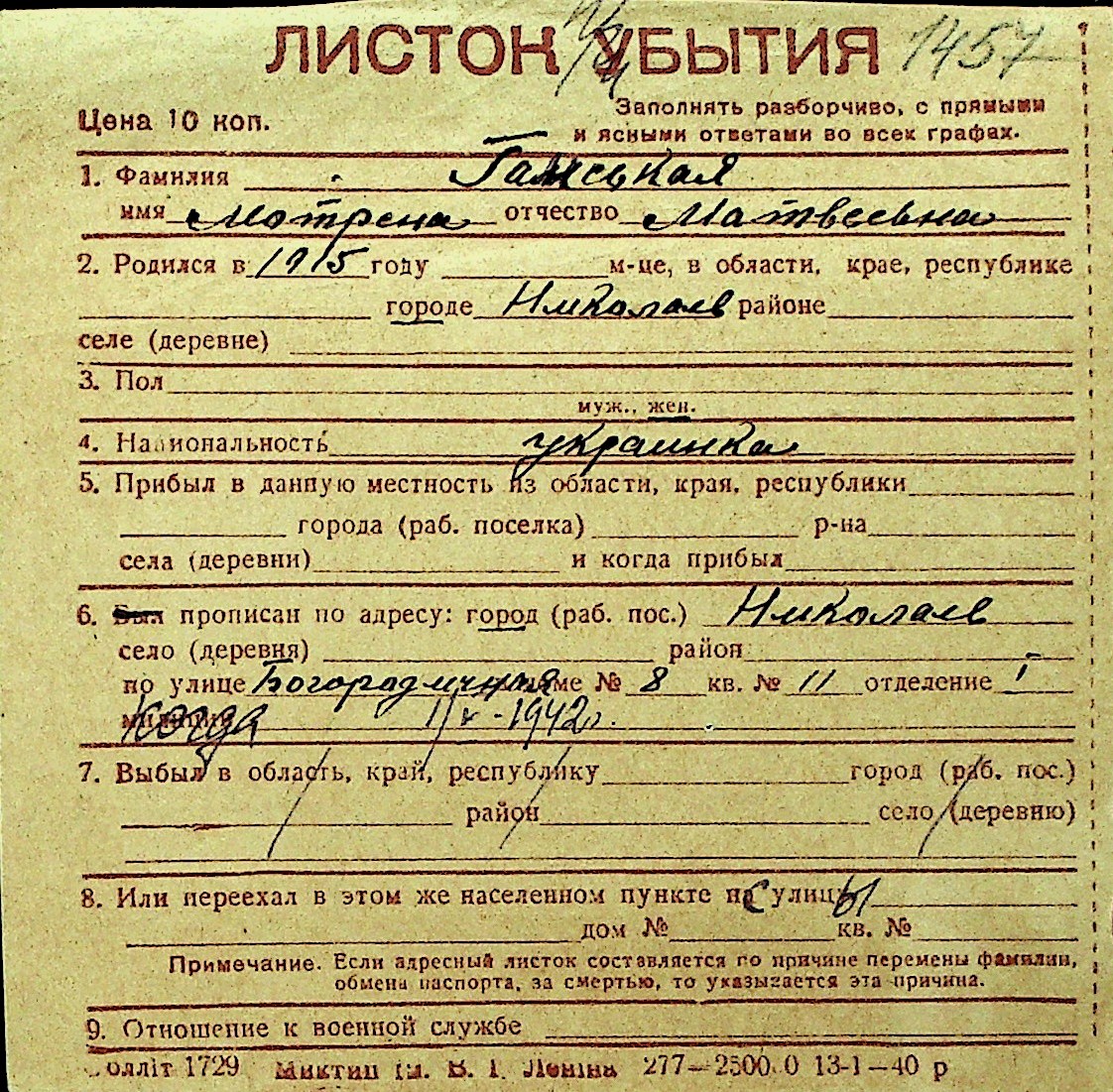 • • Перелік карток до фонду № Н-1016