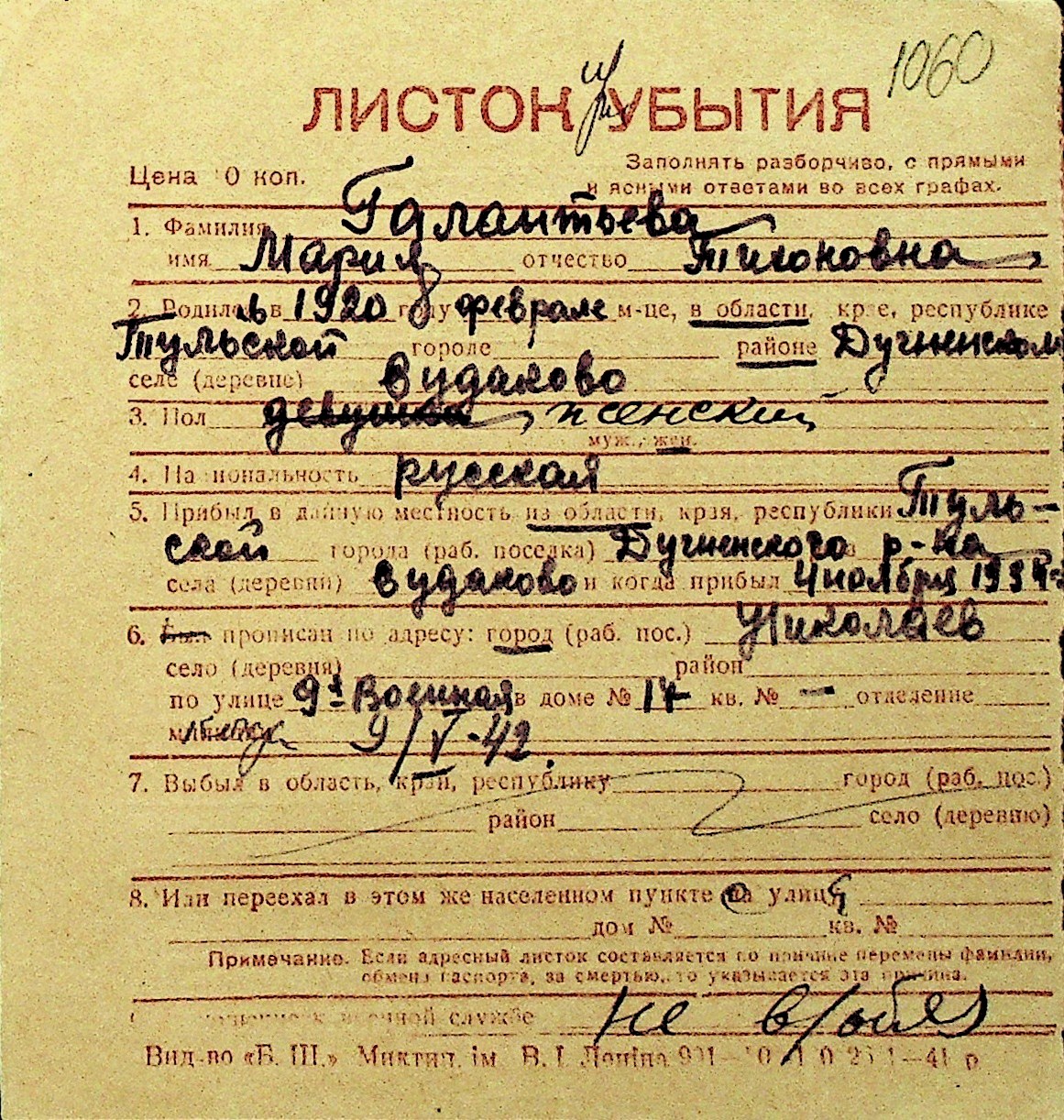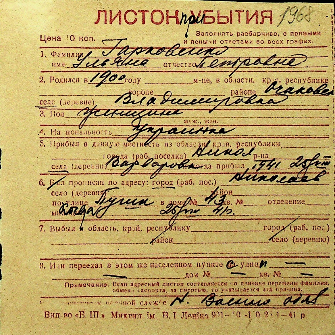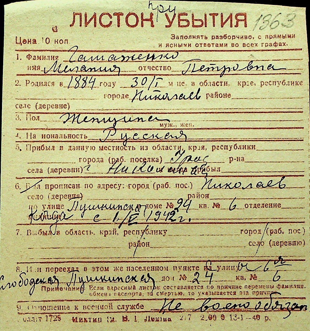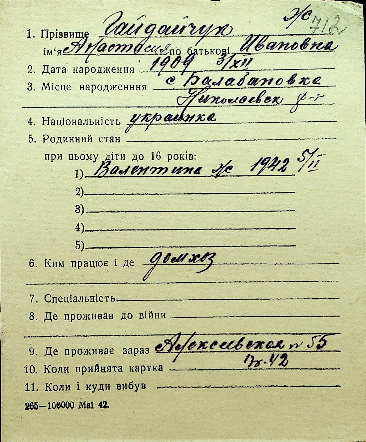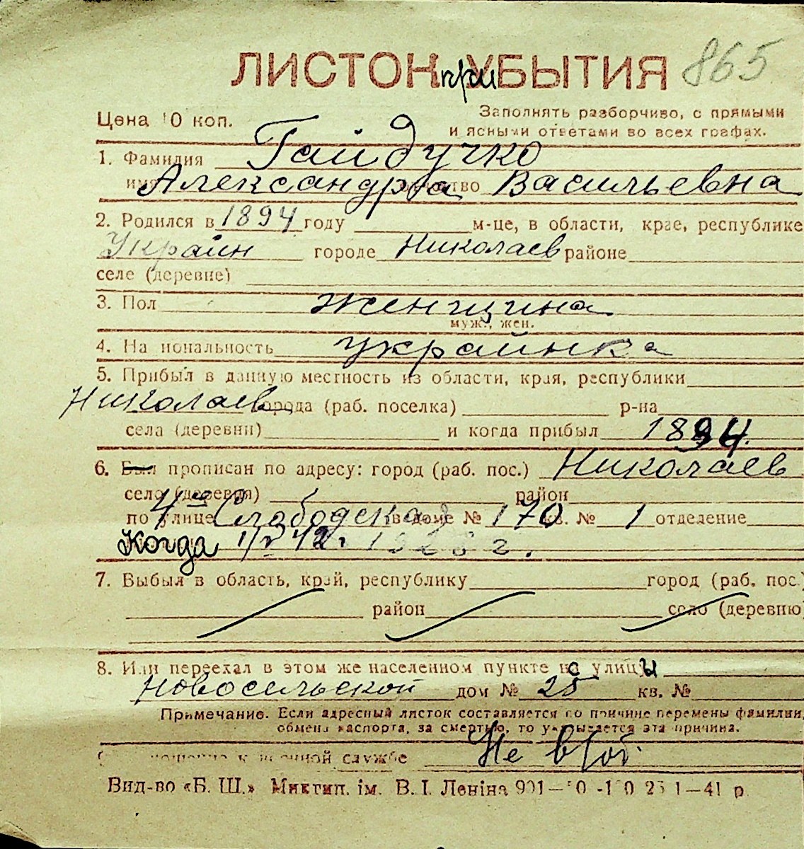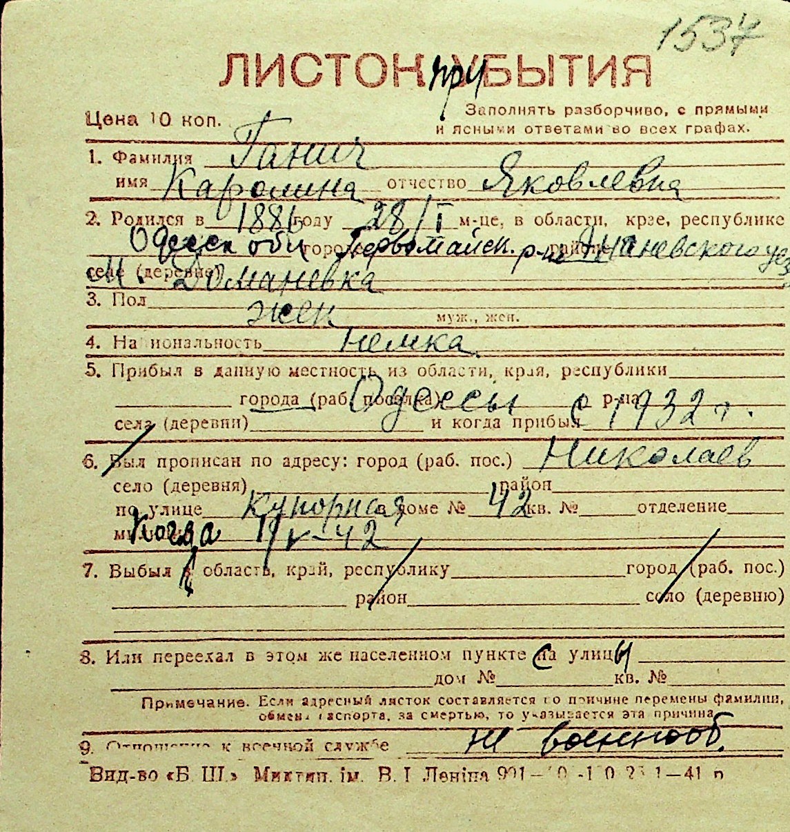 • • Перелік карток до фонду № Н-1016