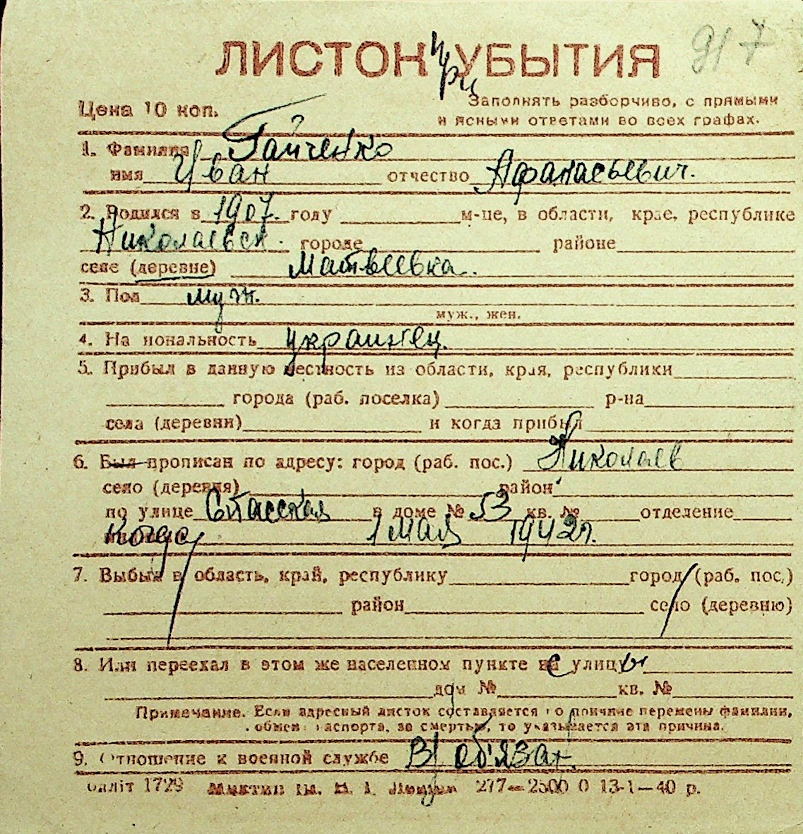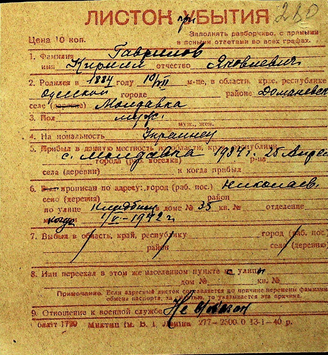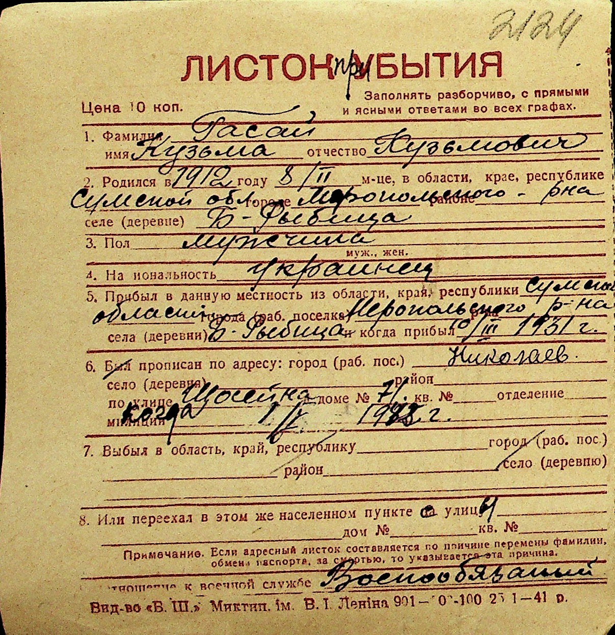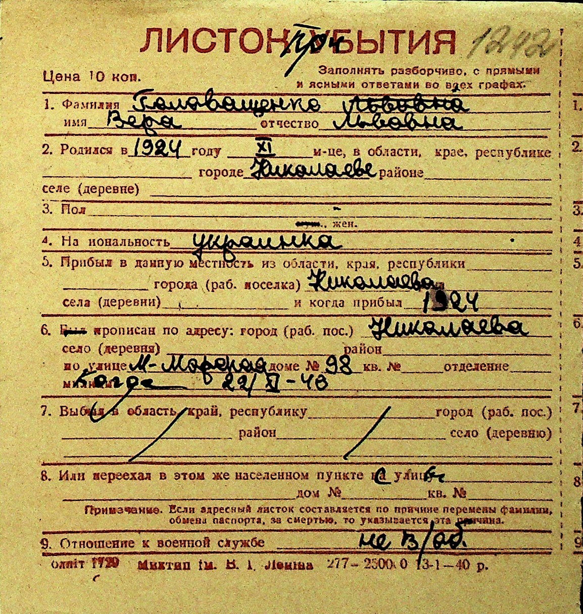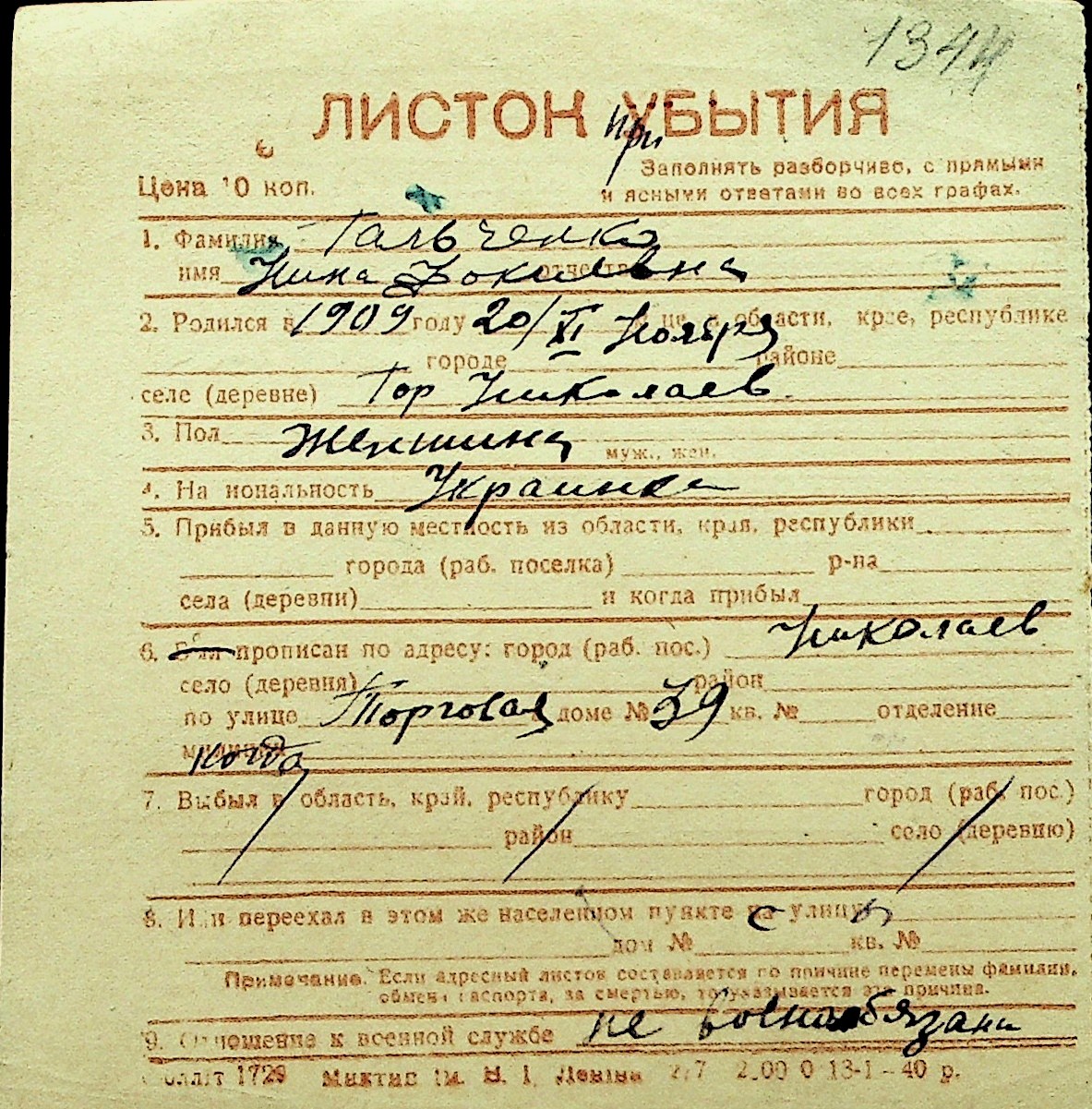 • • Перелік карток до фонду № Н-1016