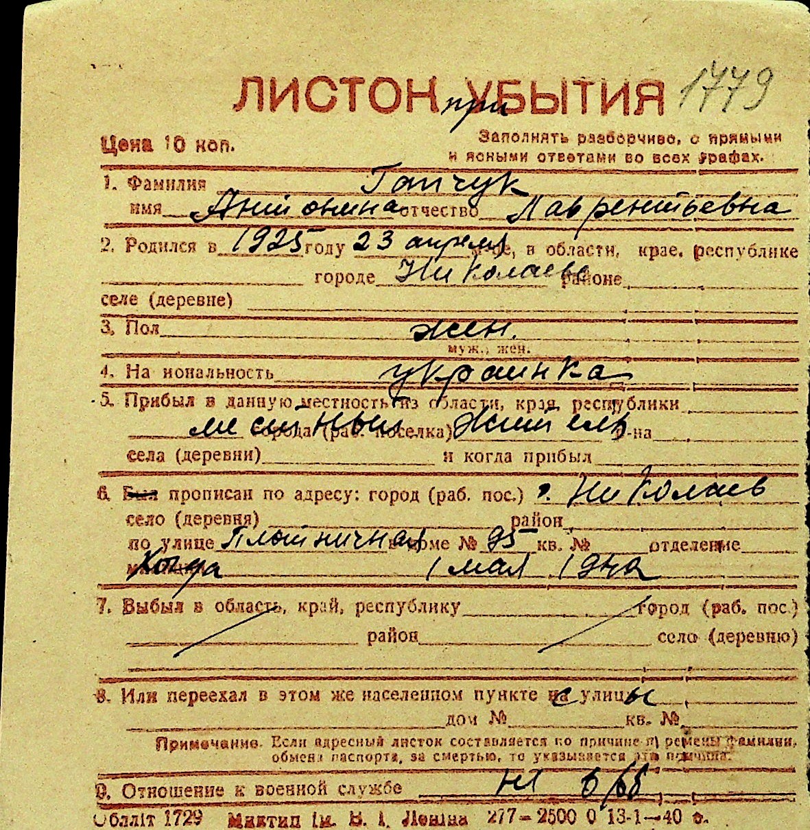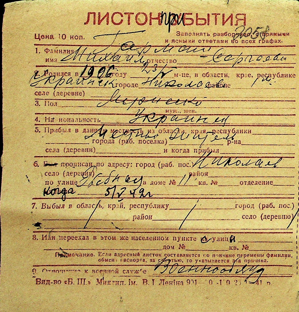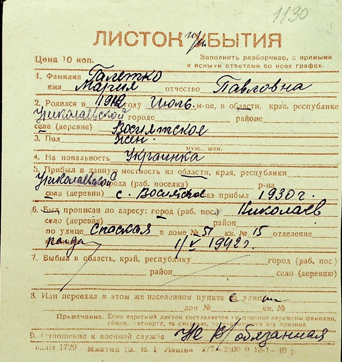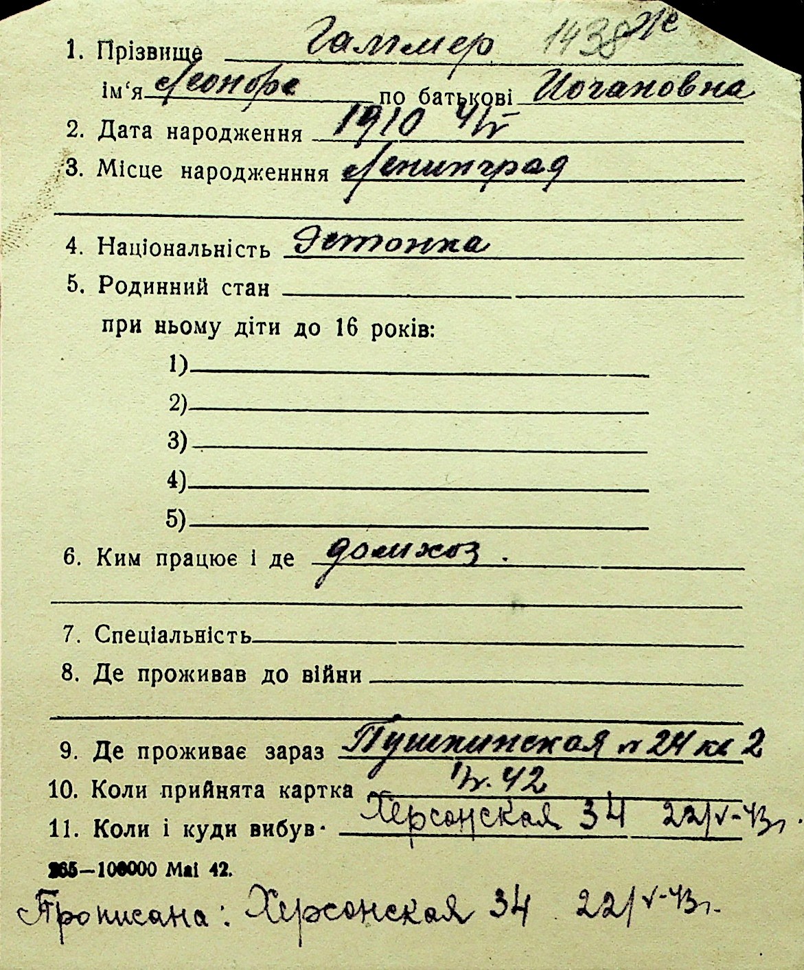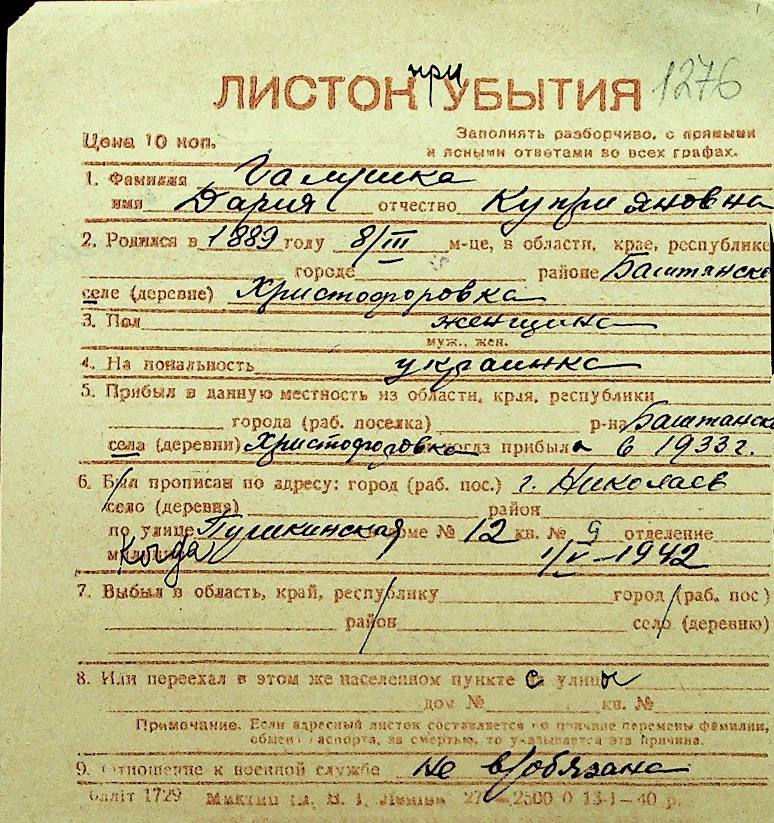 • • Перелік карток до фонду № Н-1016