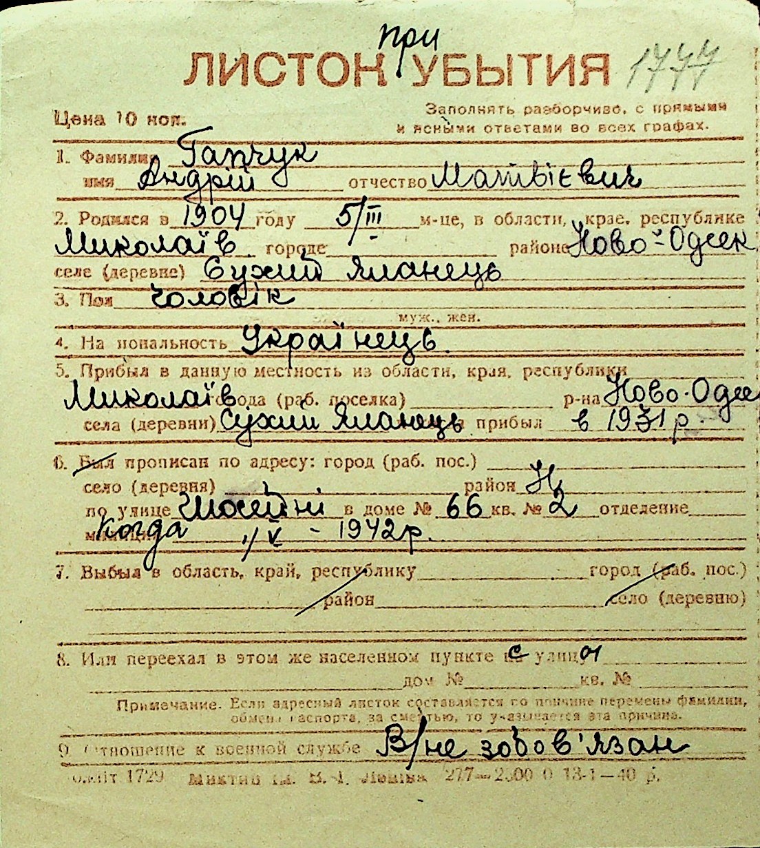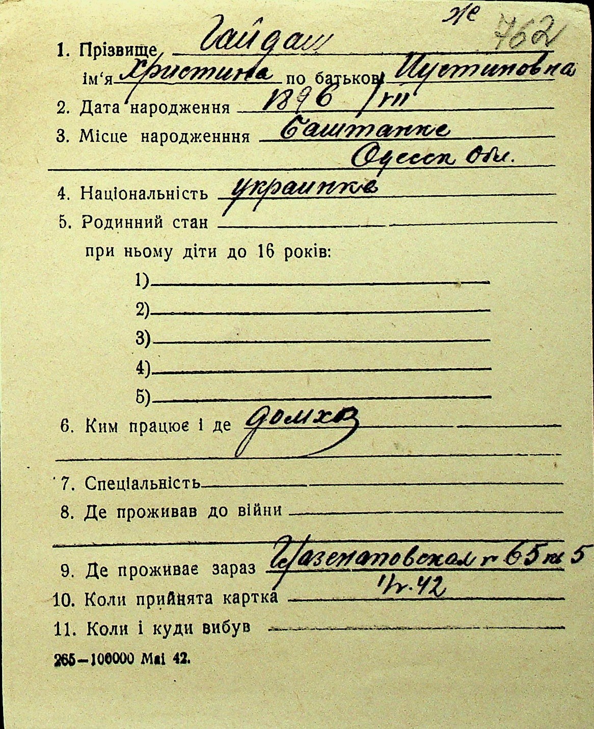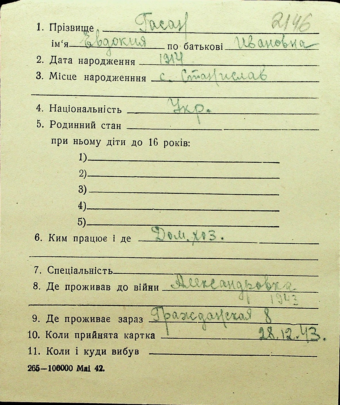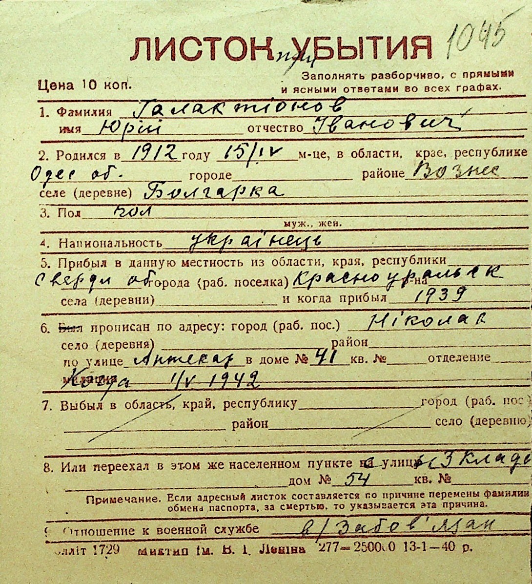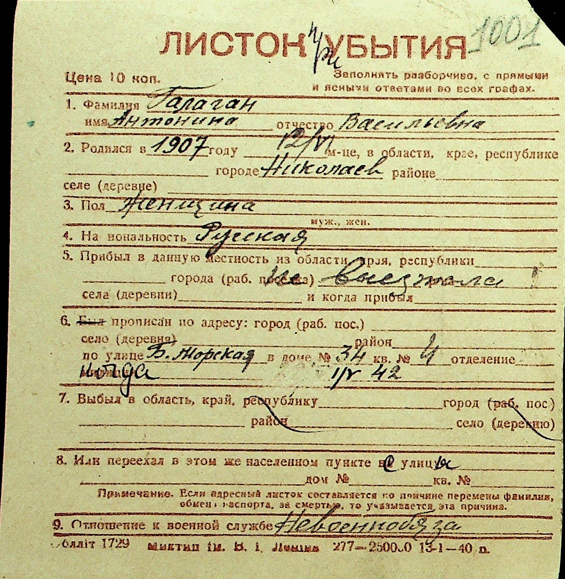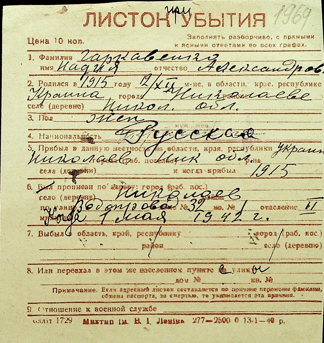 • • Перелік карток до фонду № Н-1016