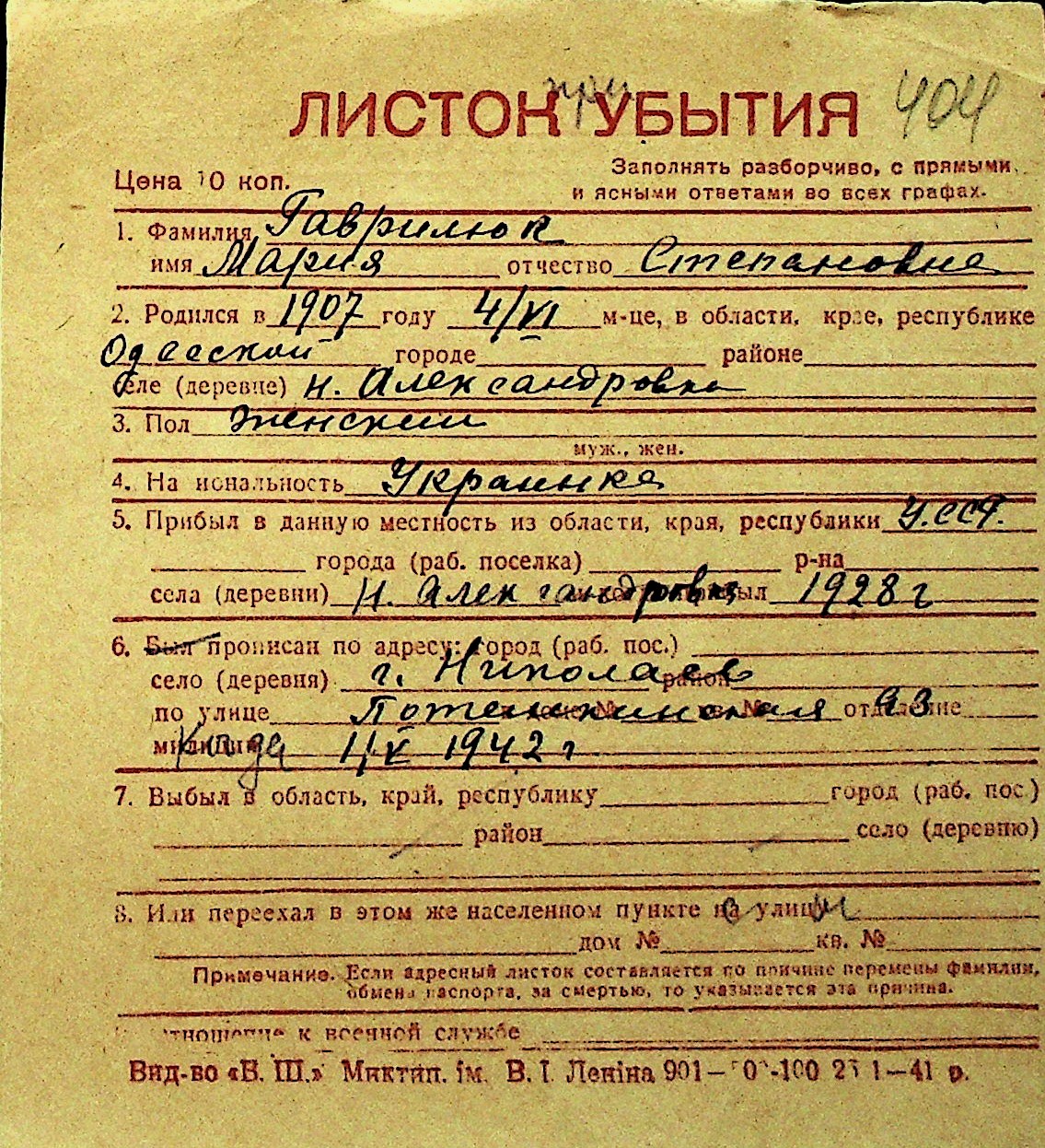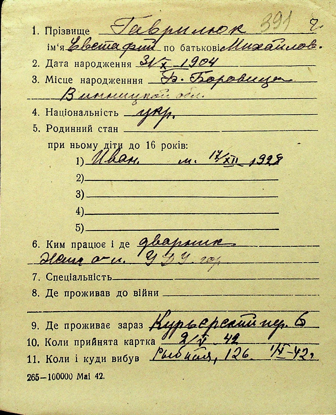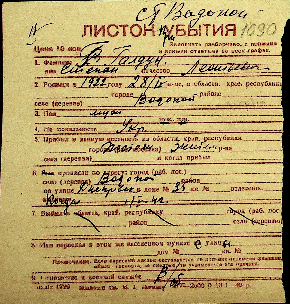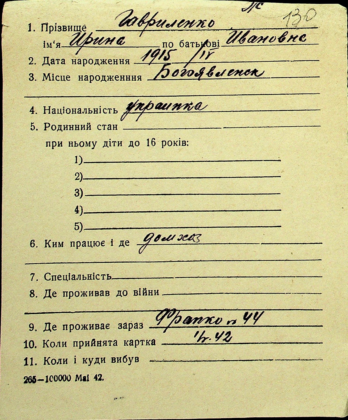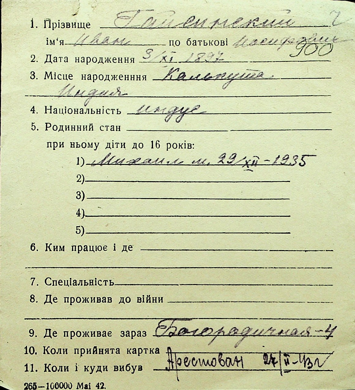 • • Перелік карток до фонду № Н-1016