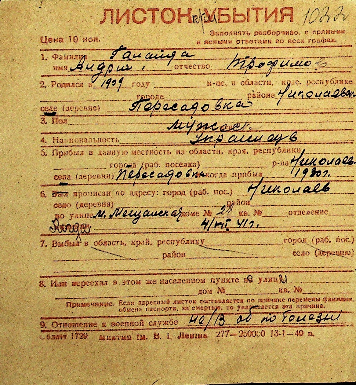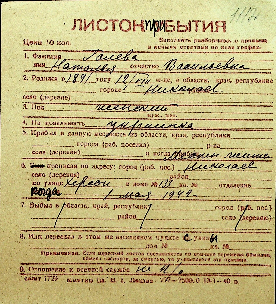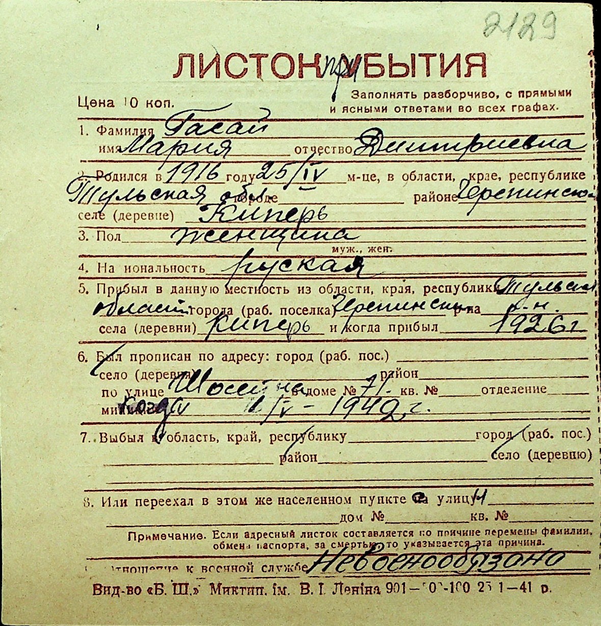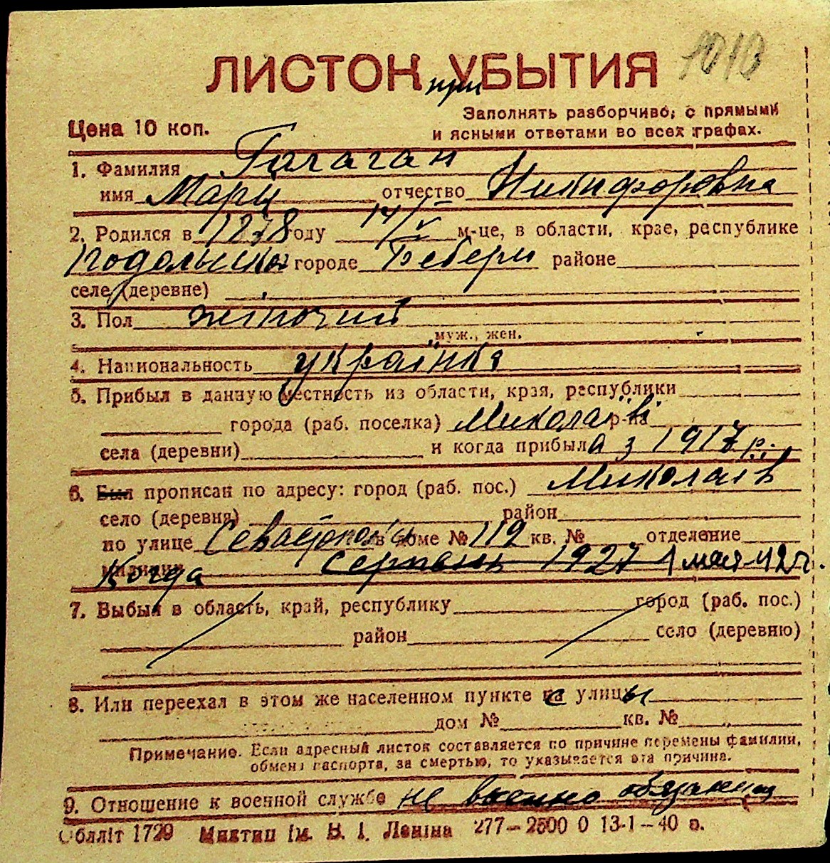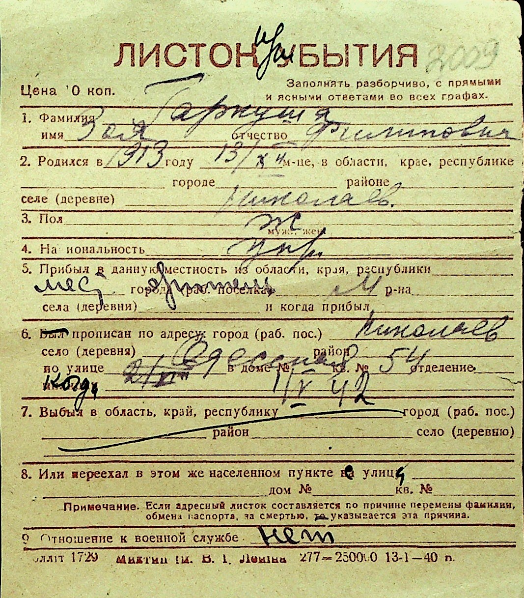 • • Перелік карток до фонду № Н-1016