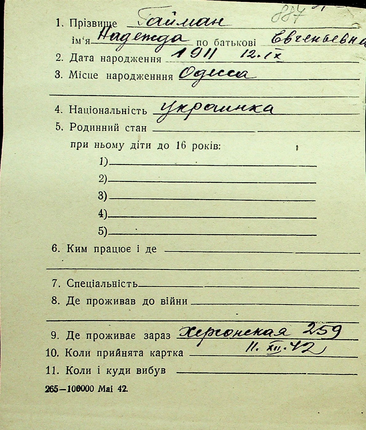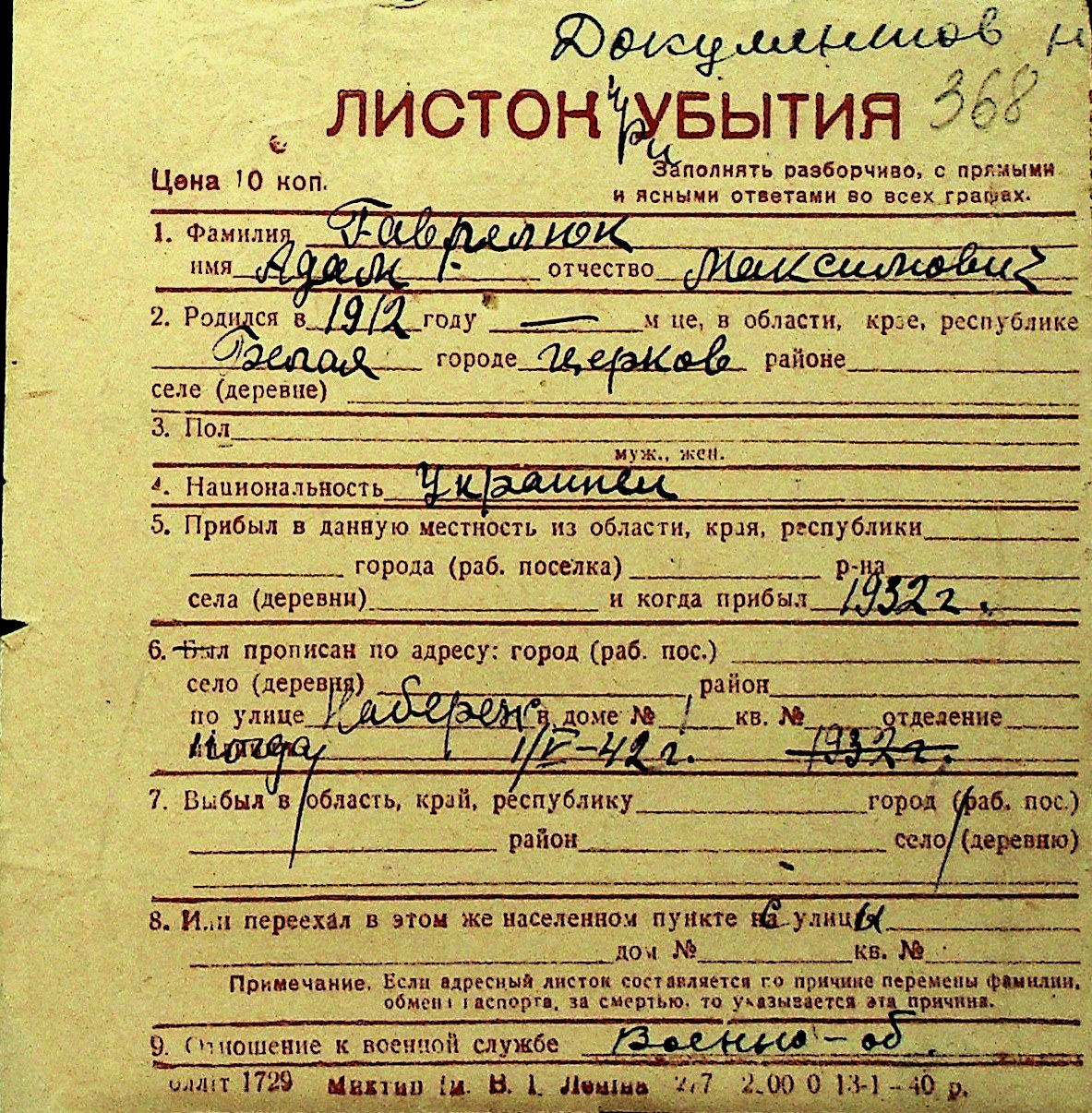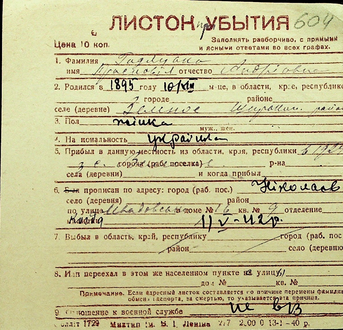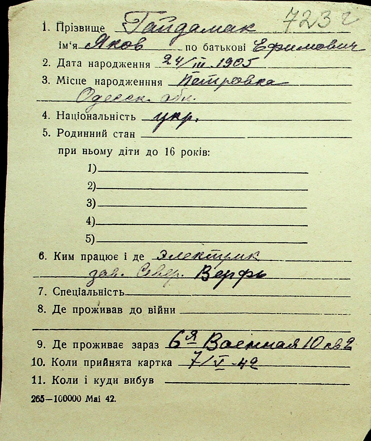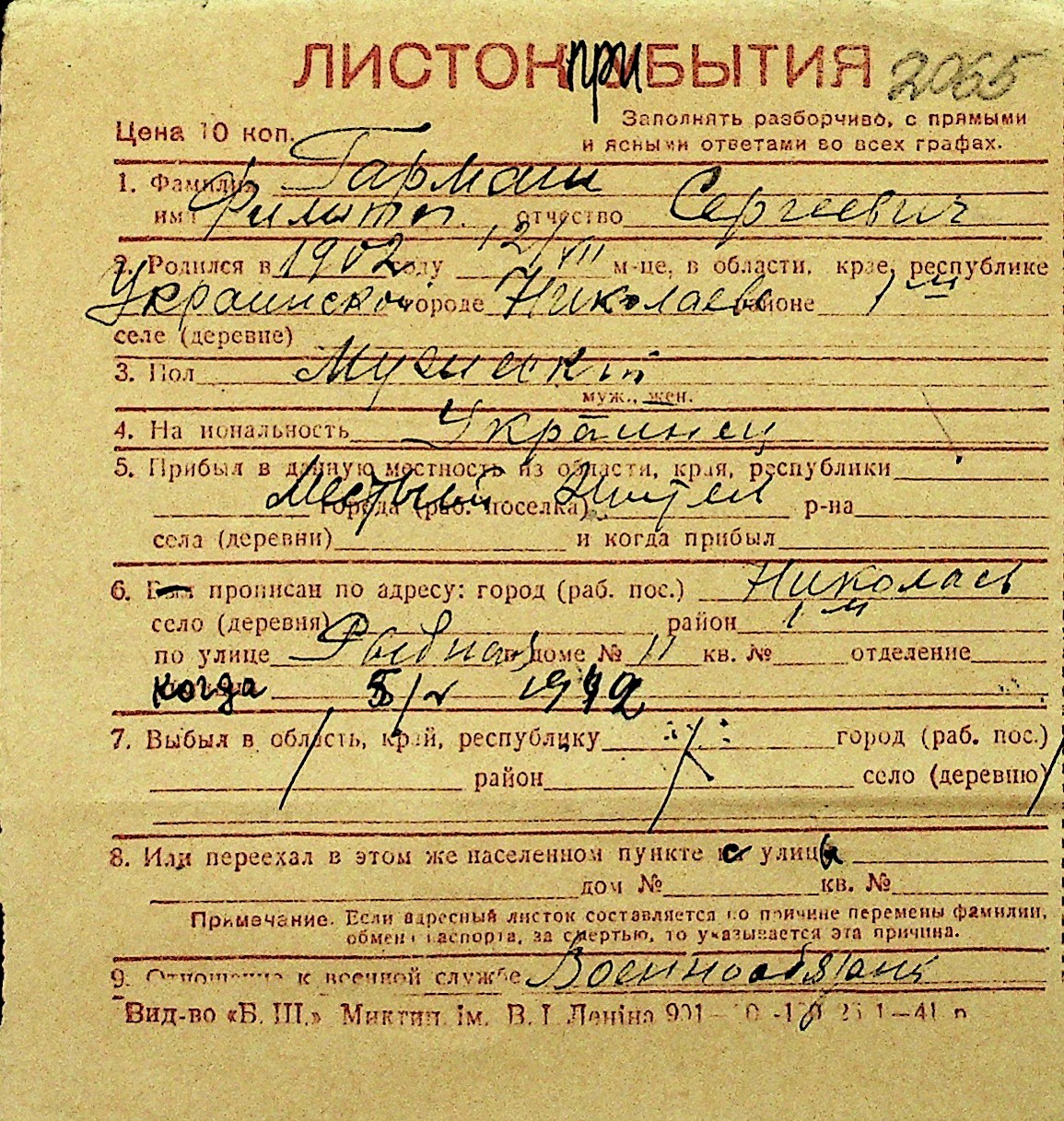 • • Перелік карток до фонду № Н-1016
