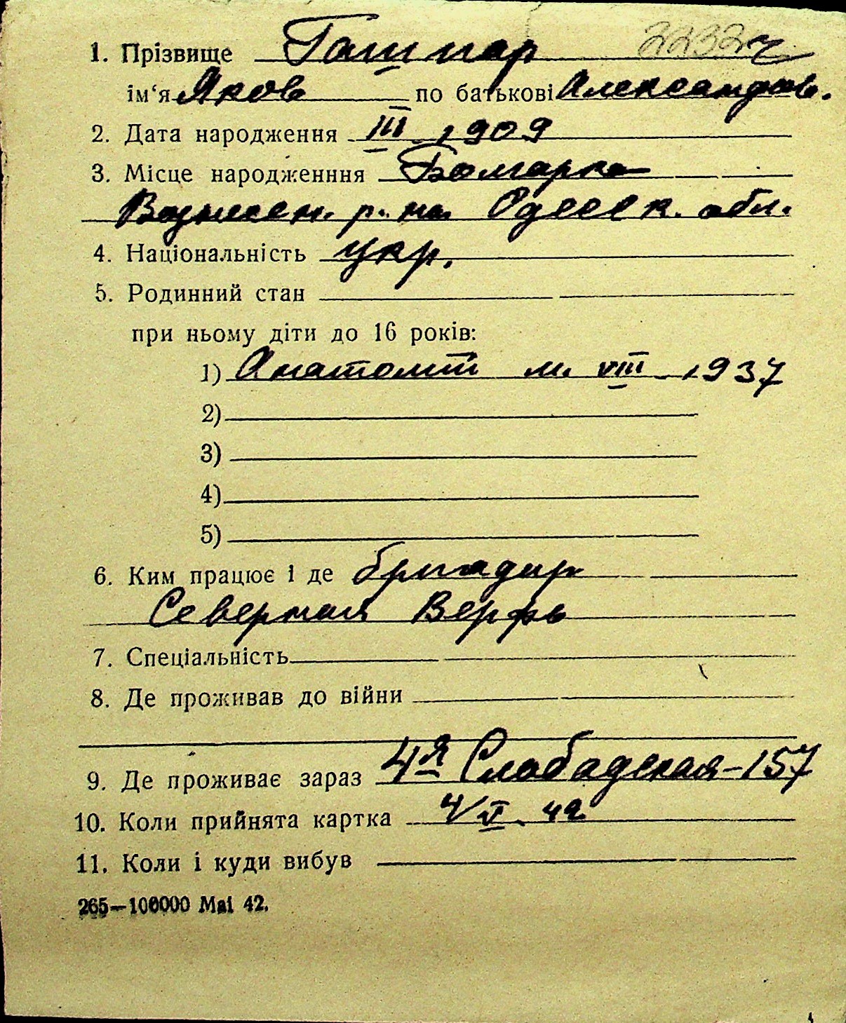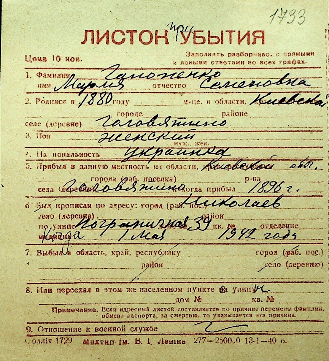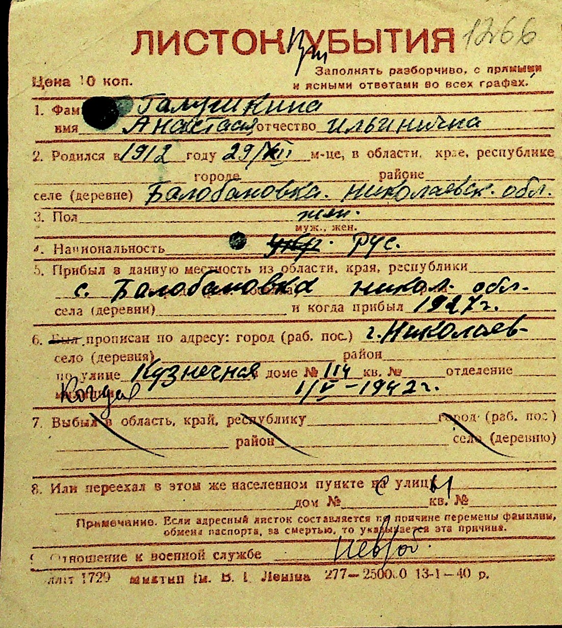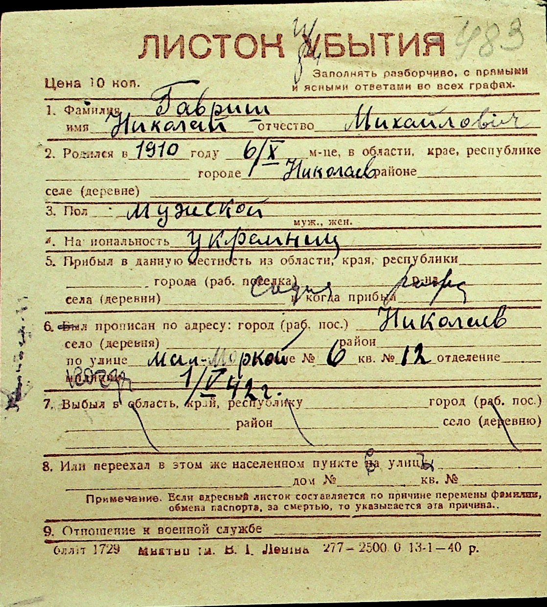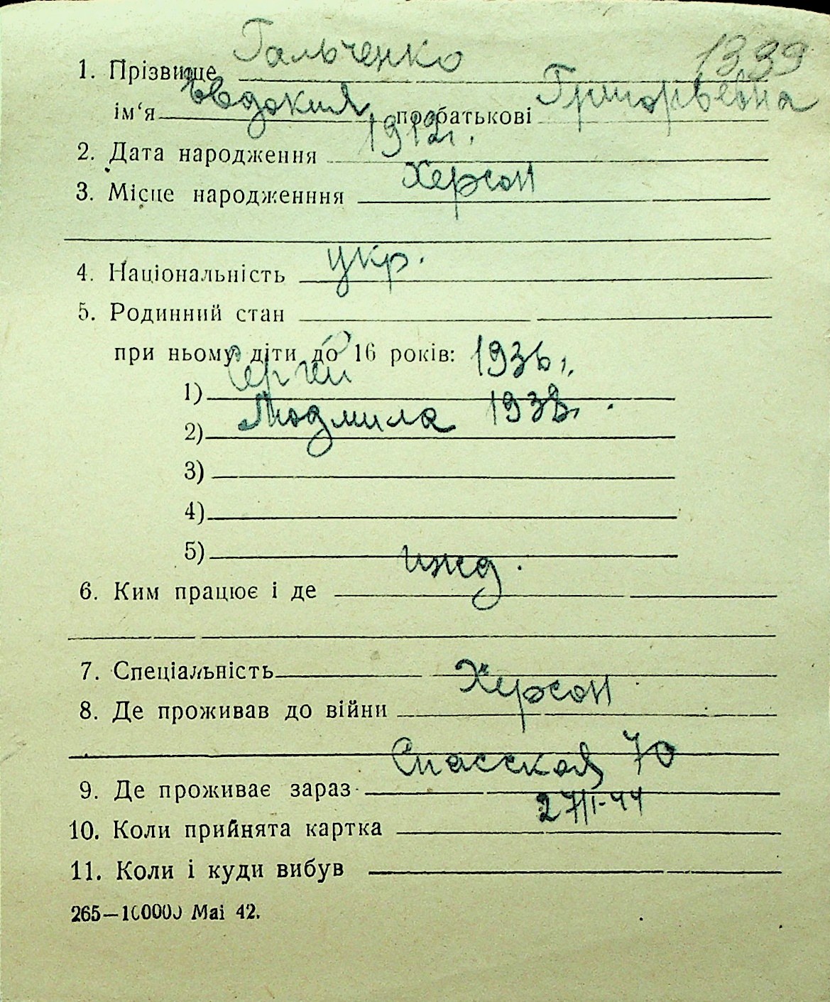 • • Перелік карток до фонду № Н-1016