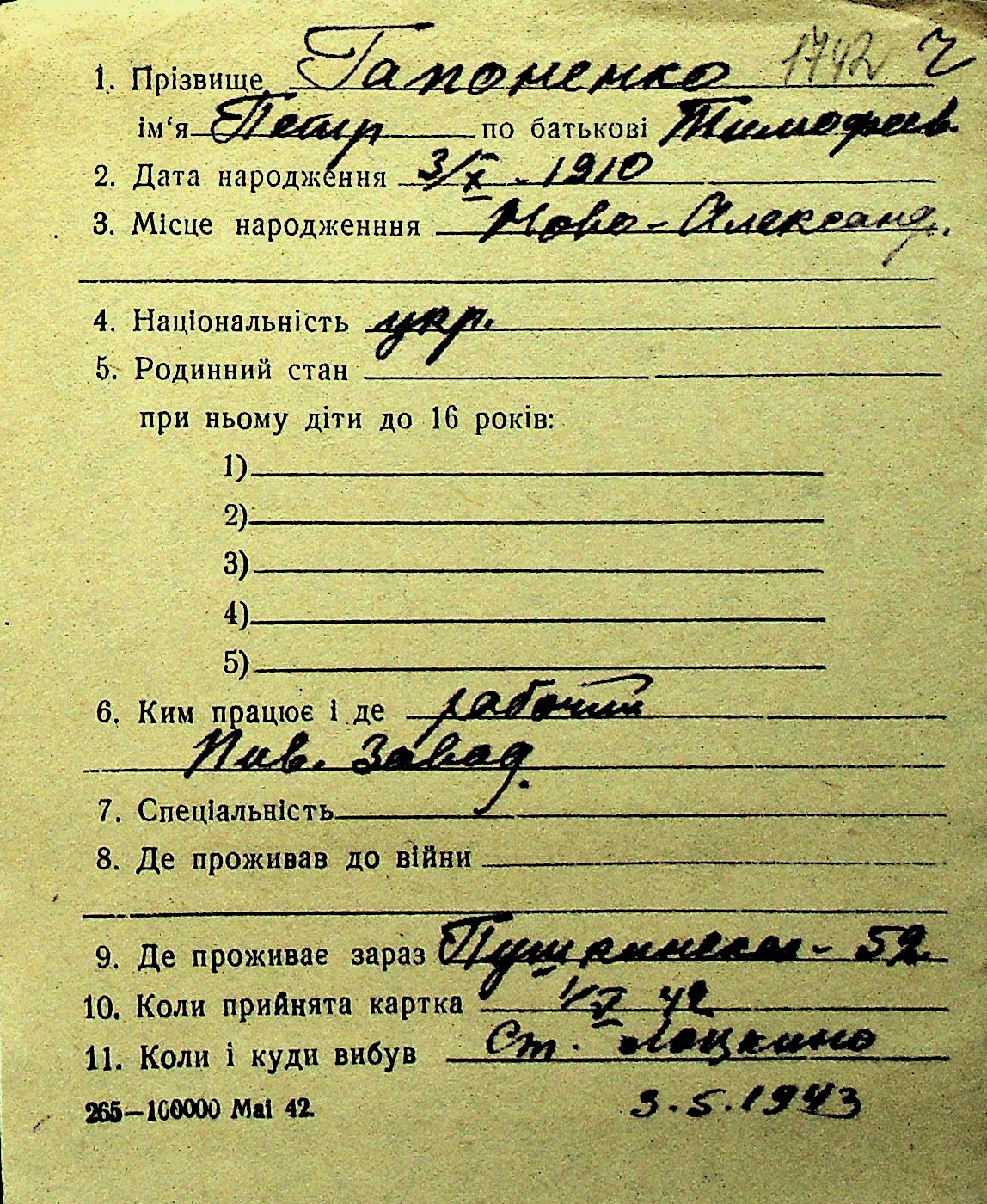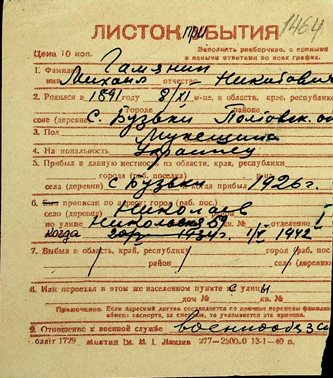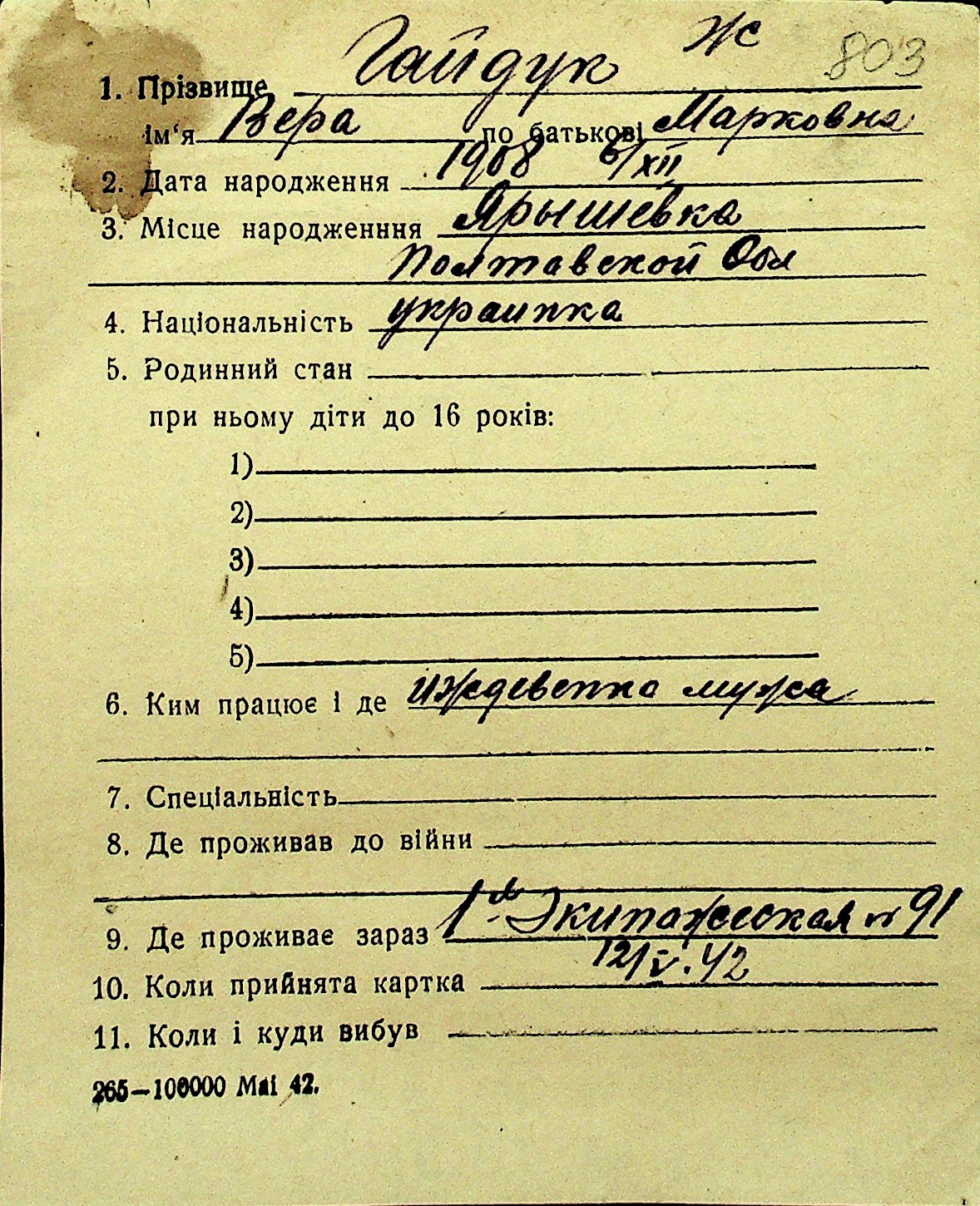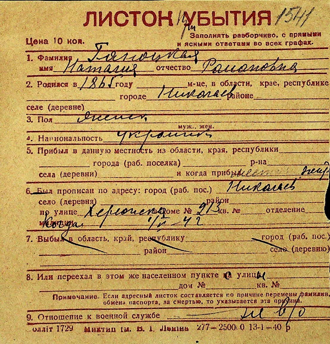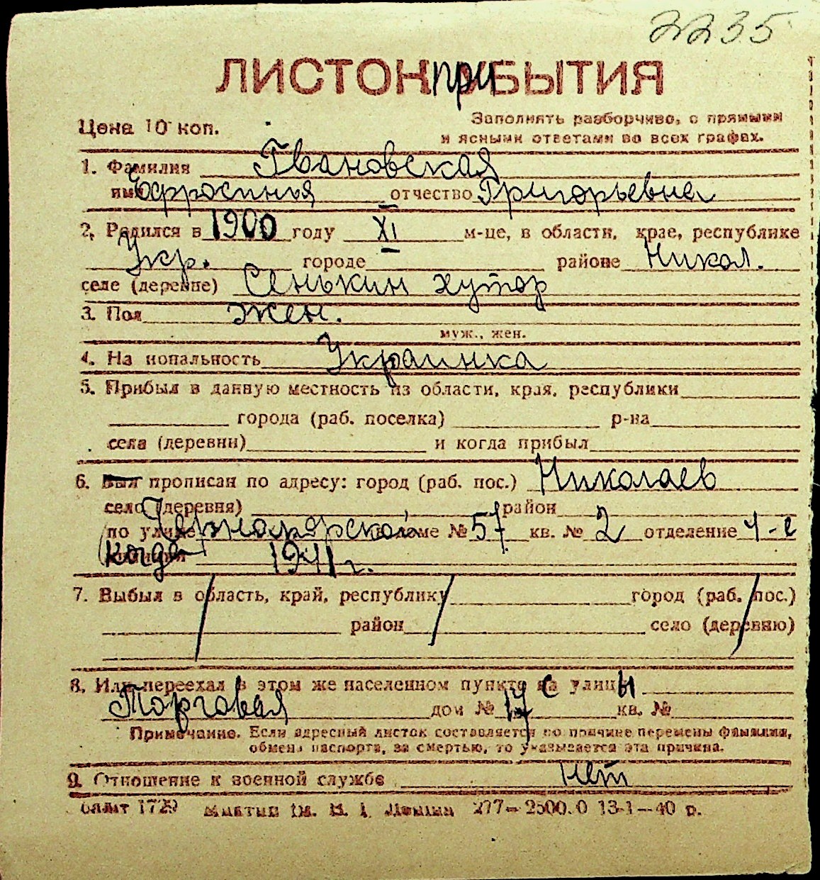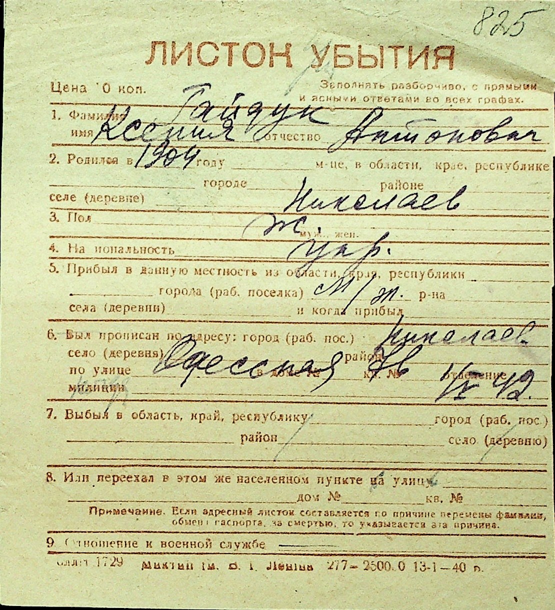 • • Перелік карток до фонду № Н-1016