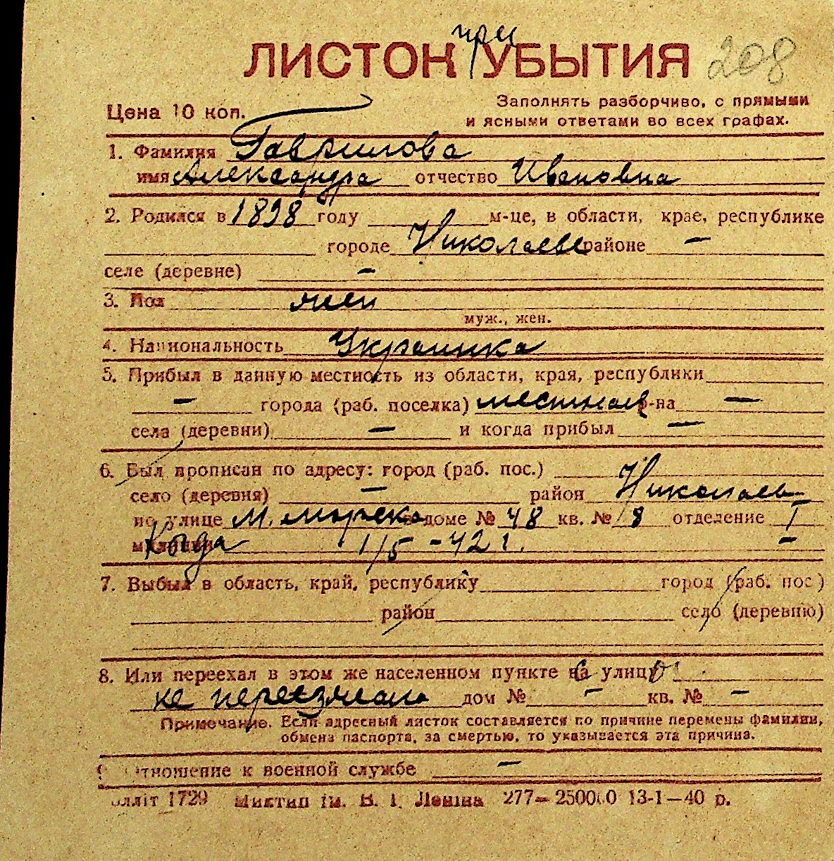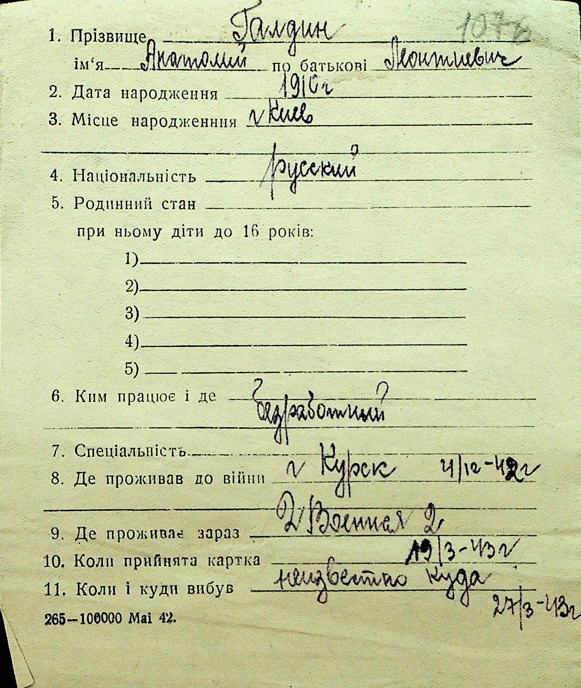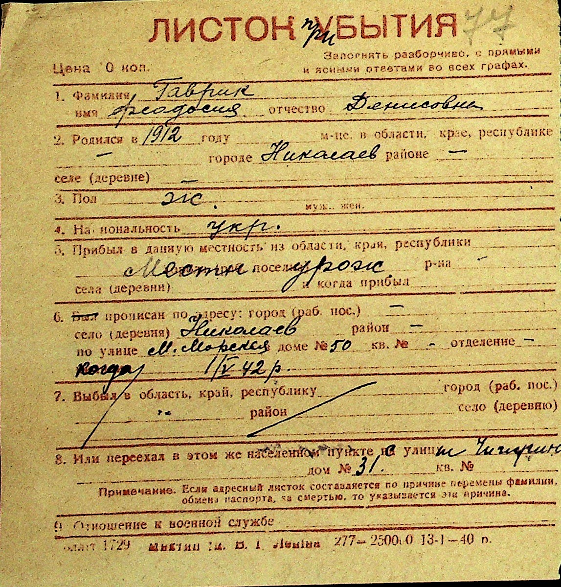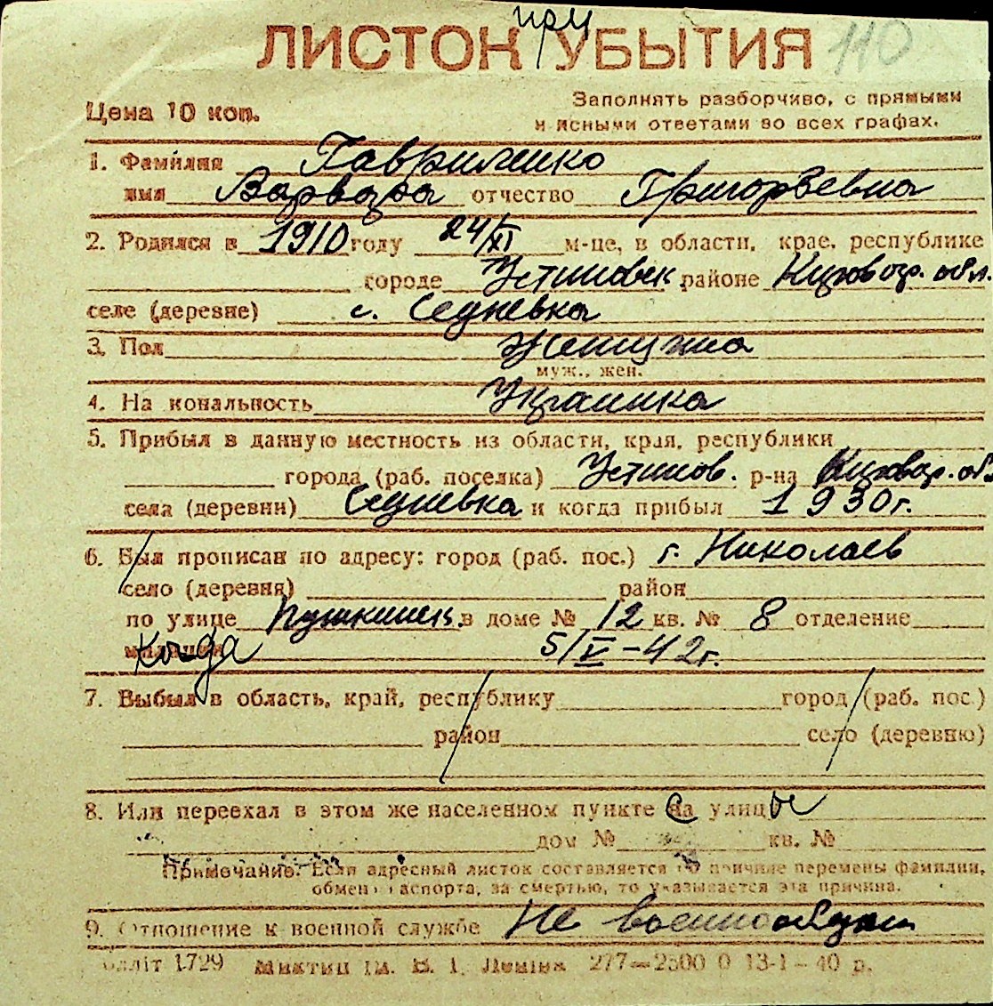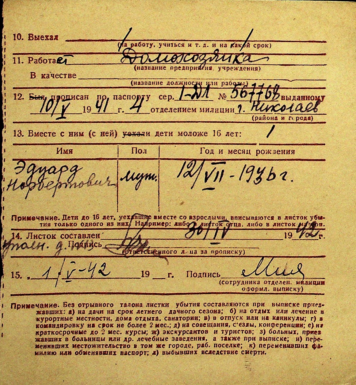 • • Перелік карток до фонду № Н-1016