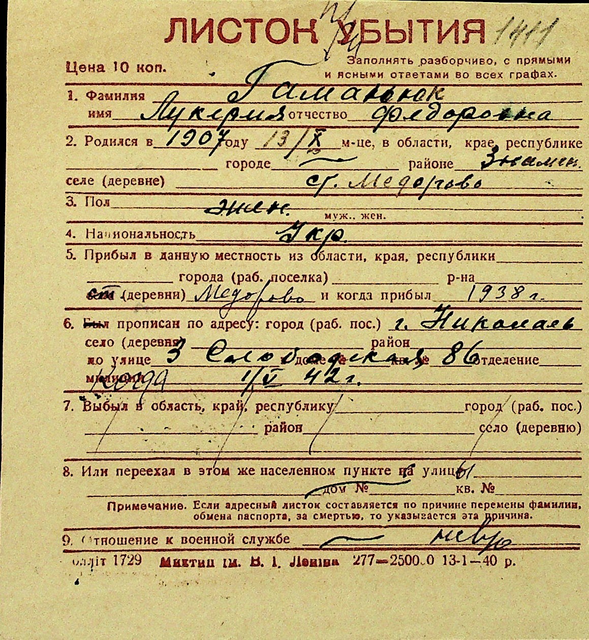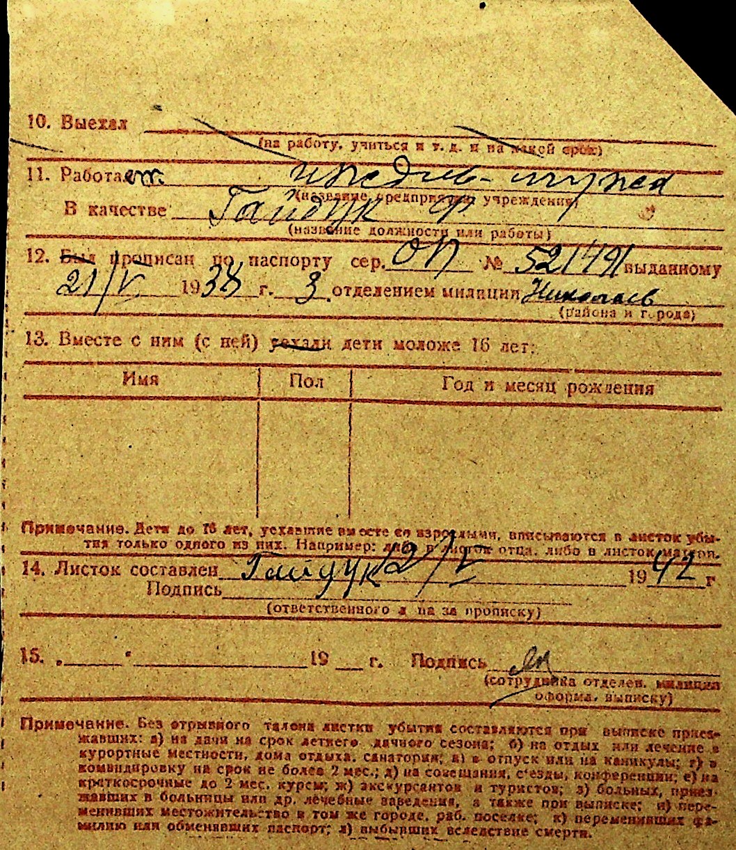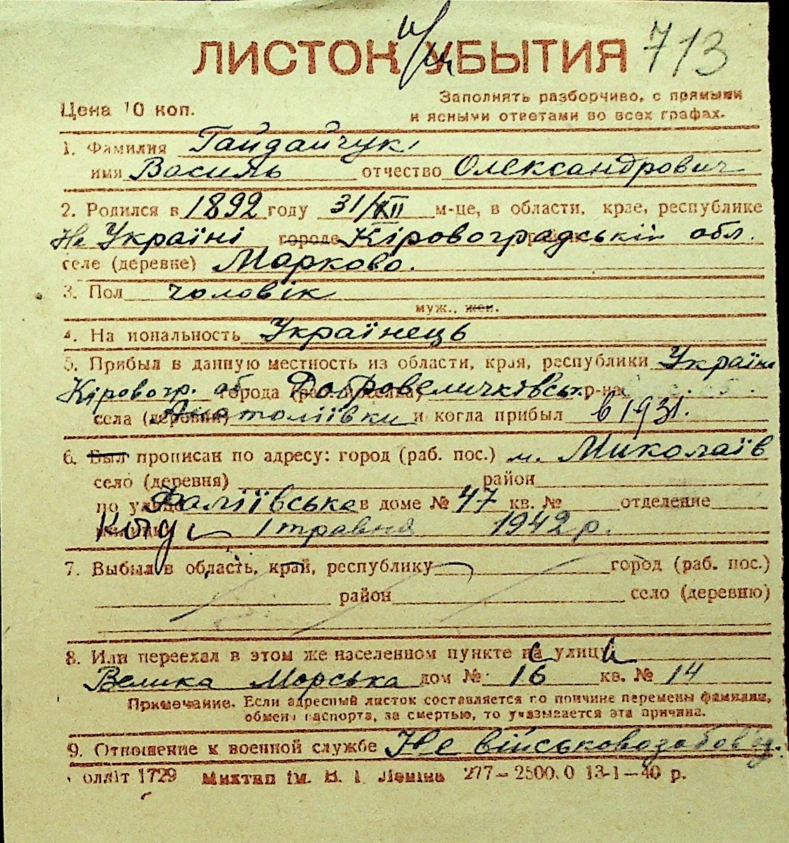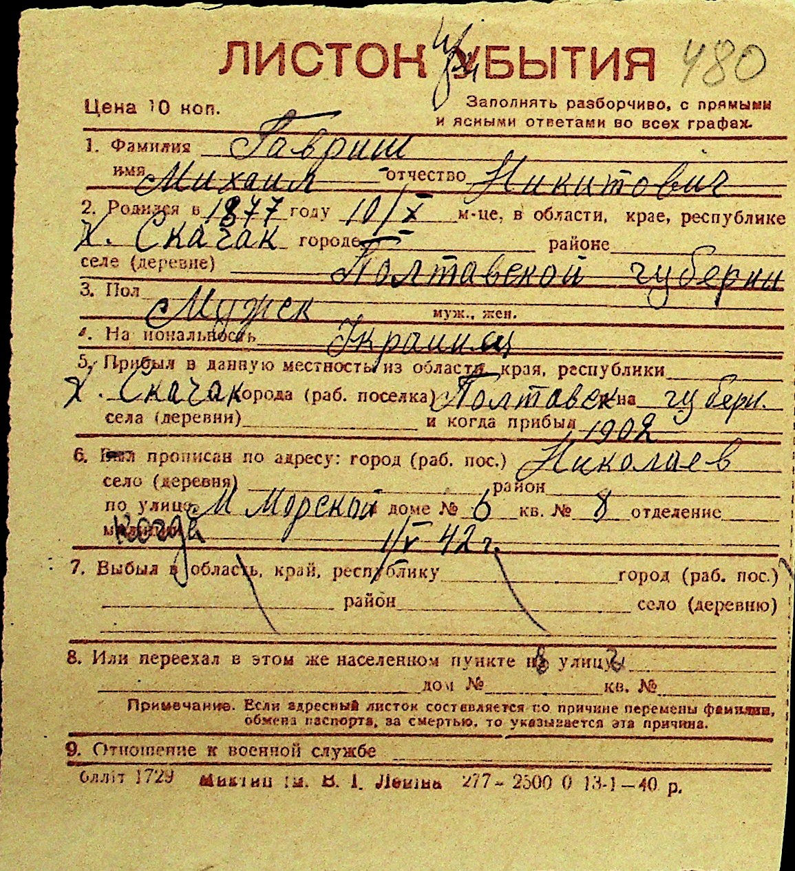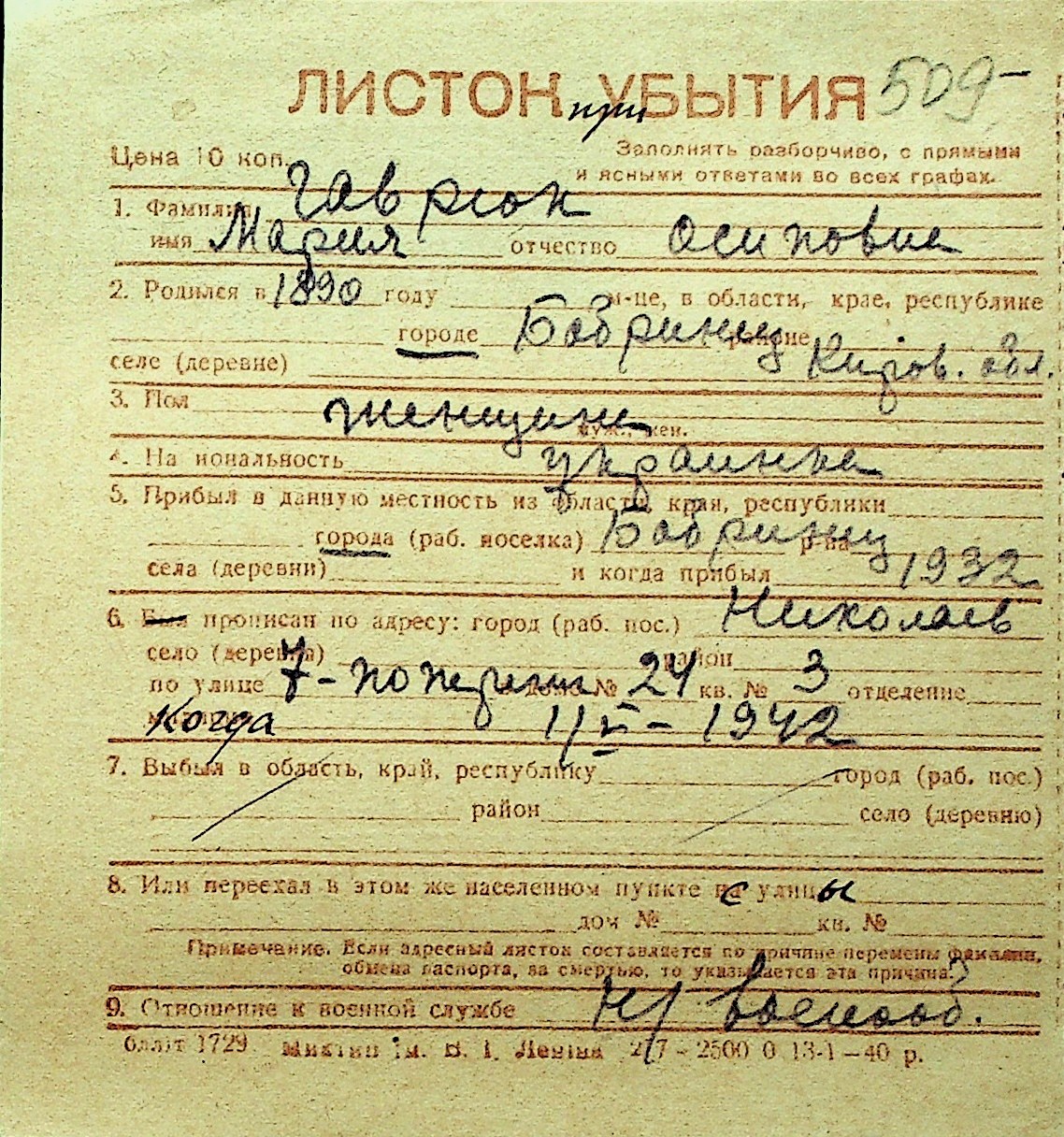 • • Перелік карток до фонду № Н-1016