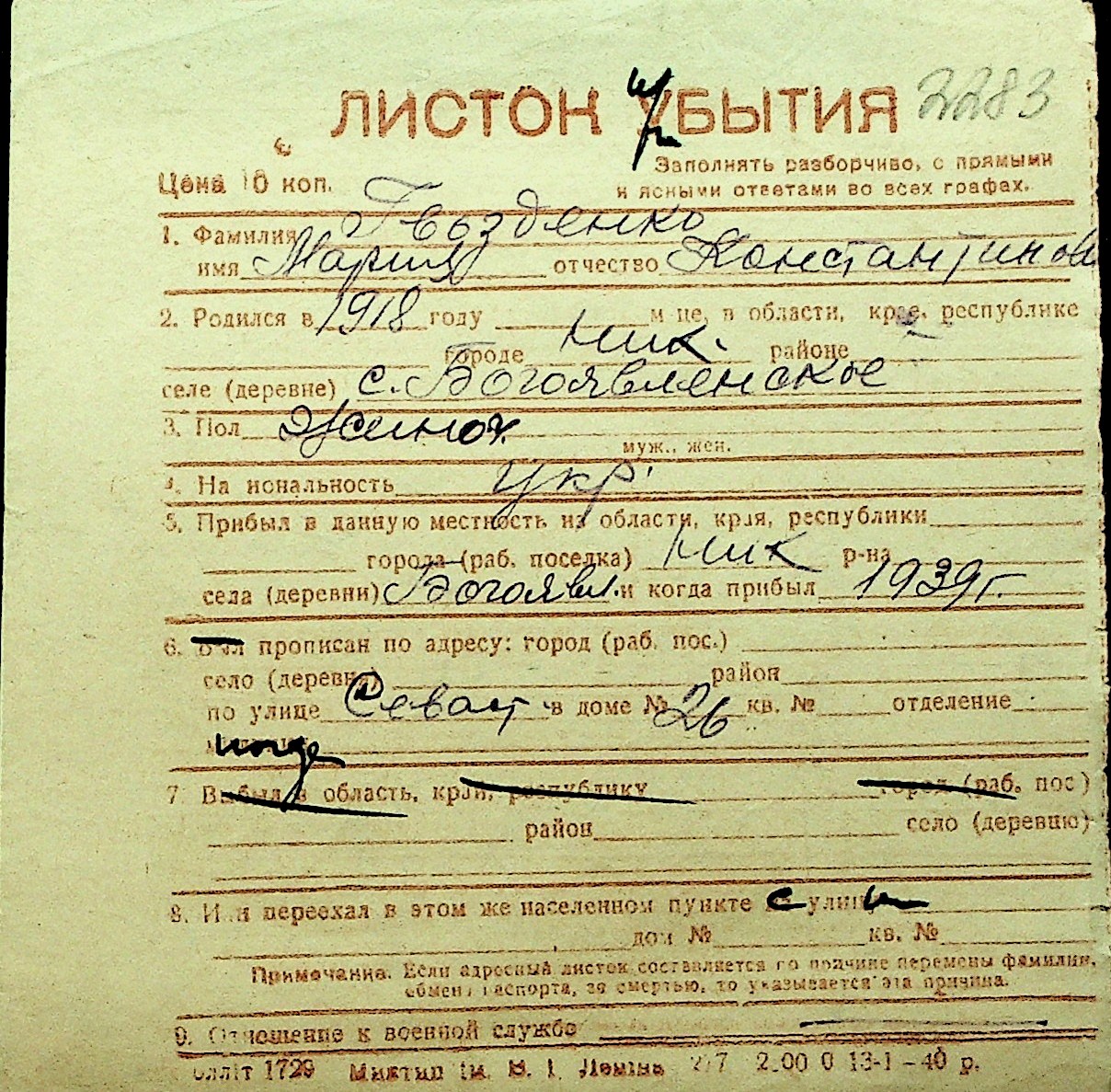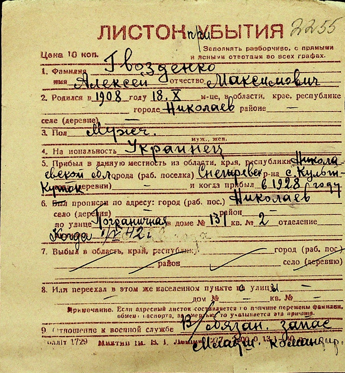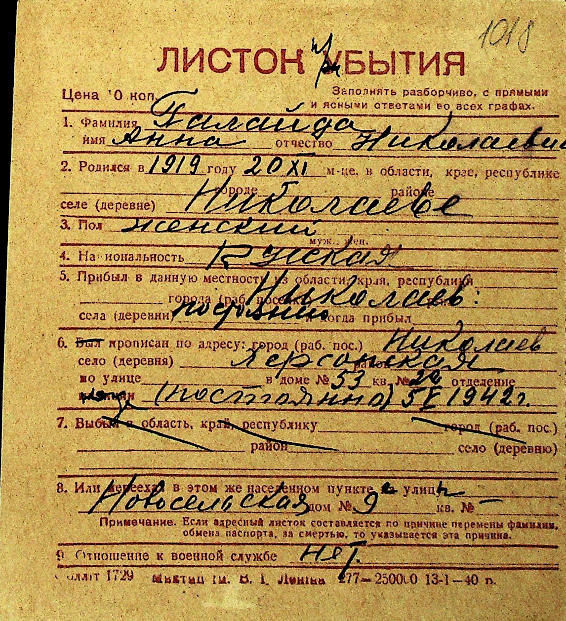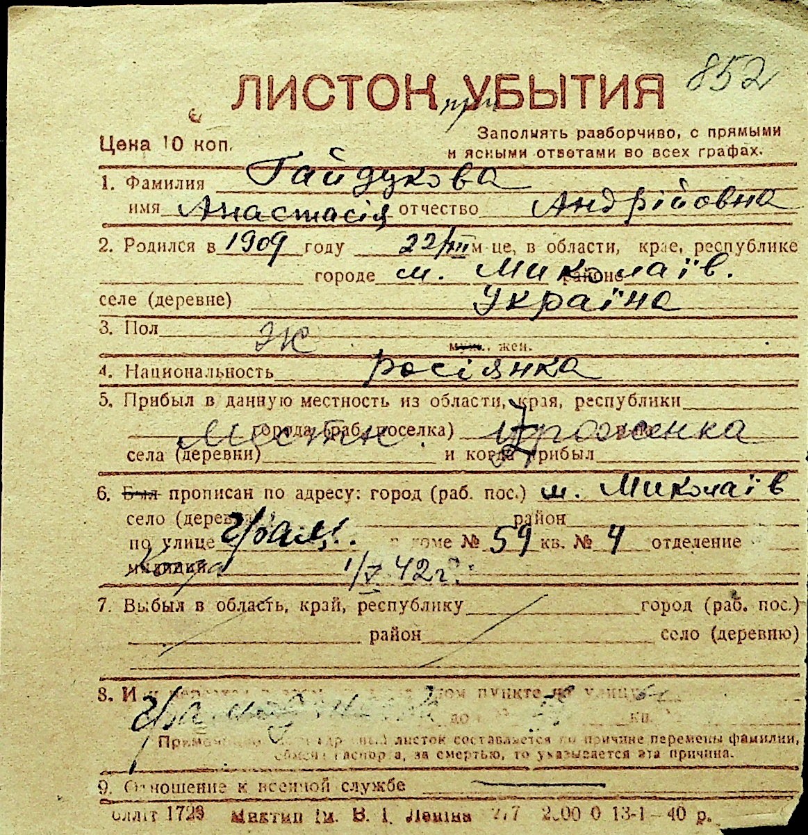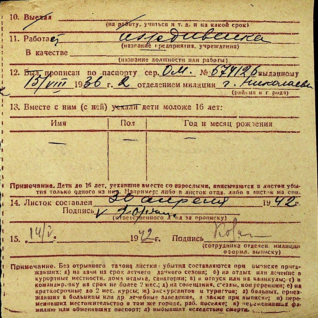 • • Перелік карток до фонду № Н-1016