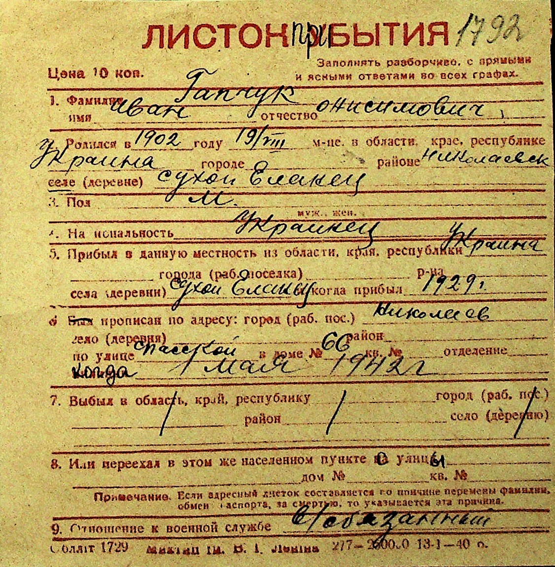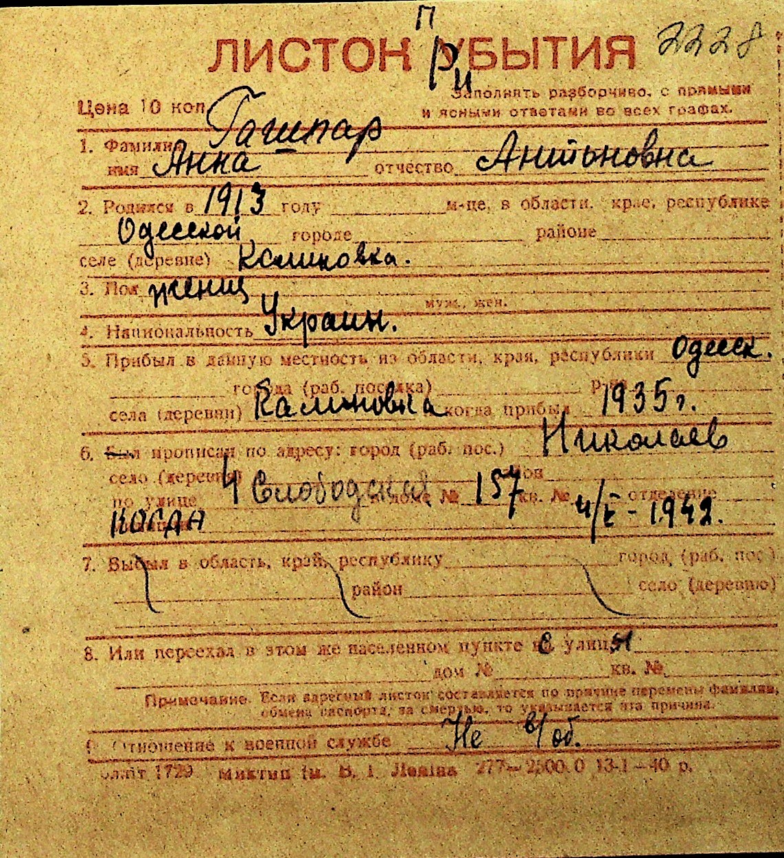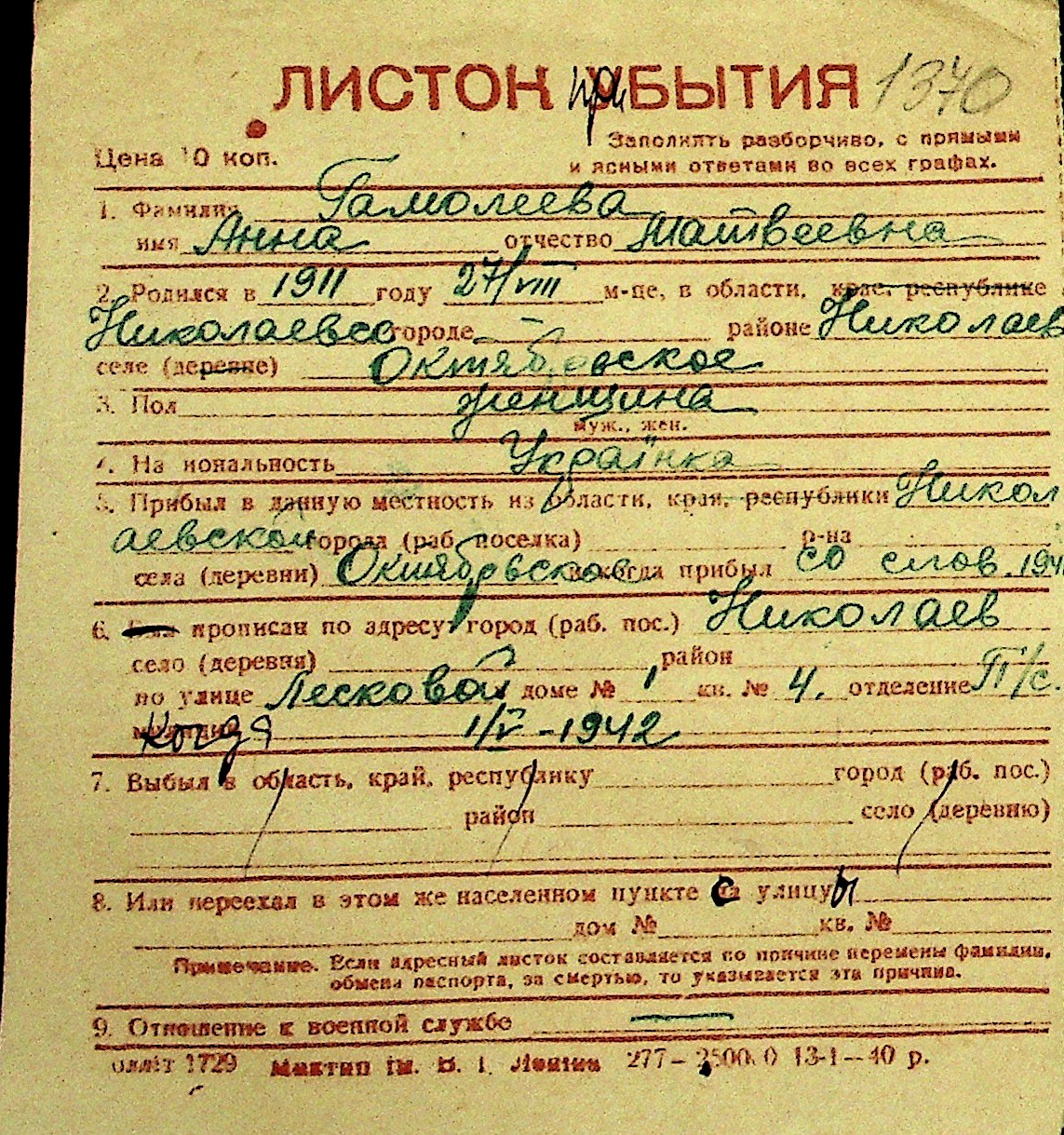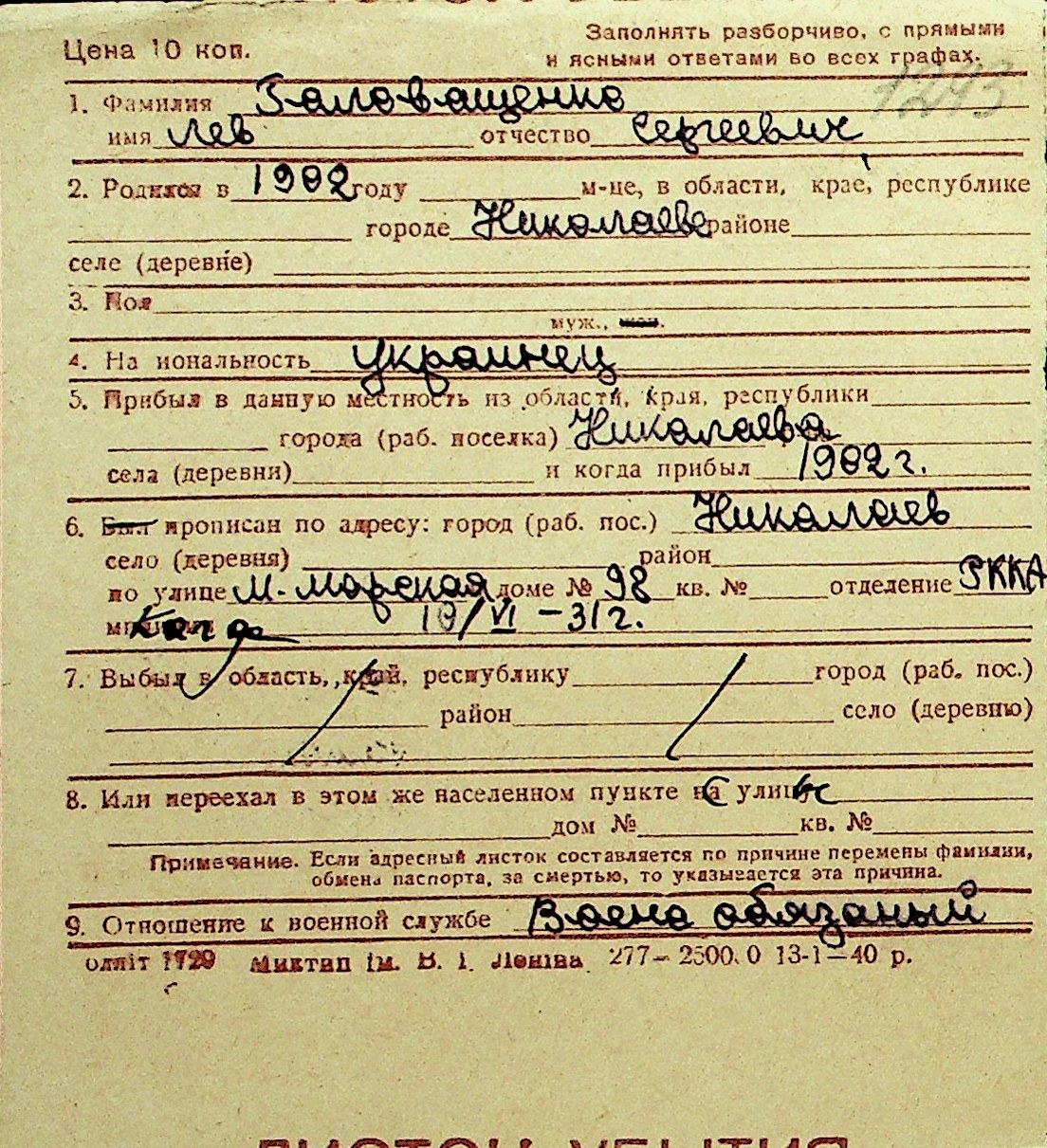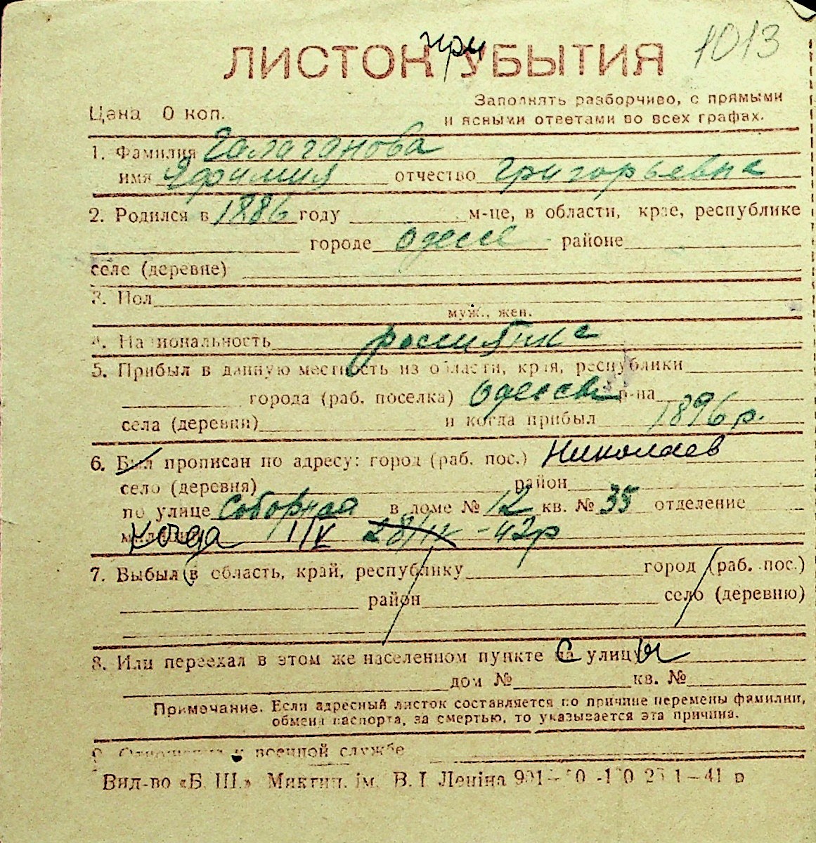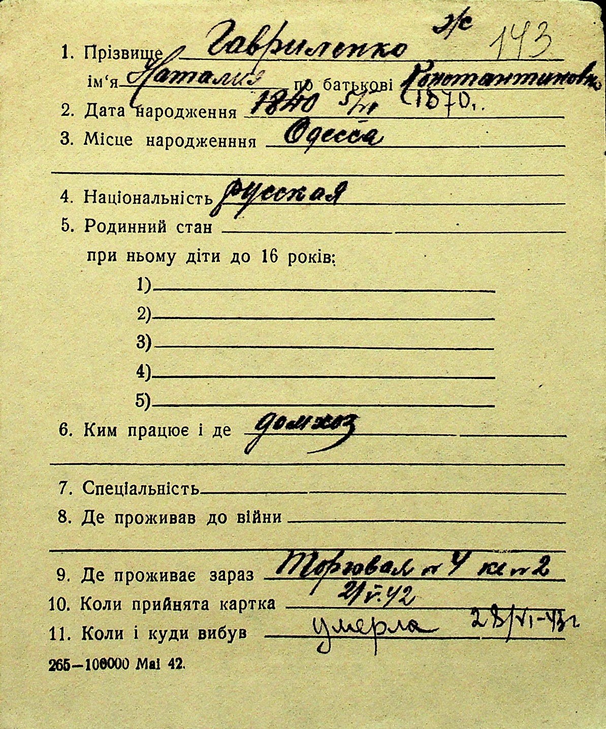 • • Перелік карток до фонду № Н-1016