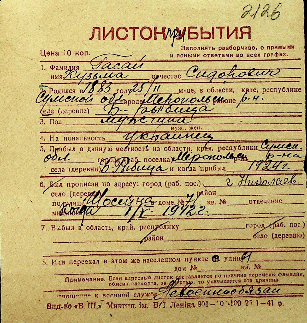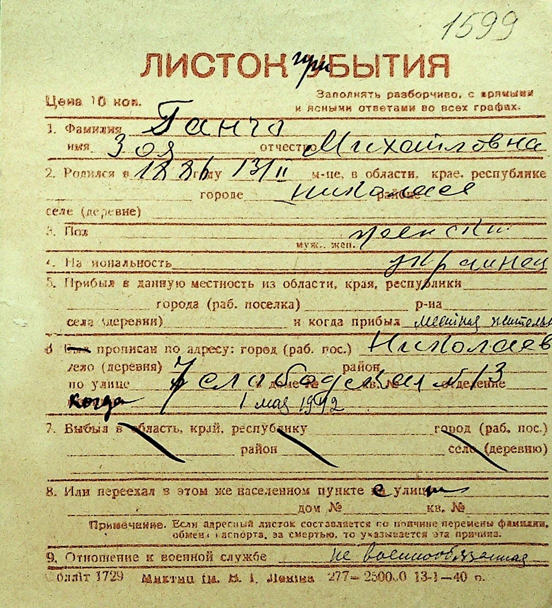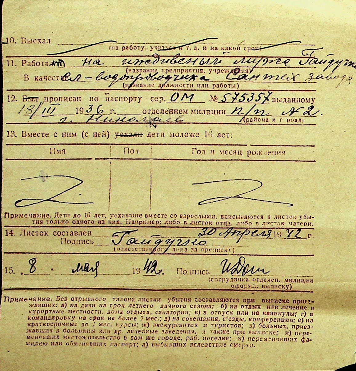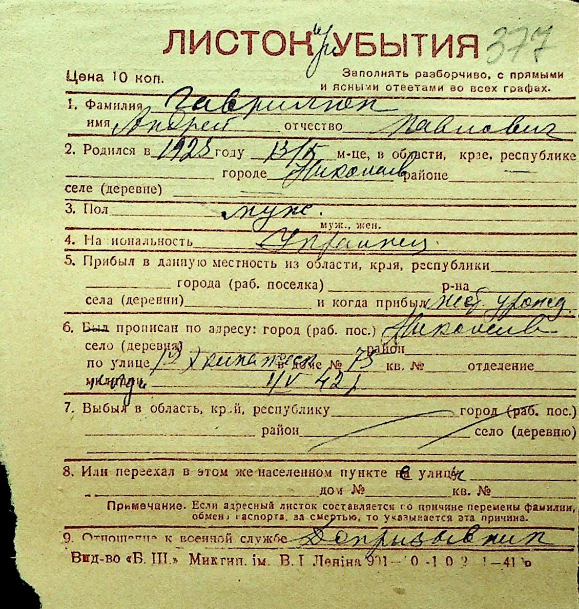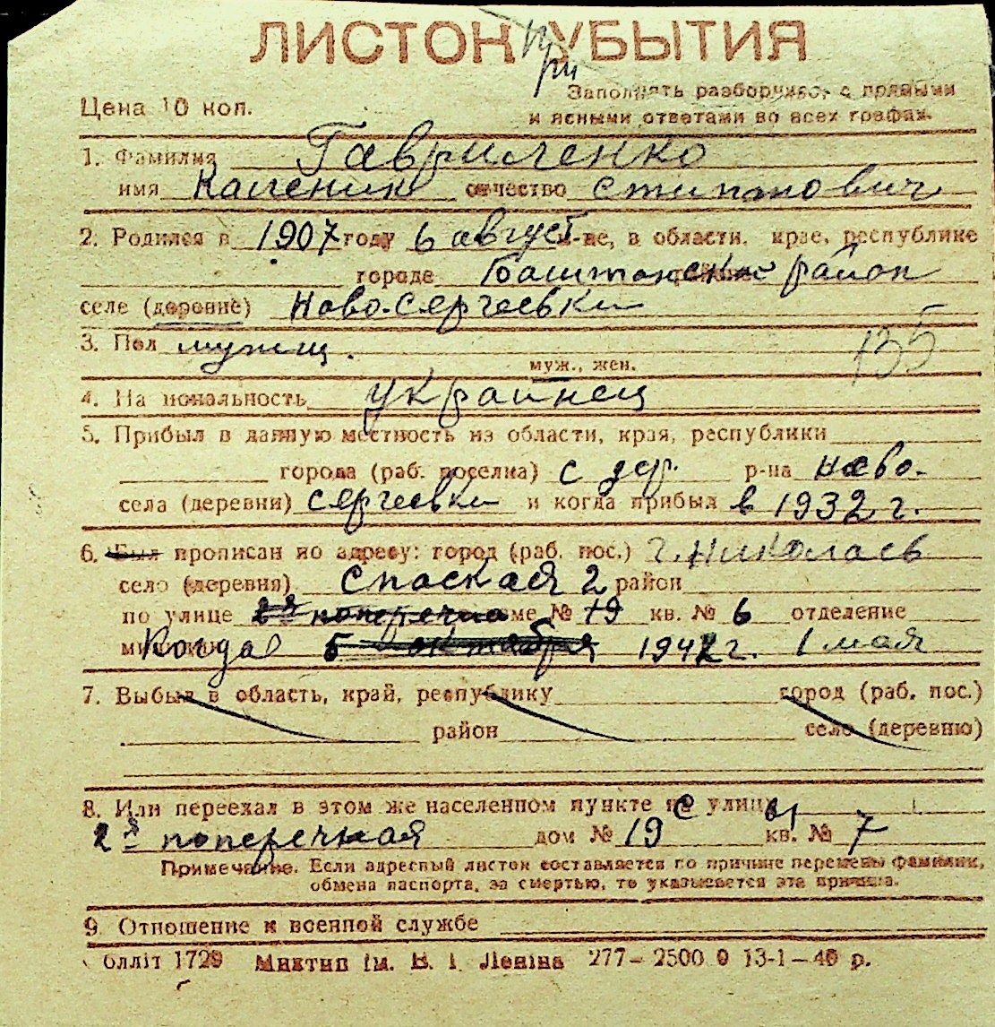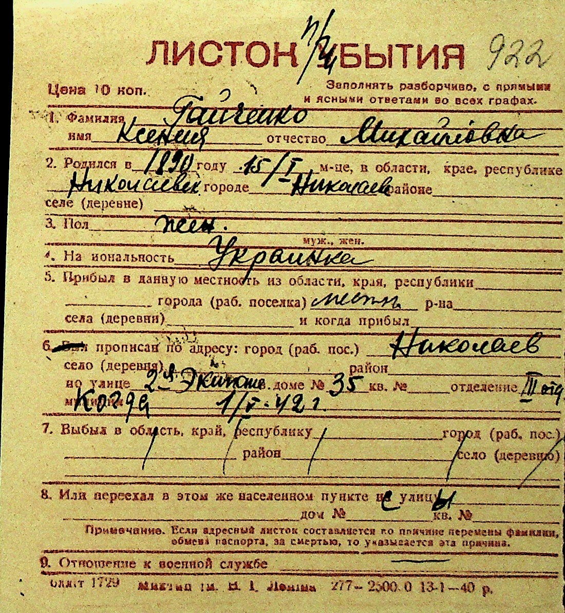 • • Перелік карток до фонду № Н-1016