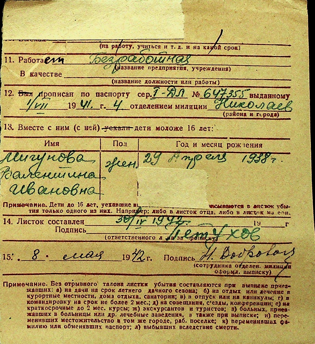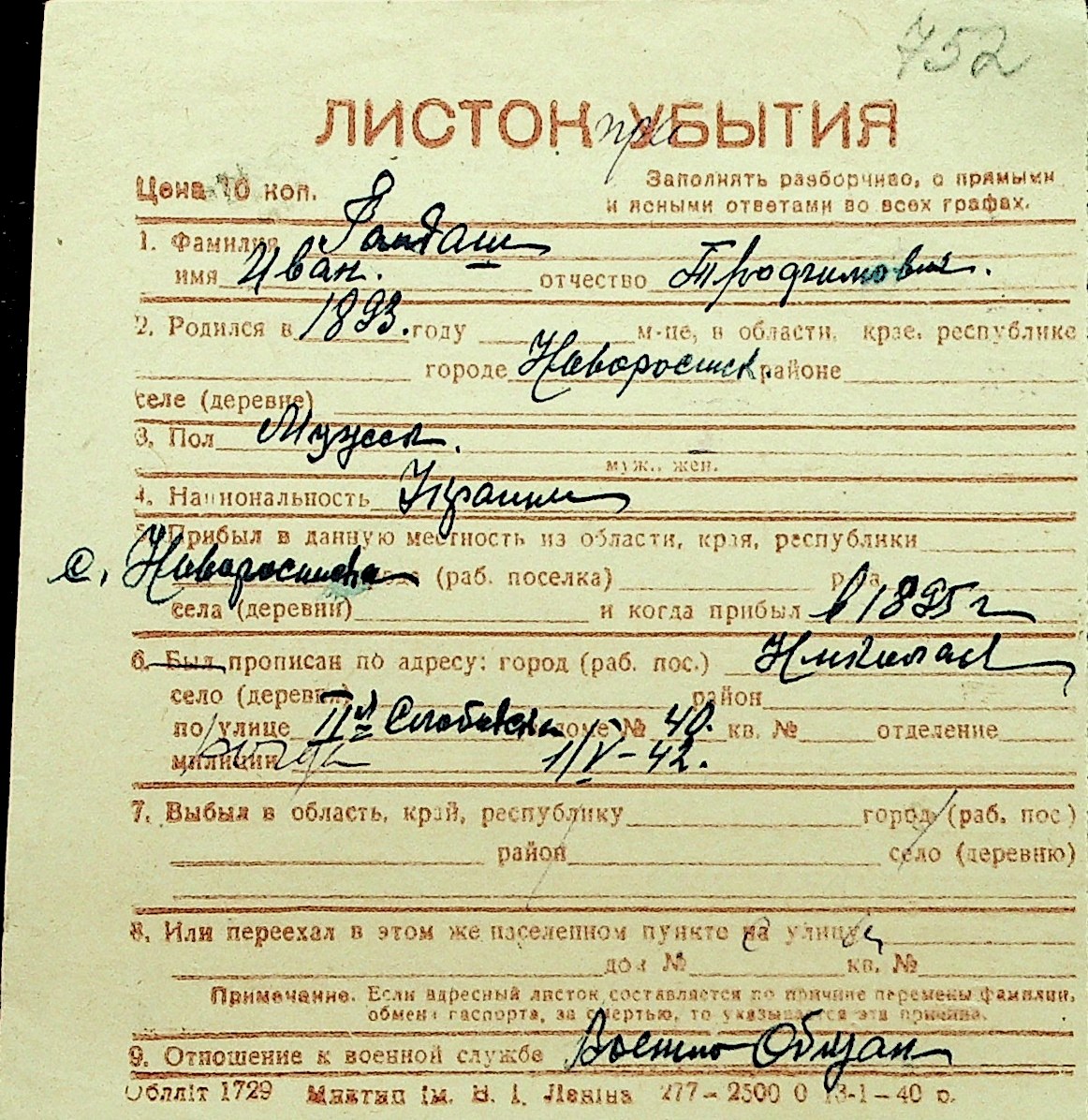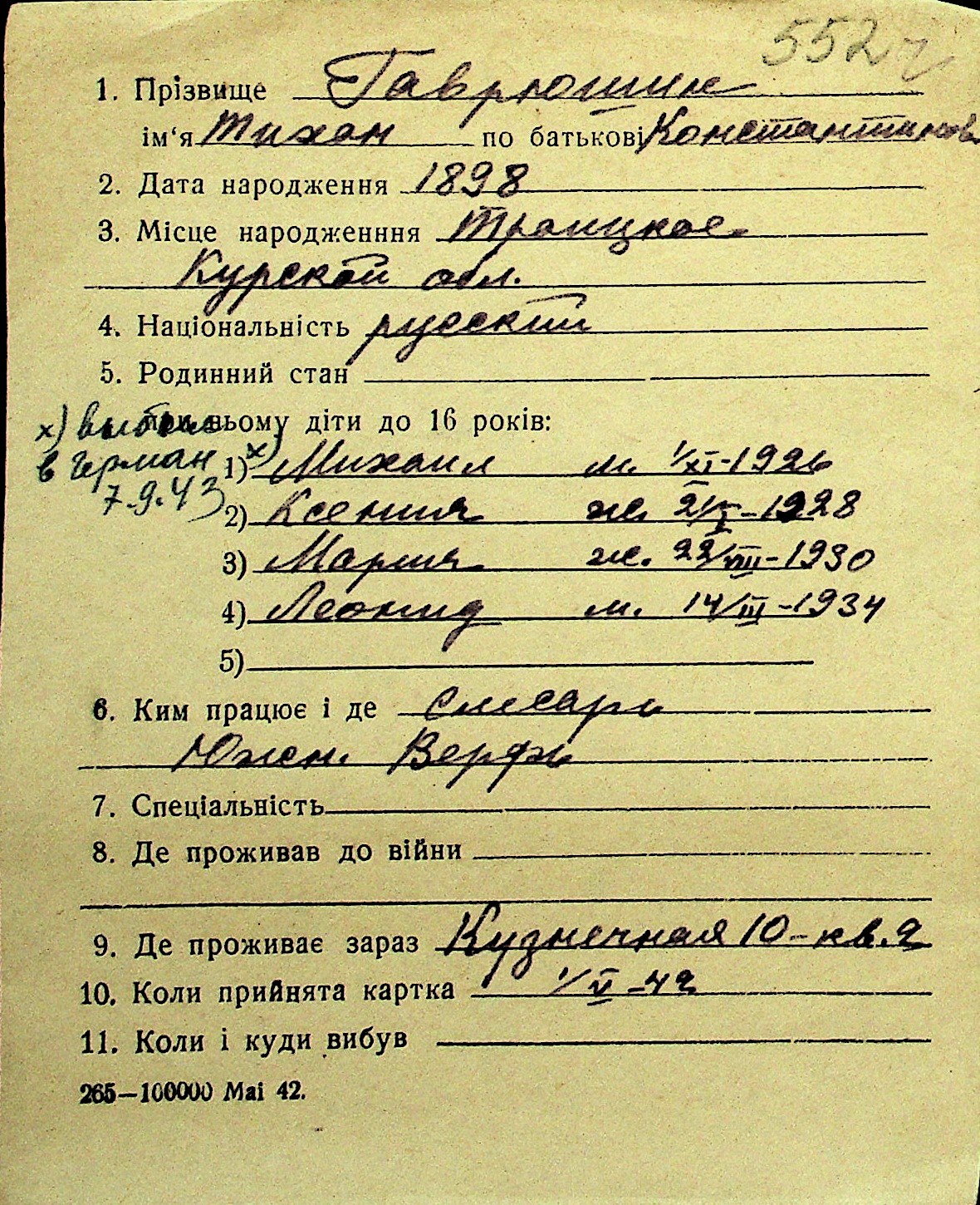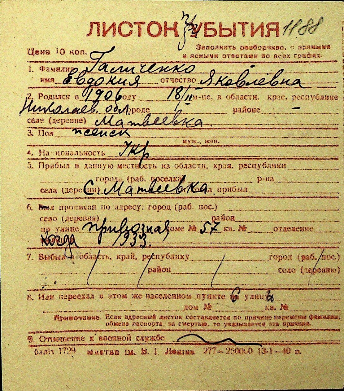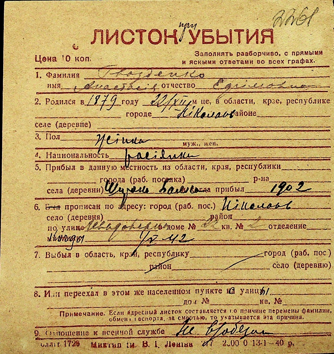 • • Перелік карток до фонду № Н-1016