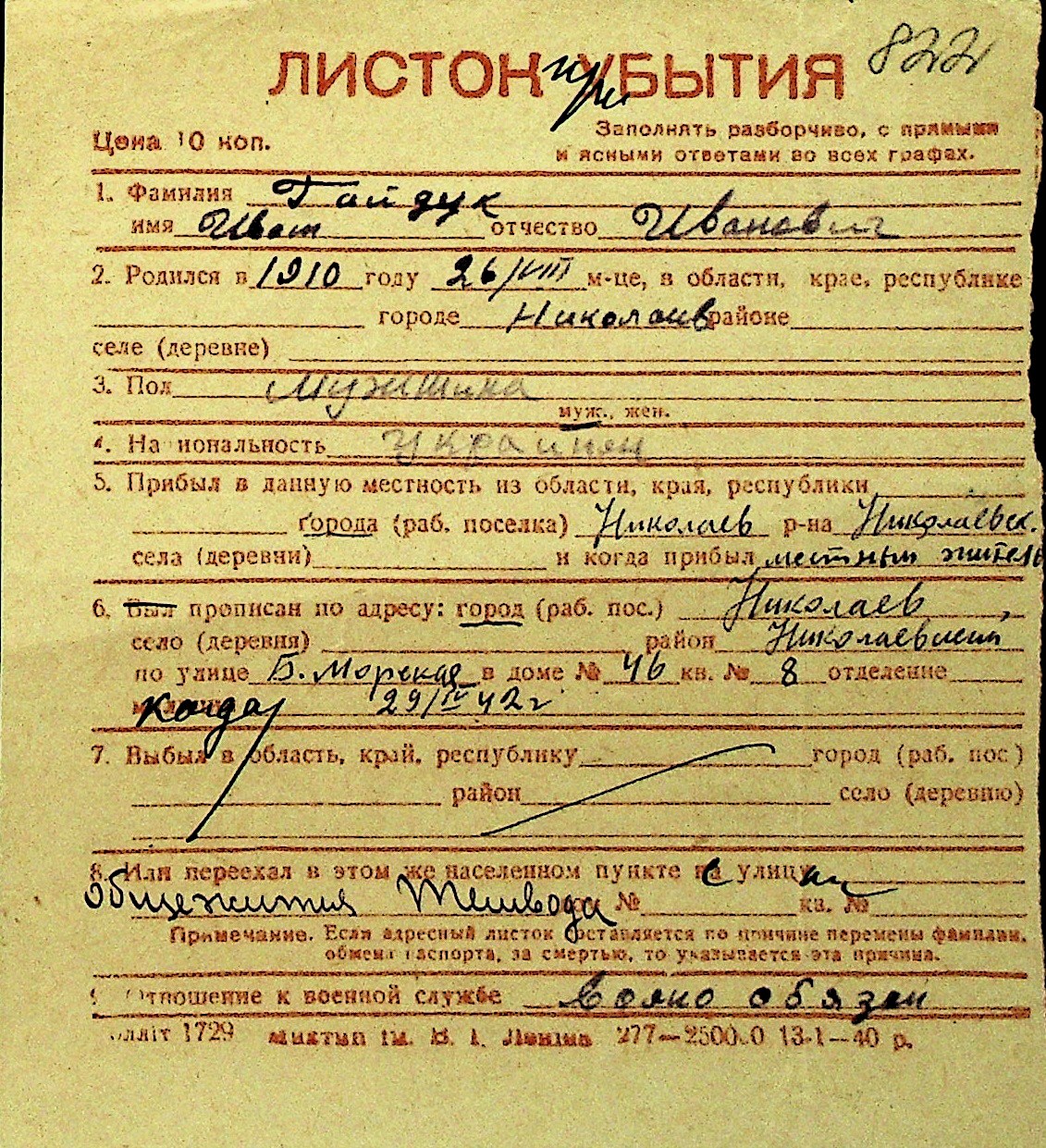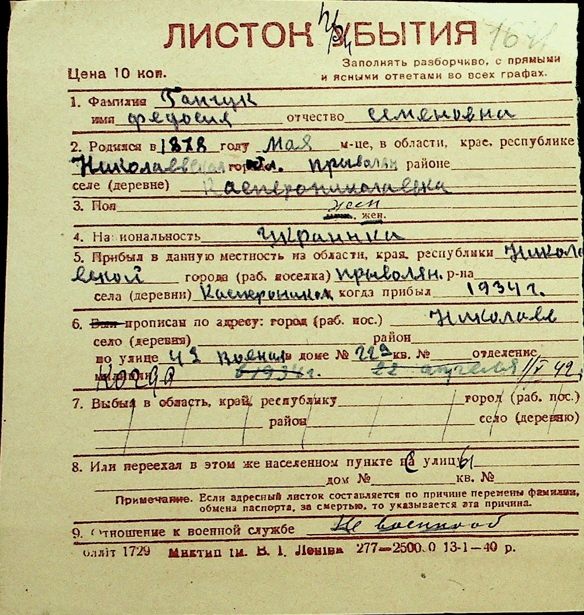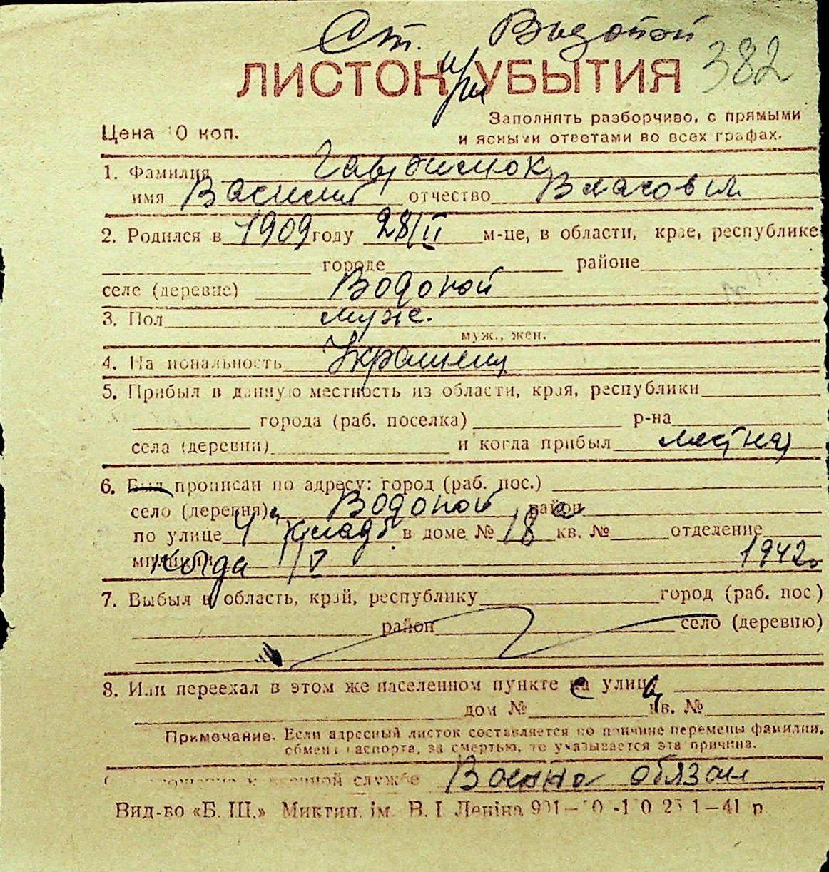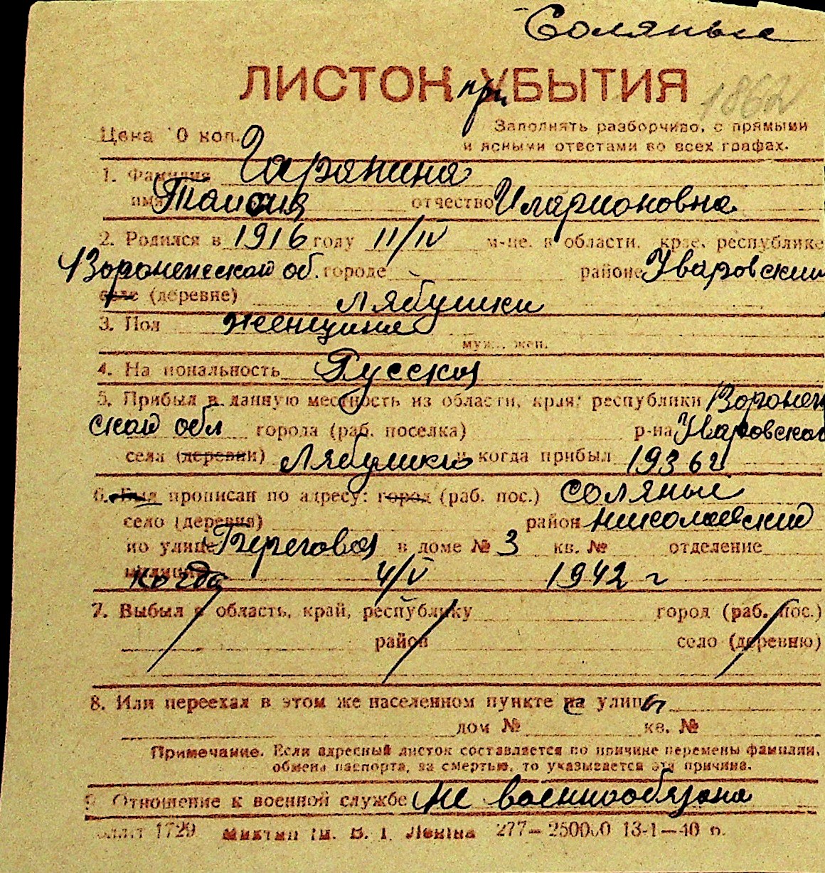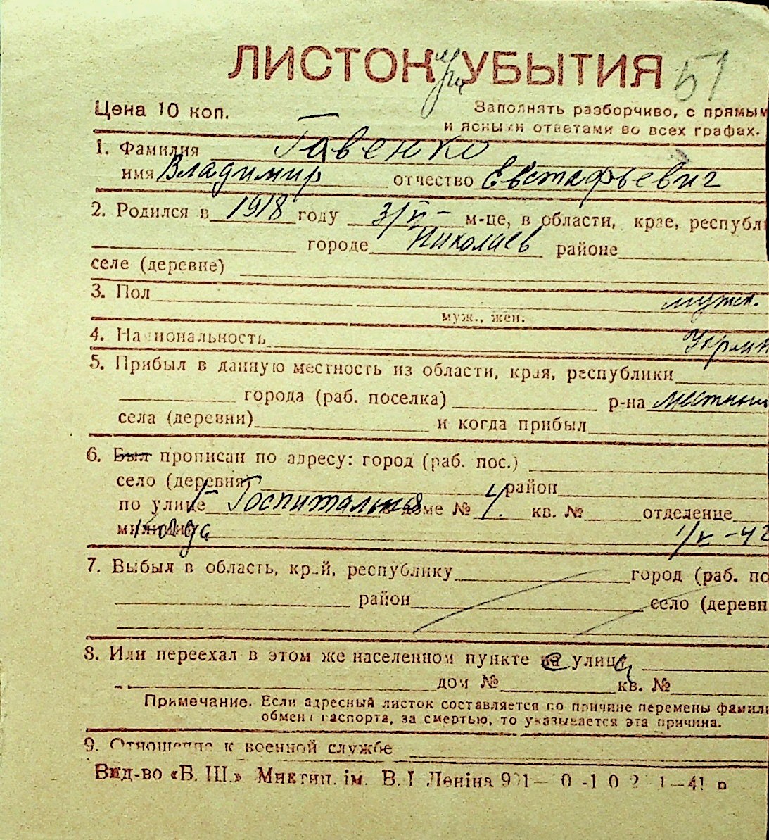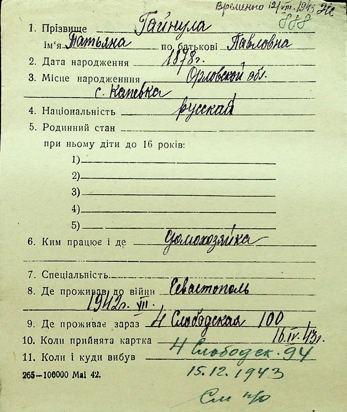 • • Перелік карток до фонду № Н-1016