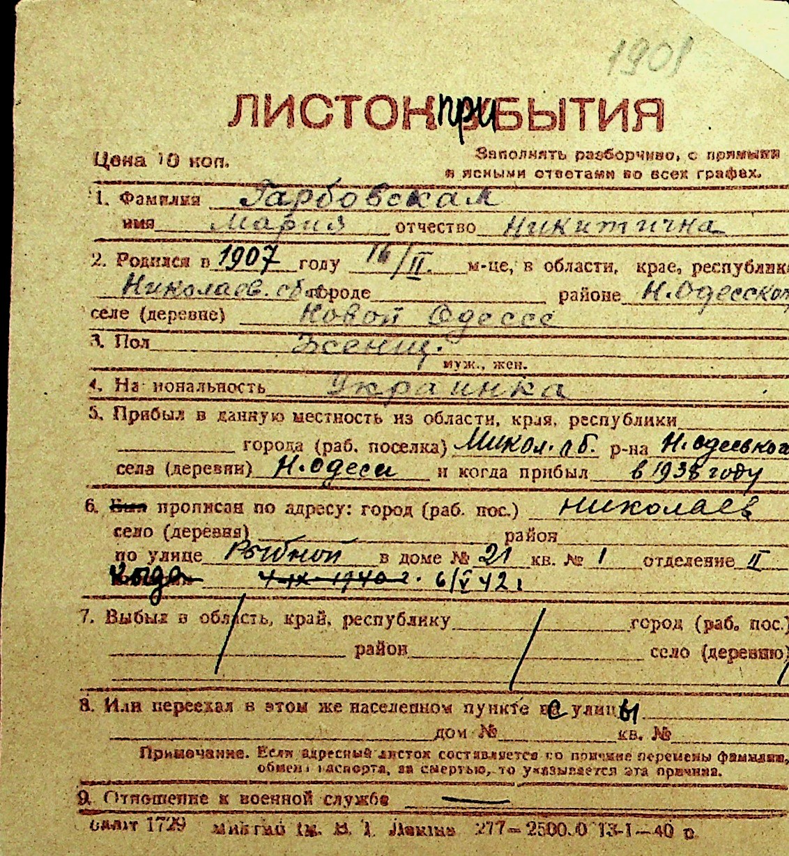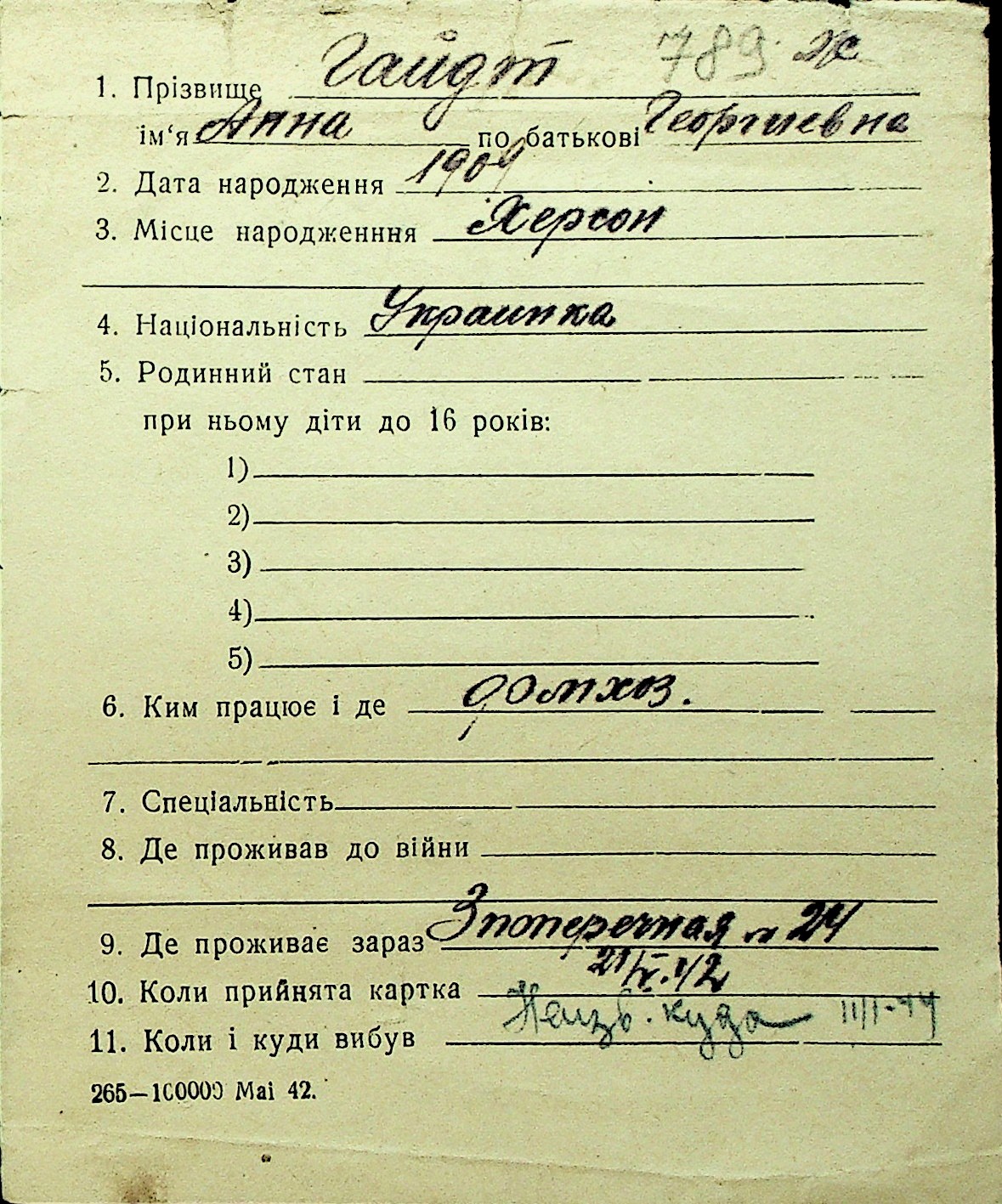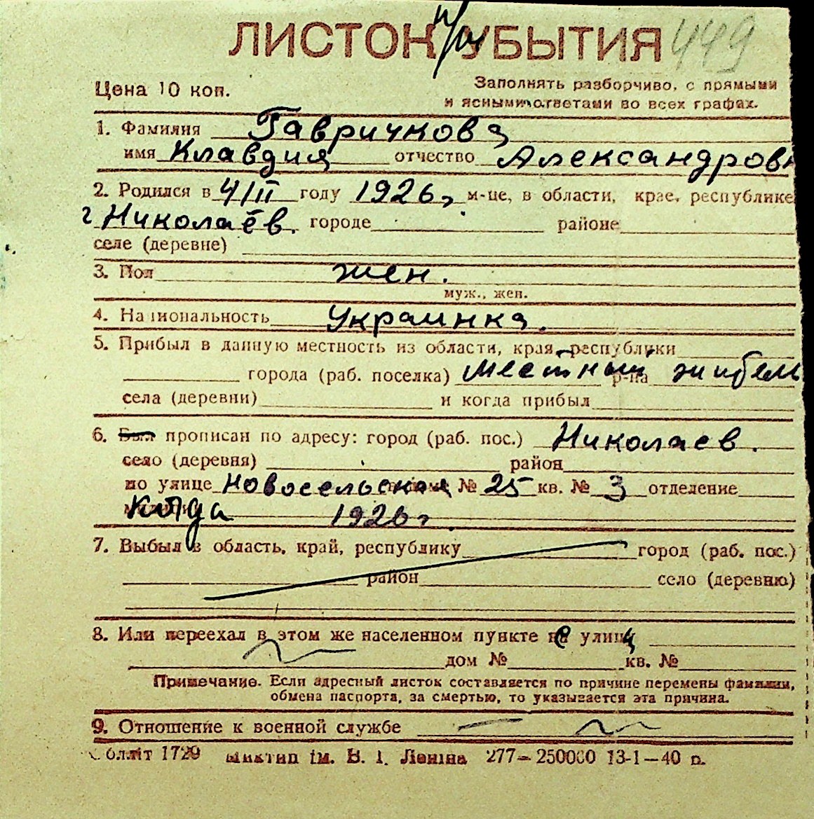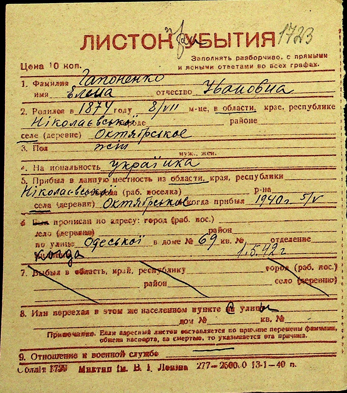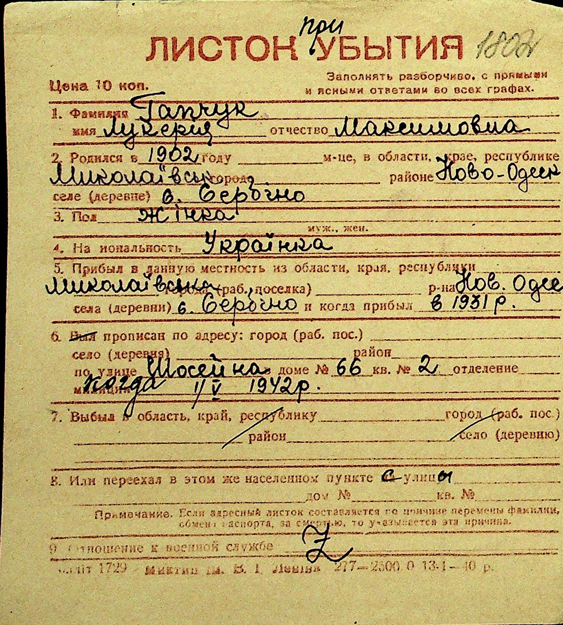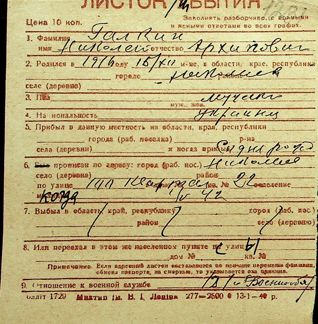 • • Перелік карток до фонду № Н-1016