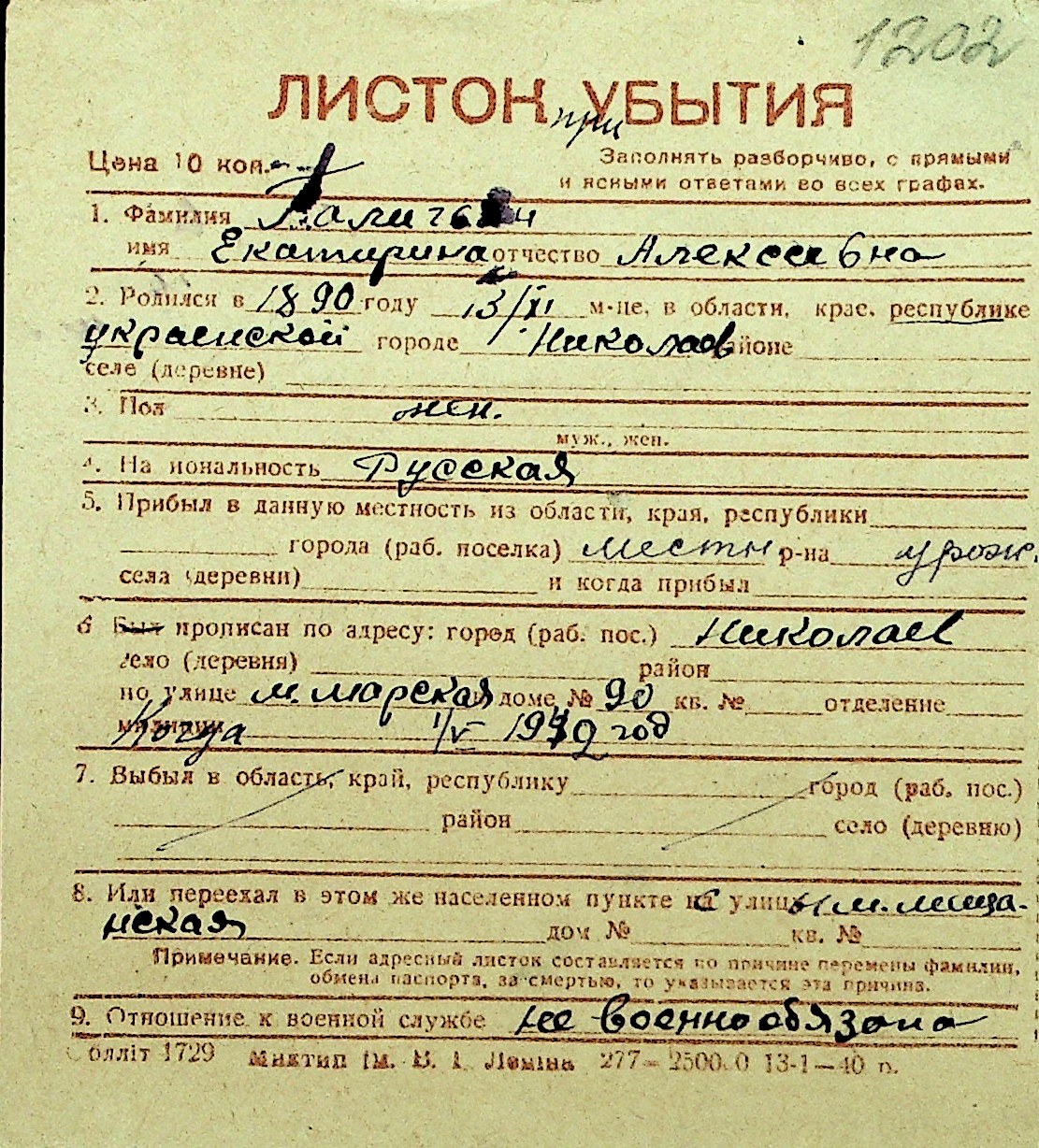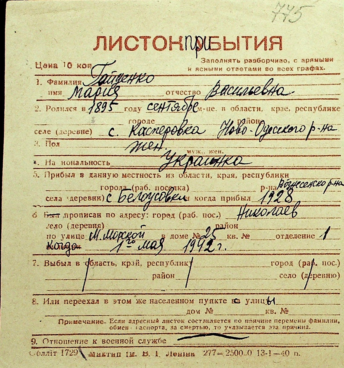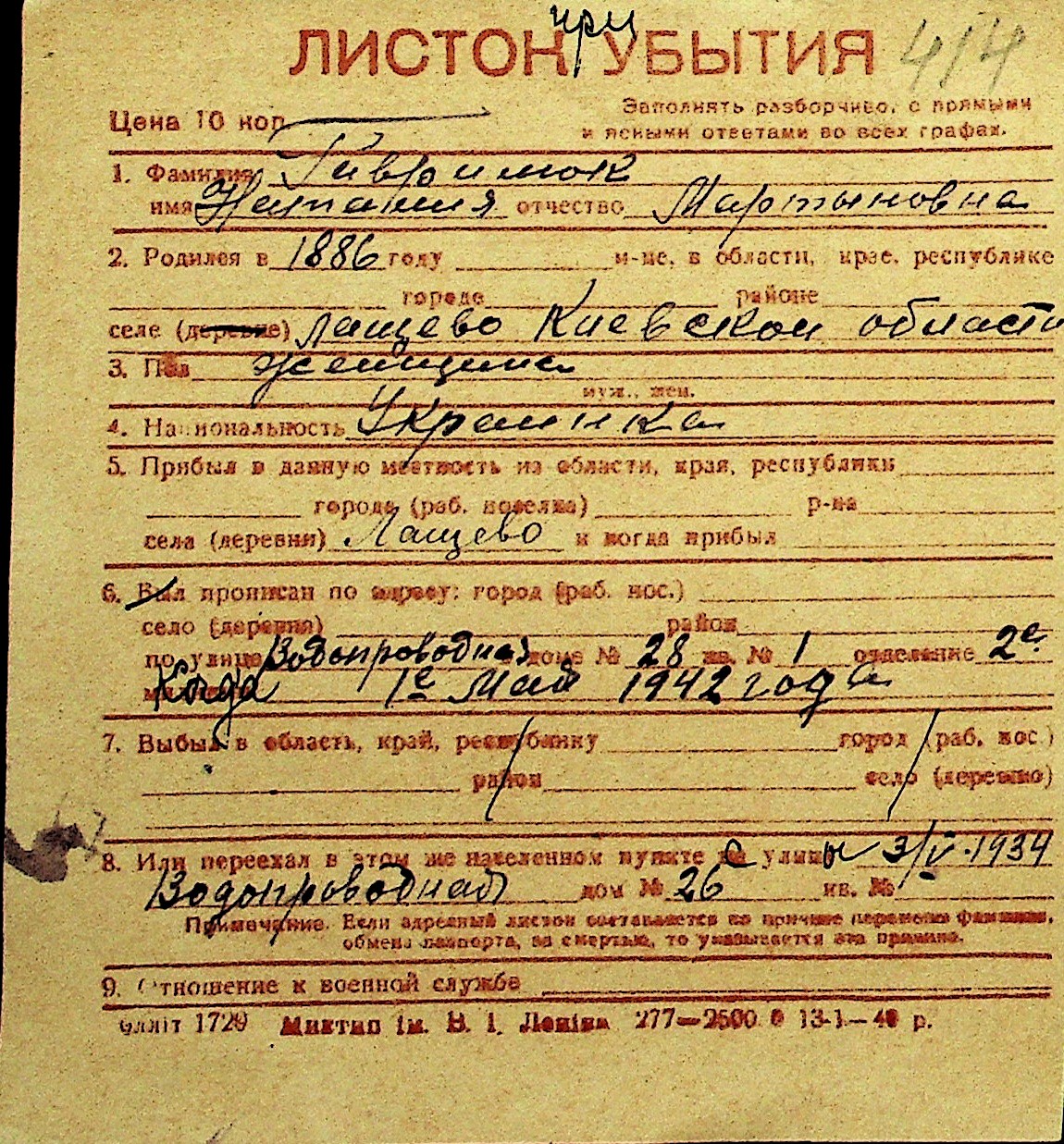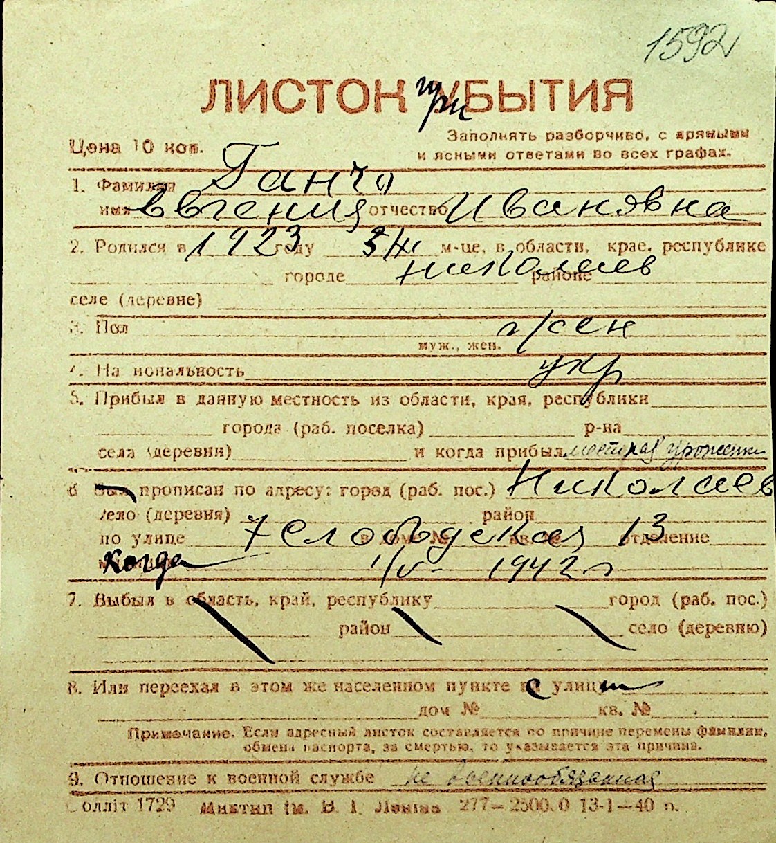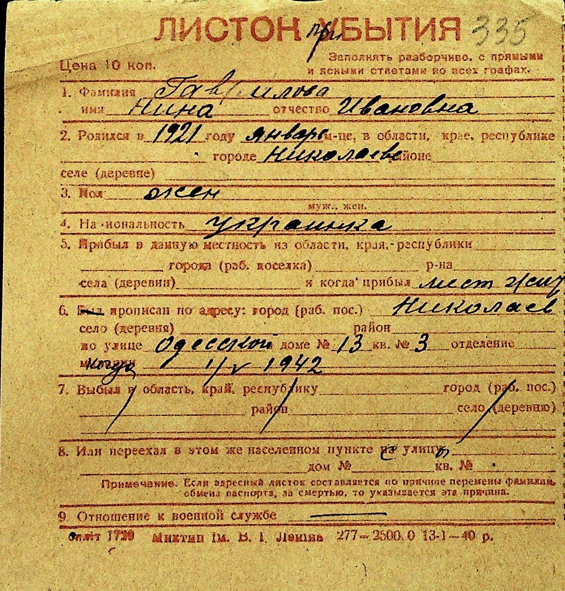 • • Перелік карток до фонду № Н-1016