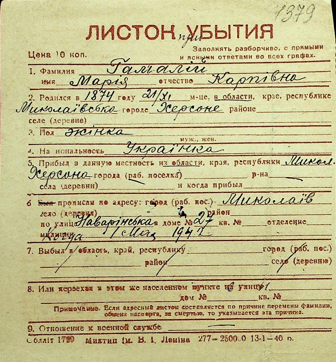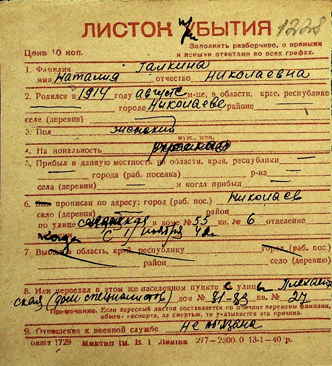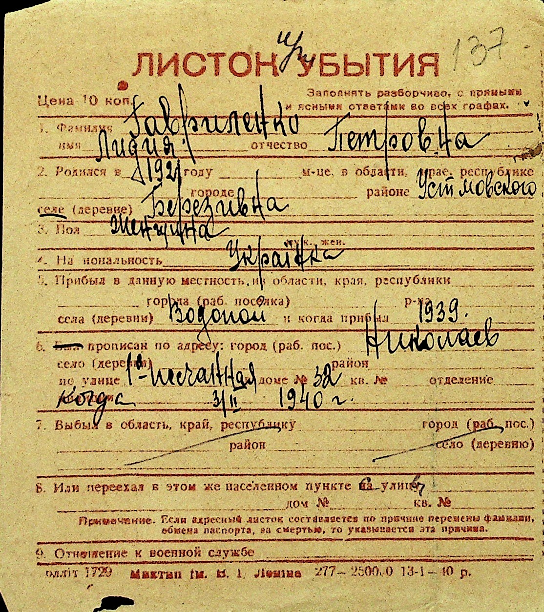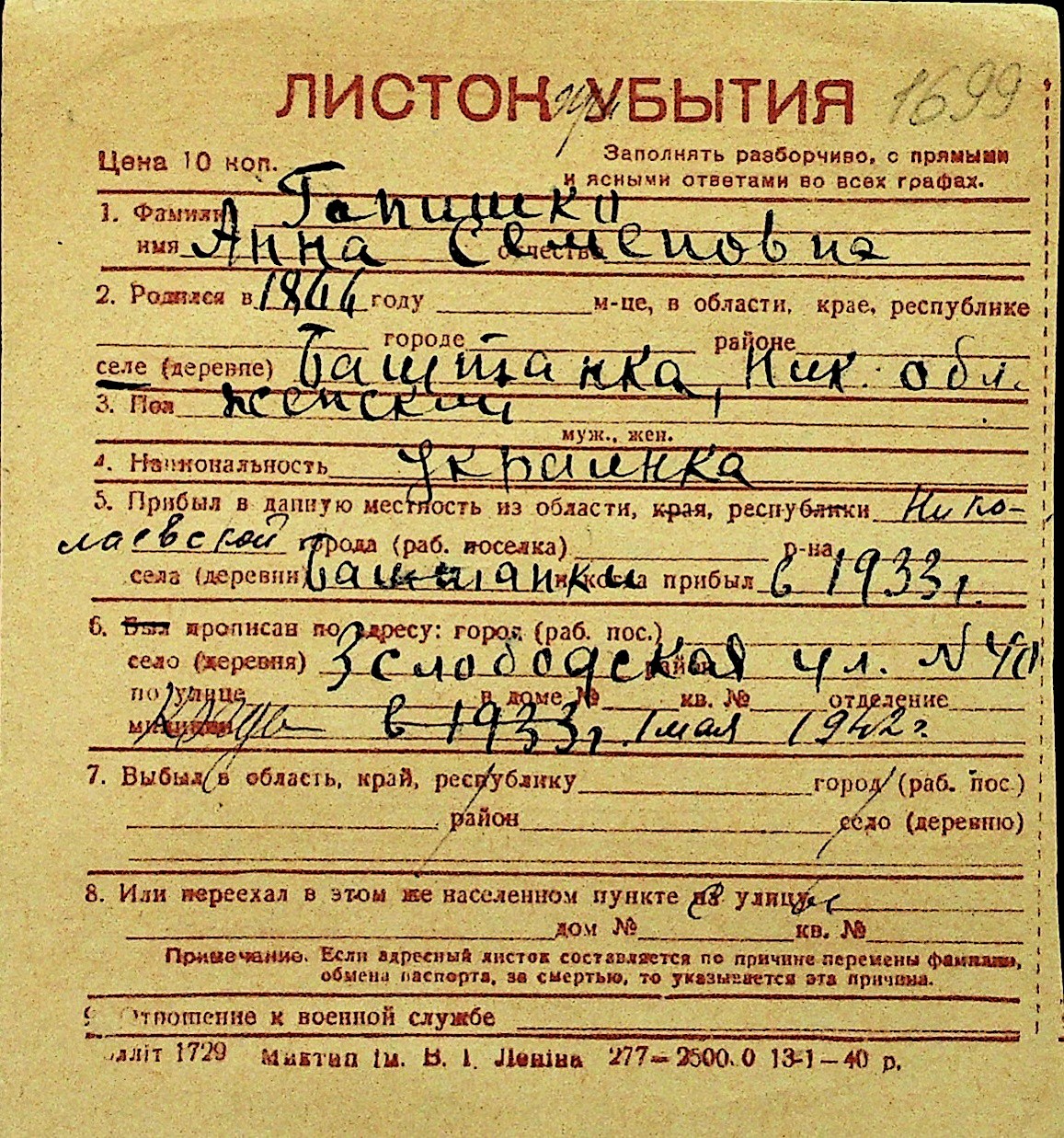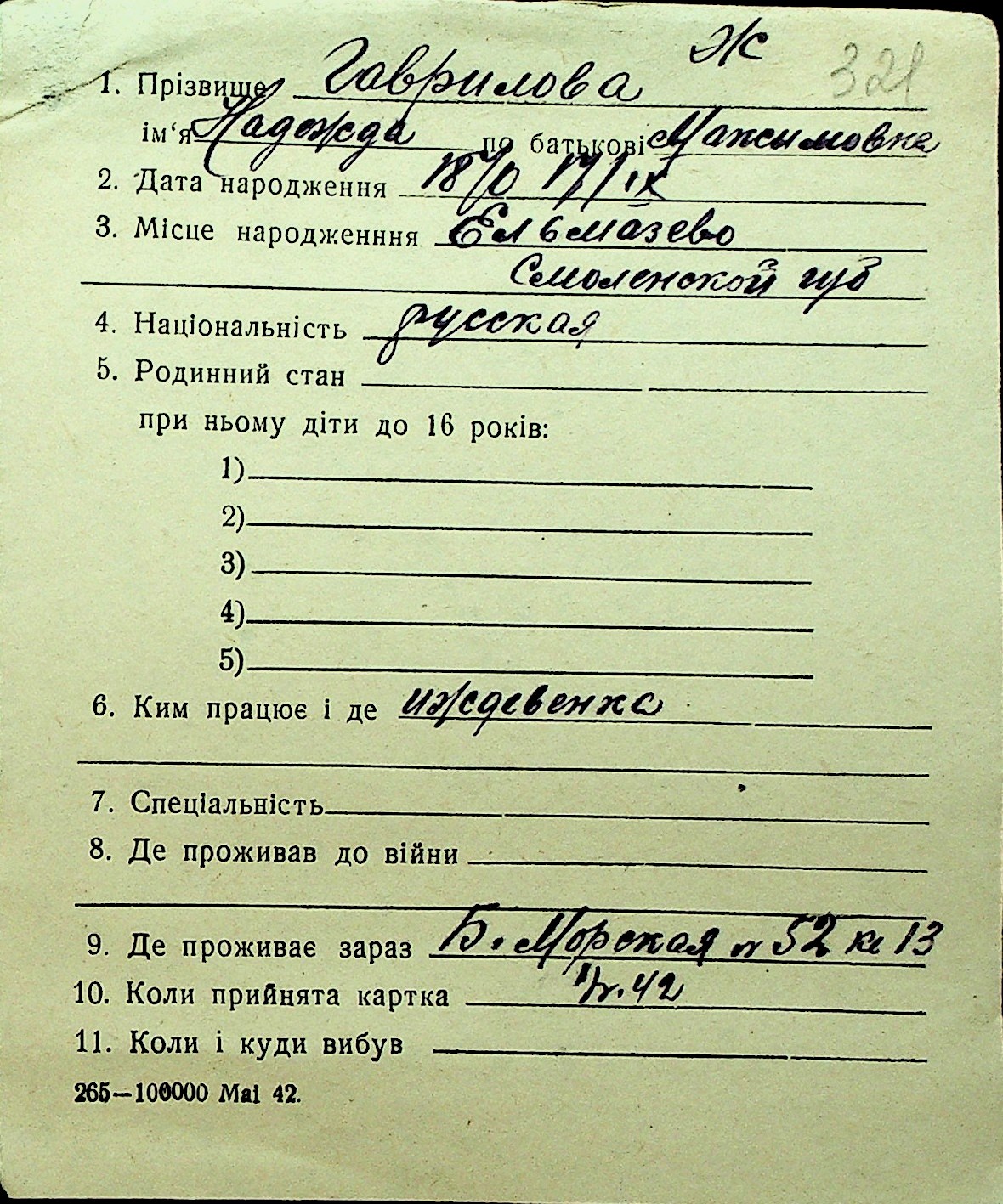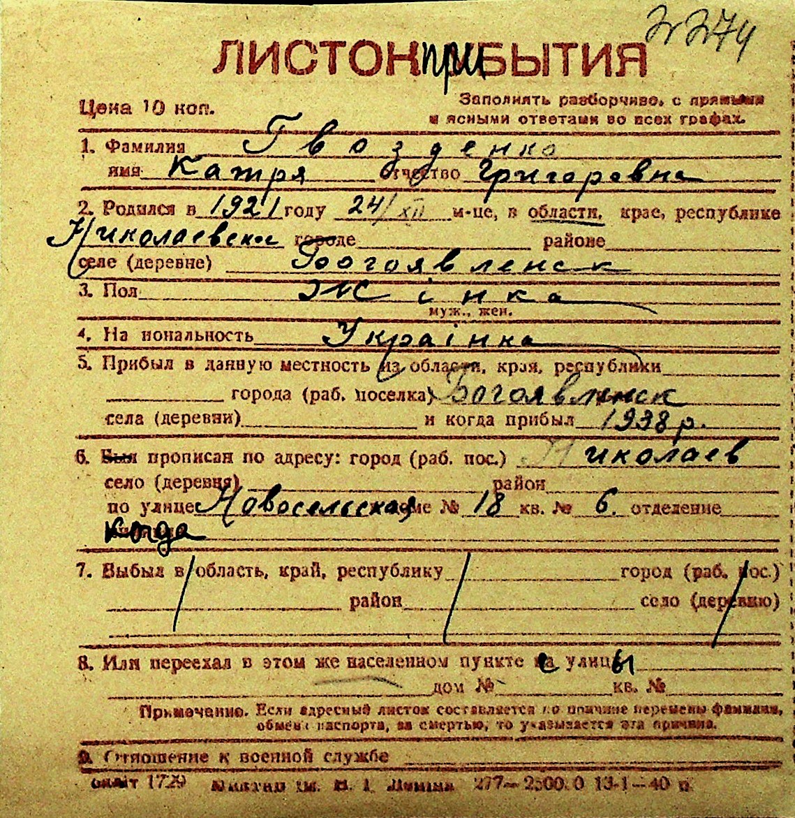 • • Перелік карток до фонду № Н-1016