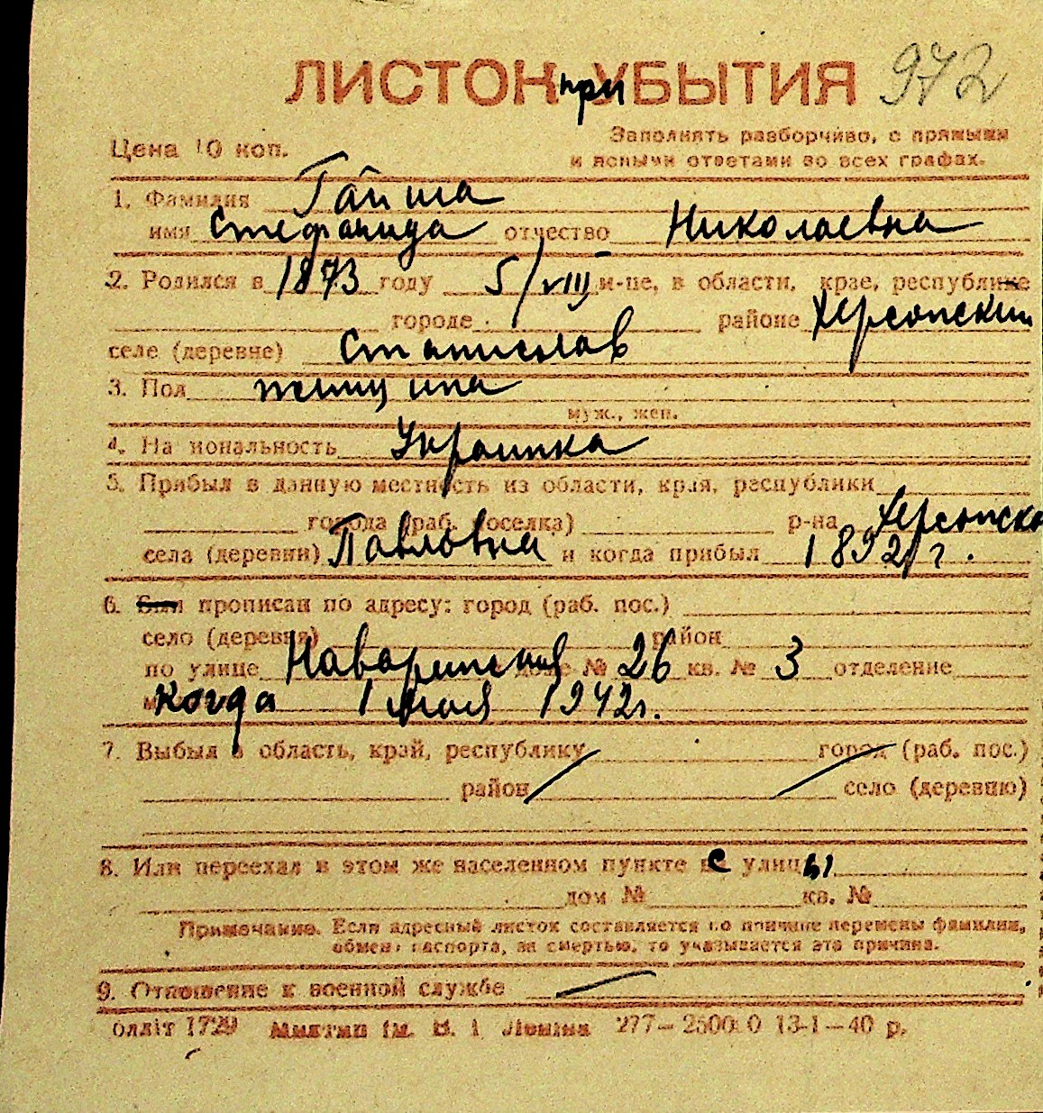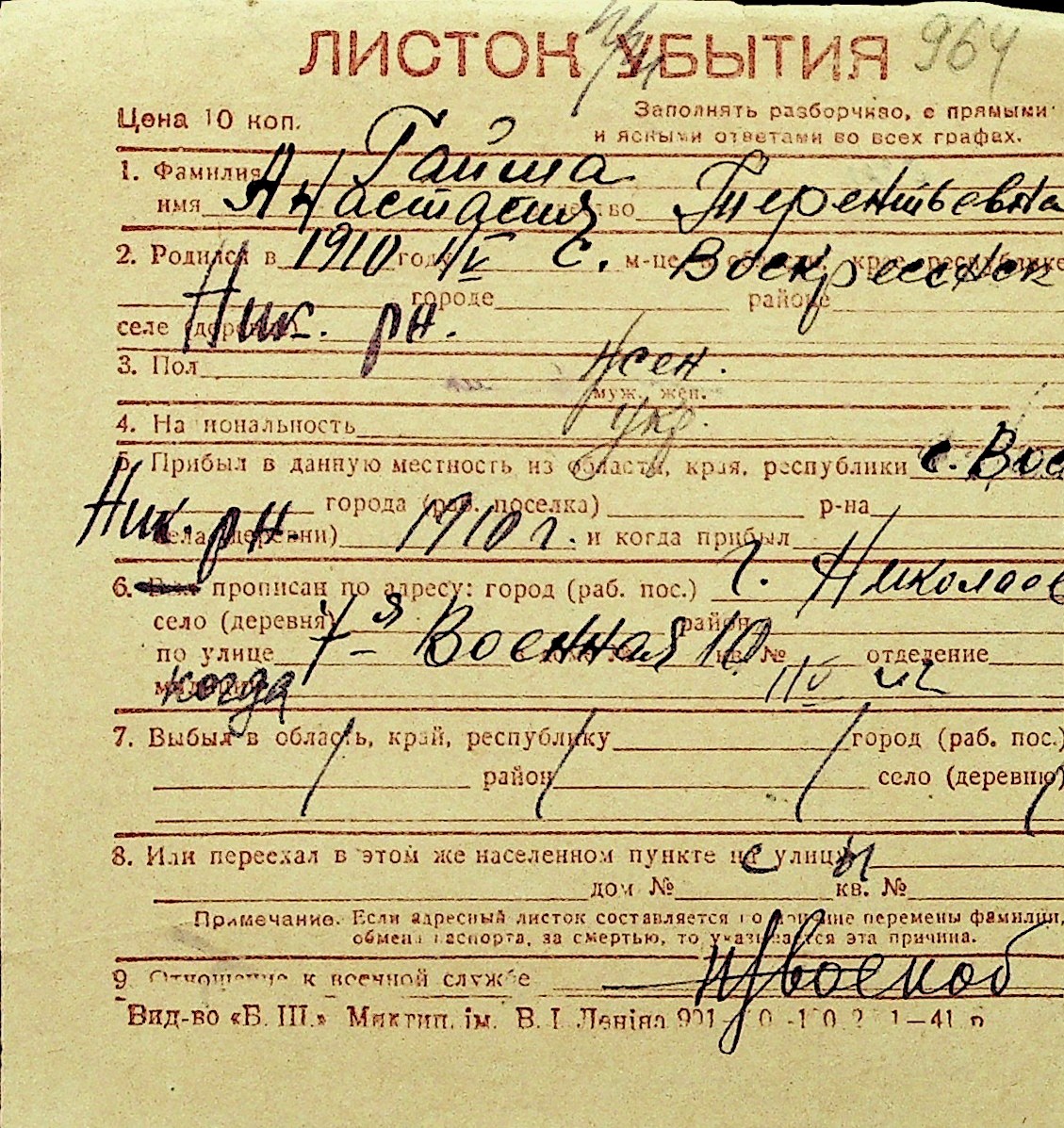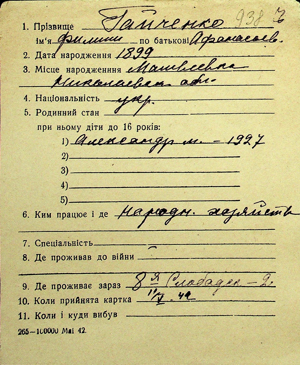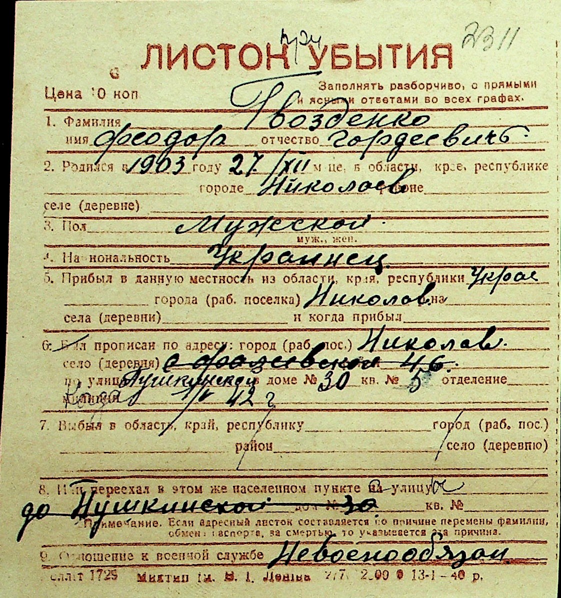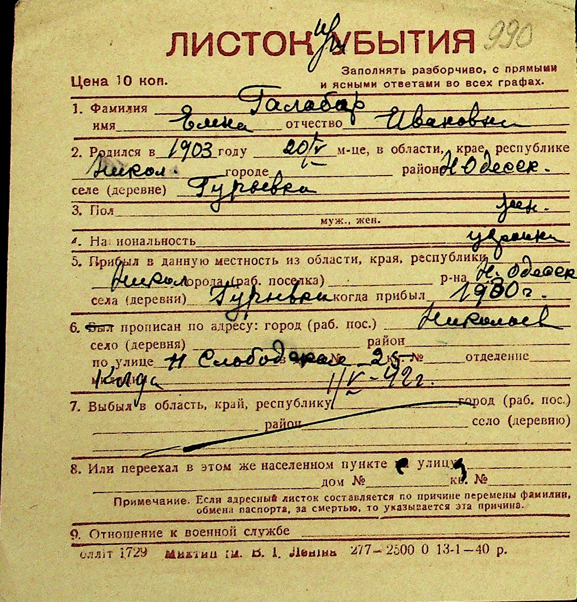 • • Перелік карток до фонду № Н-1016