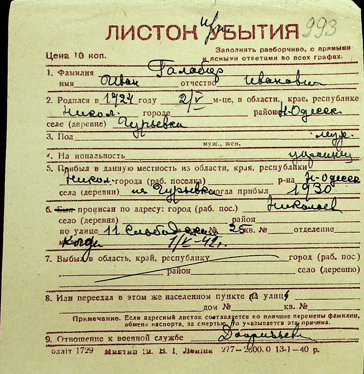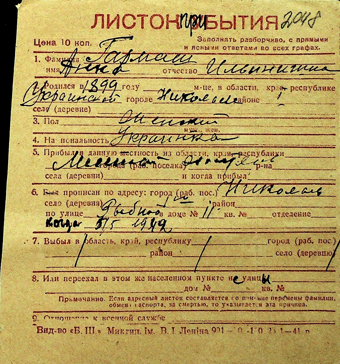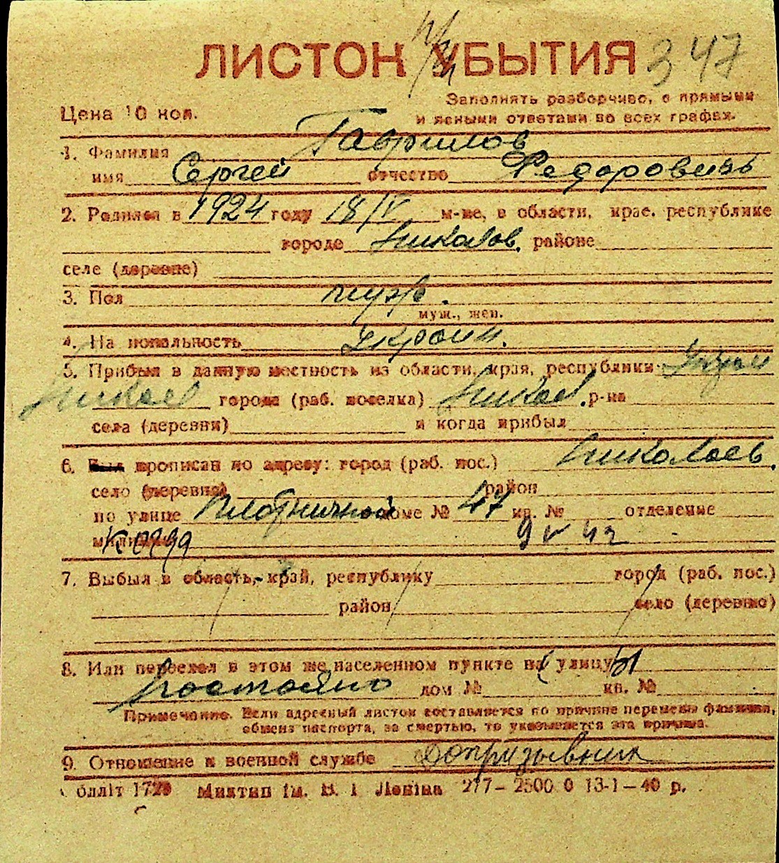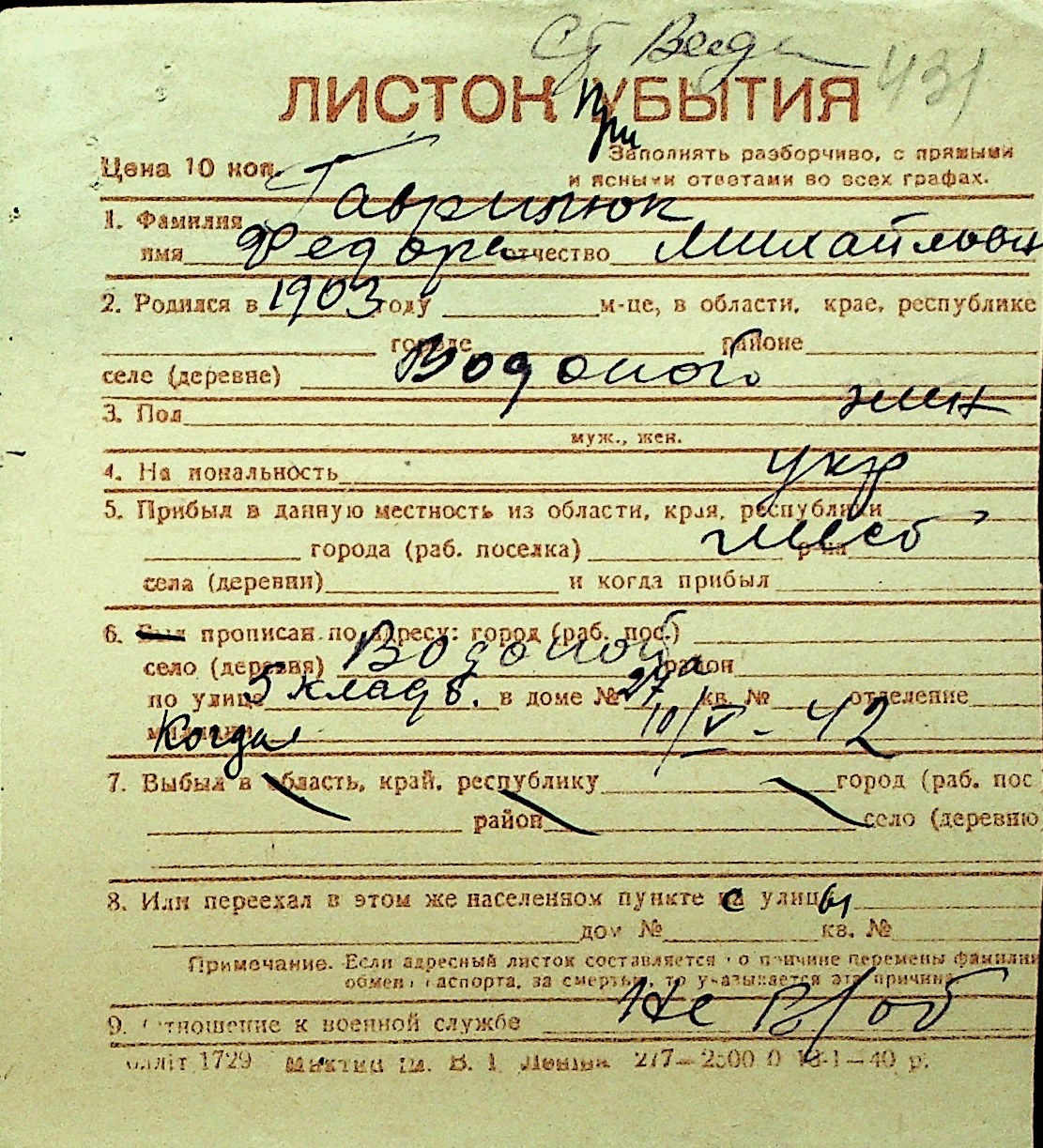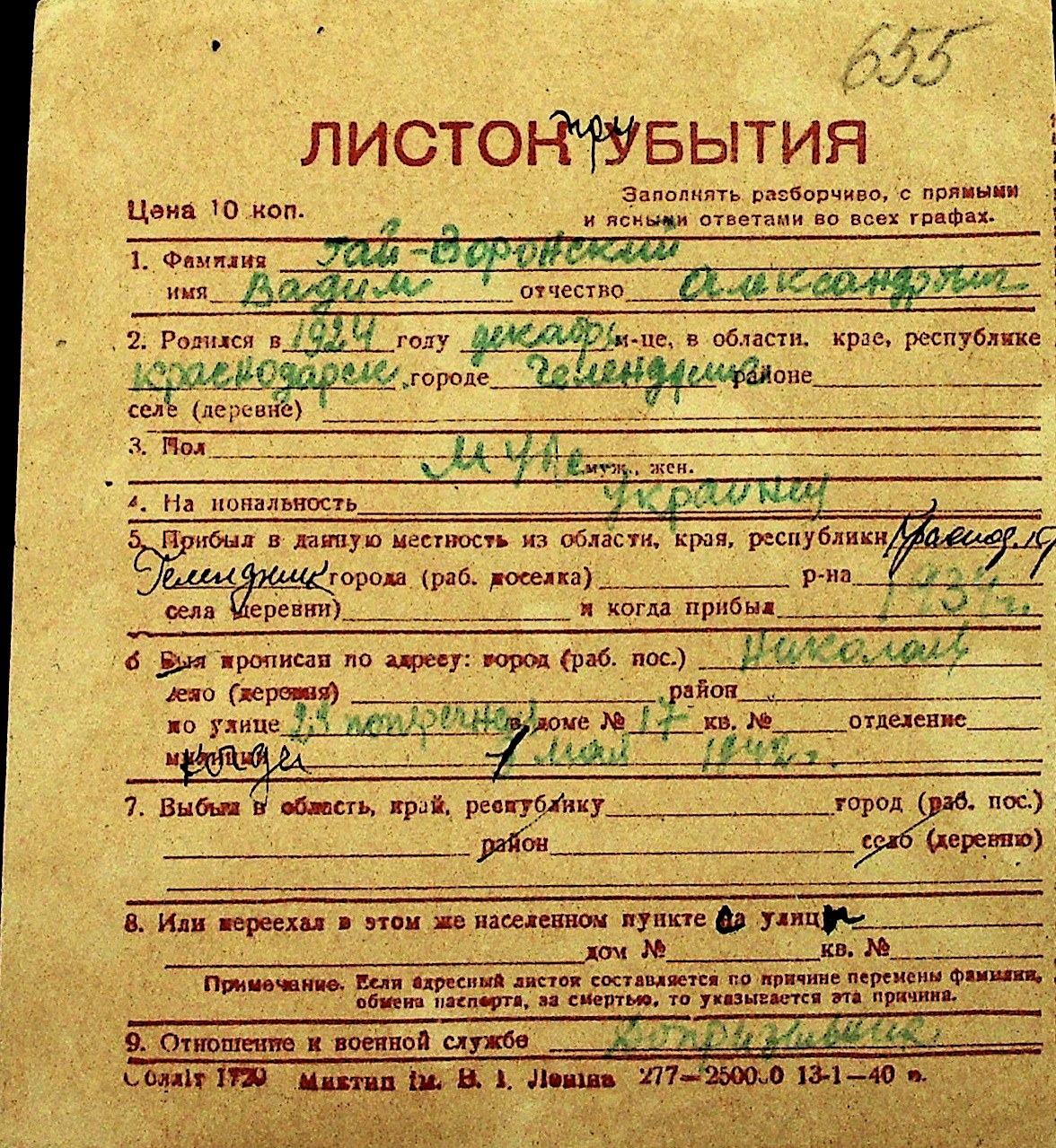 • • Перелік карток до фонду № Н-1016