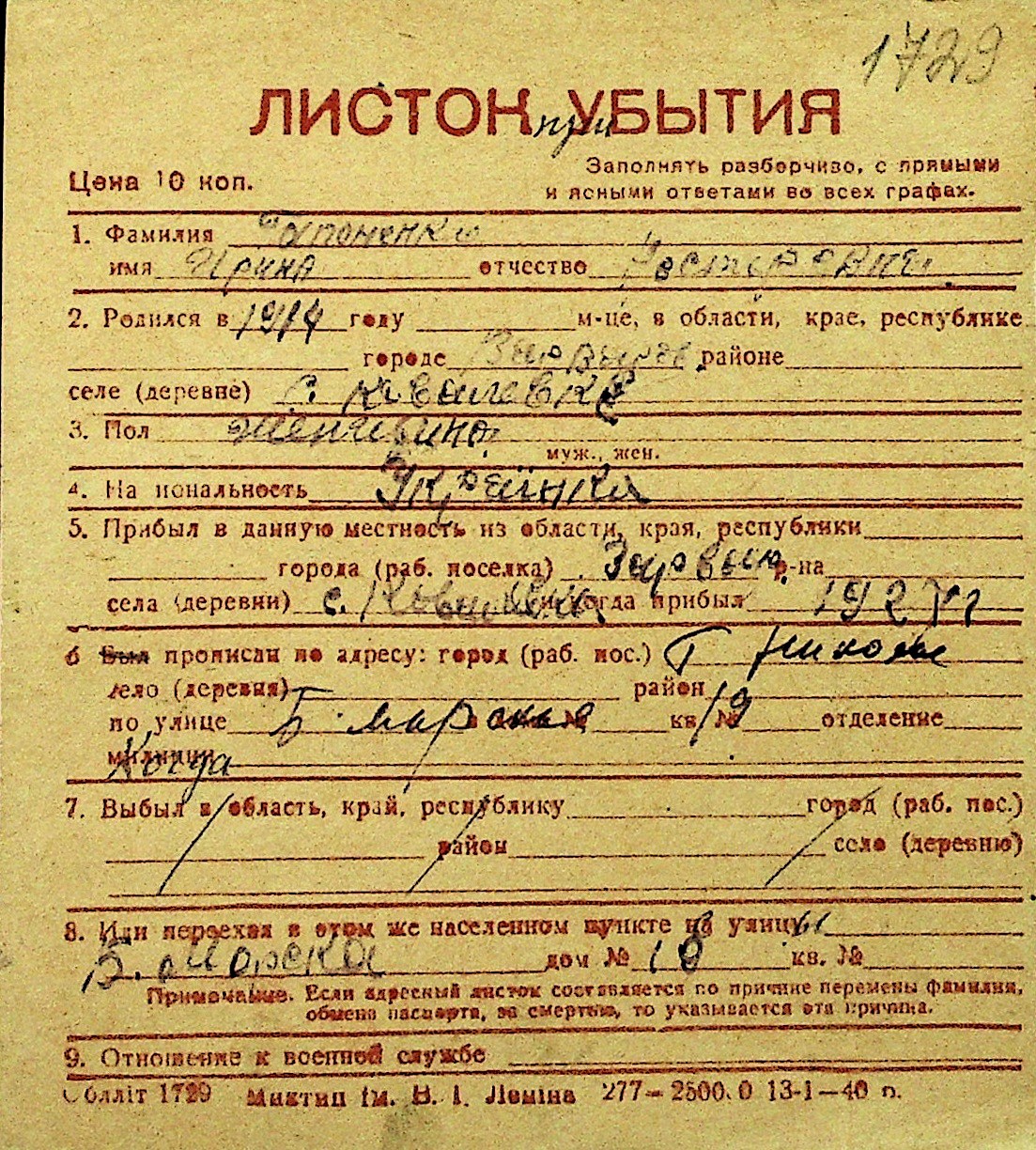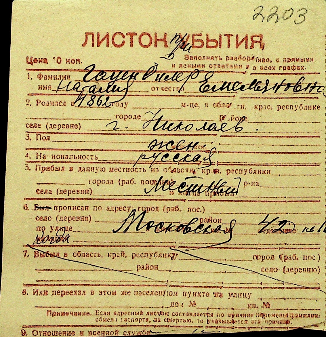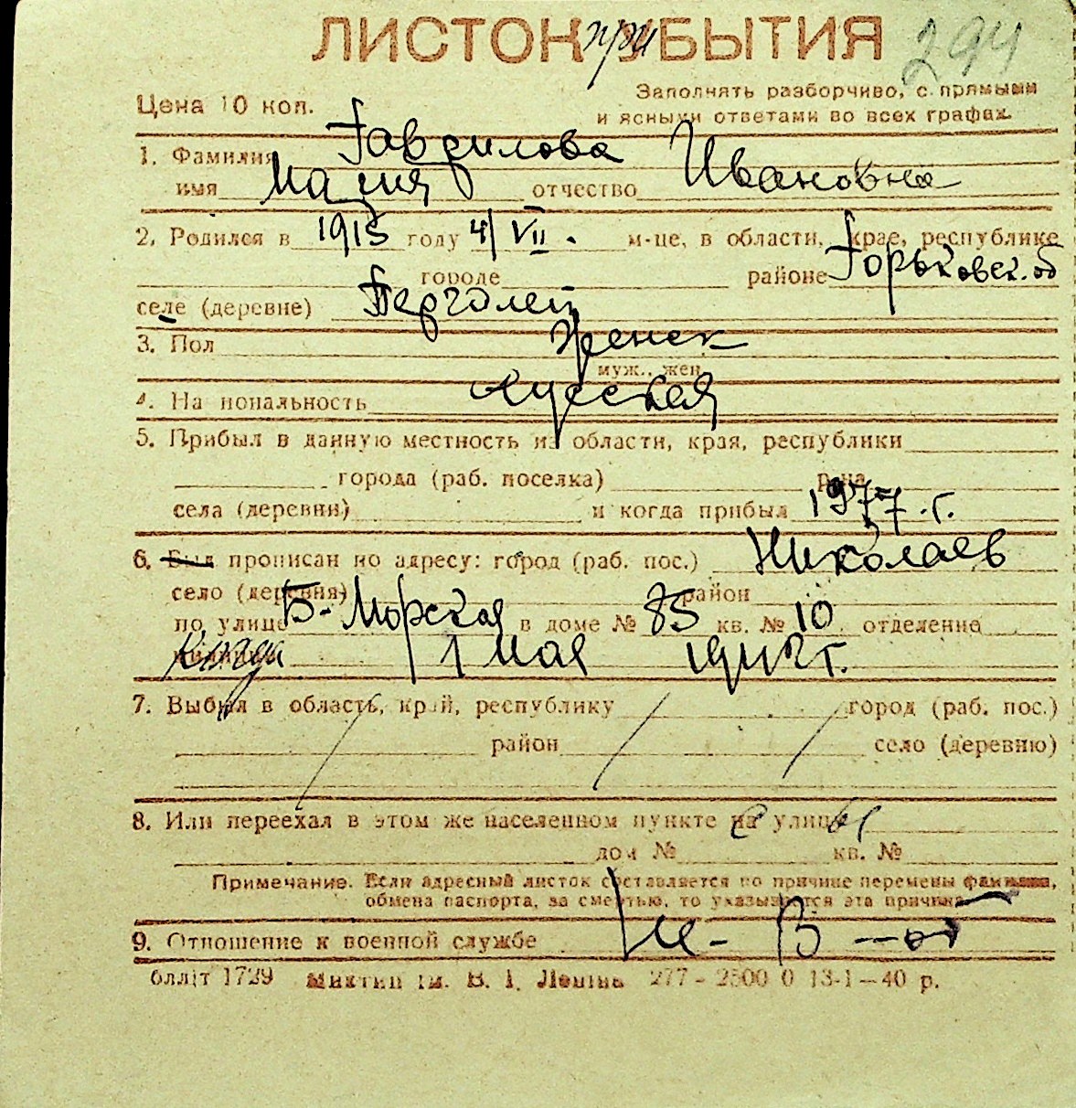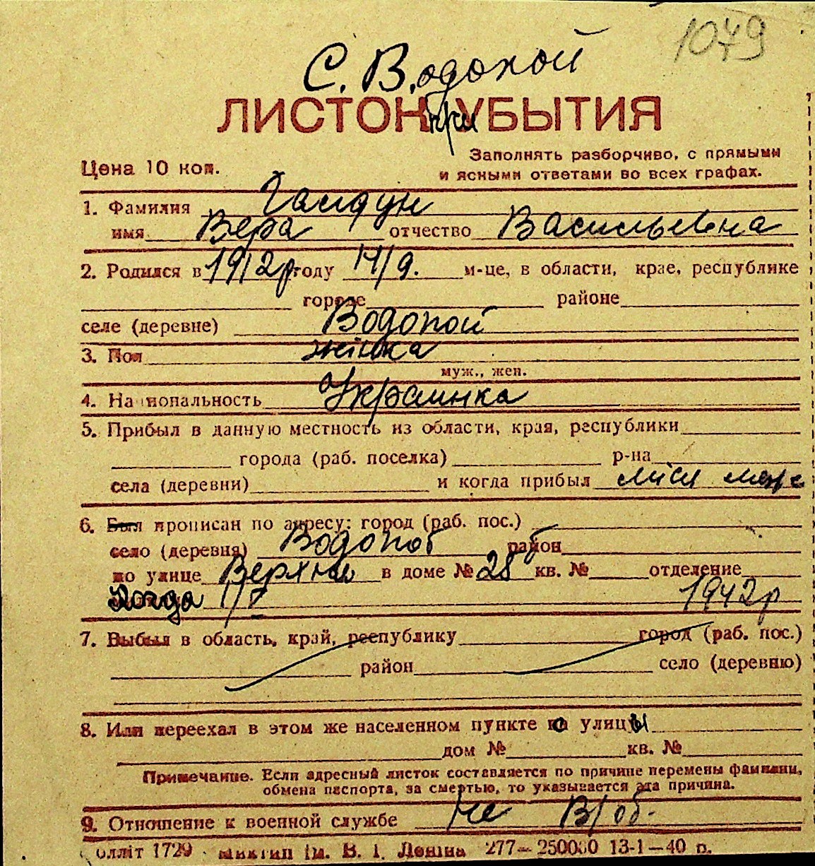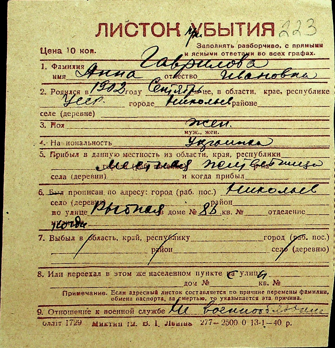 • • Перелік карток до фонду № Н-1016