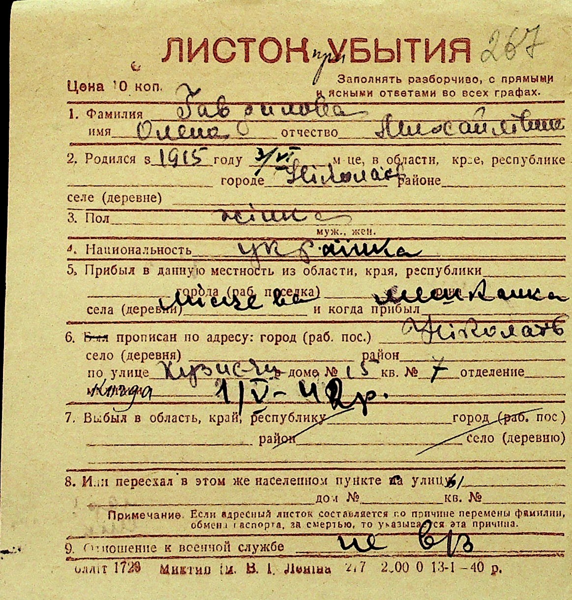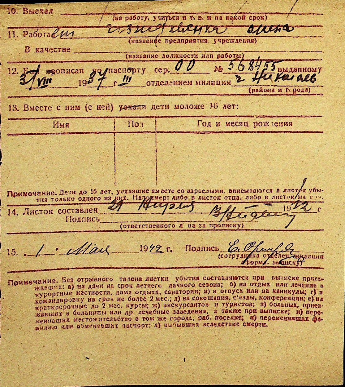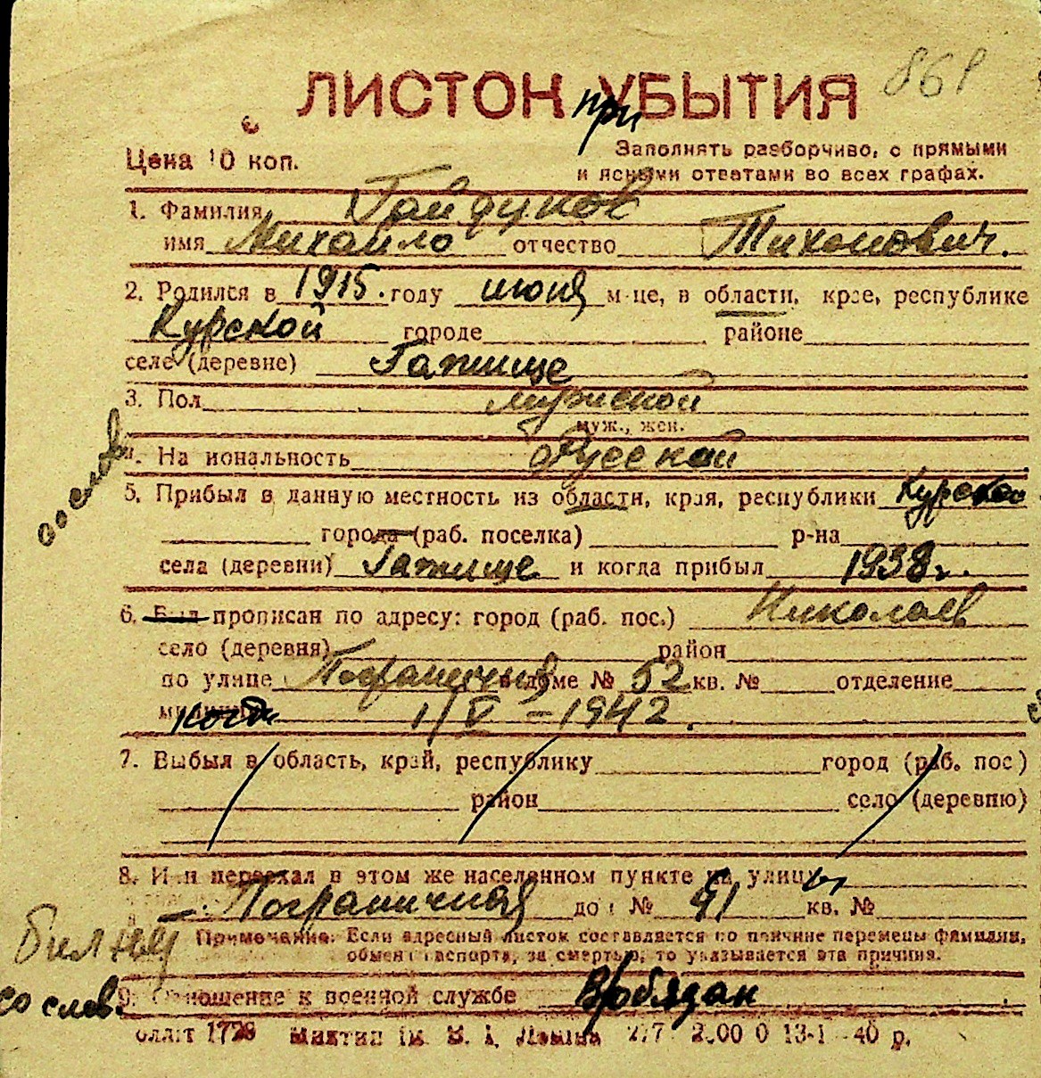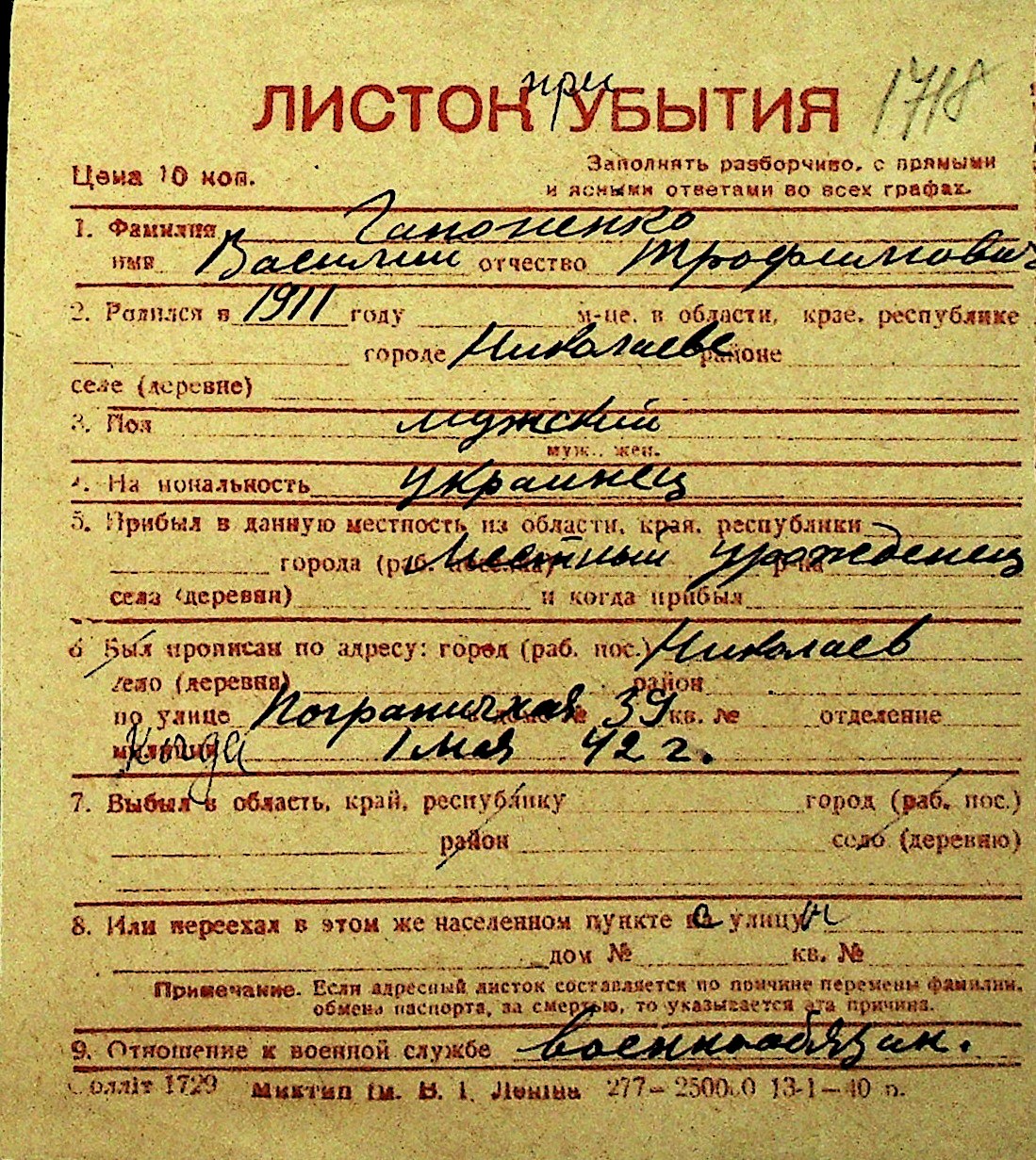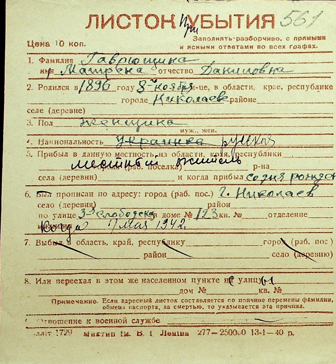 • • Перелік карток до фонду № Н-1016