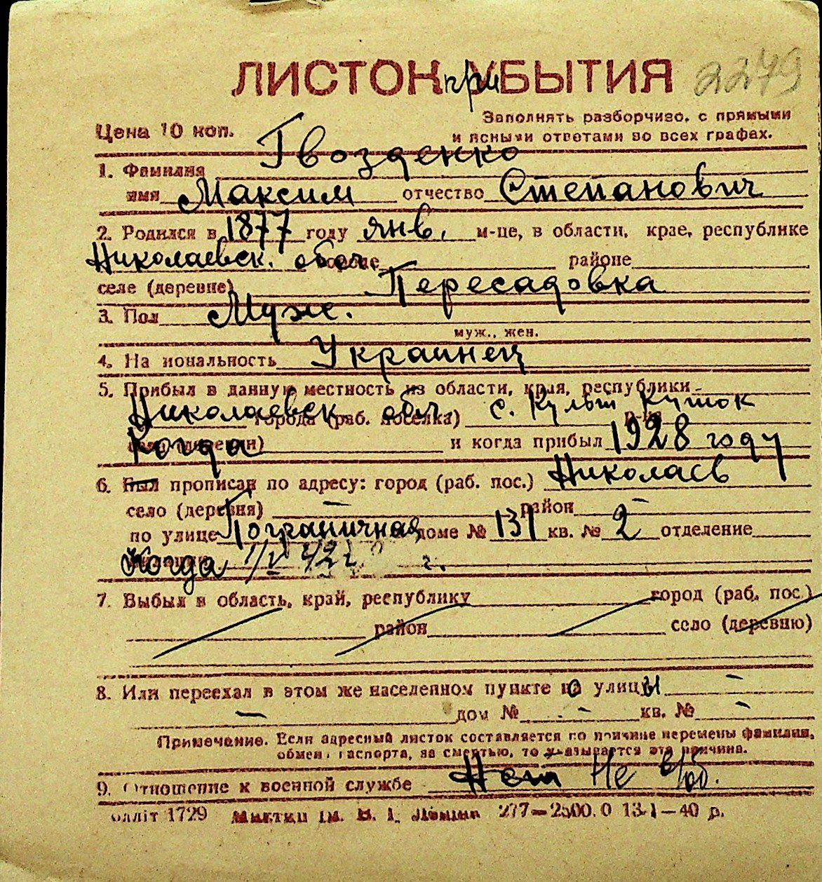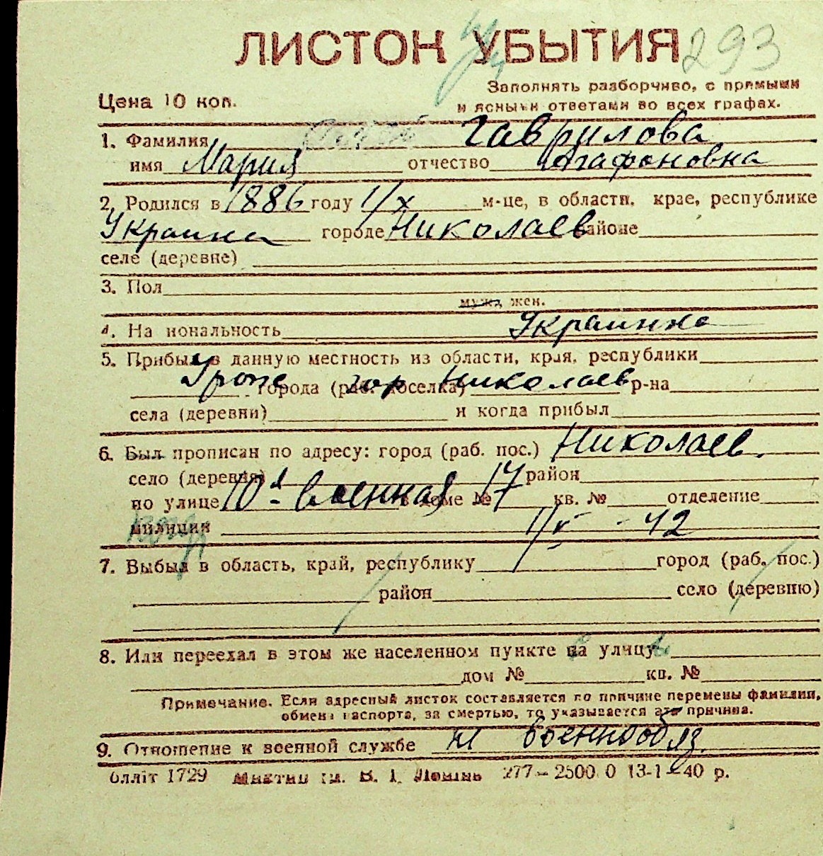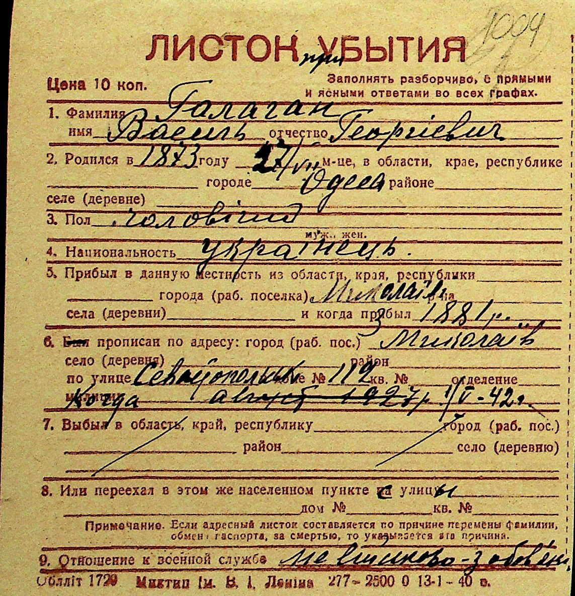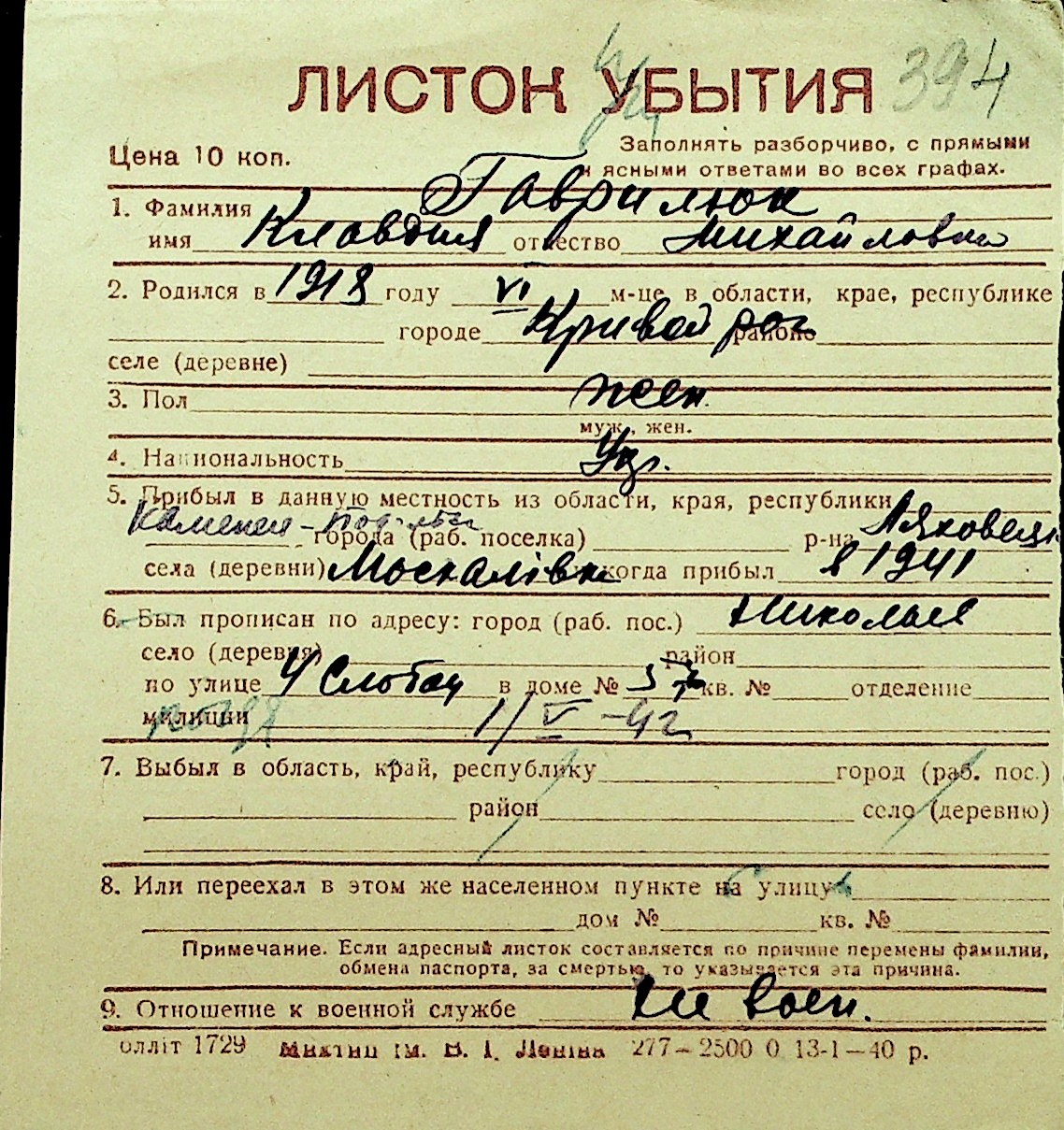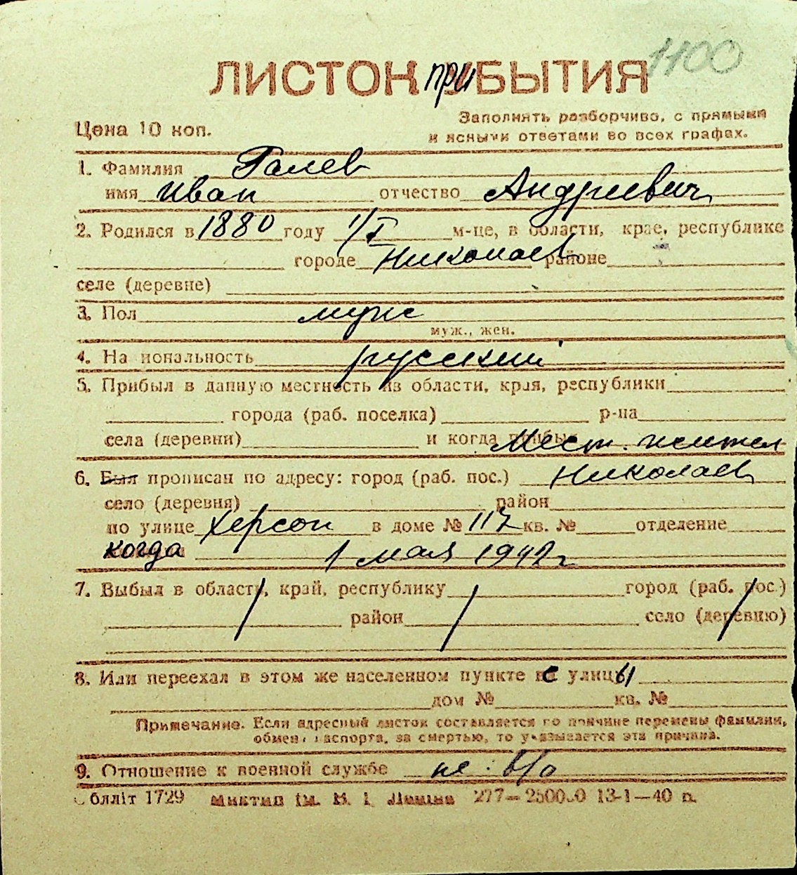 • • Перелік карток до фонду № Н-1016