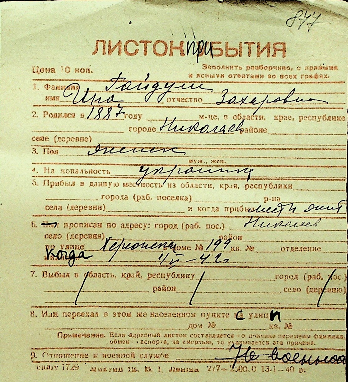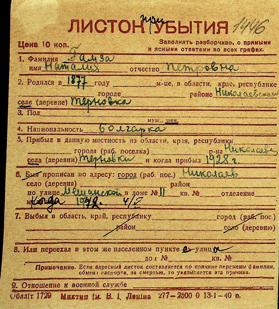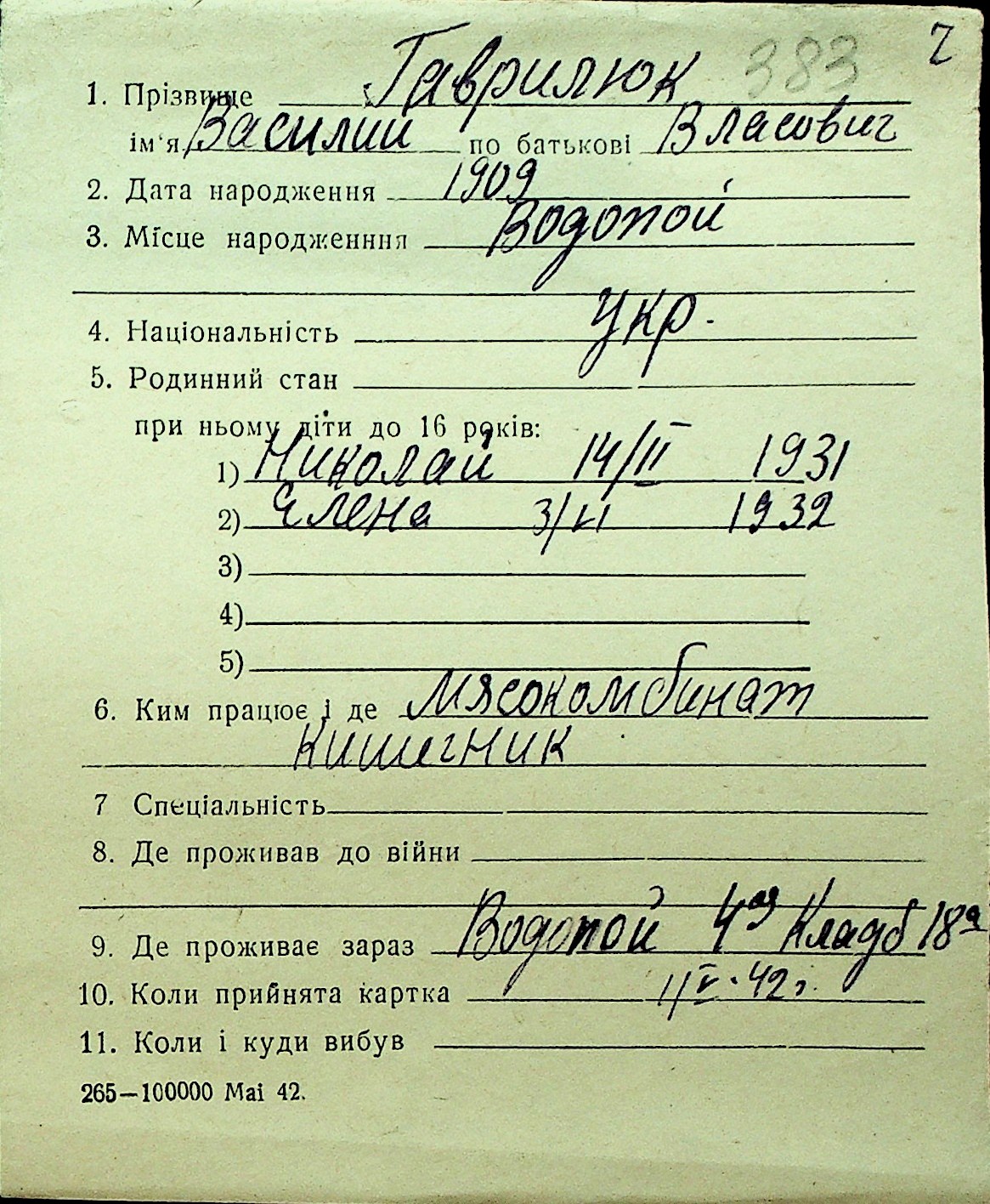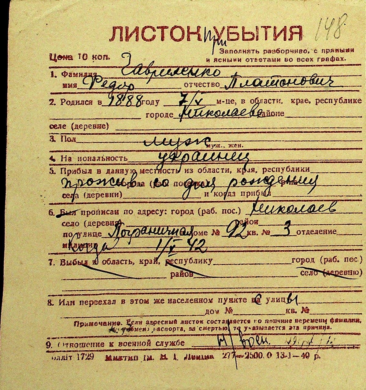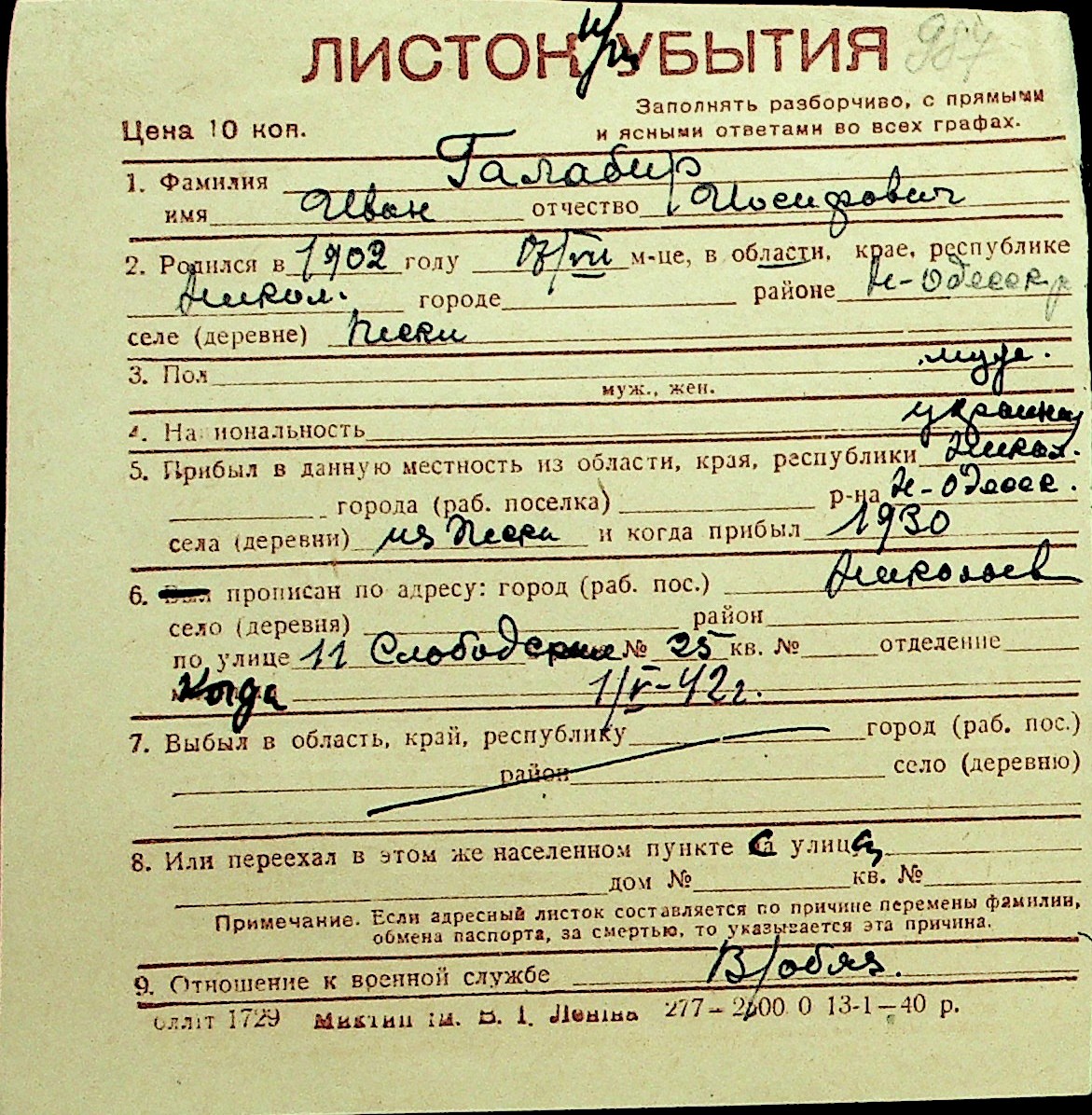 • • Перелік карток до фонду № Н-1016