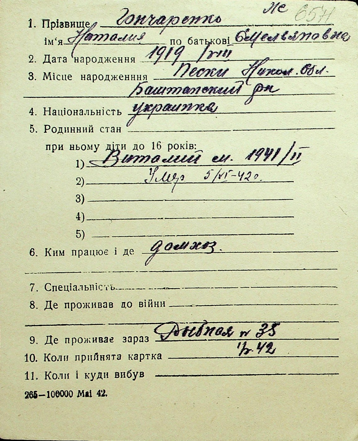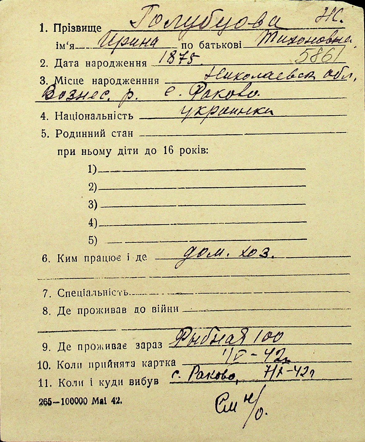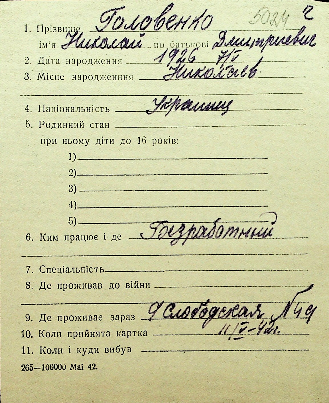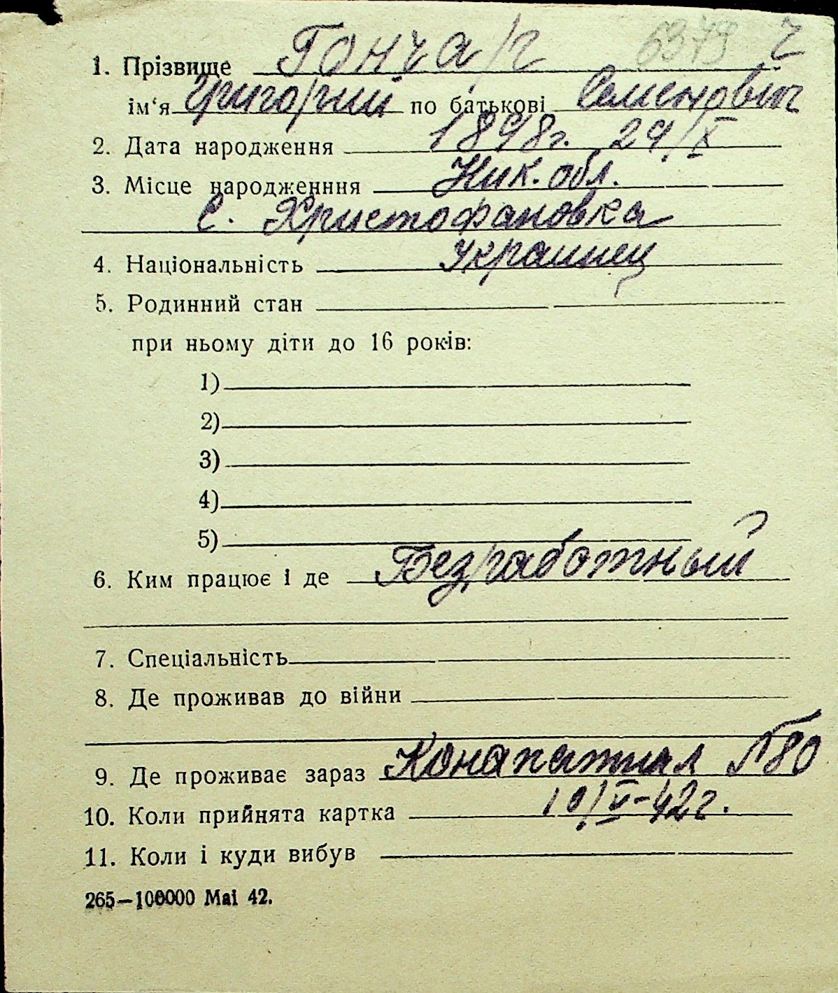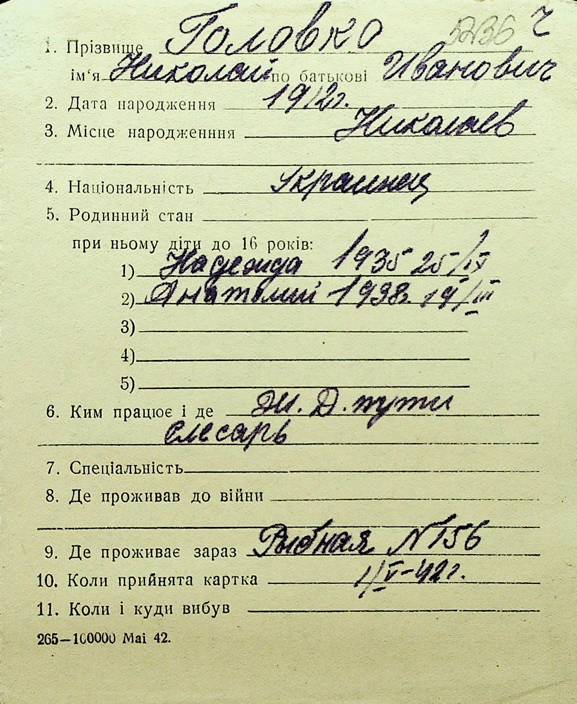 • • Перелік карток до фонду № Н-1016