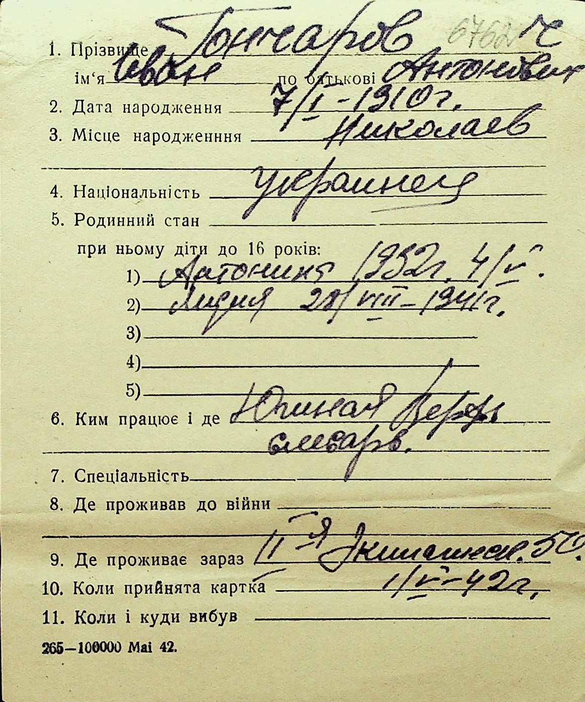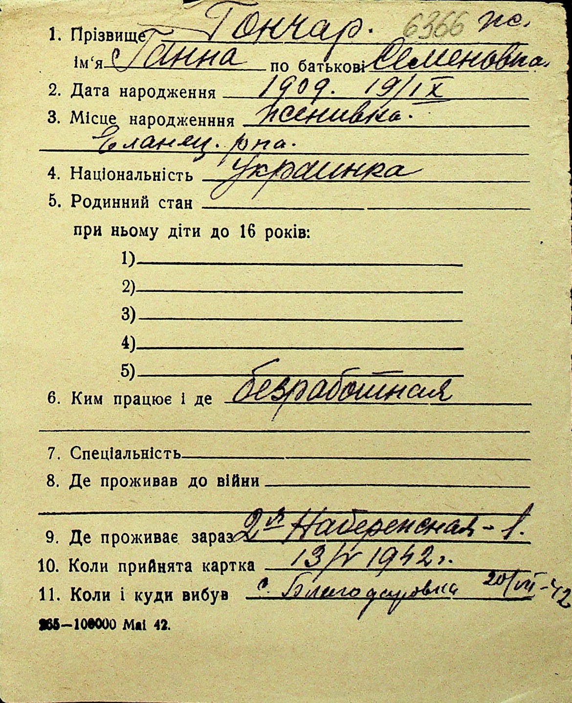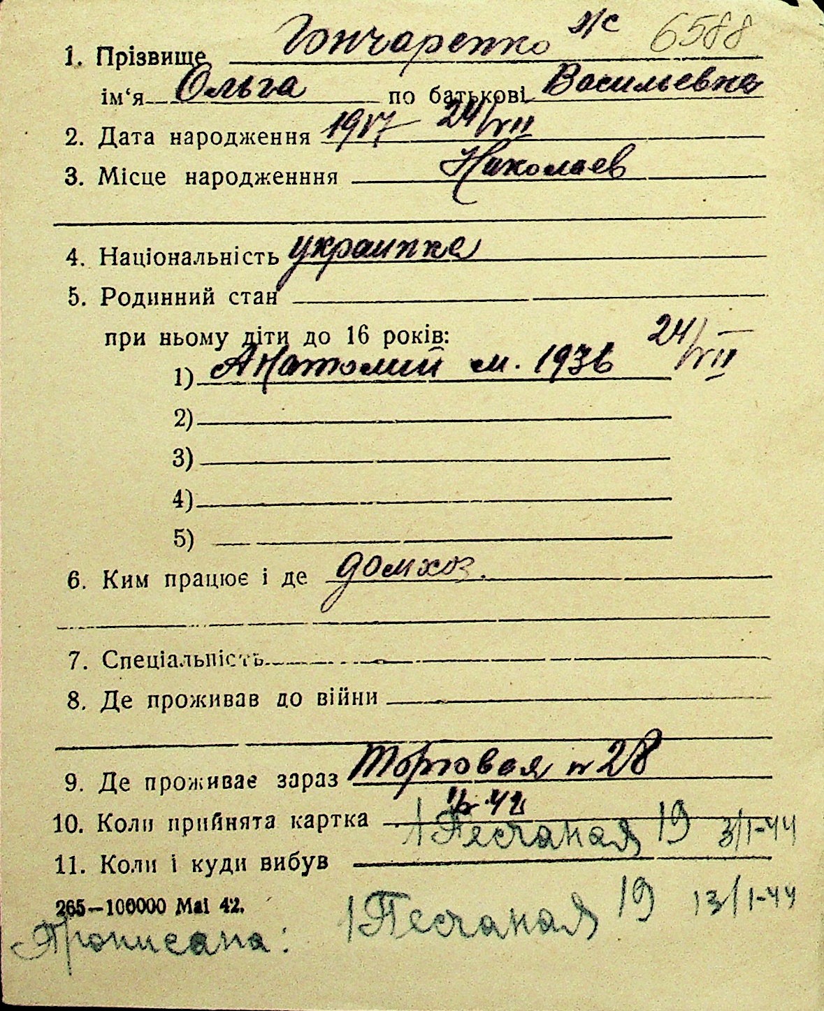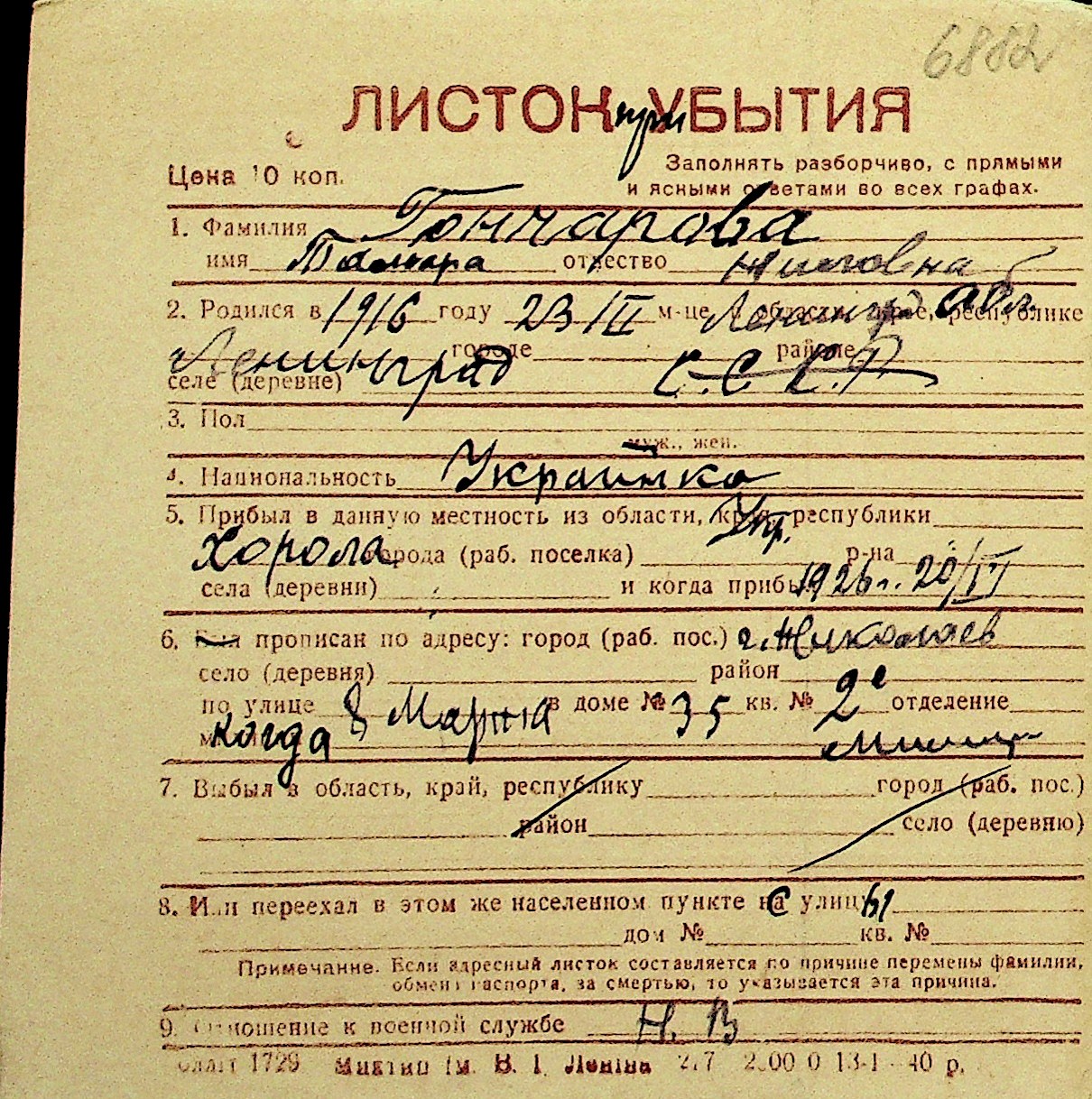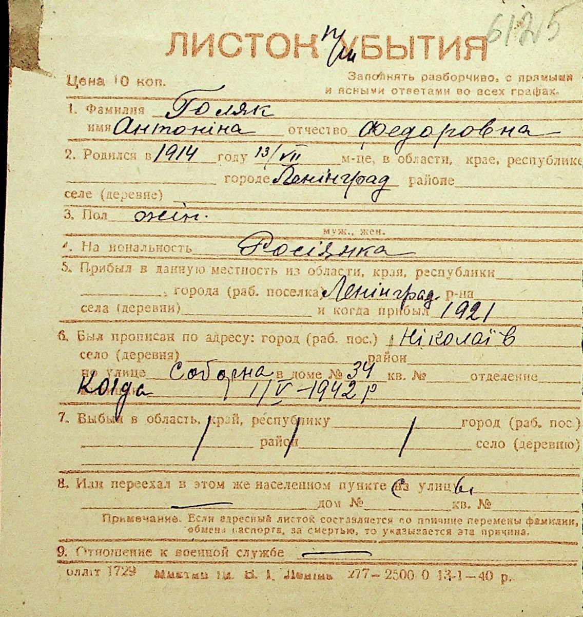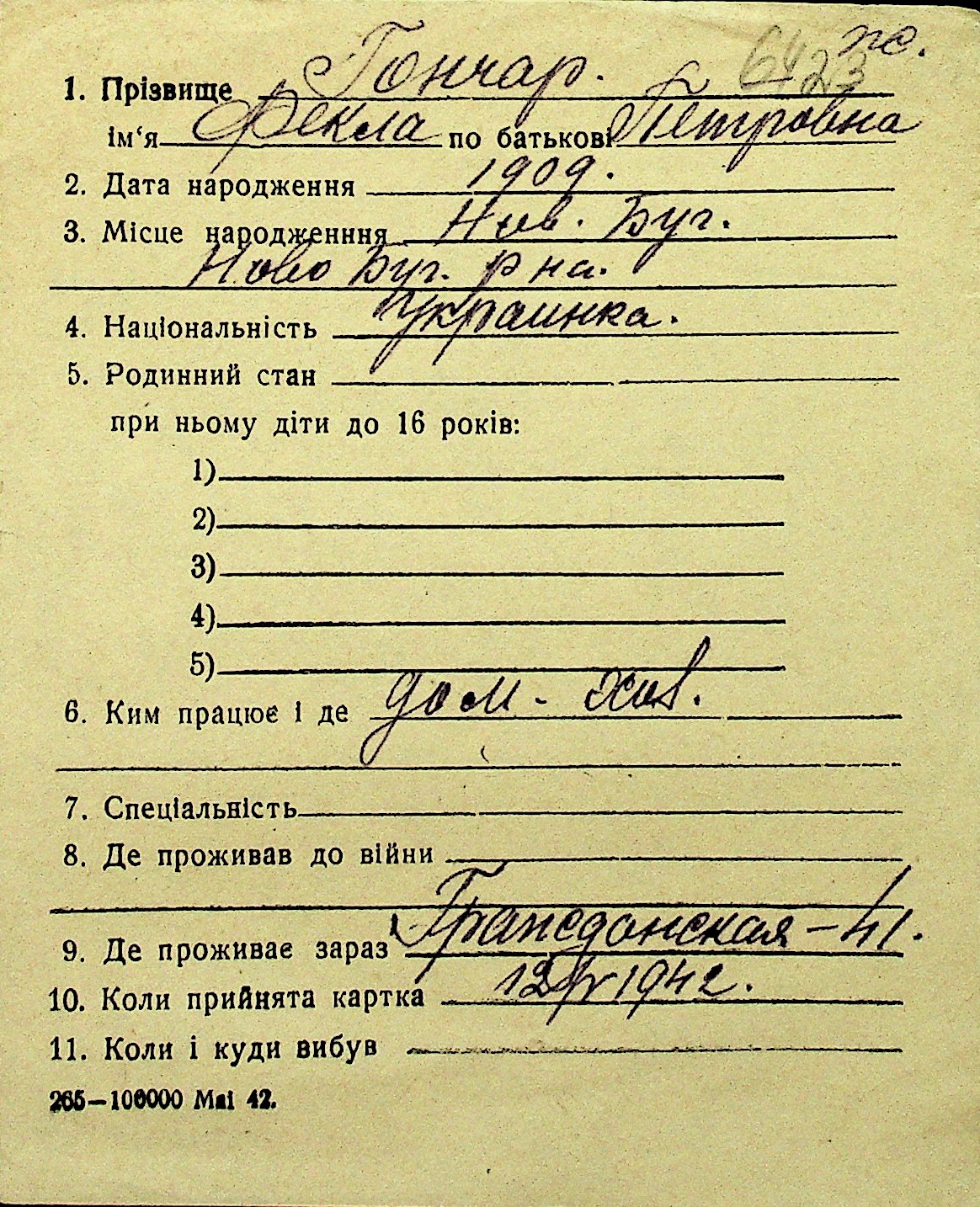 • • Перелік карток до фонду № Н-1016