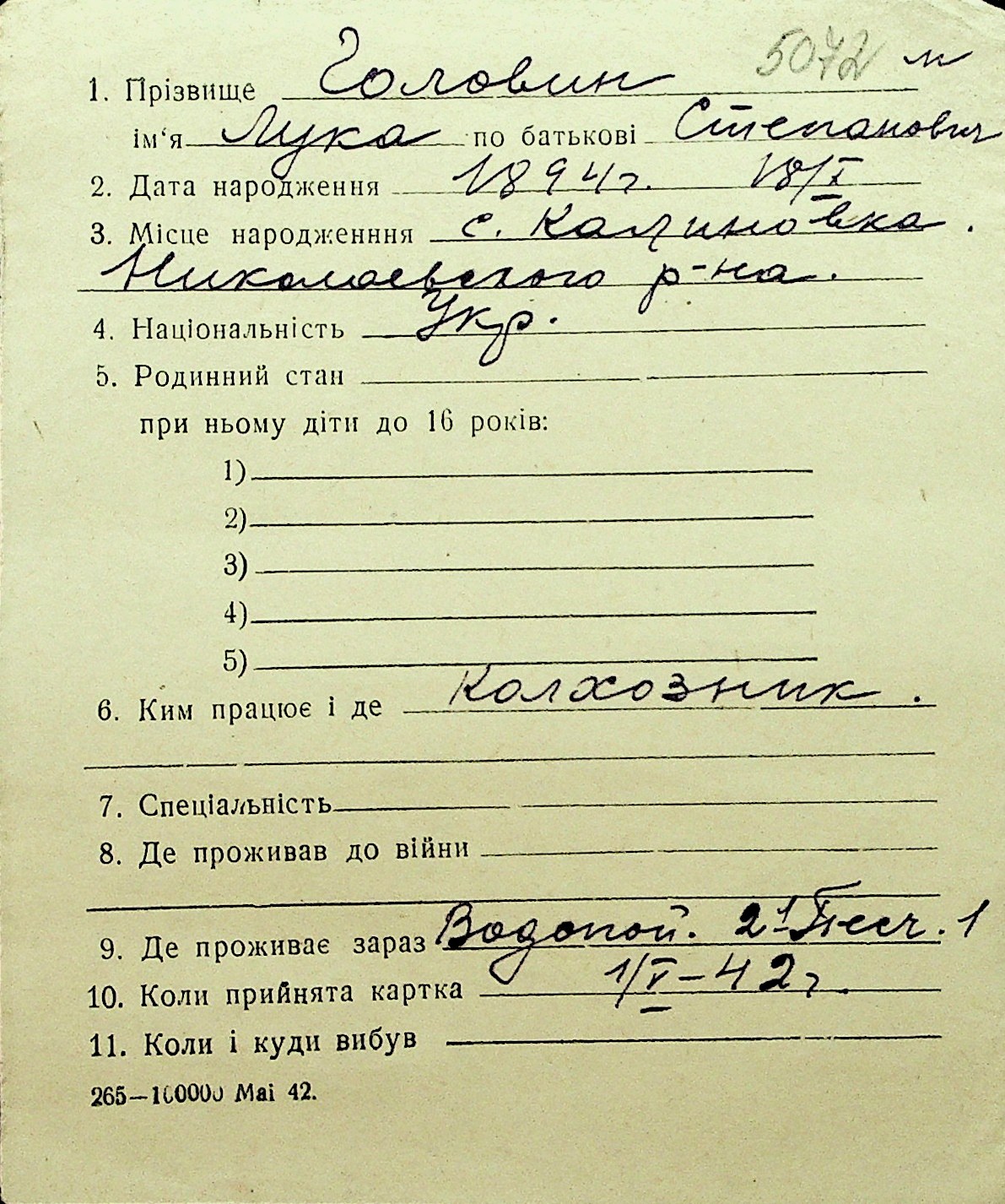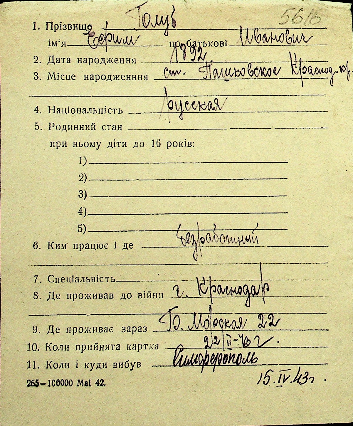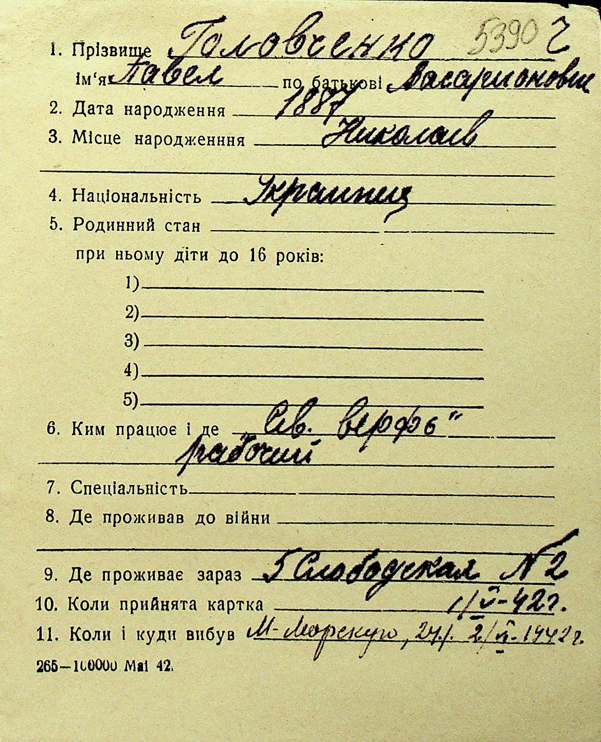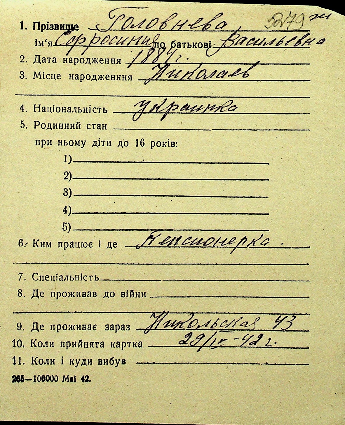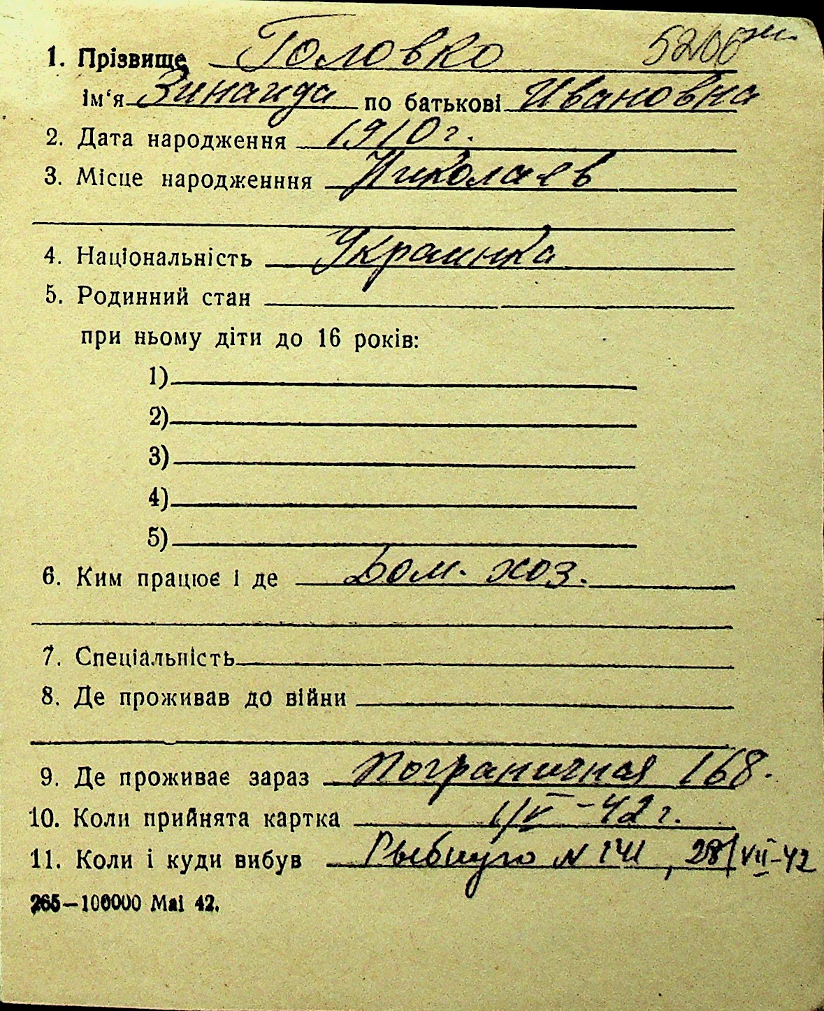 • • Перелік карток до фонду № Н-1016
