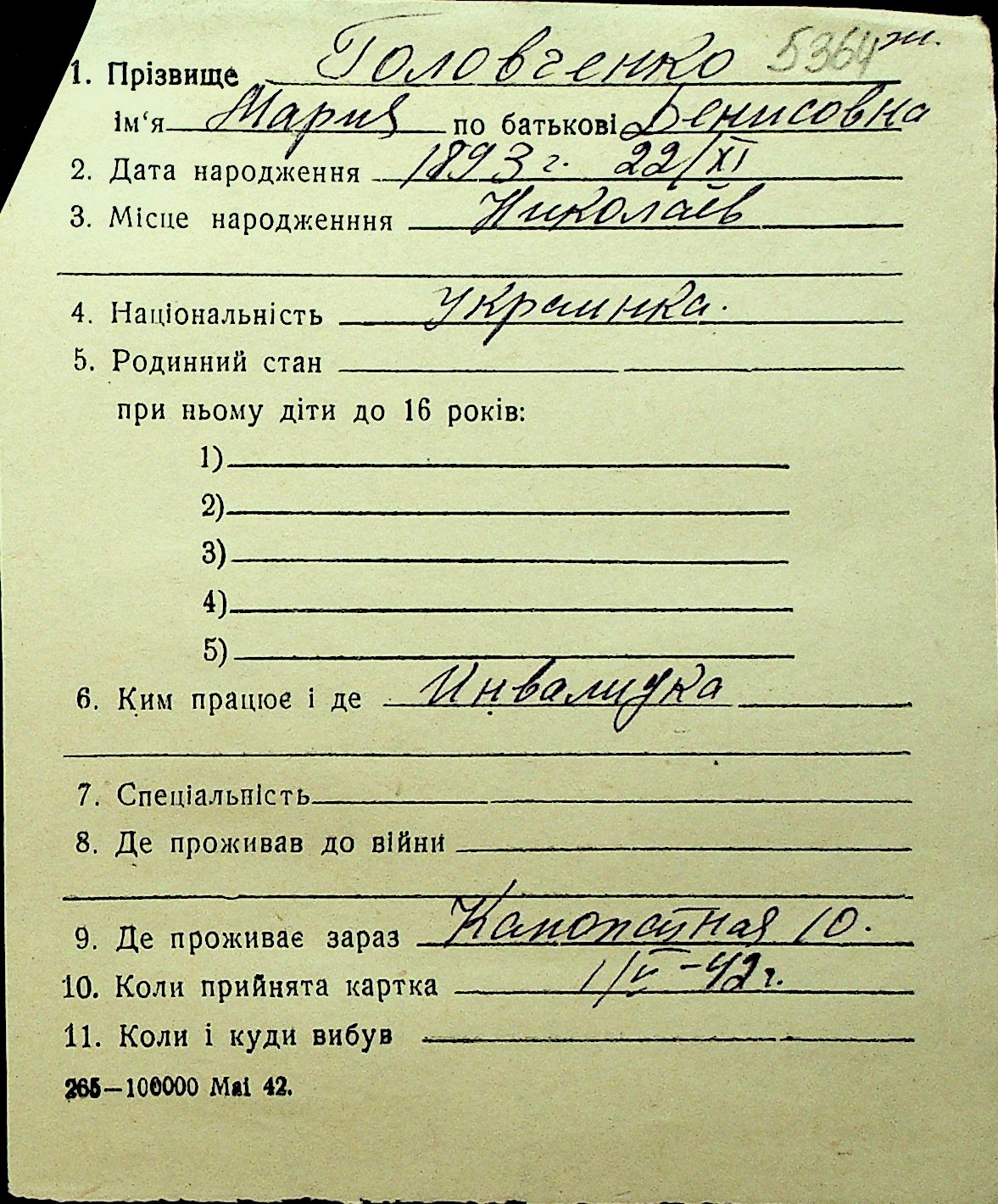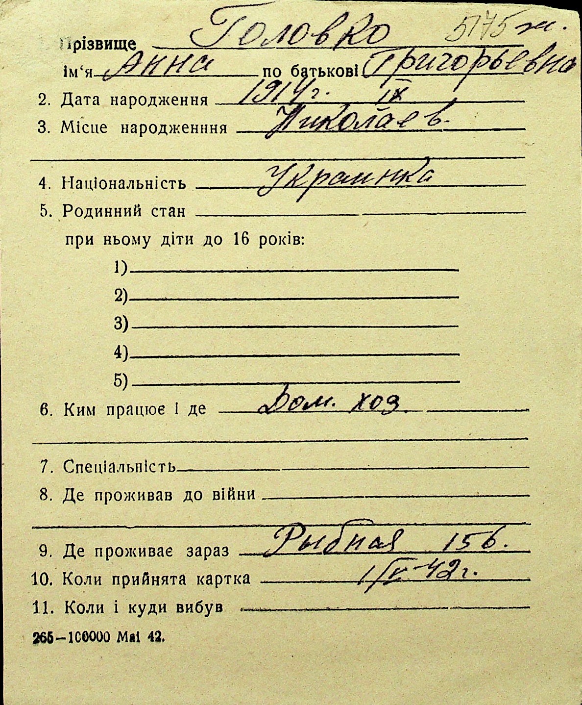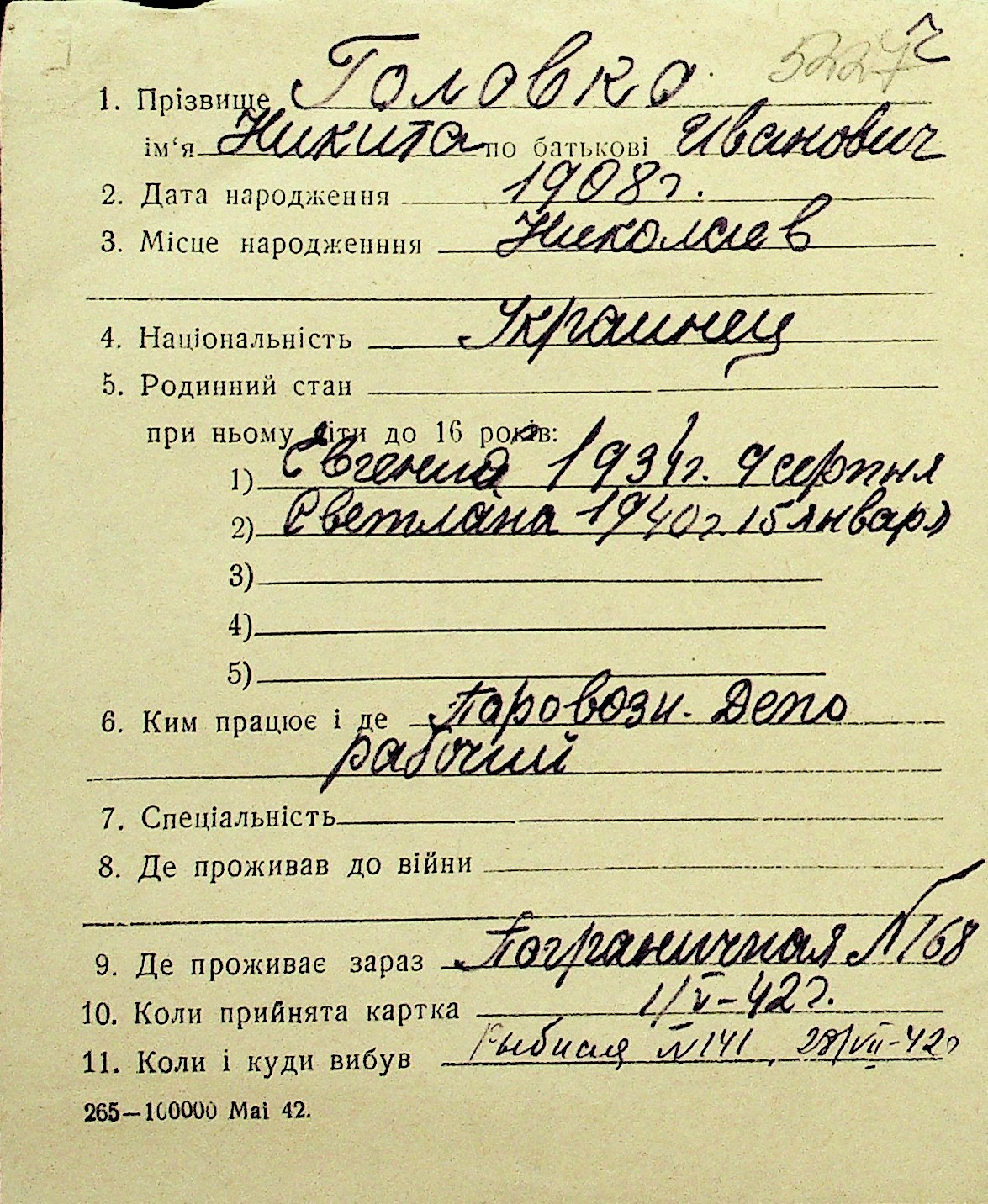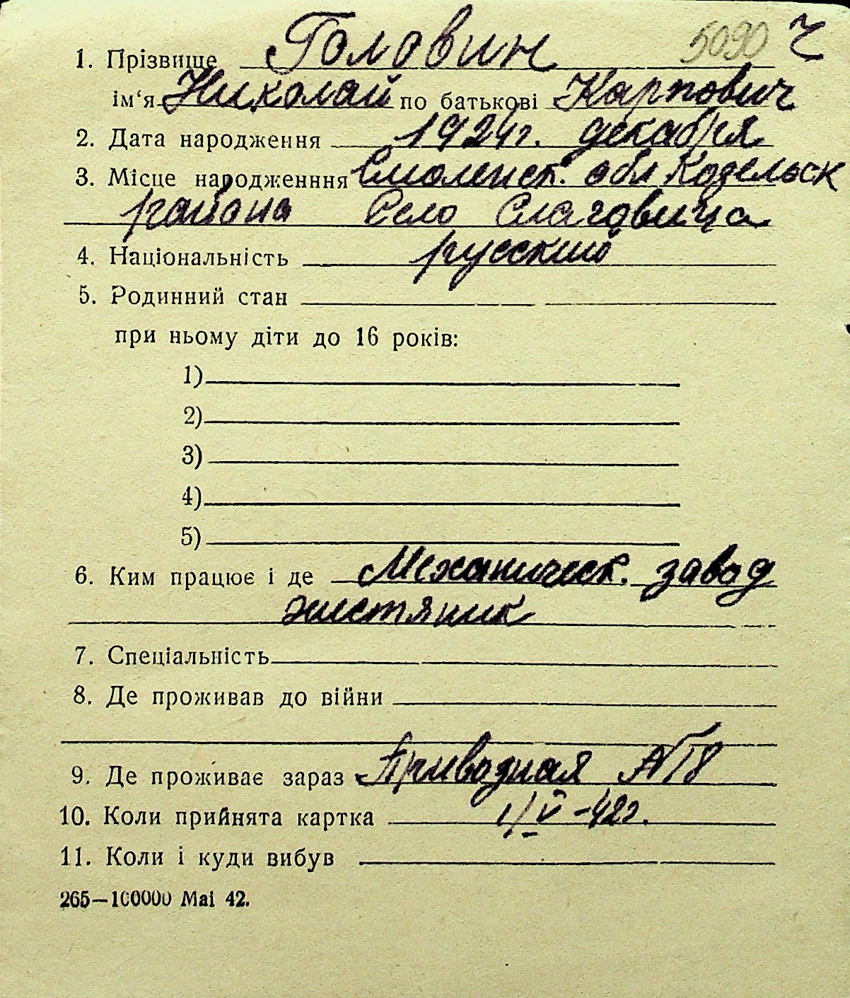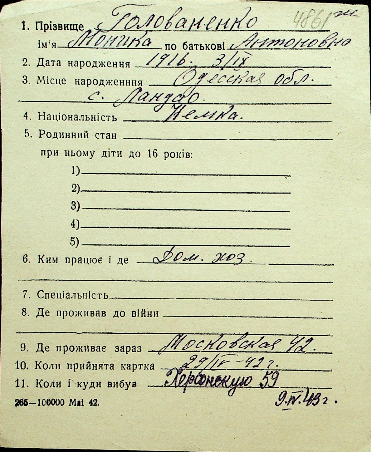 • • Перелік карток до фонду № Н-1016