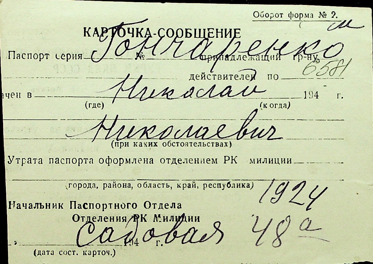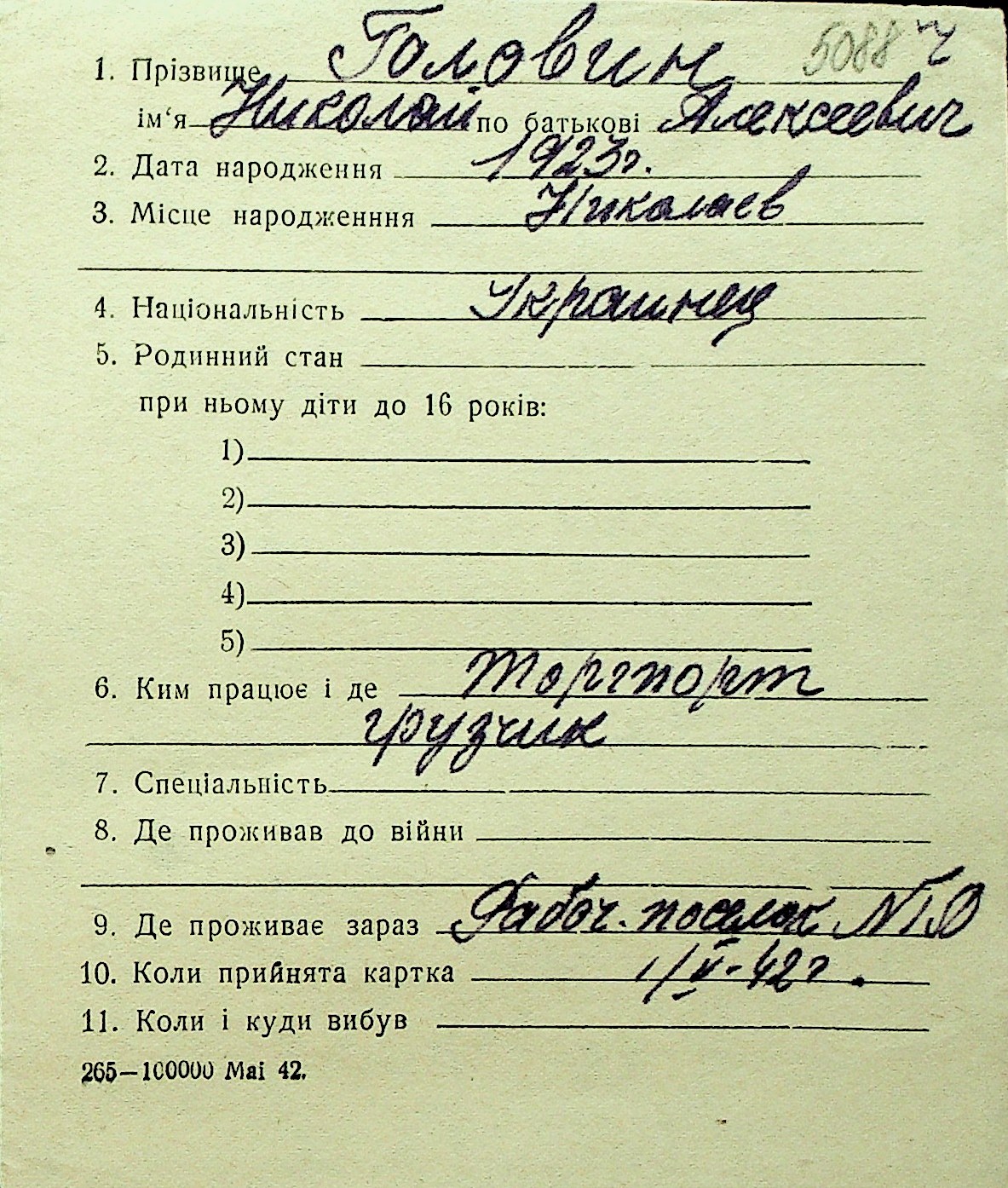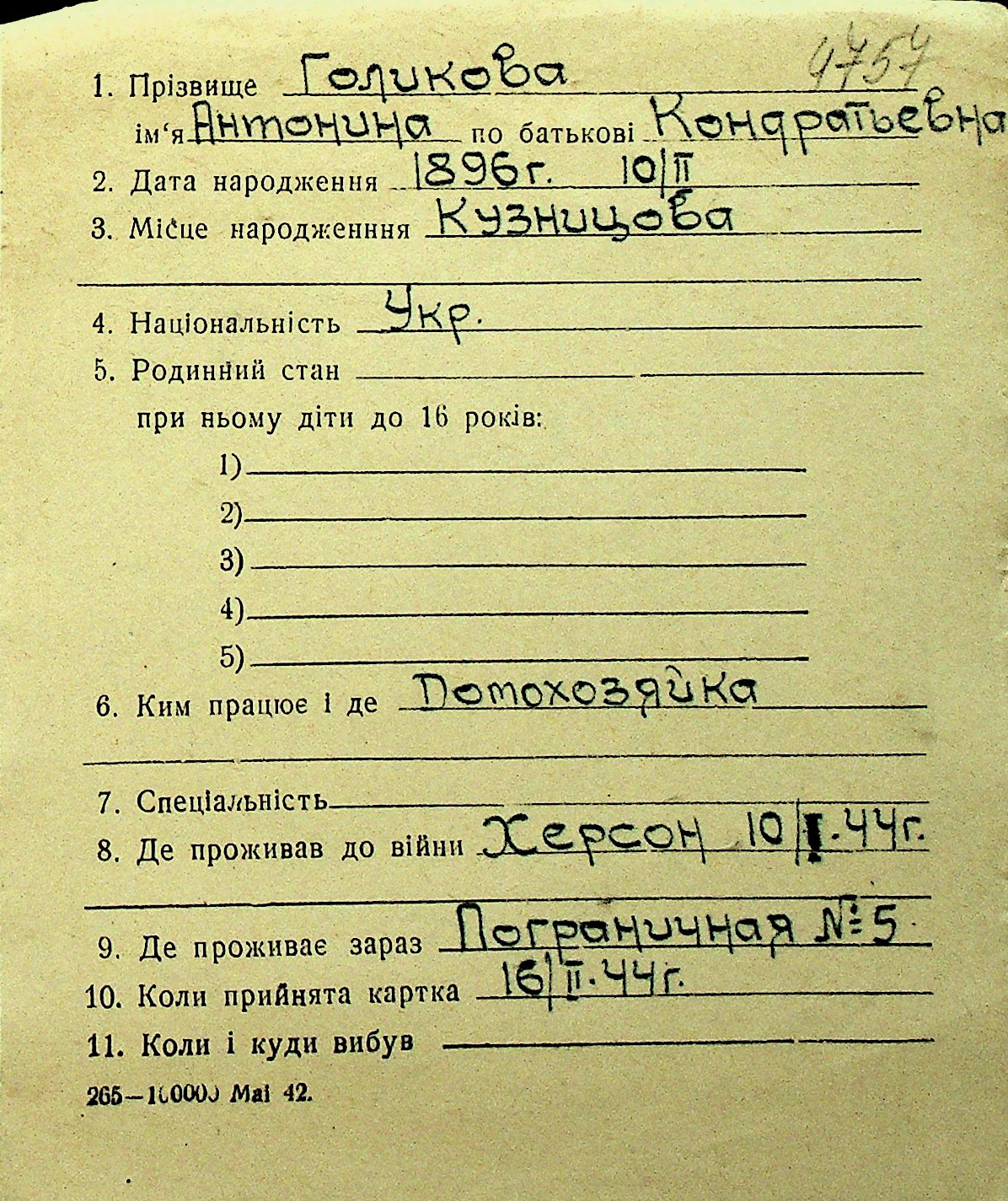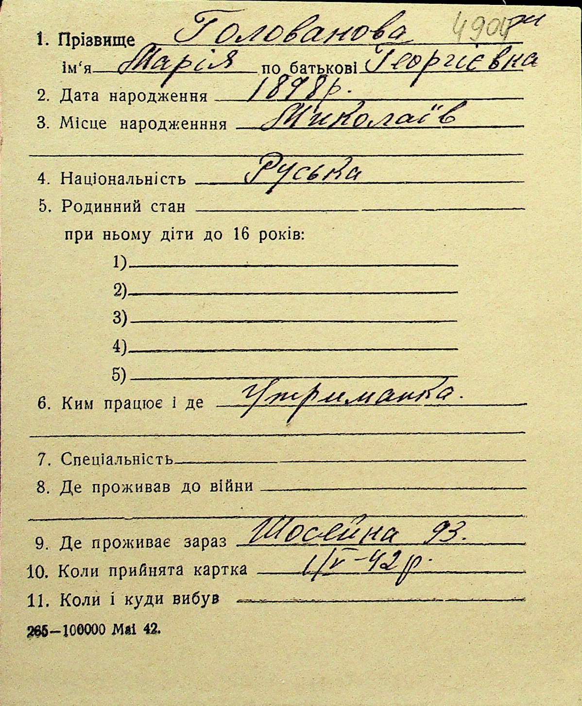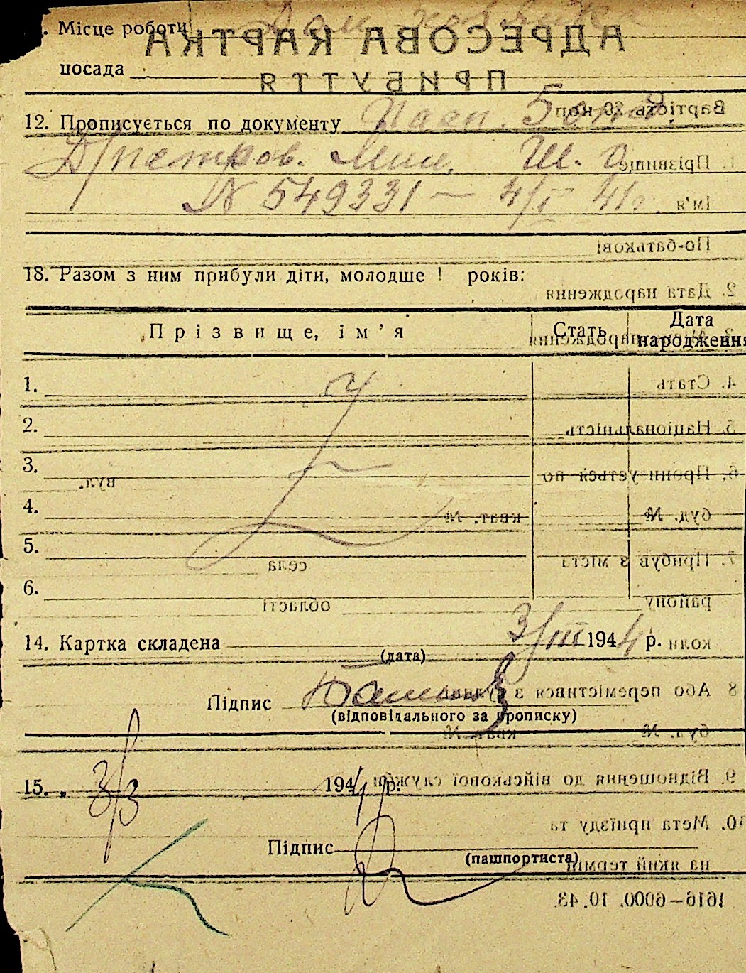 • • Перелік карток до фонду № Н-1016