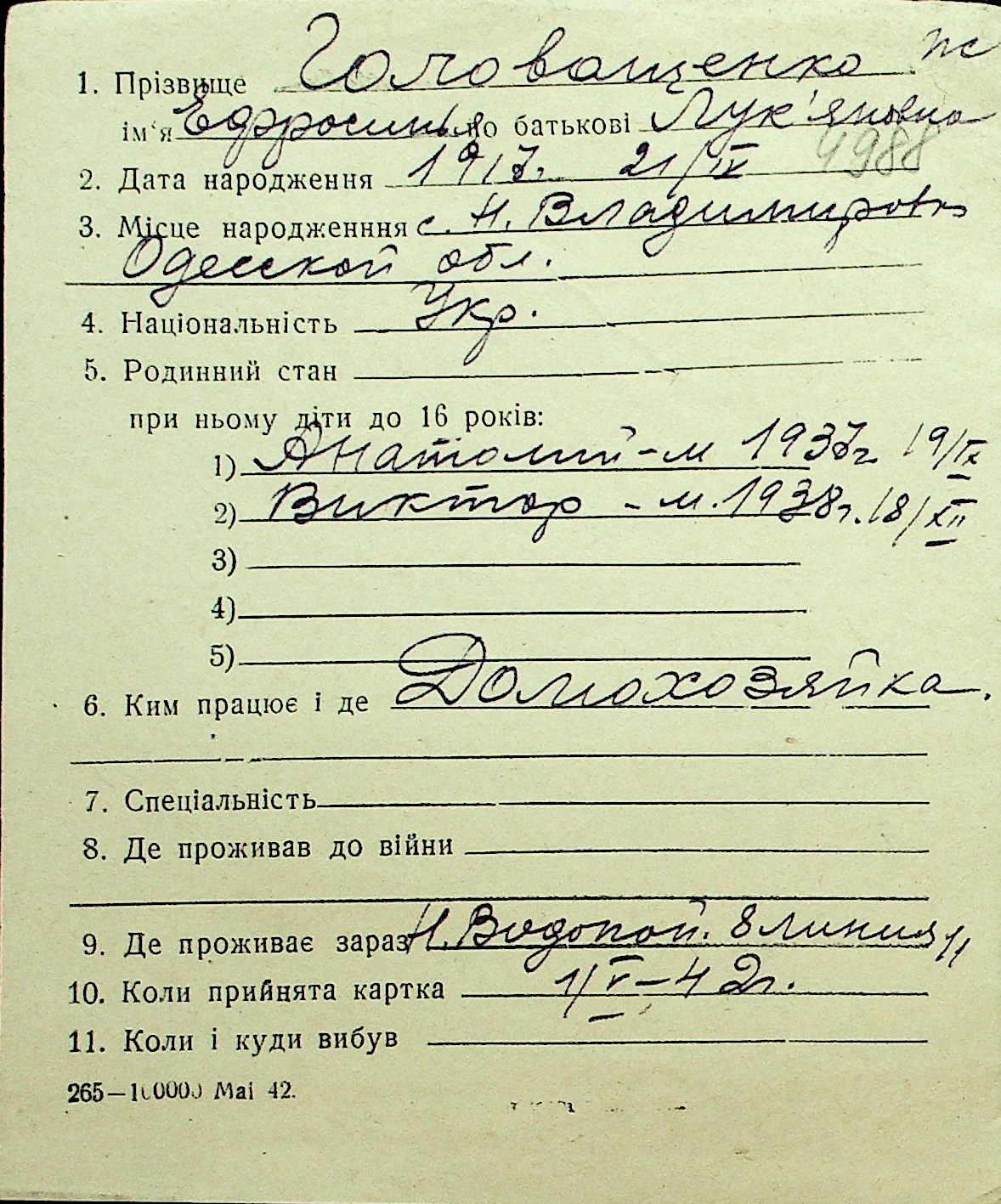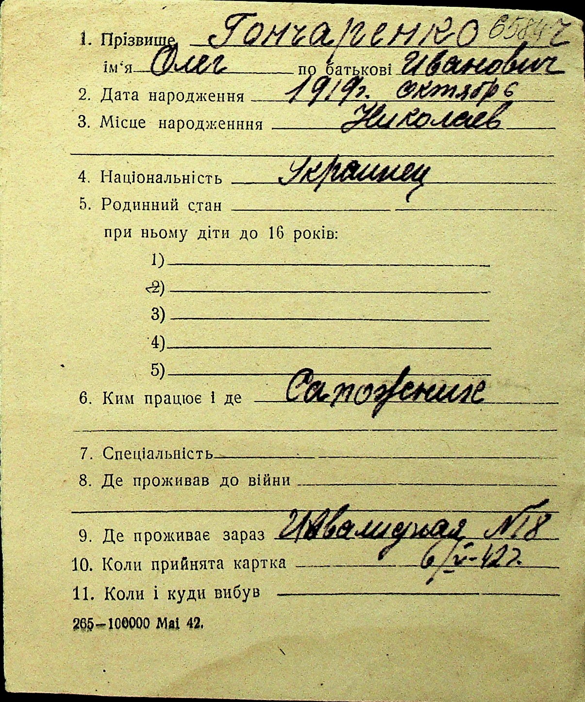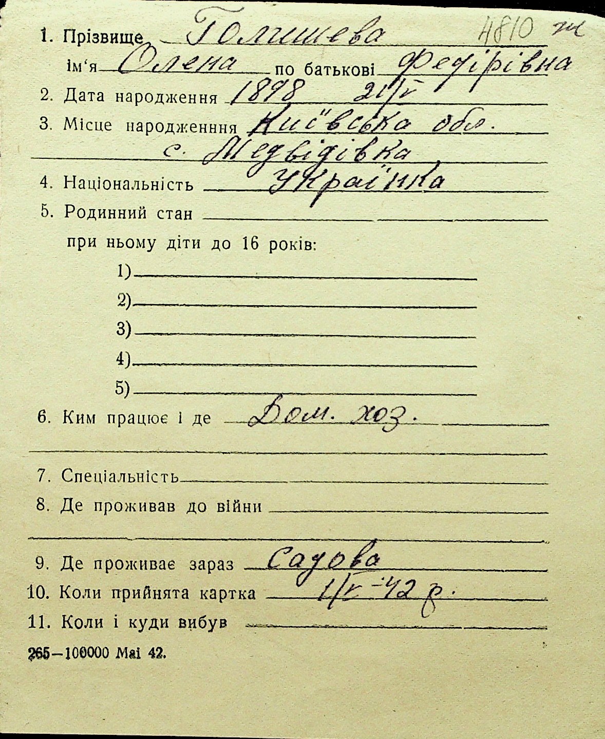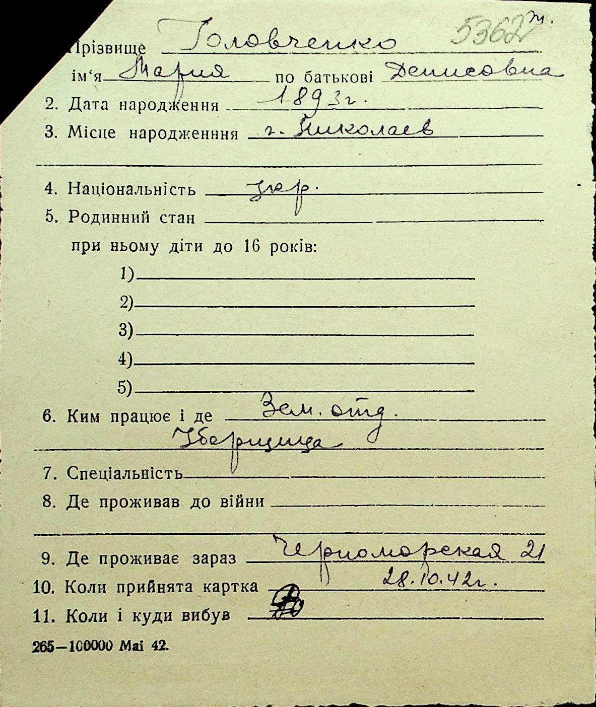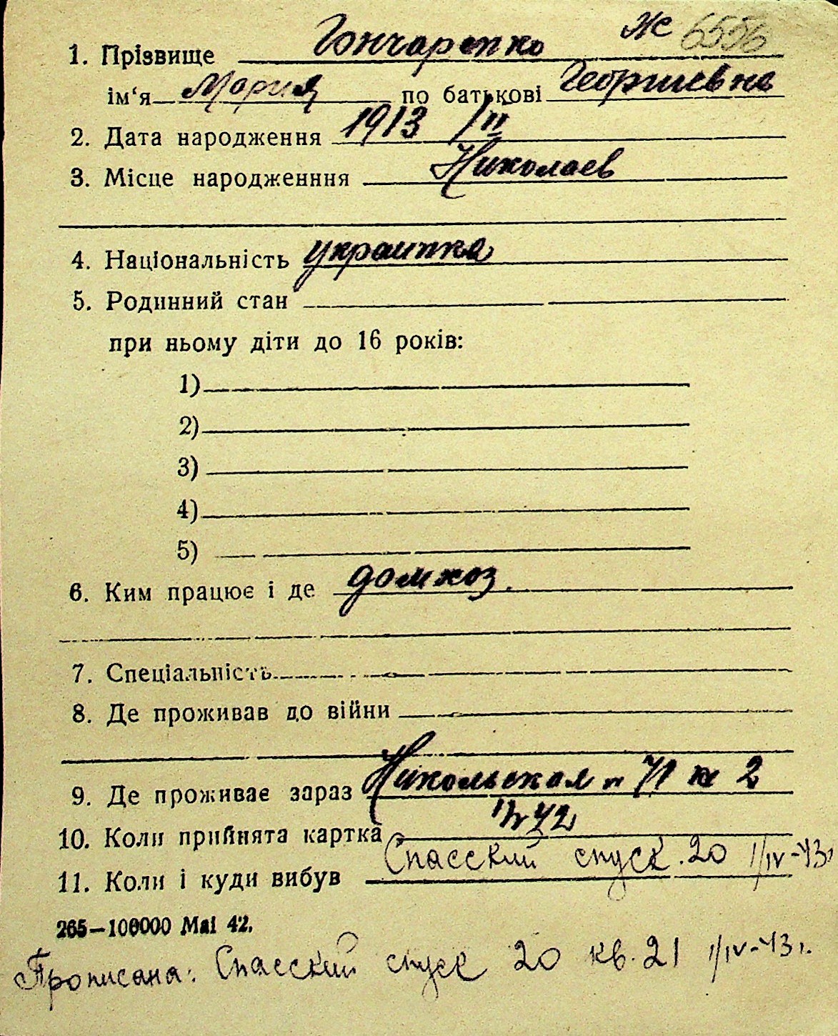 • • Перелік карток до фонду № Н-1016