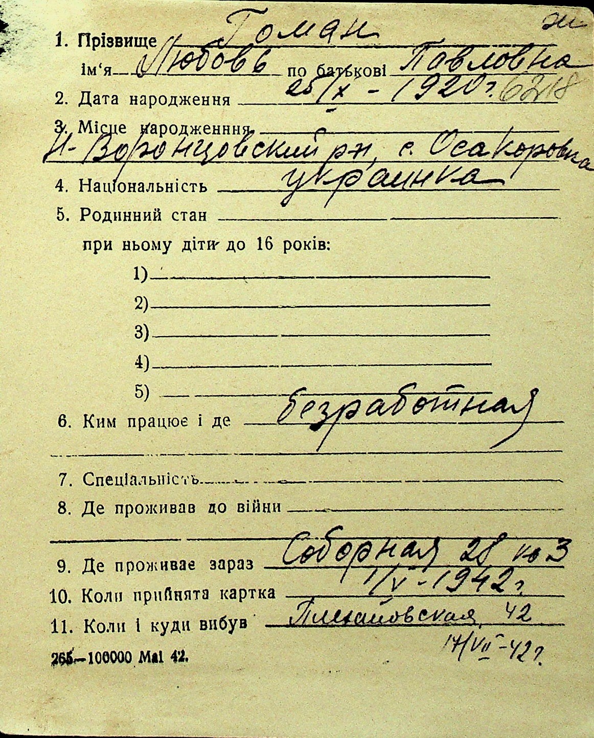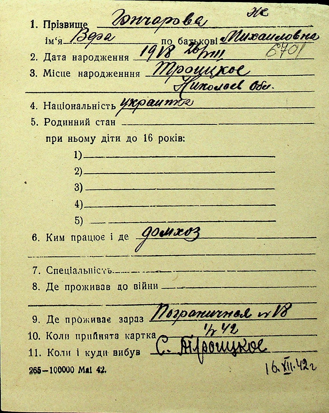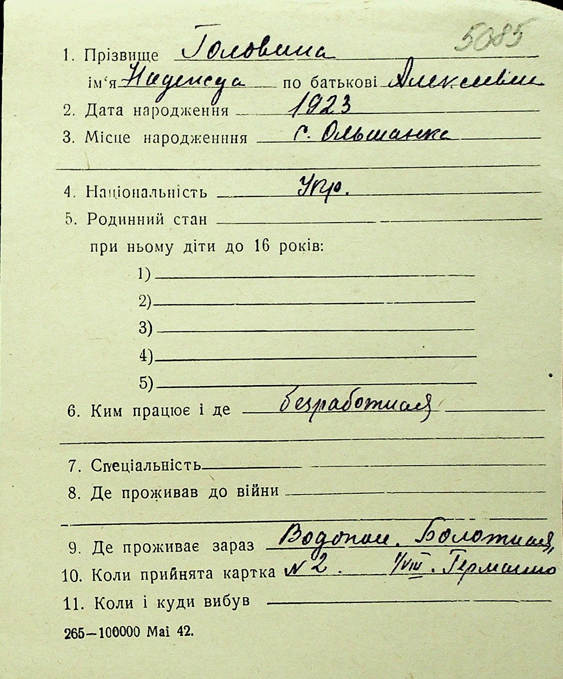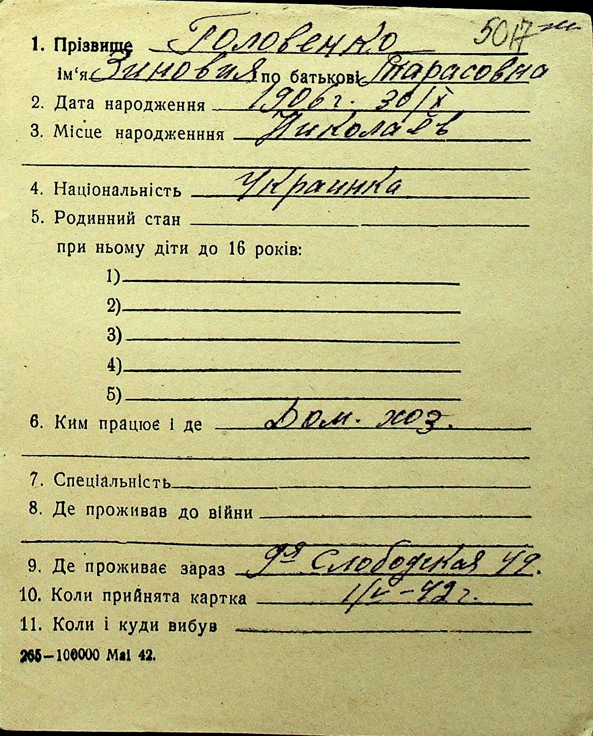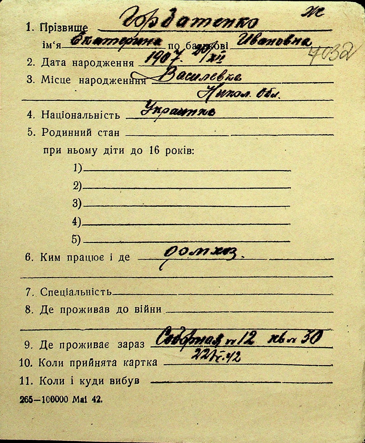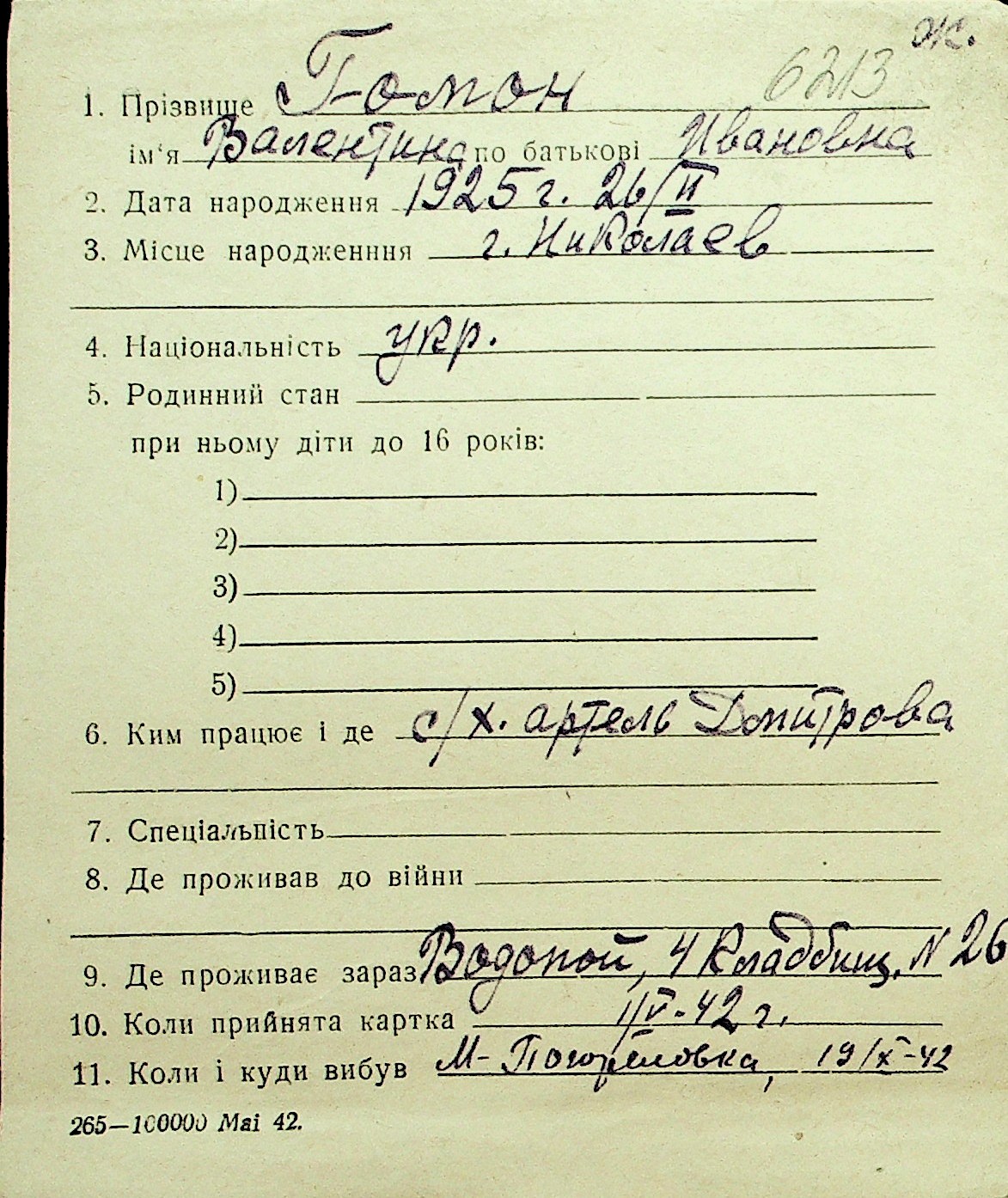 • • Перелік карток до фонду № Н-1016