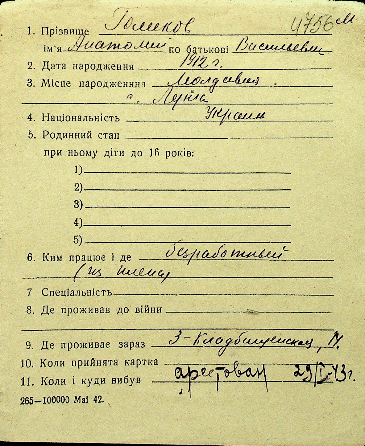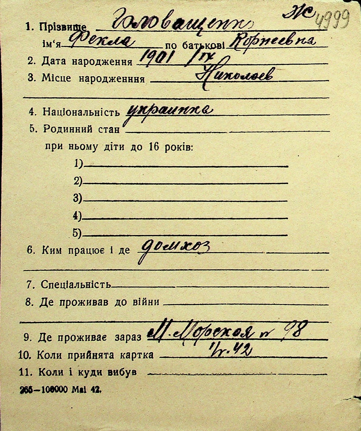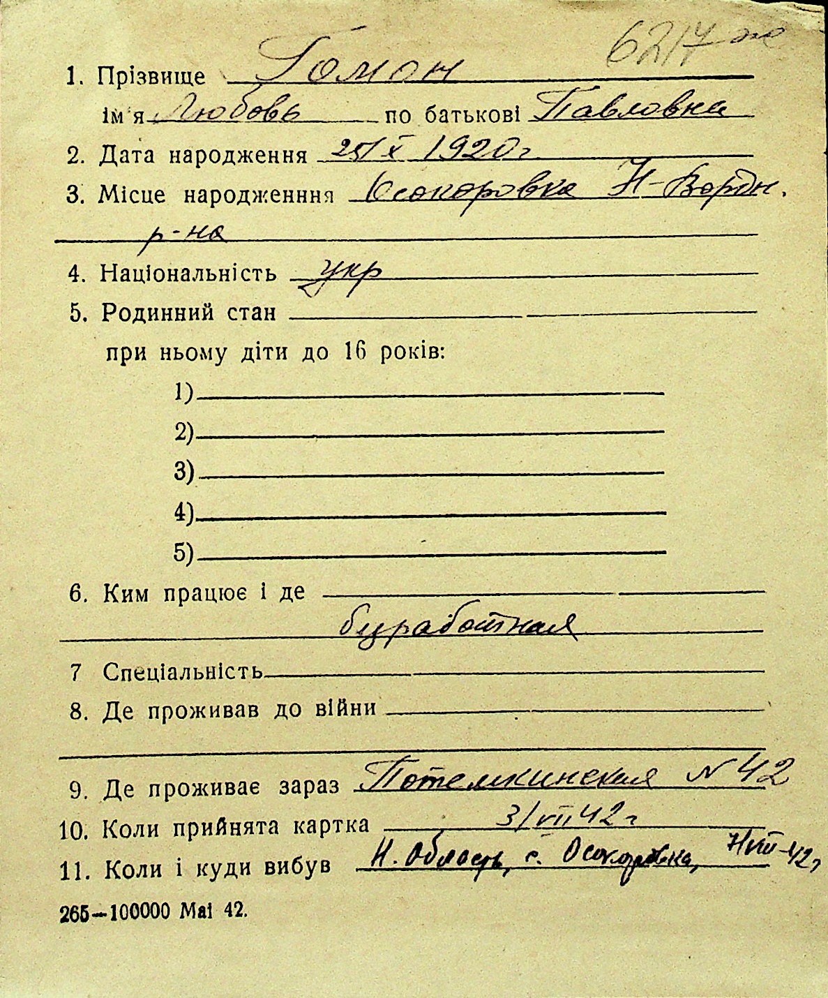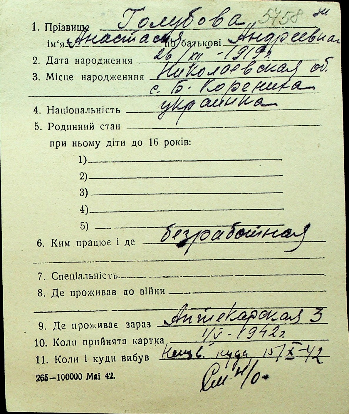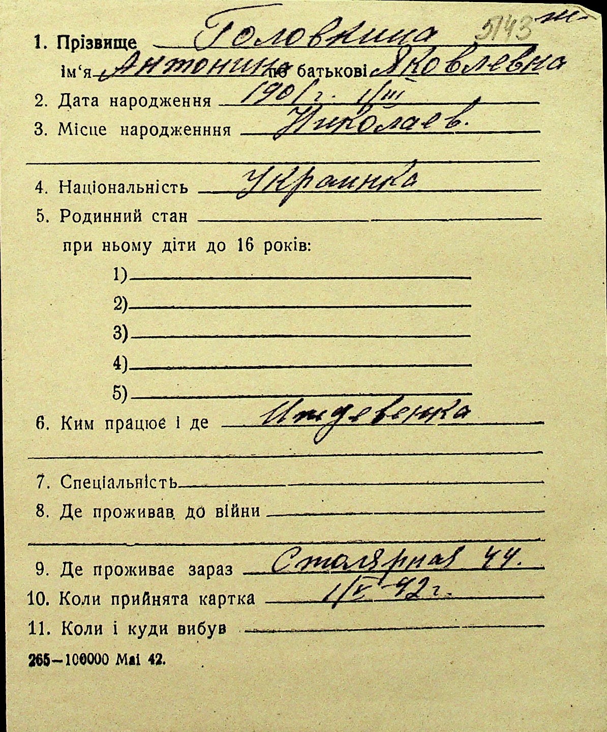 • • Перелік карток до фонду № Н-1016
