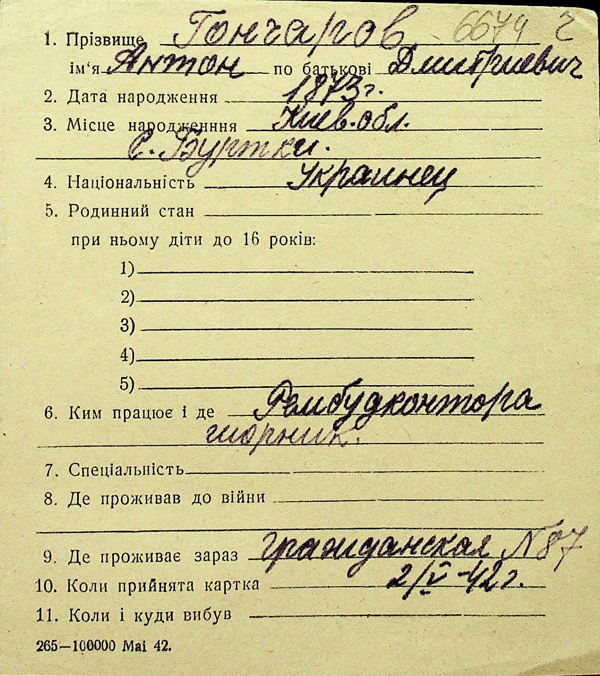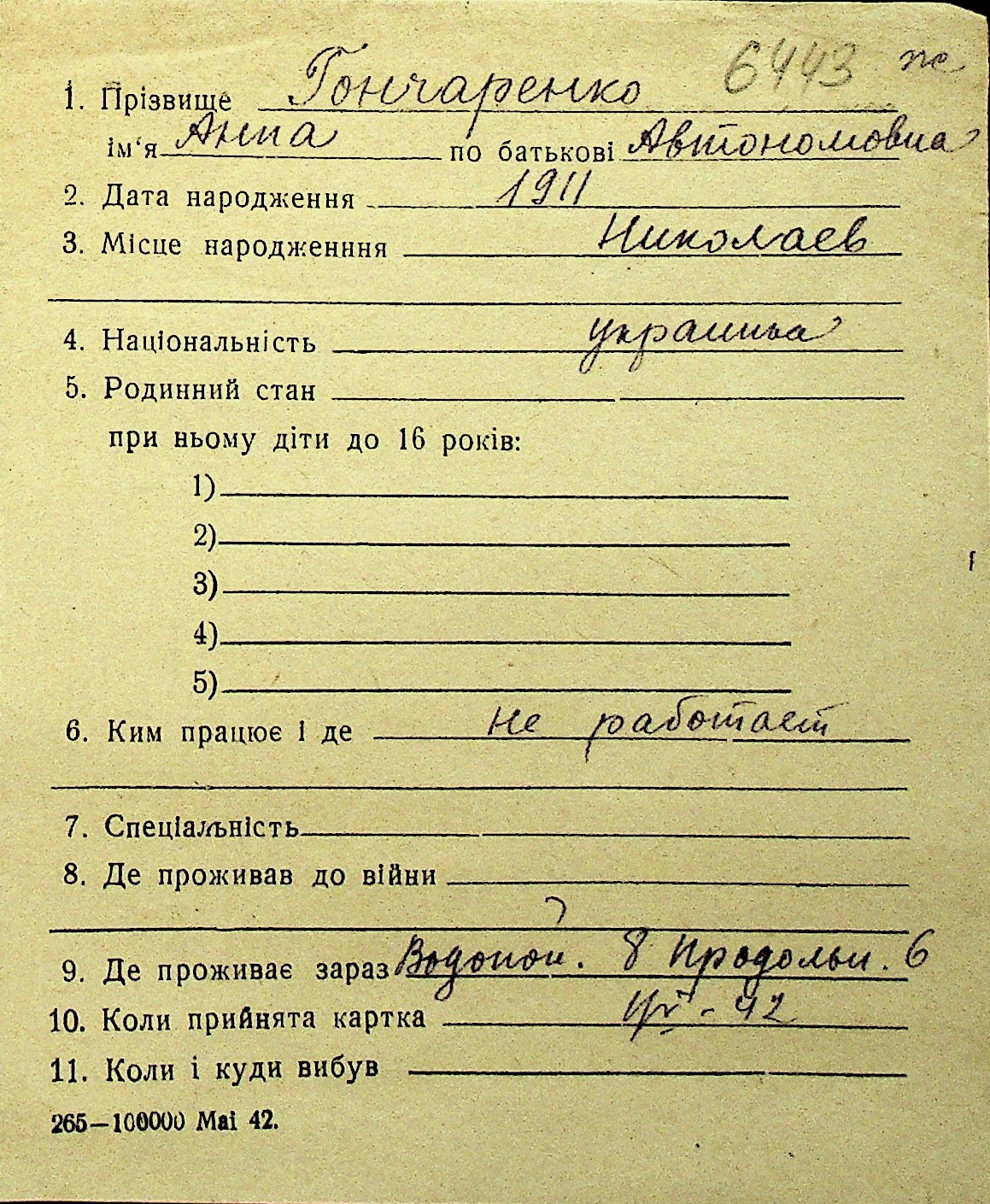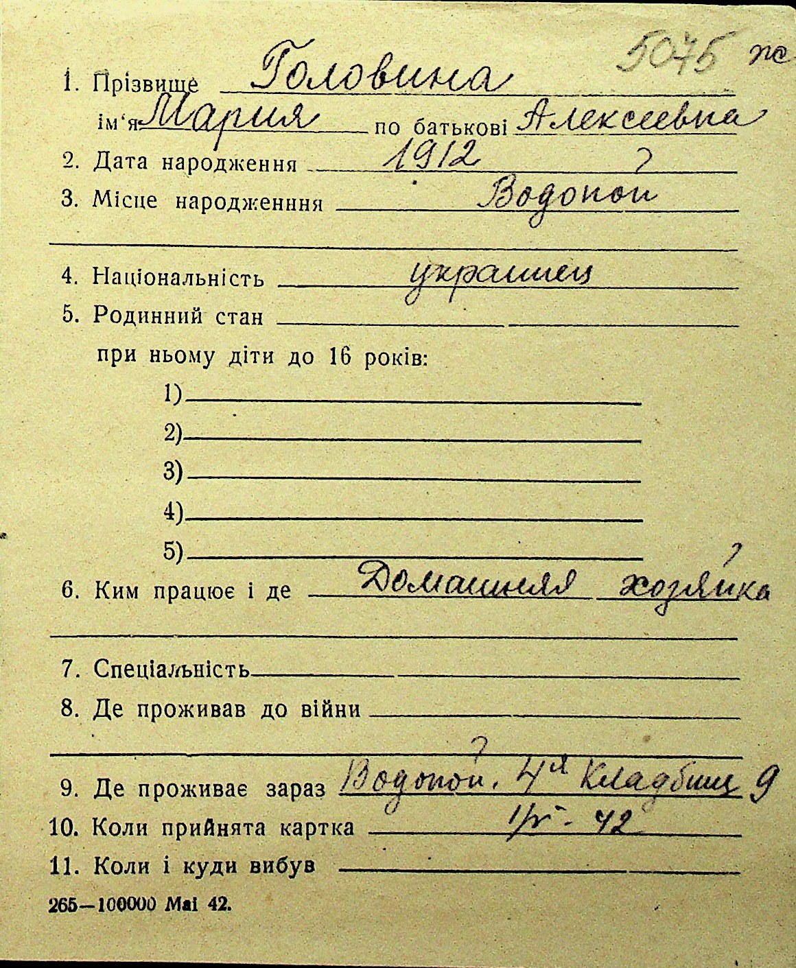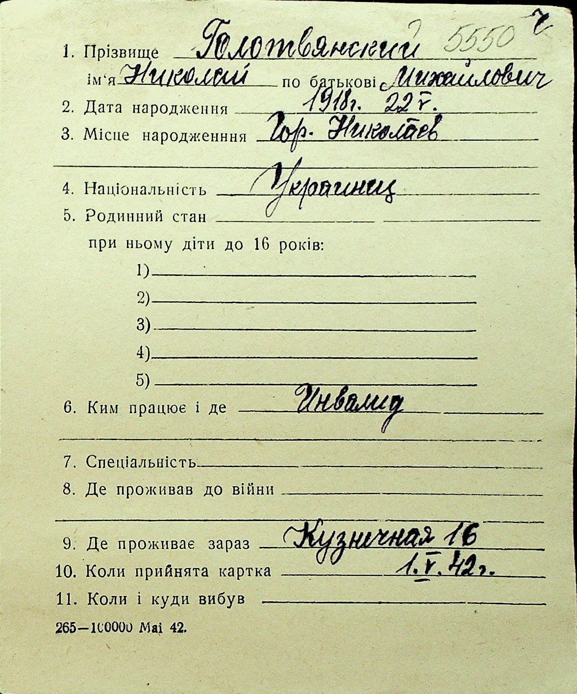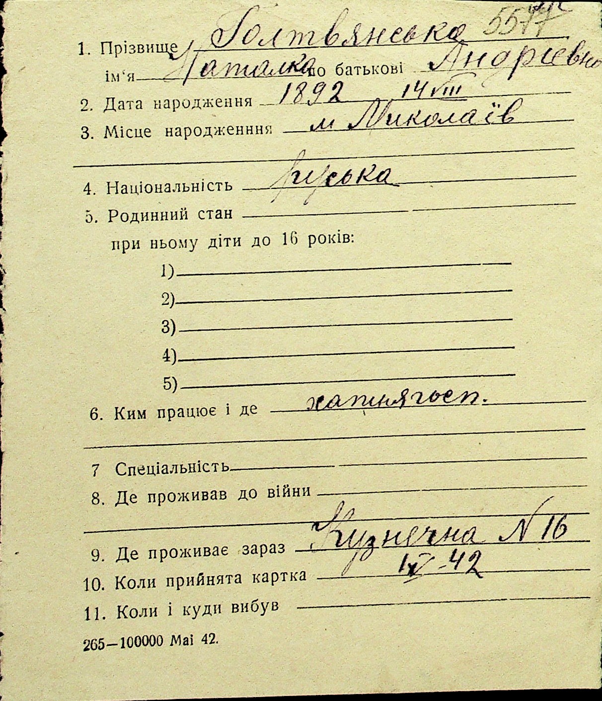 • • Перелік карток до фонду № Н-1016