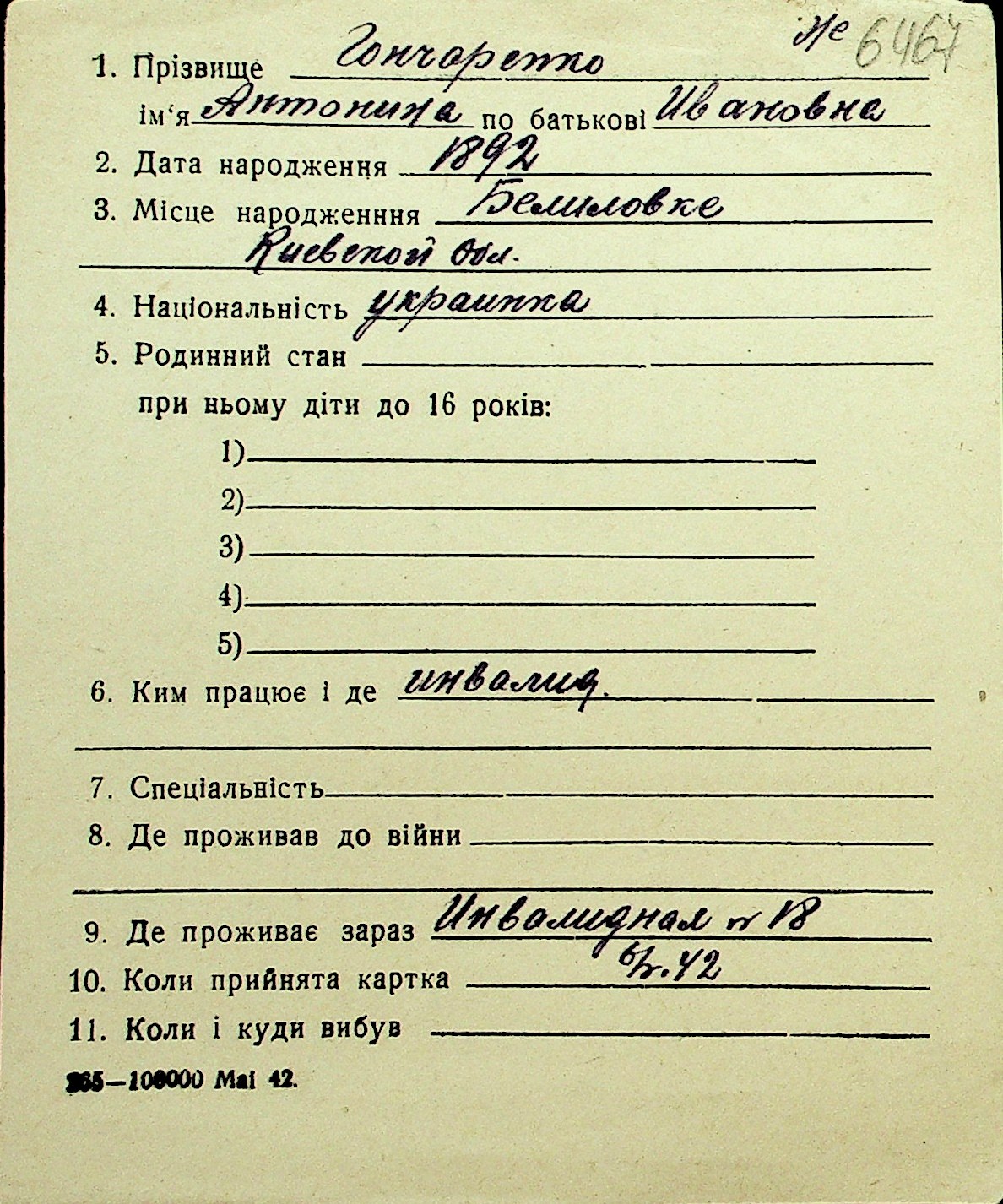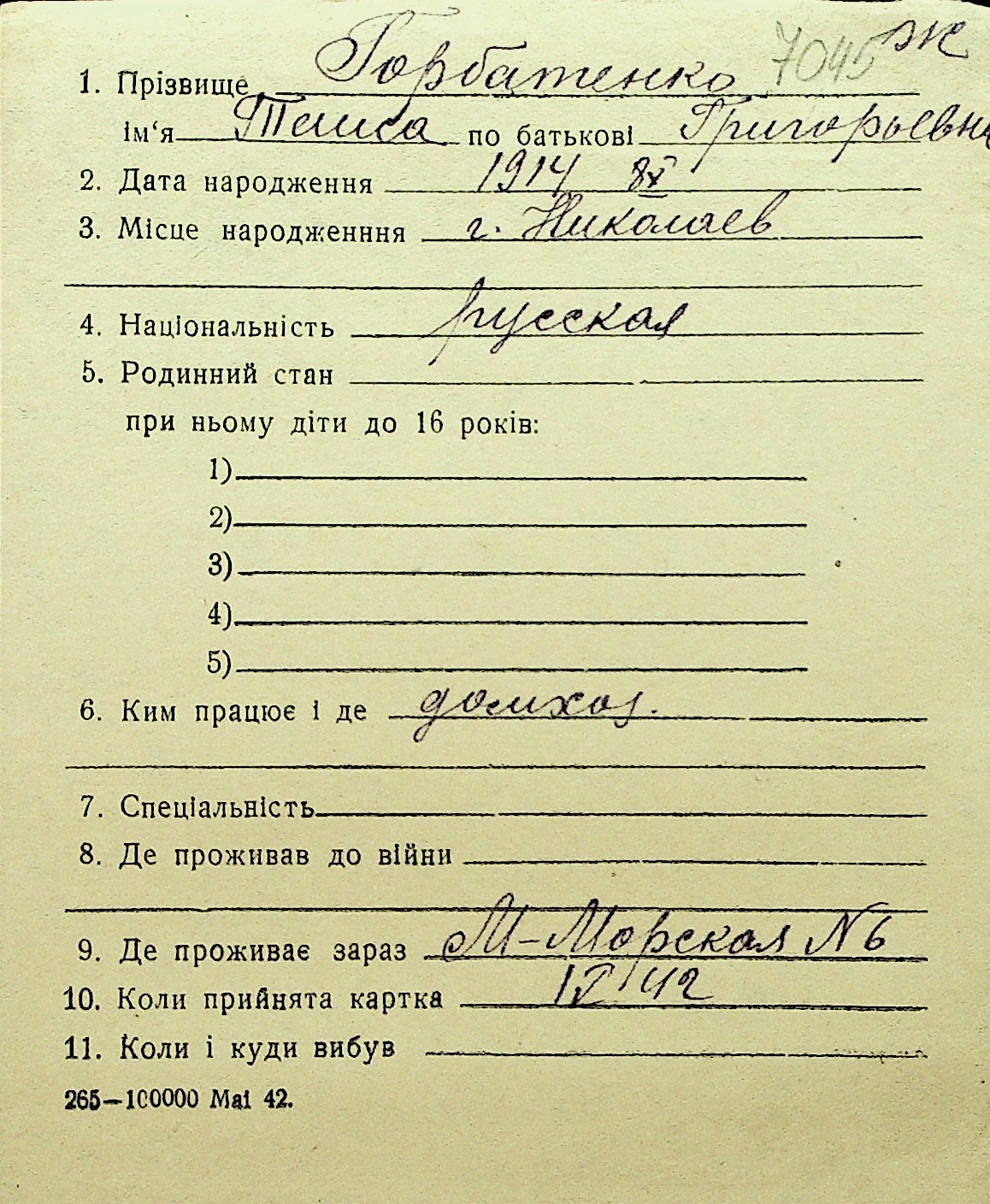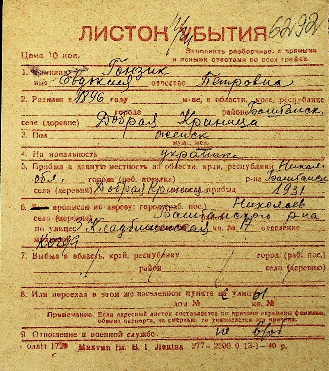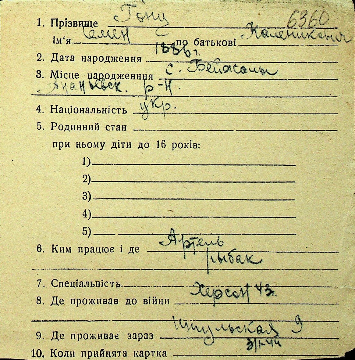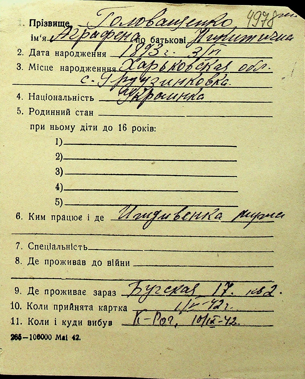 • • Перелік карток до фонду № Н-1016