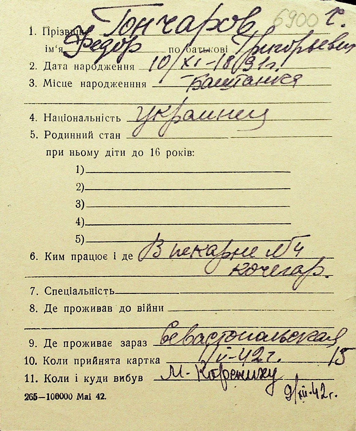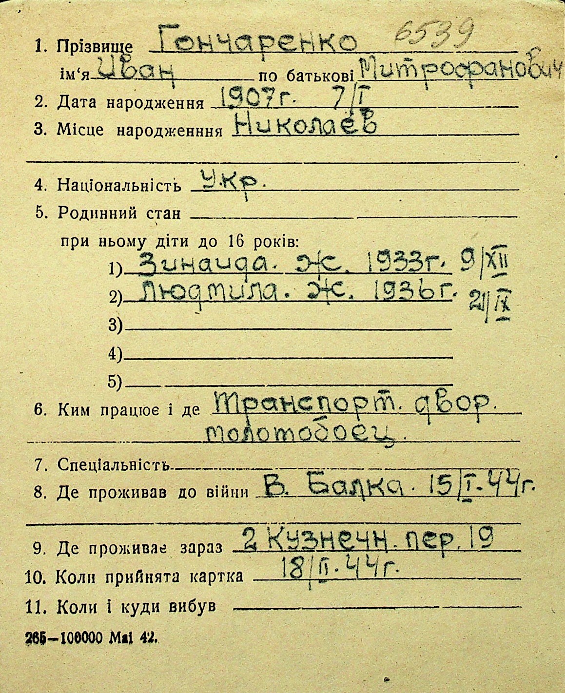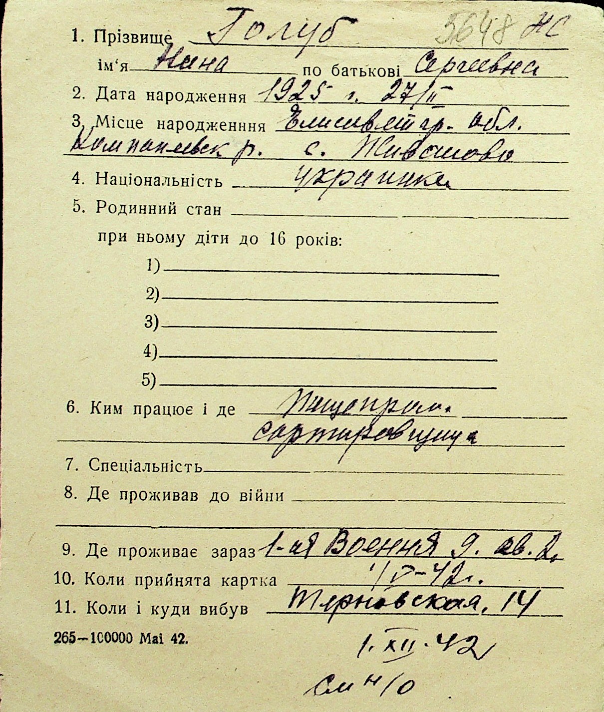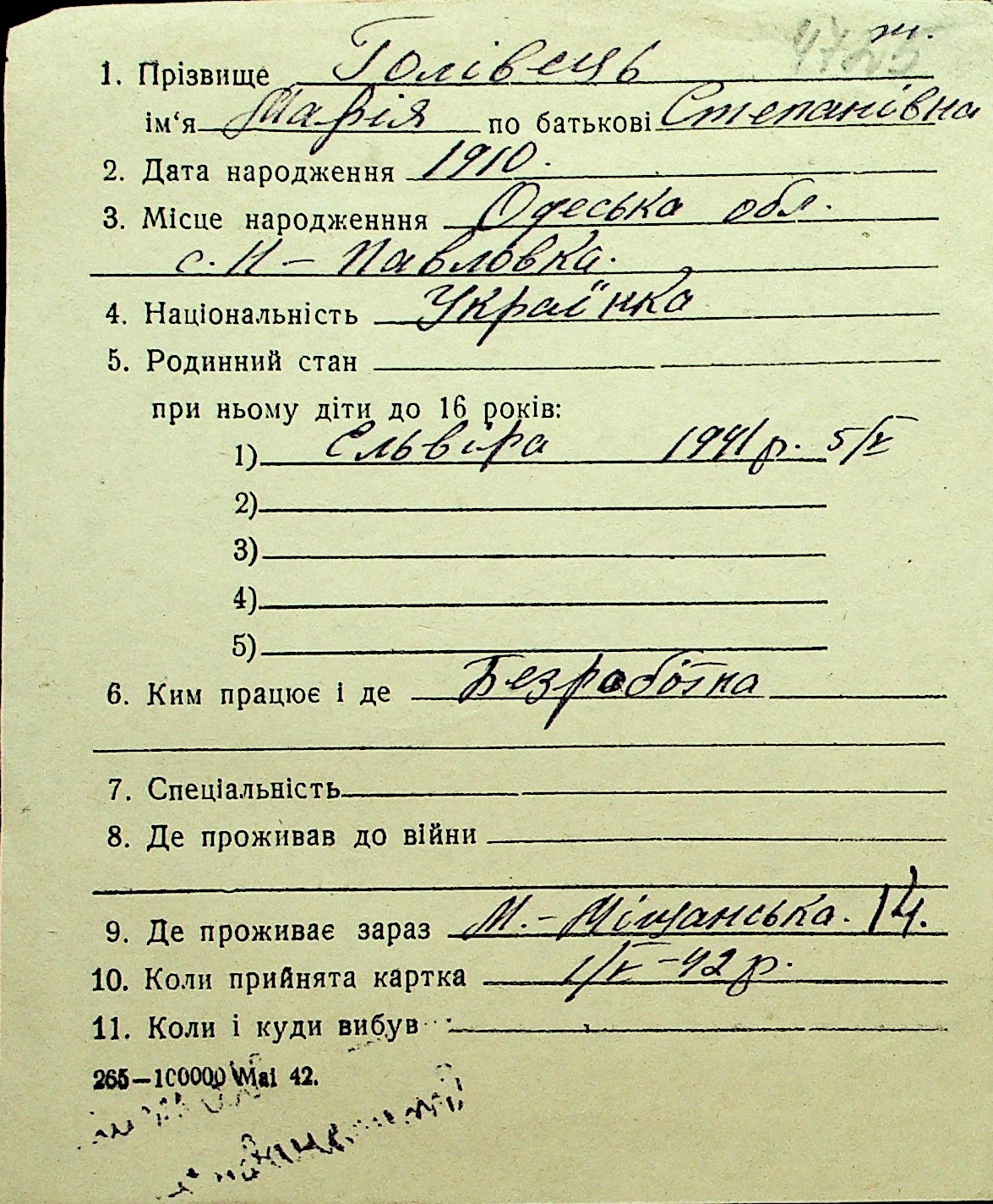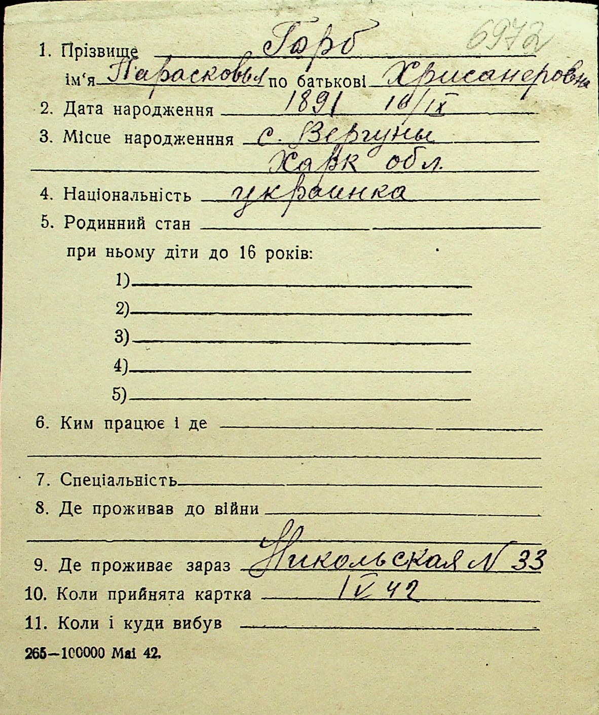 • • Перелік карток до фонду № Н-1016