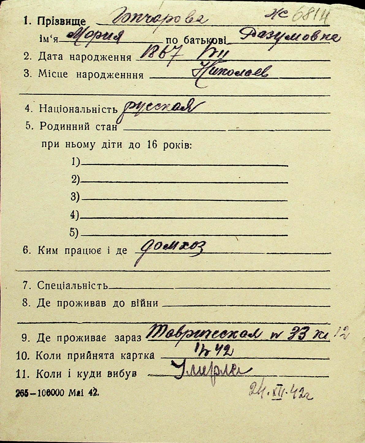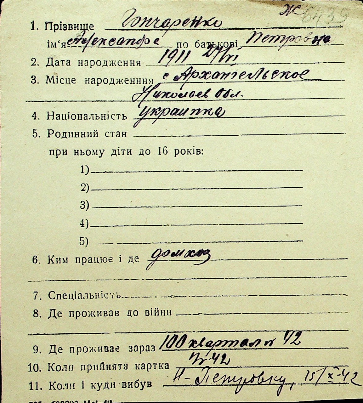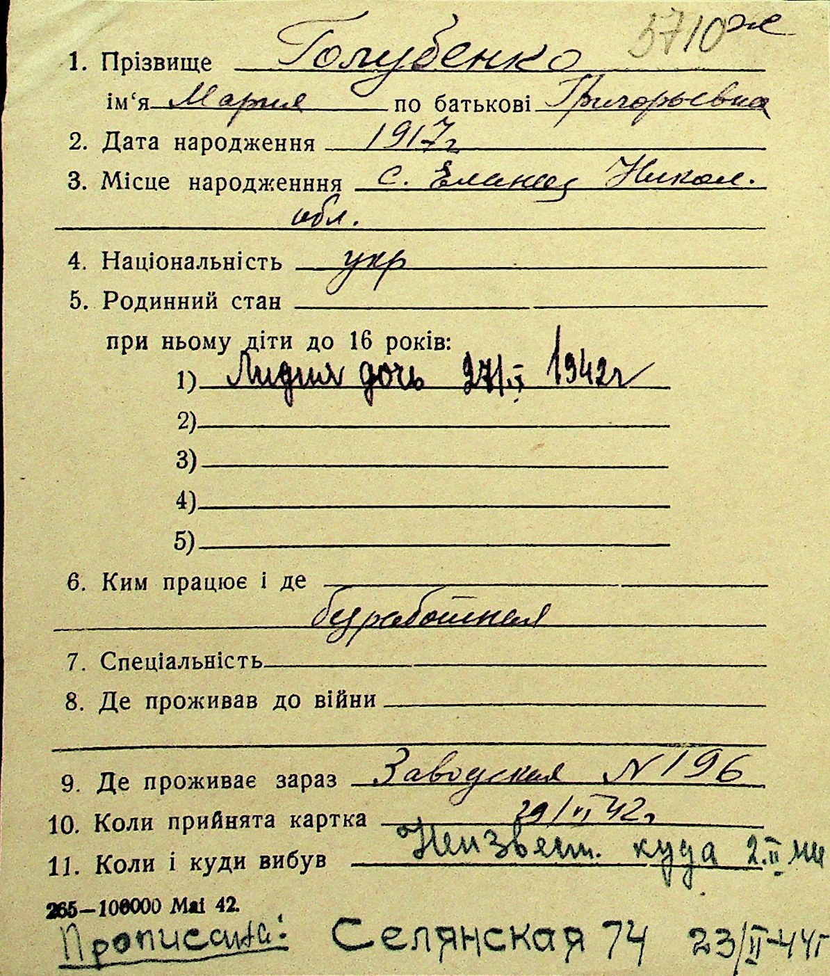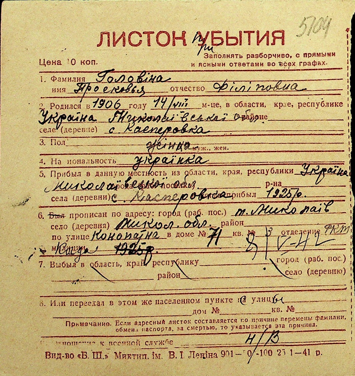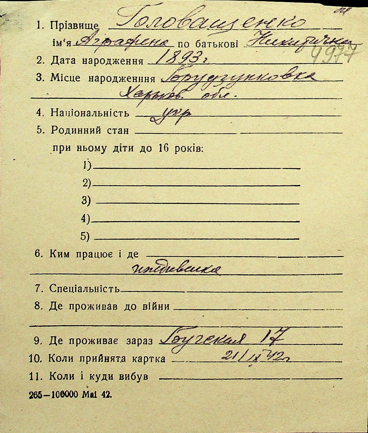 • • Перелік карток до фонду № Н-1016