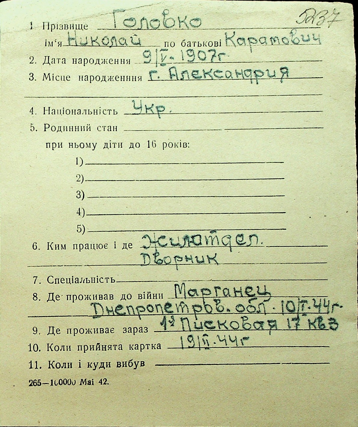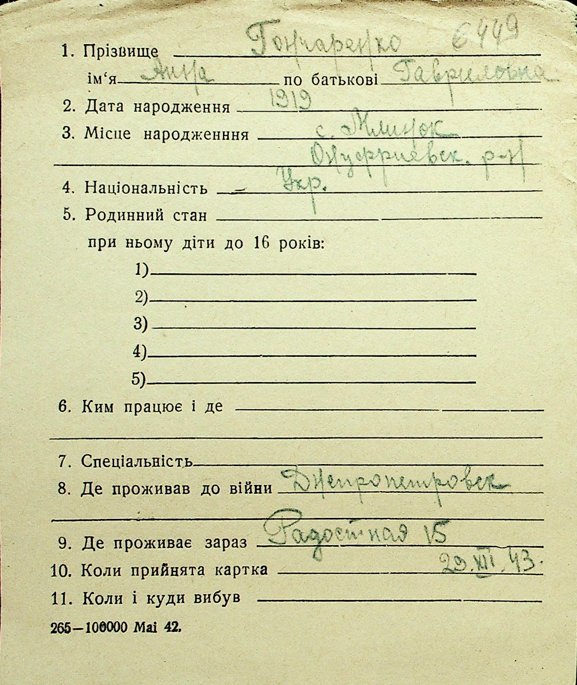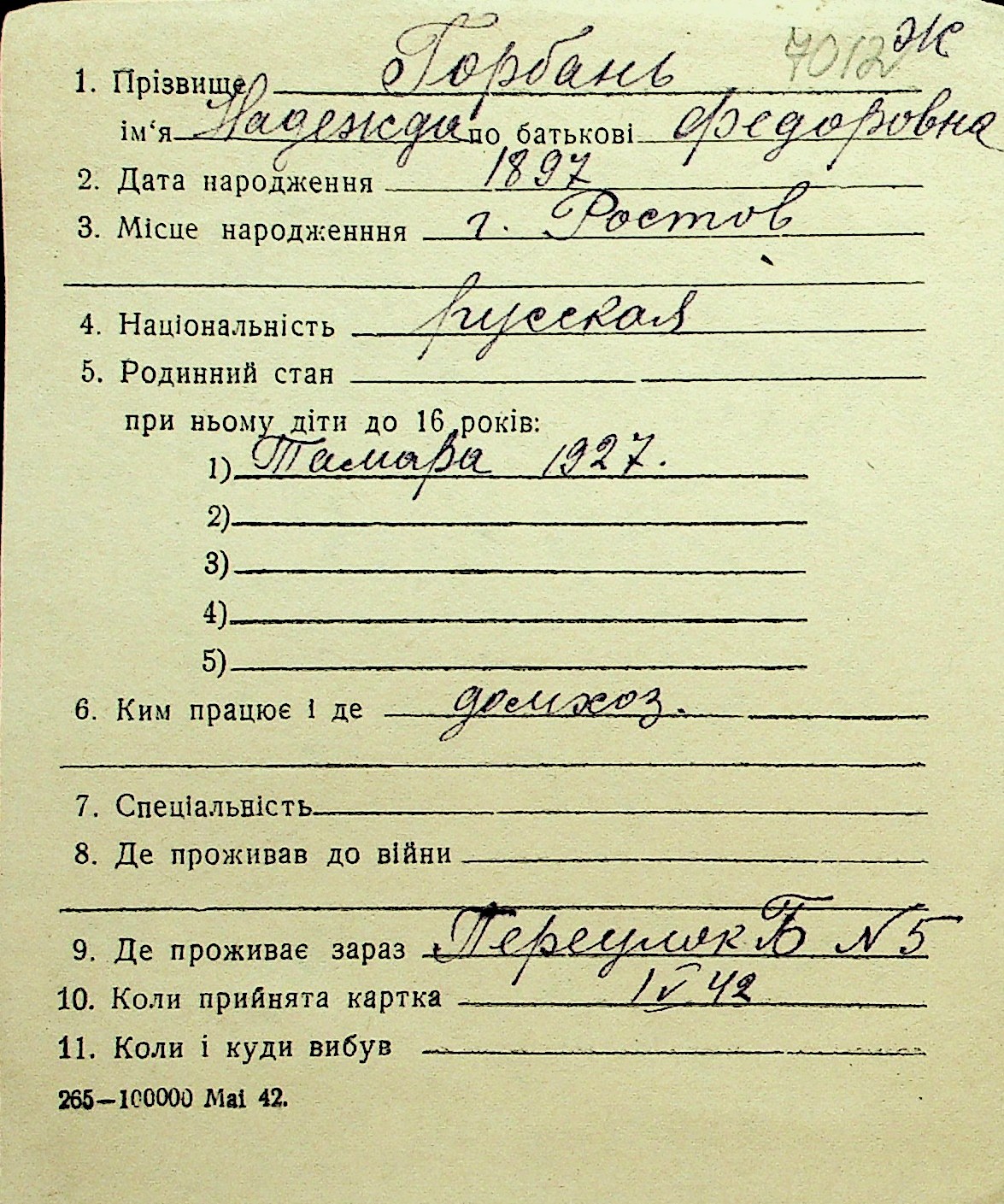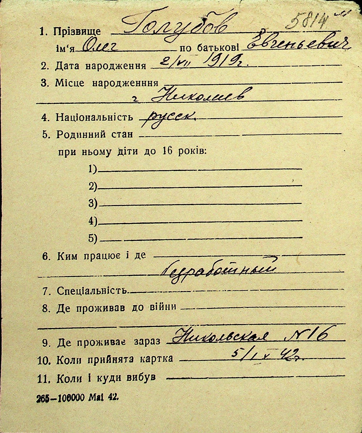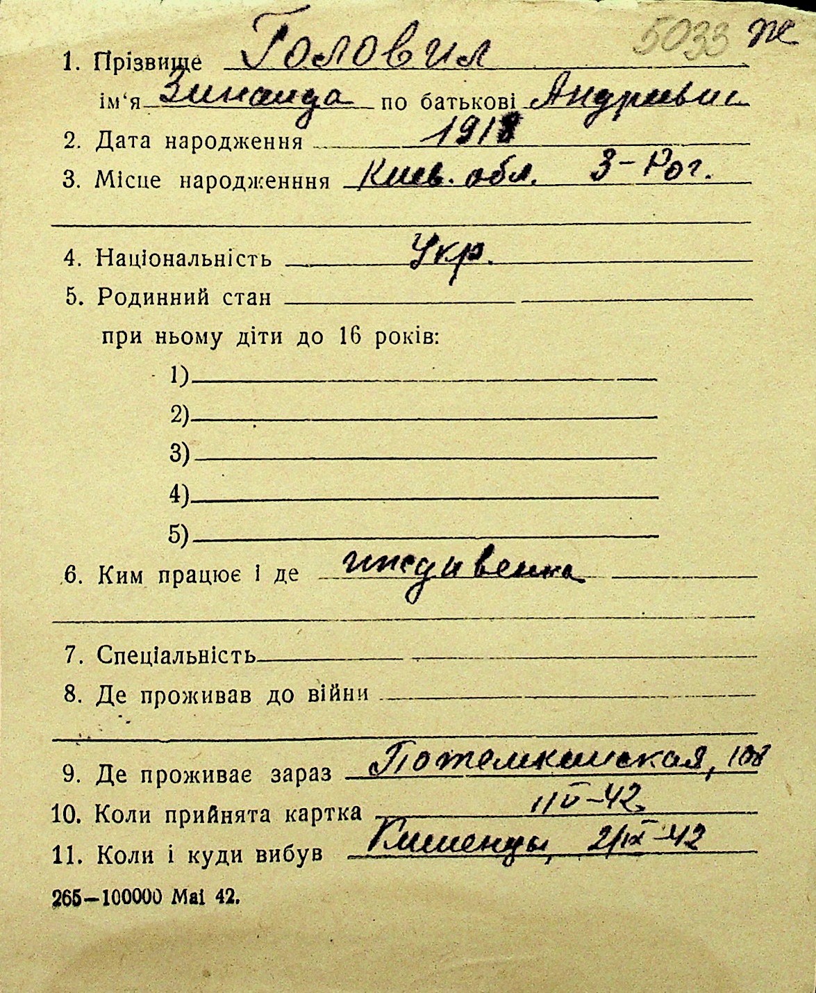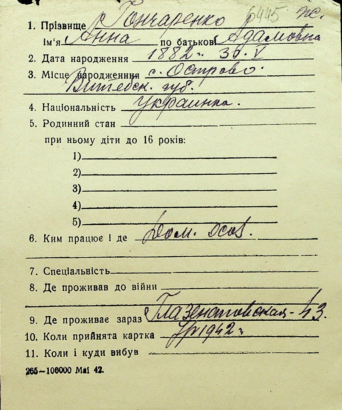 • • Перелік карток до фонду № Н-1016
