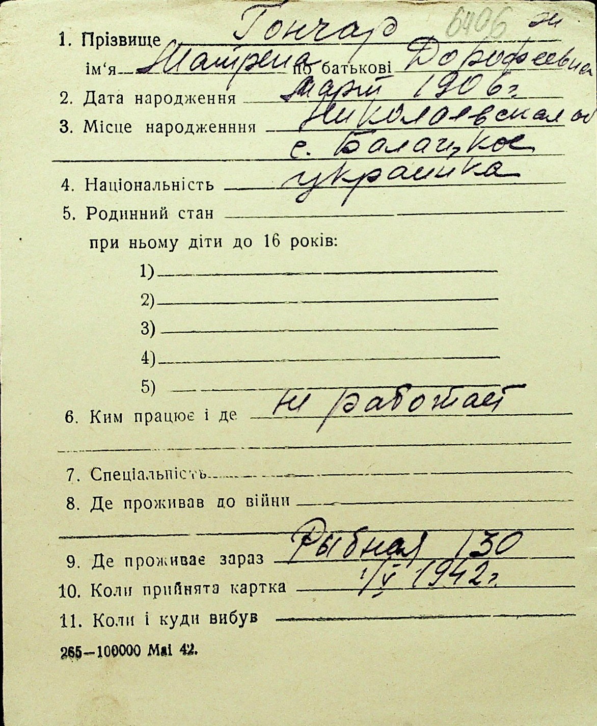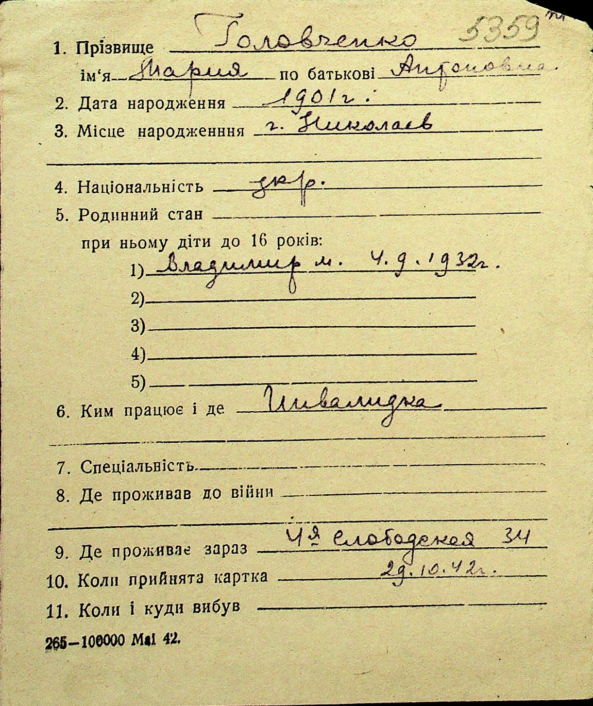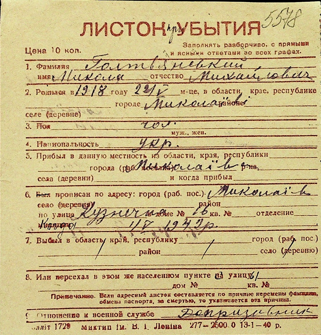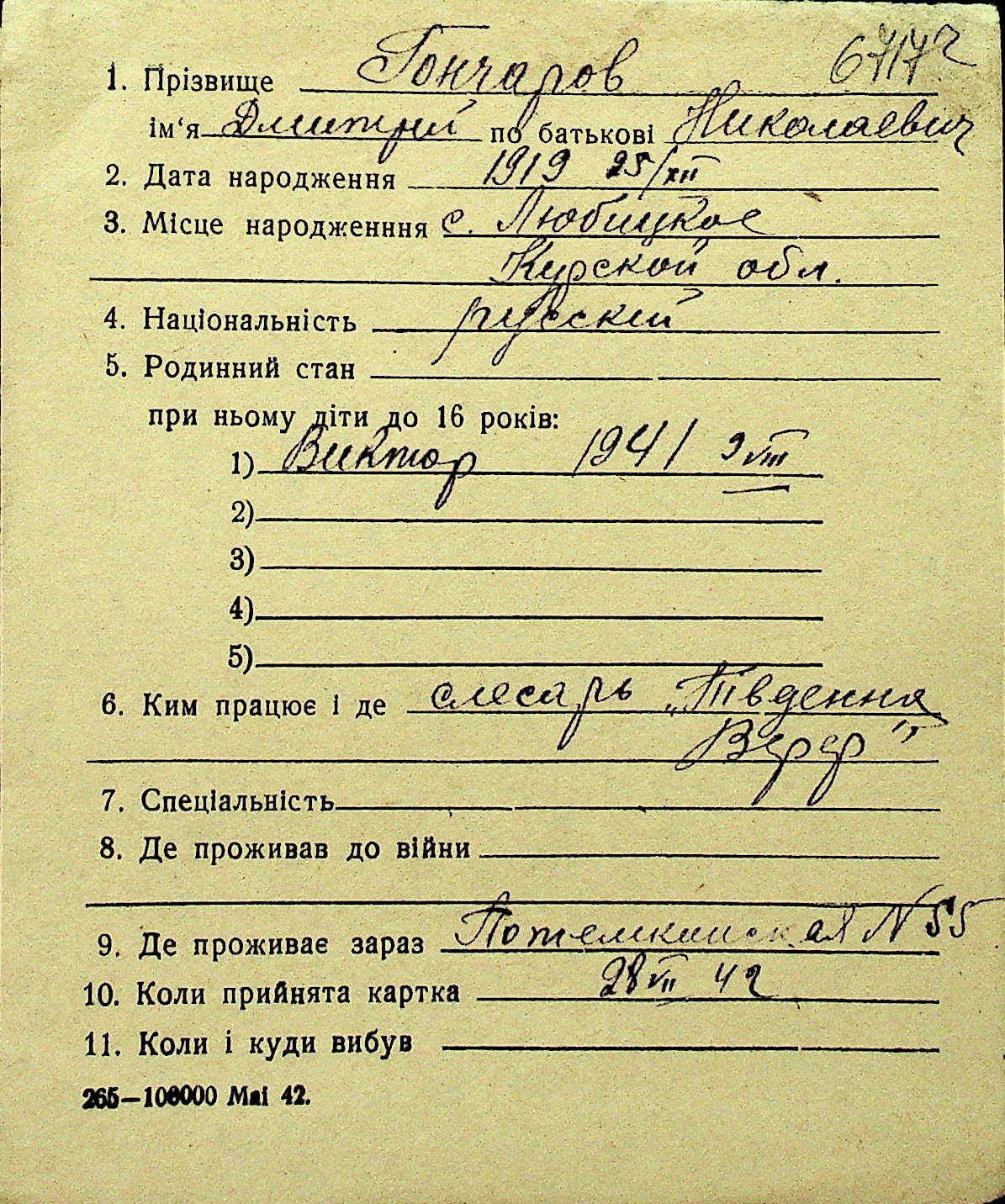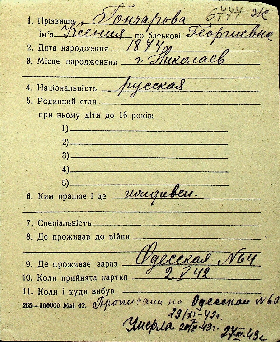 • • Перелік карток до фонду № Н-1016