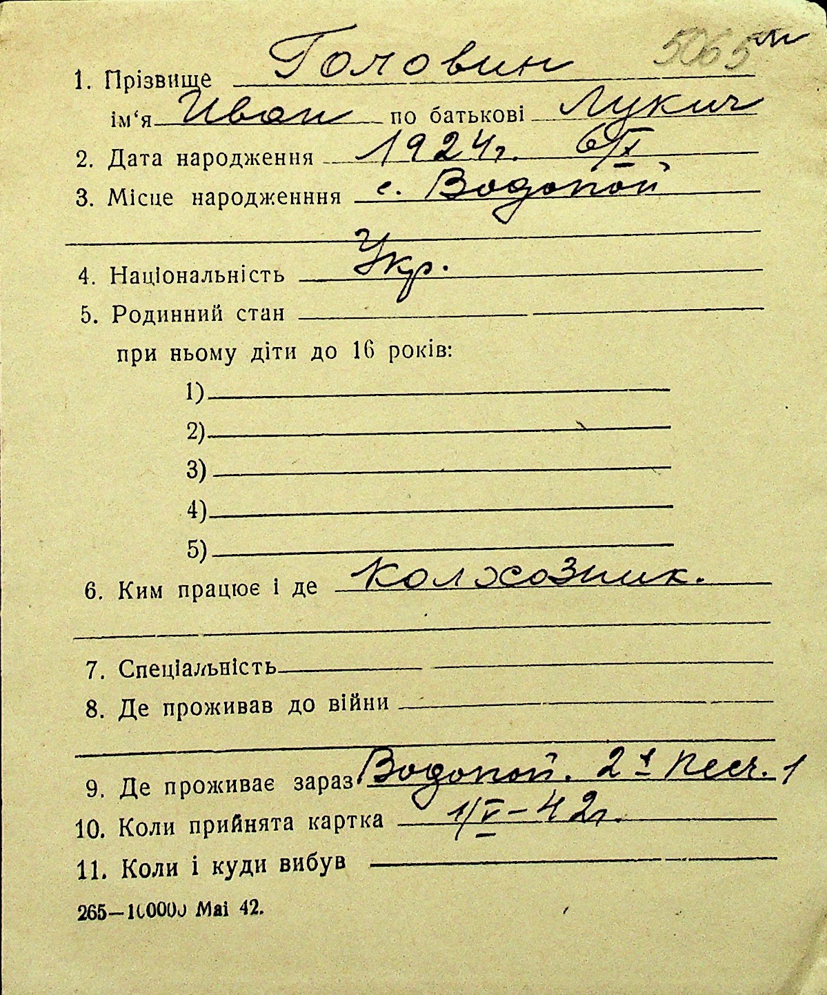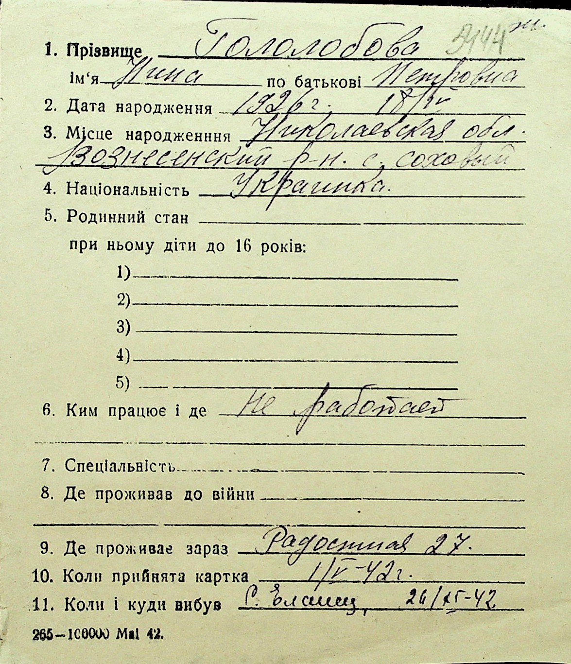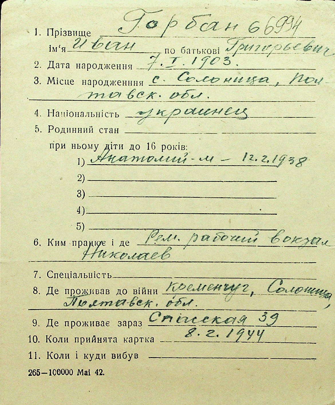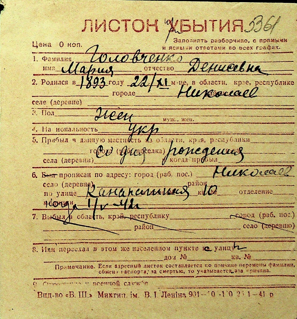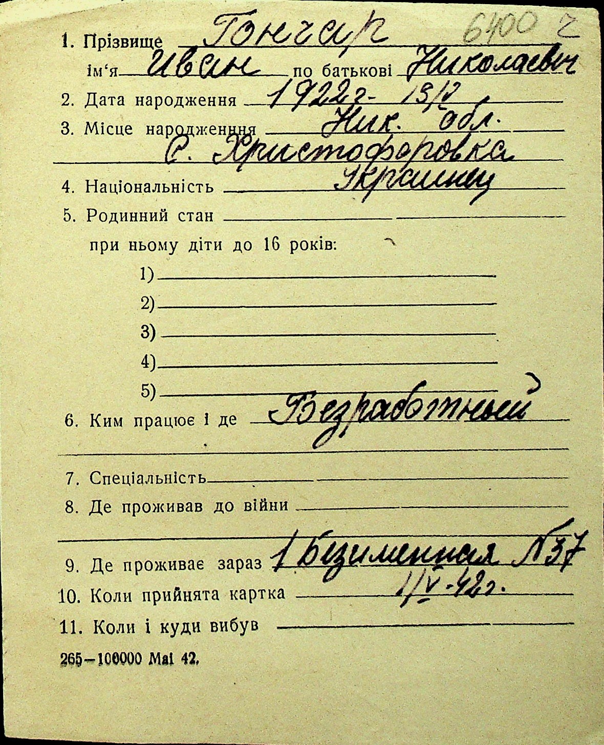 • • Перелік карток до фонду № Н-1016