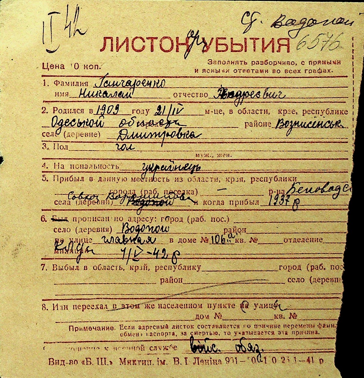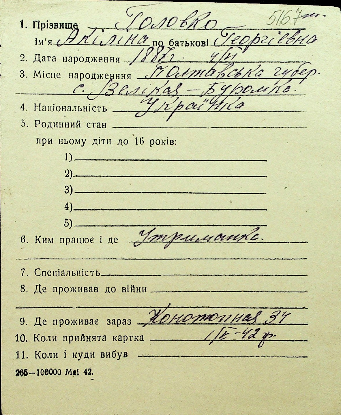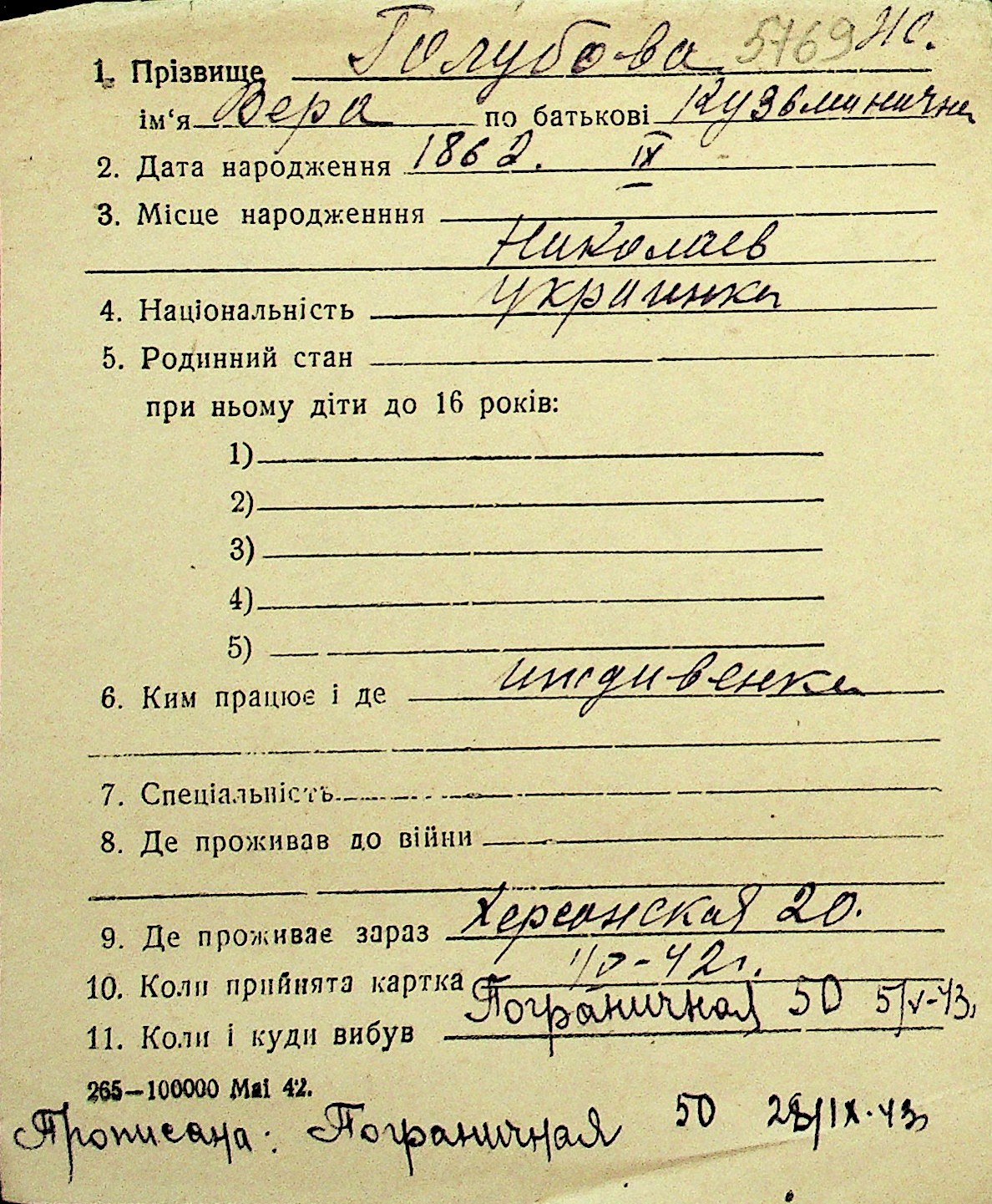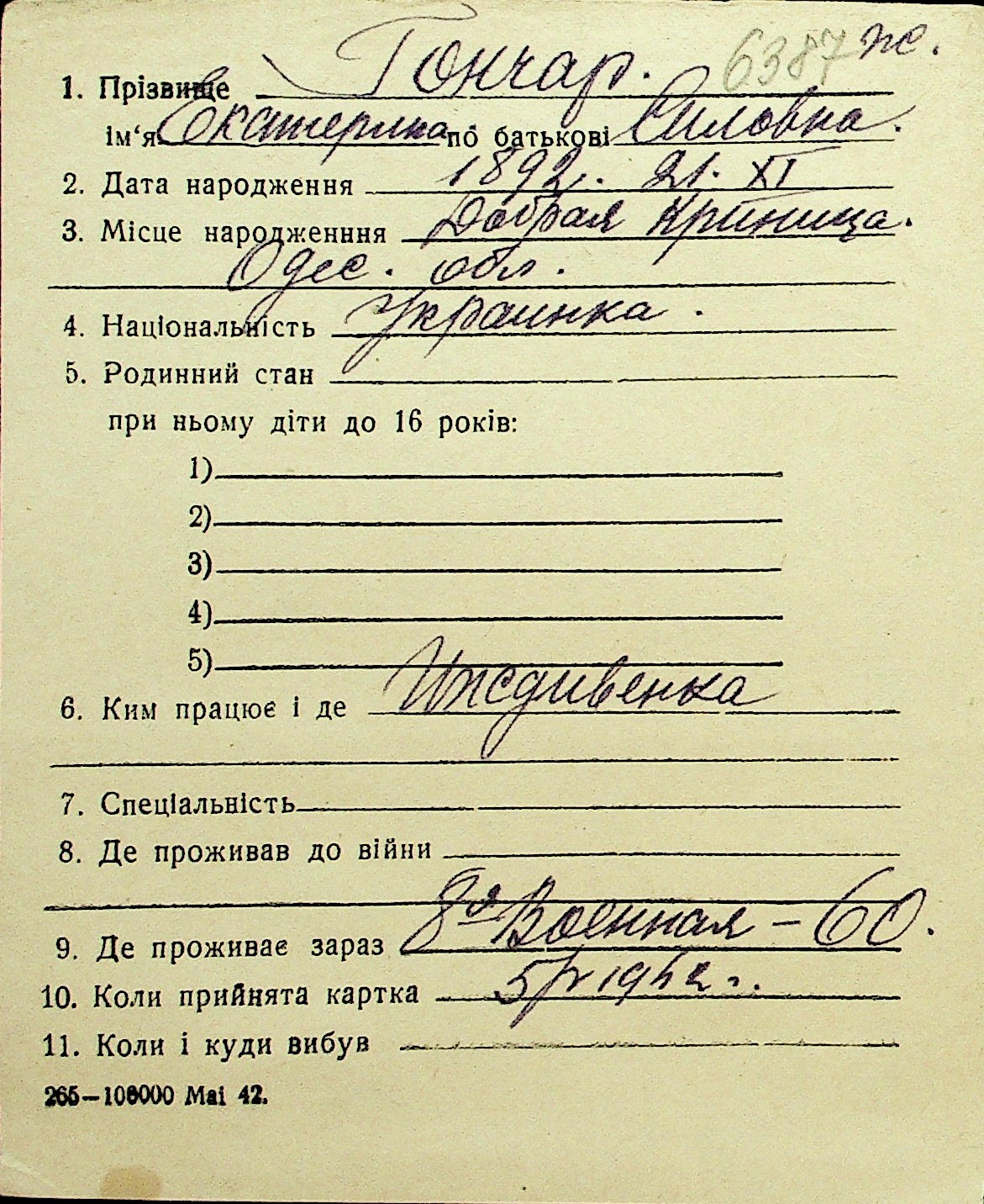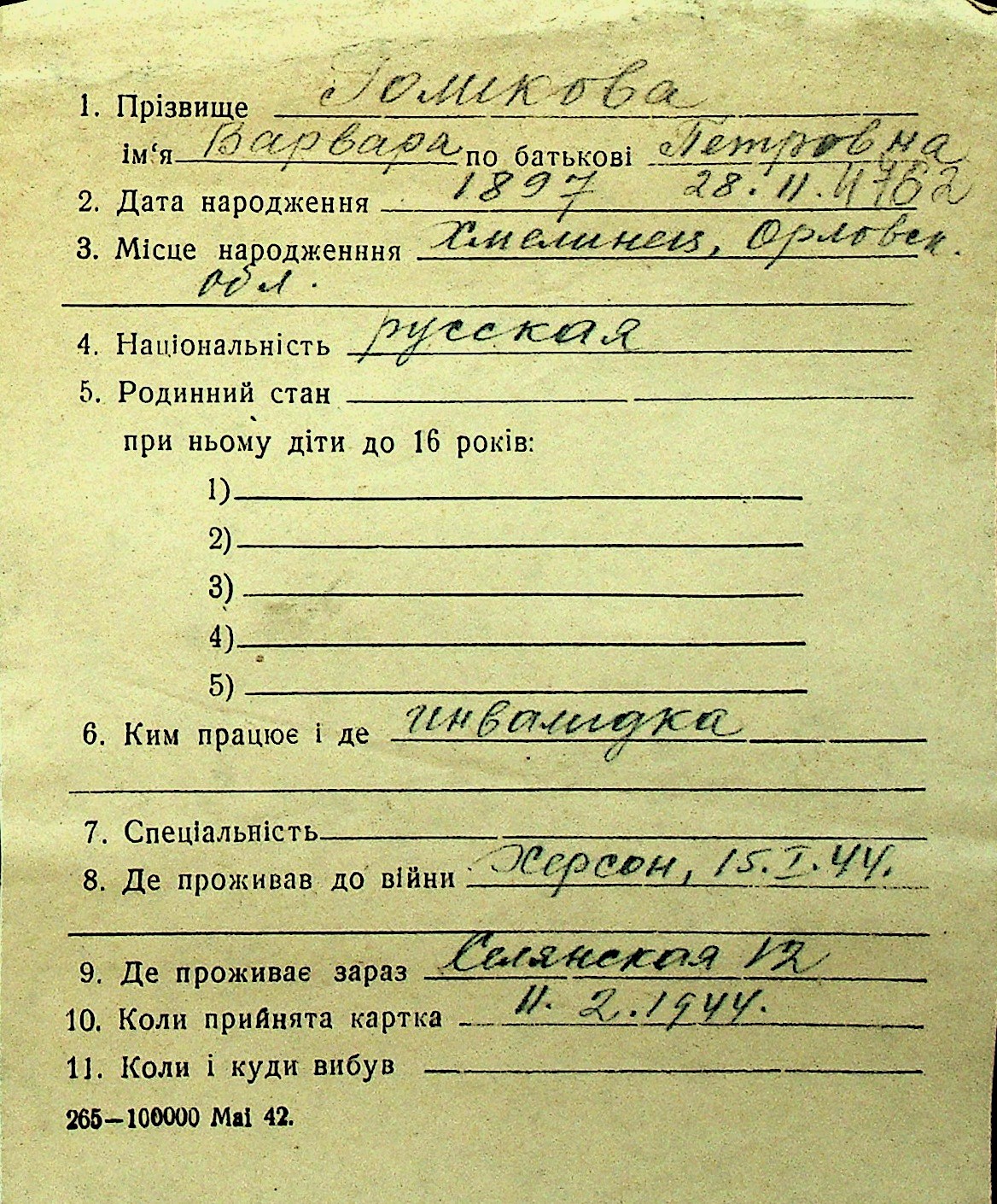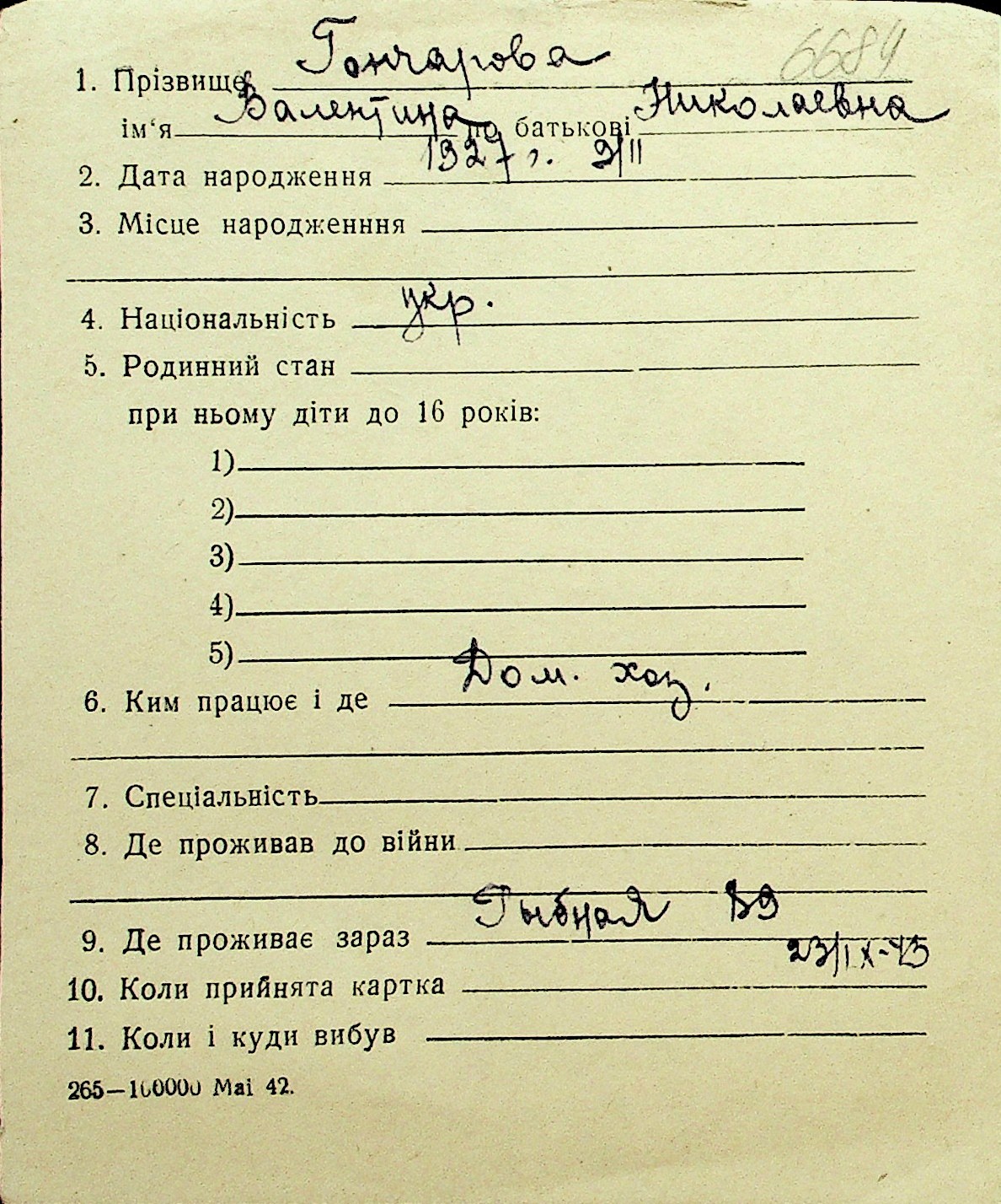 • • Перелік карток до фонду № Н-1016