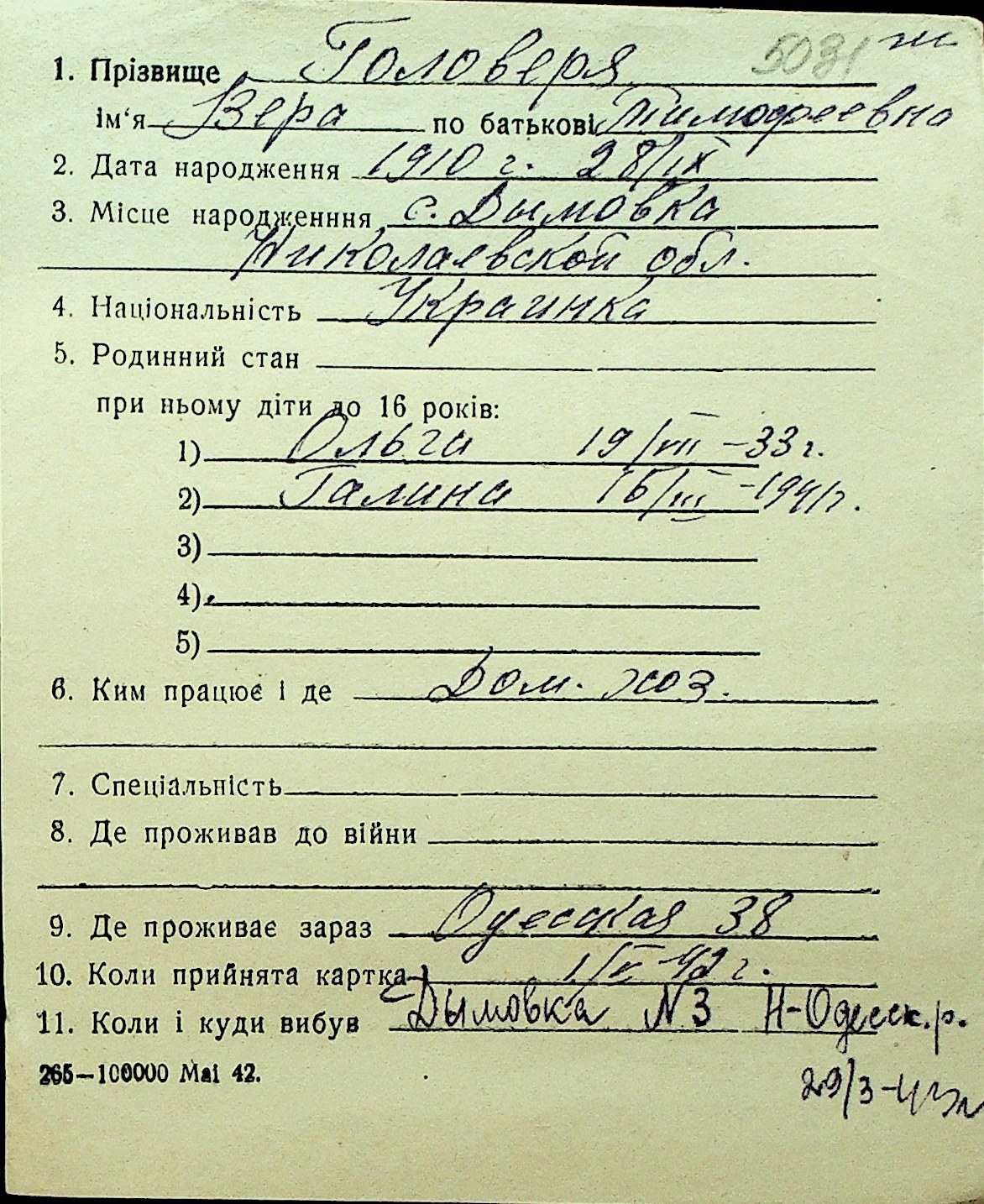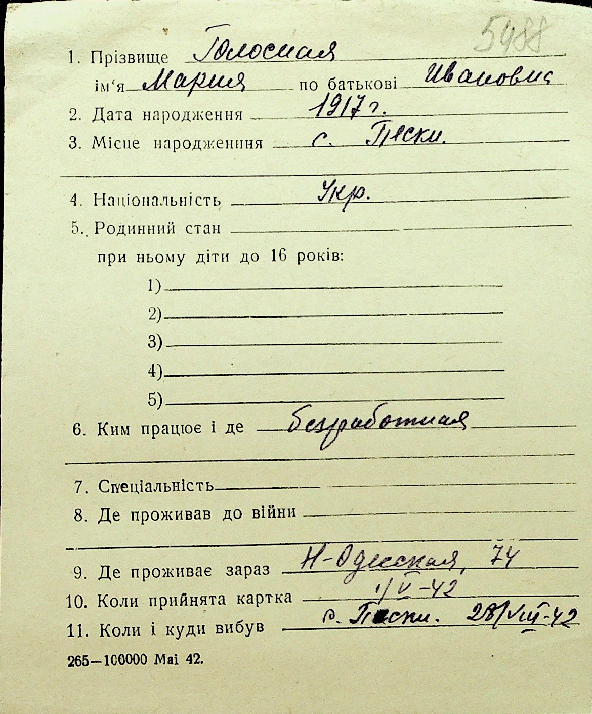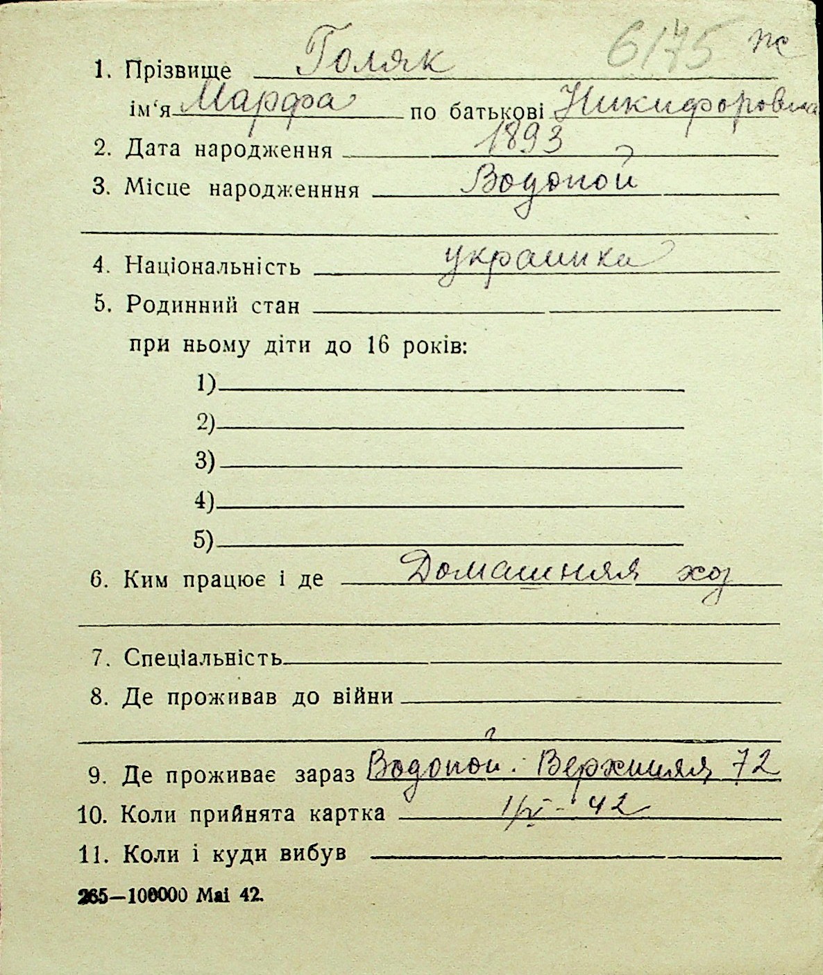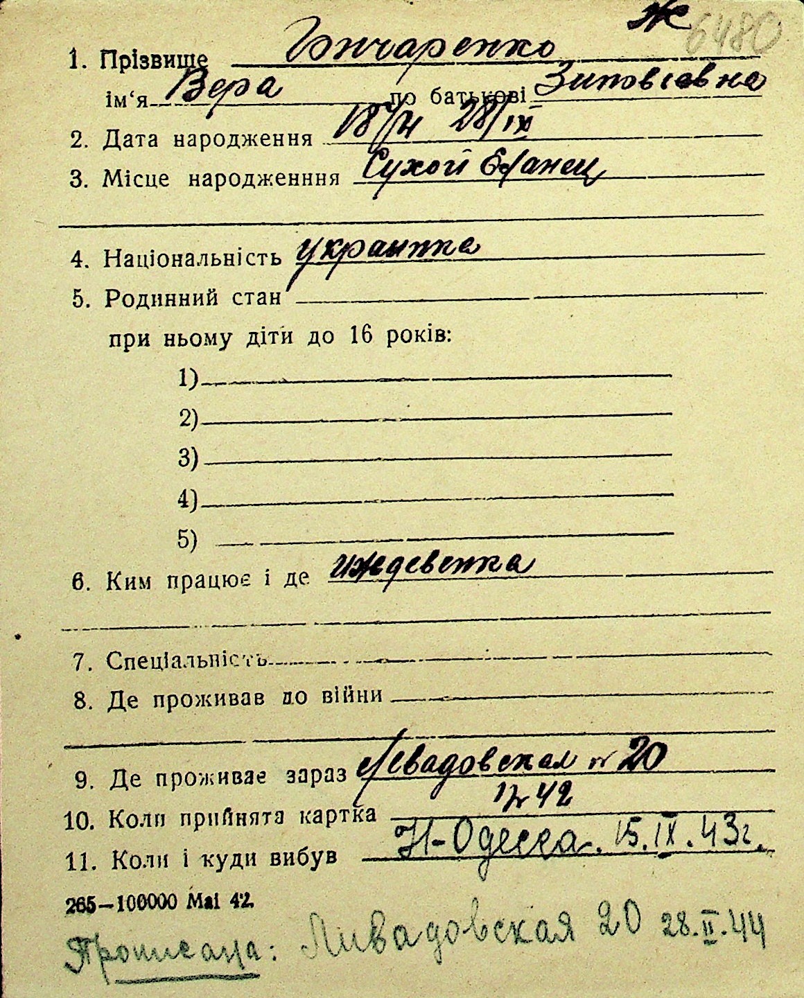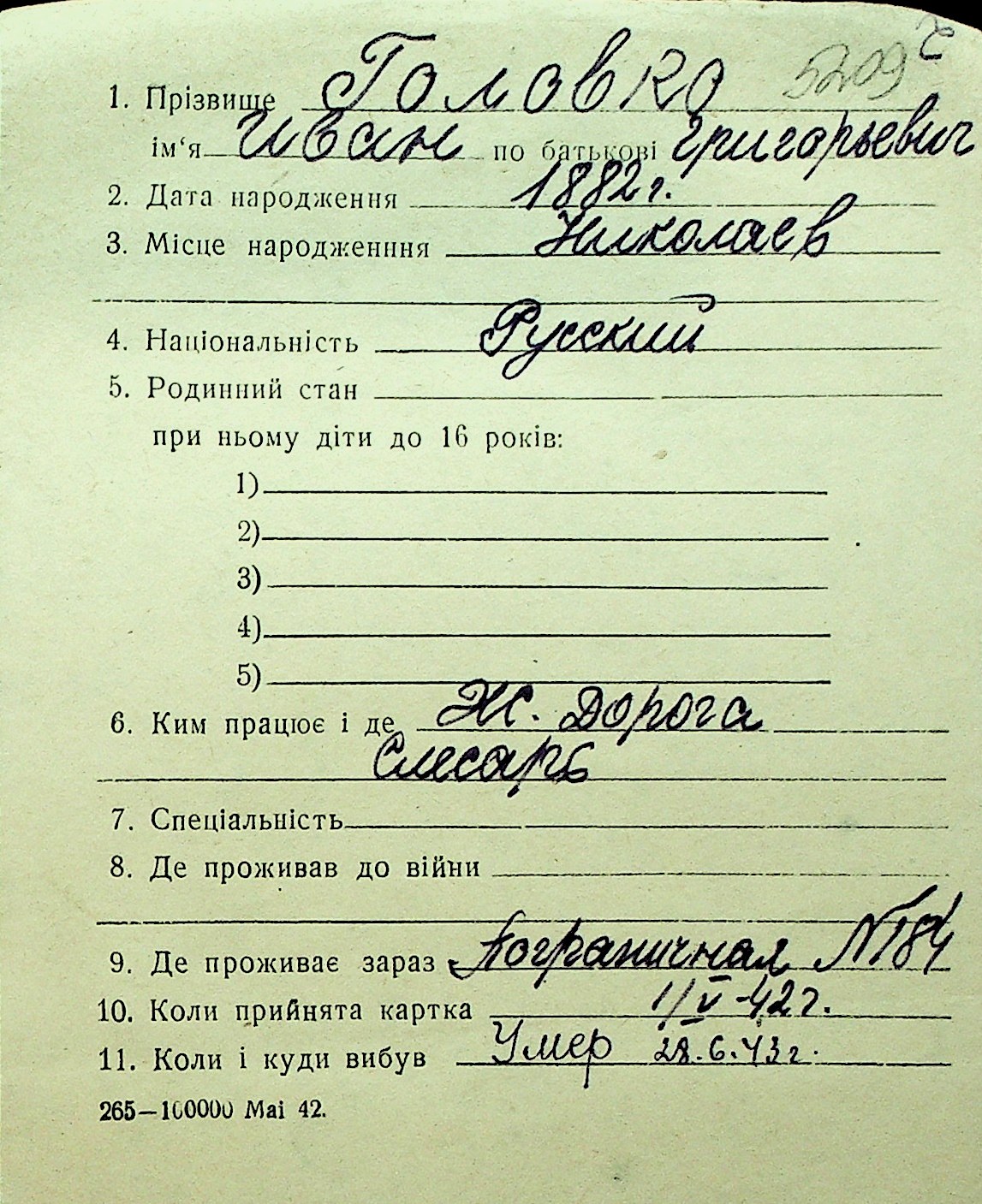 • • Перелік карток до фонду № Н-1016