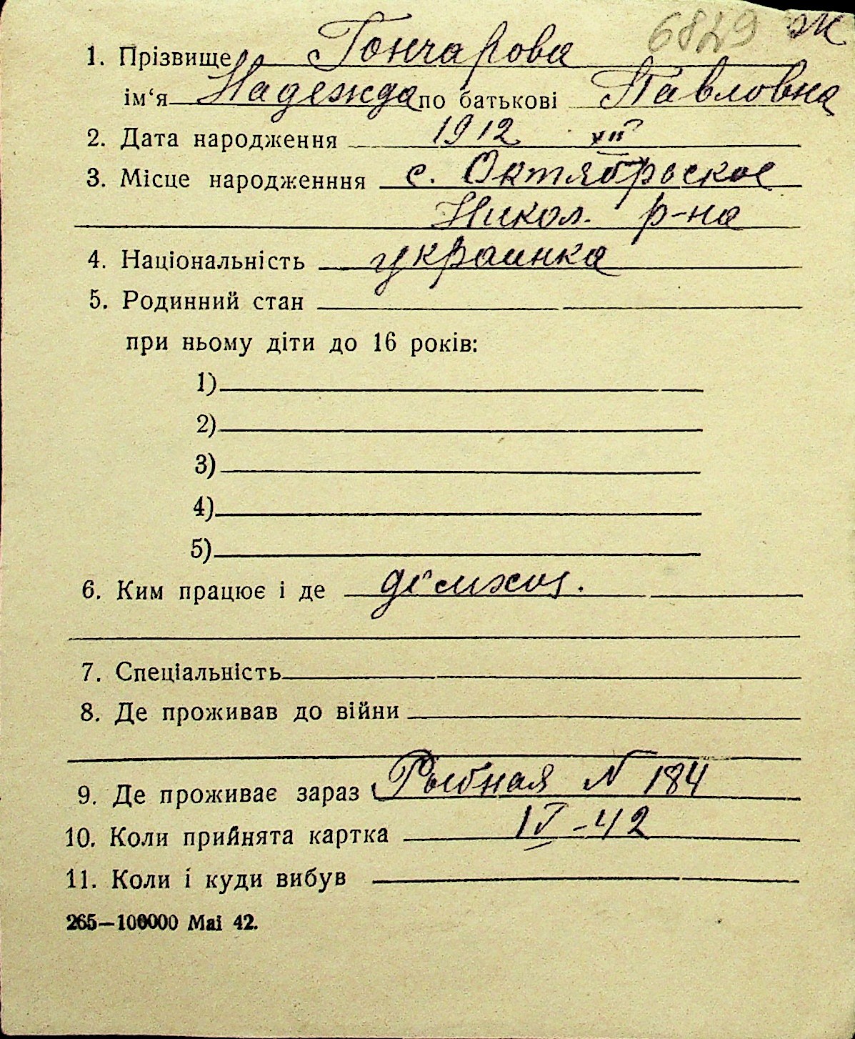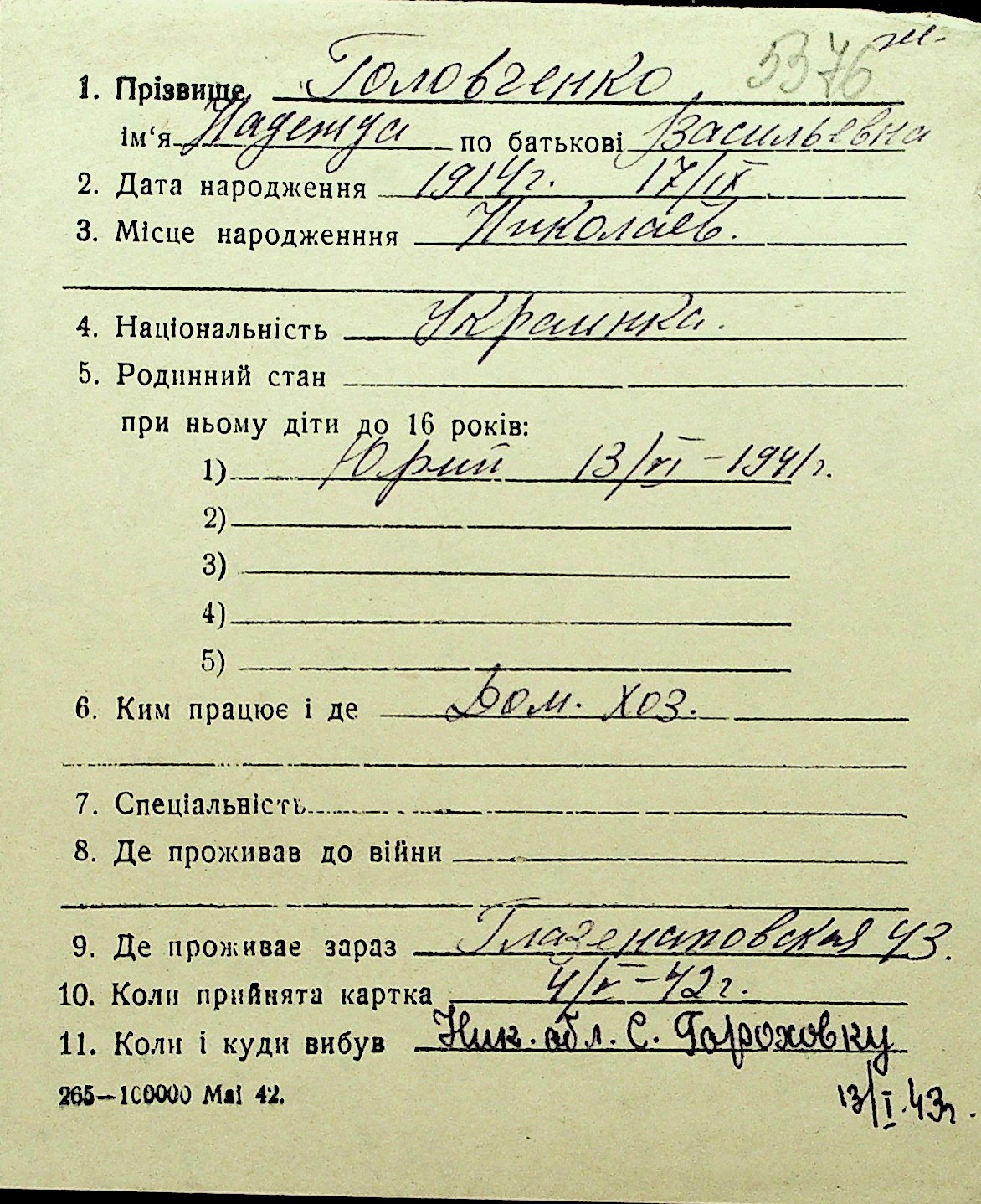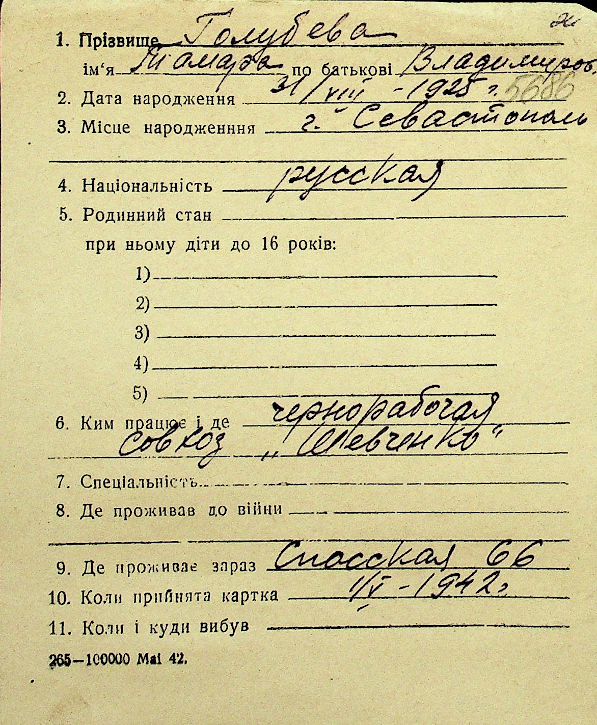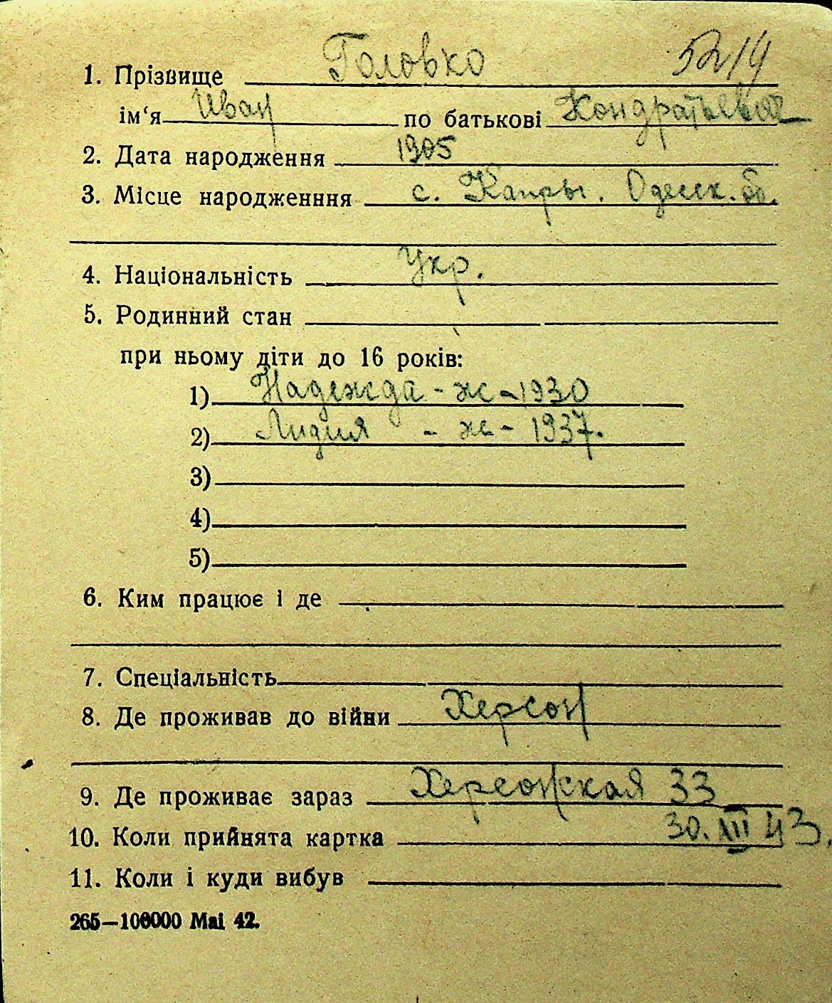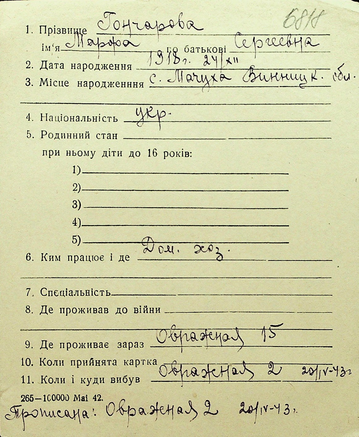• • Перелік карток до фонду № Н-1016