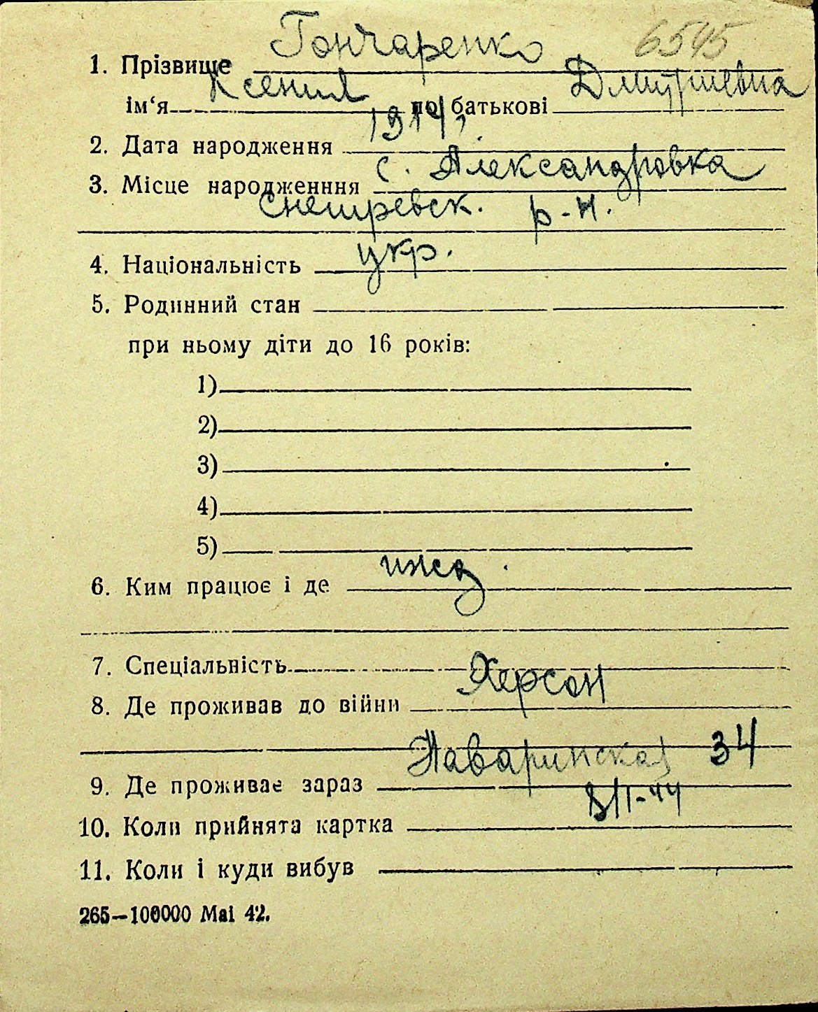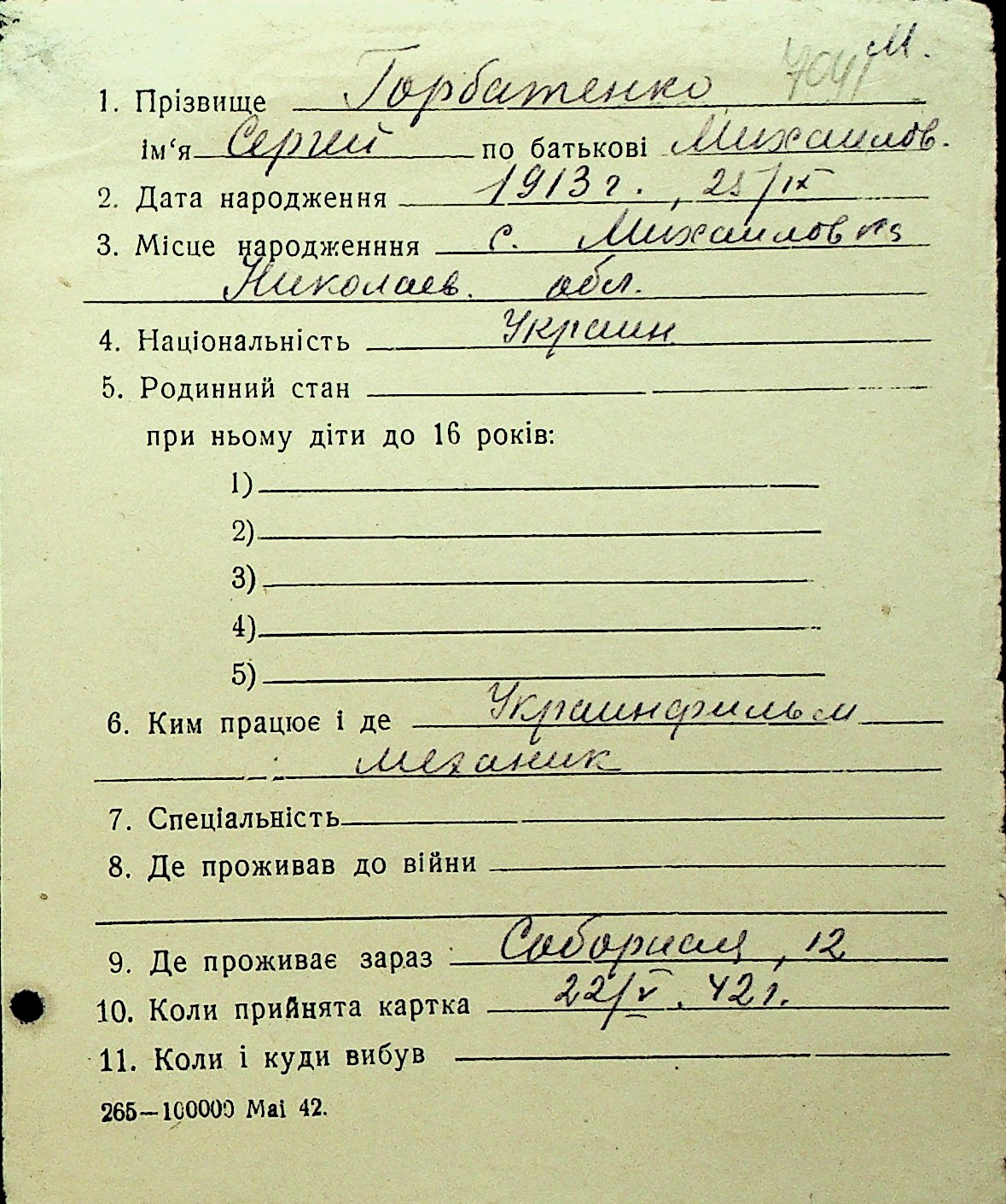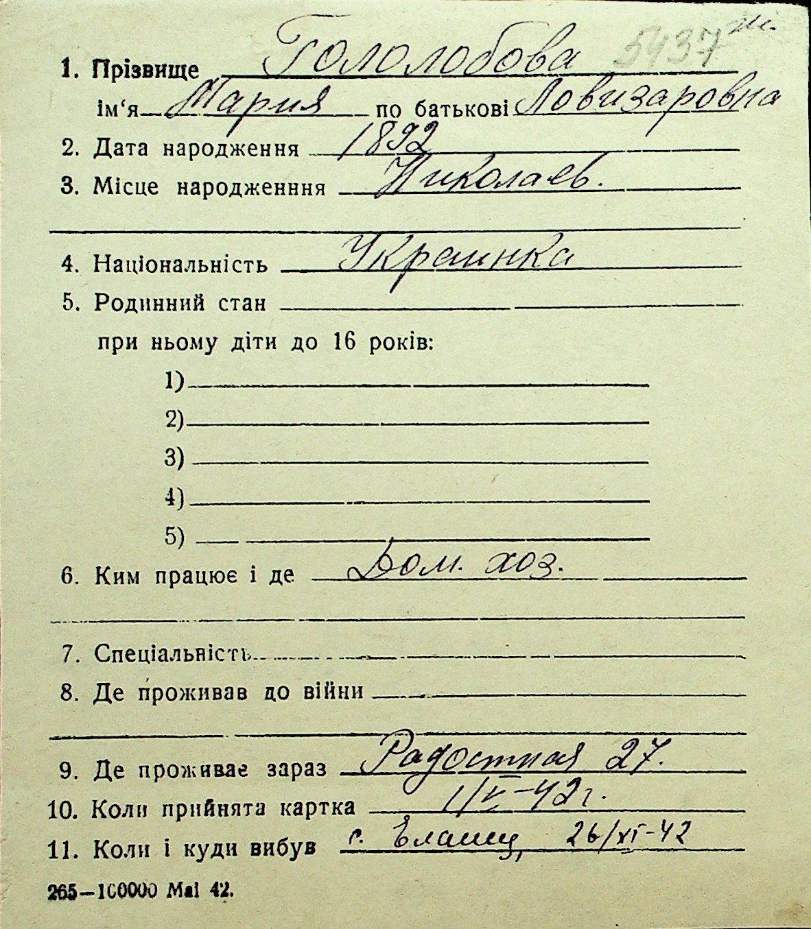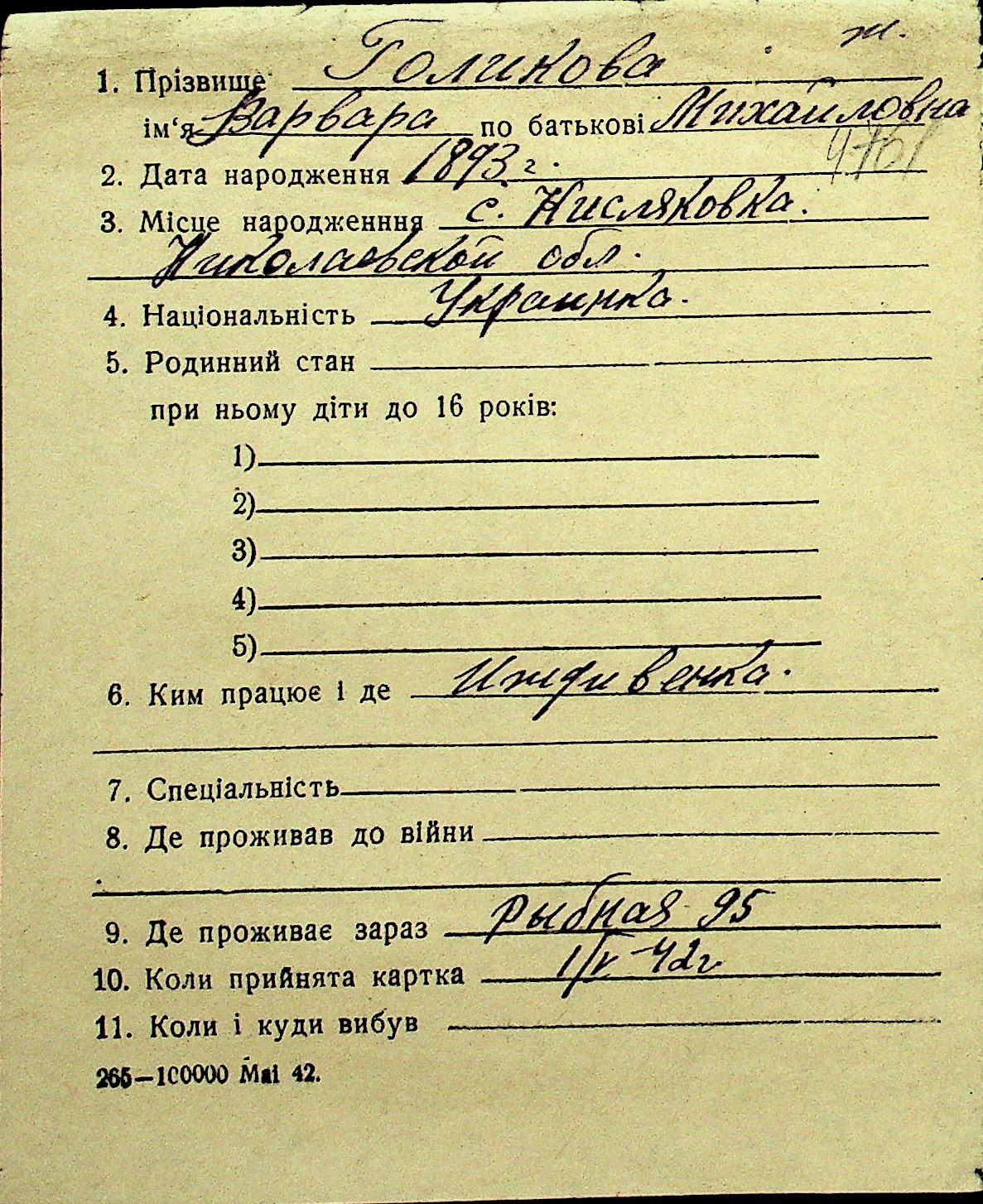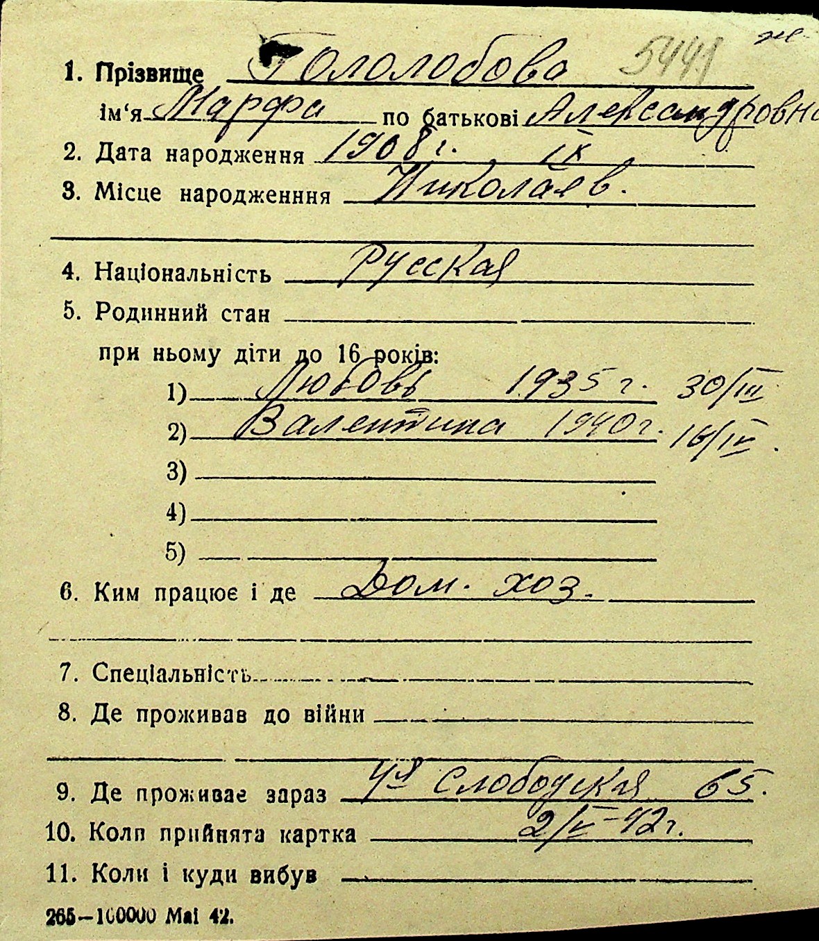 • • Перелік карток до фонду № Н-1016