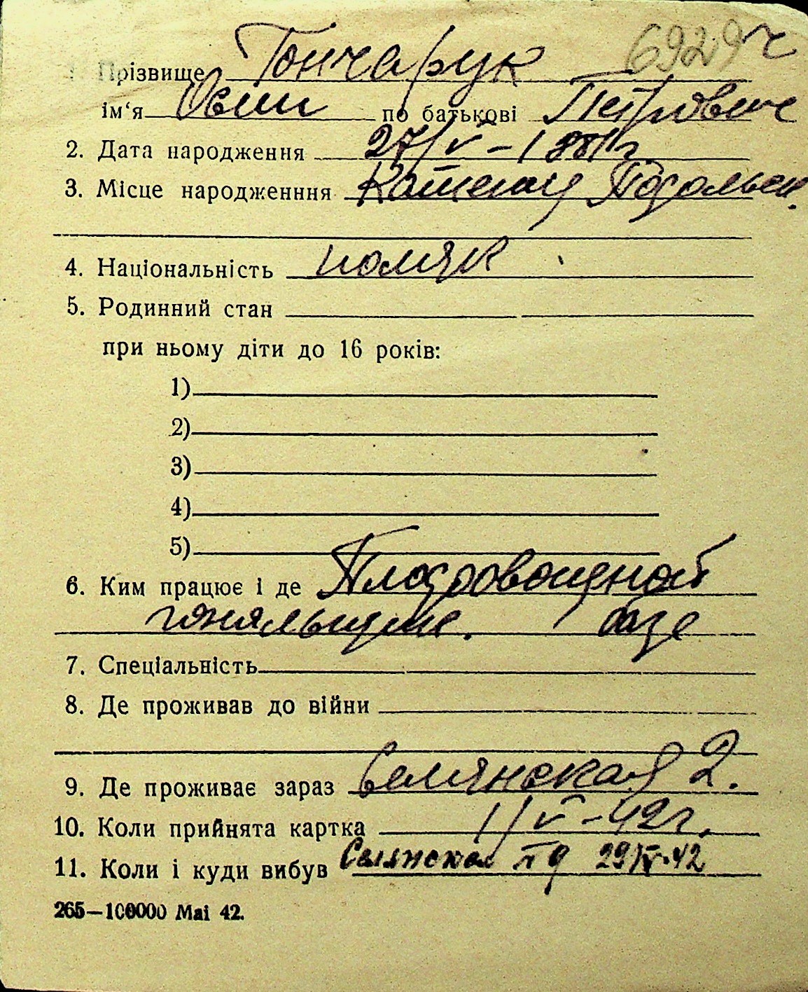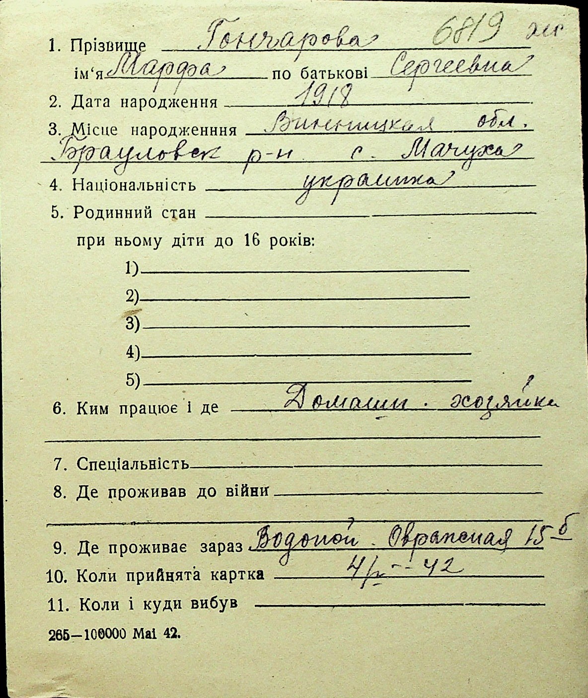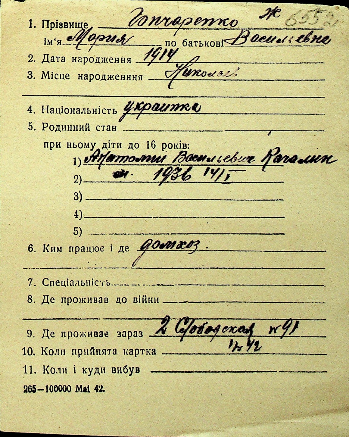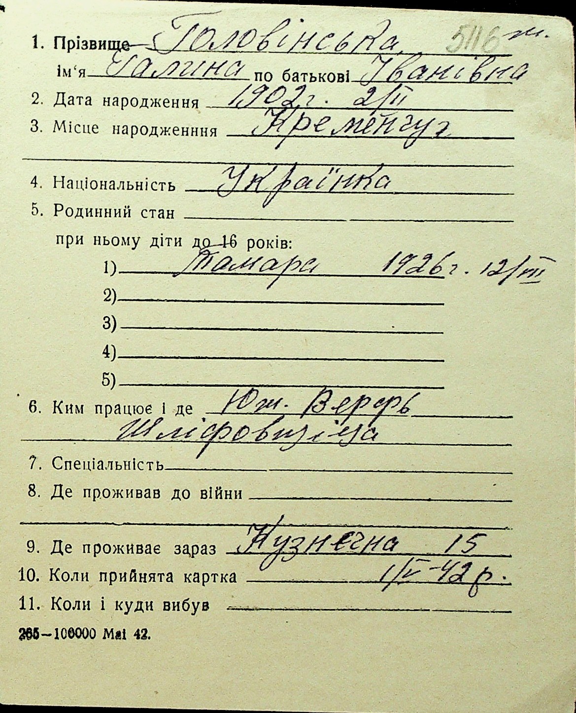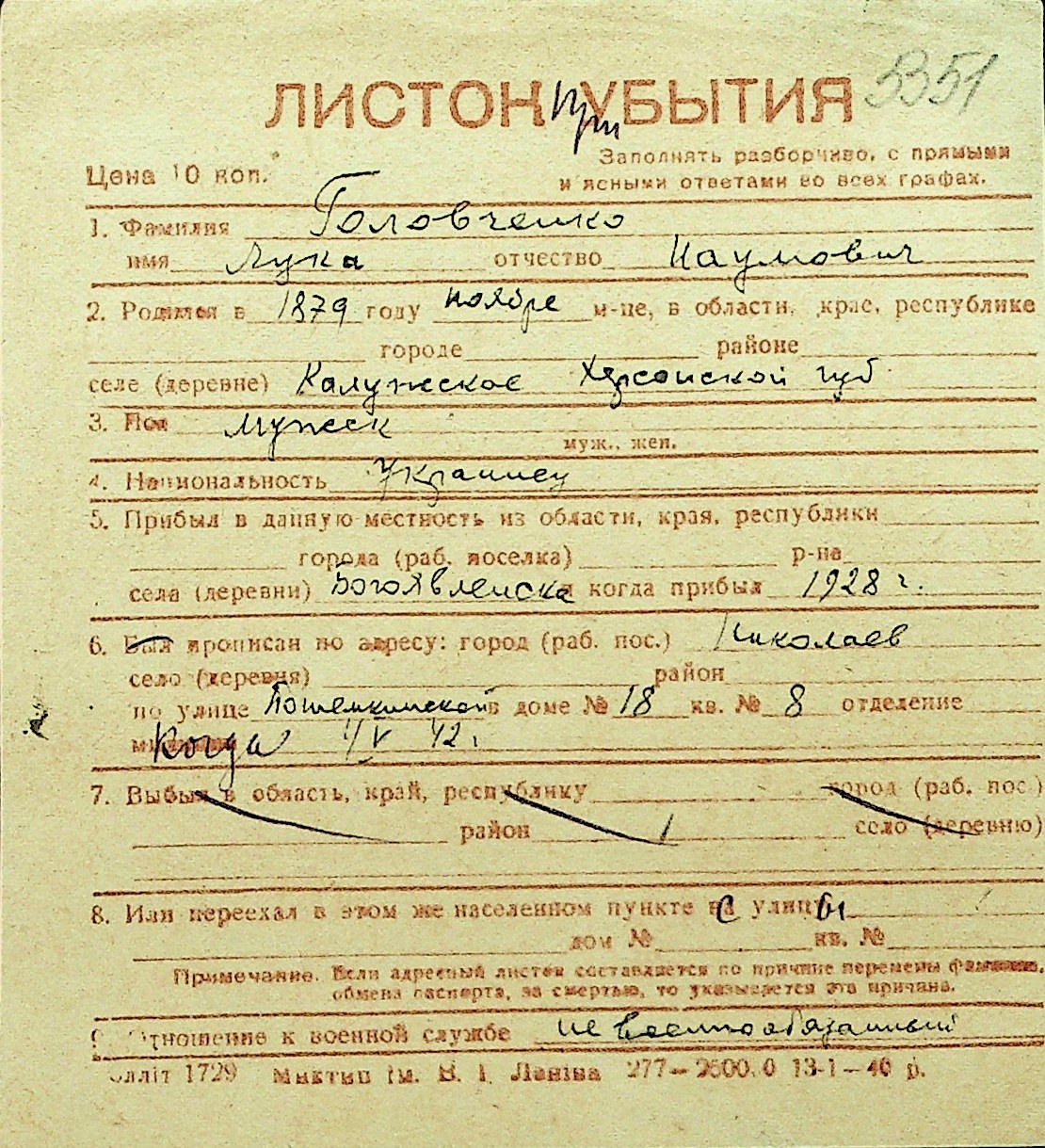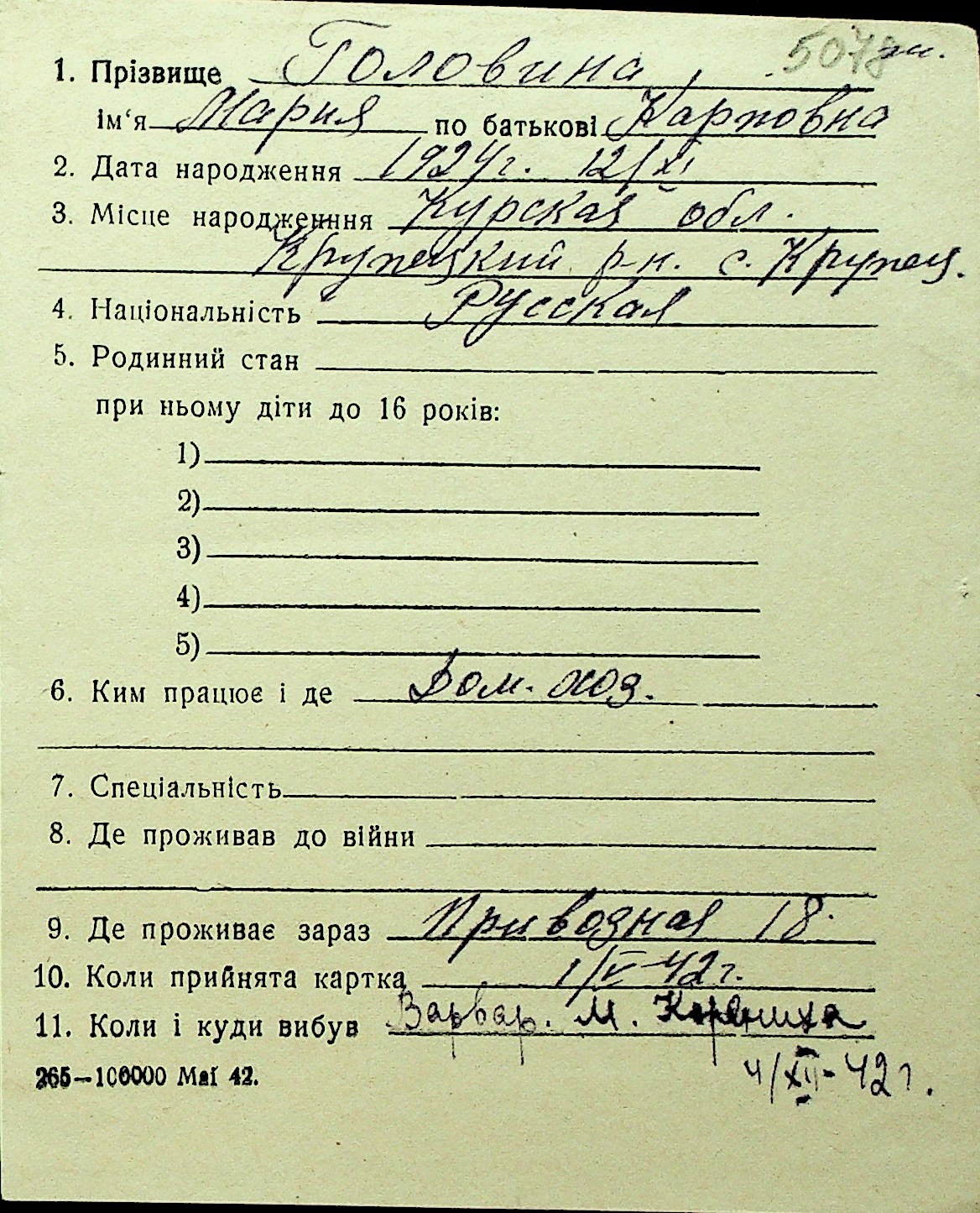 • • Перелік карток до фонду № Н-1016