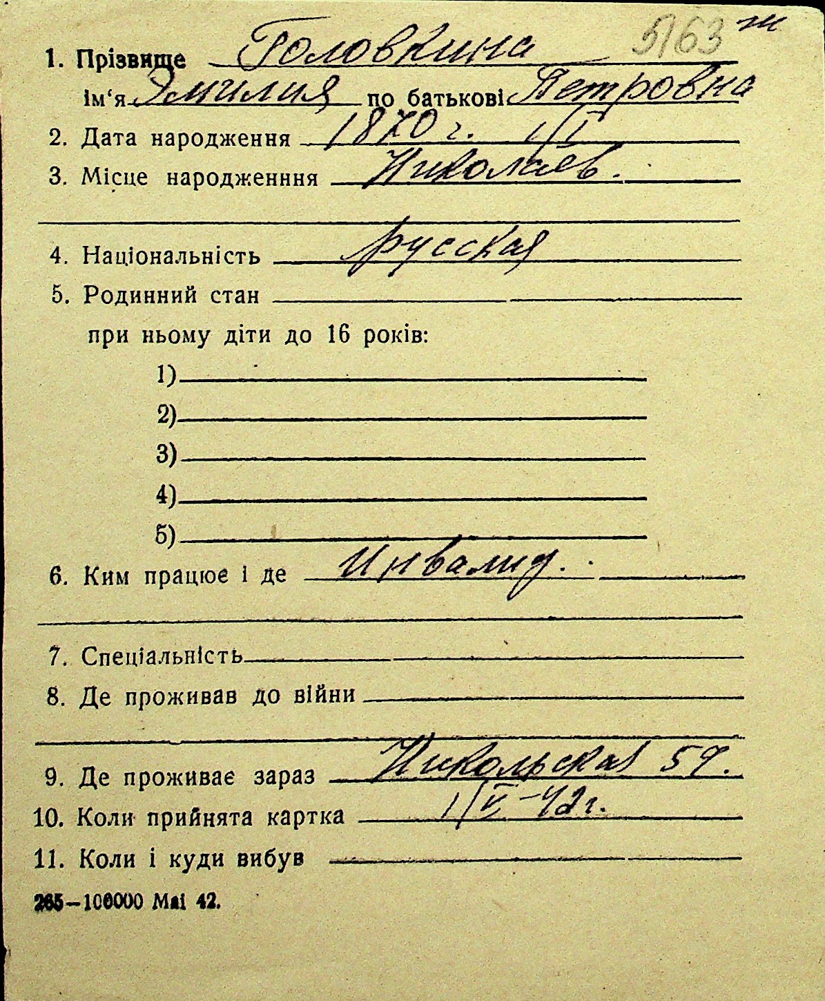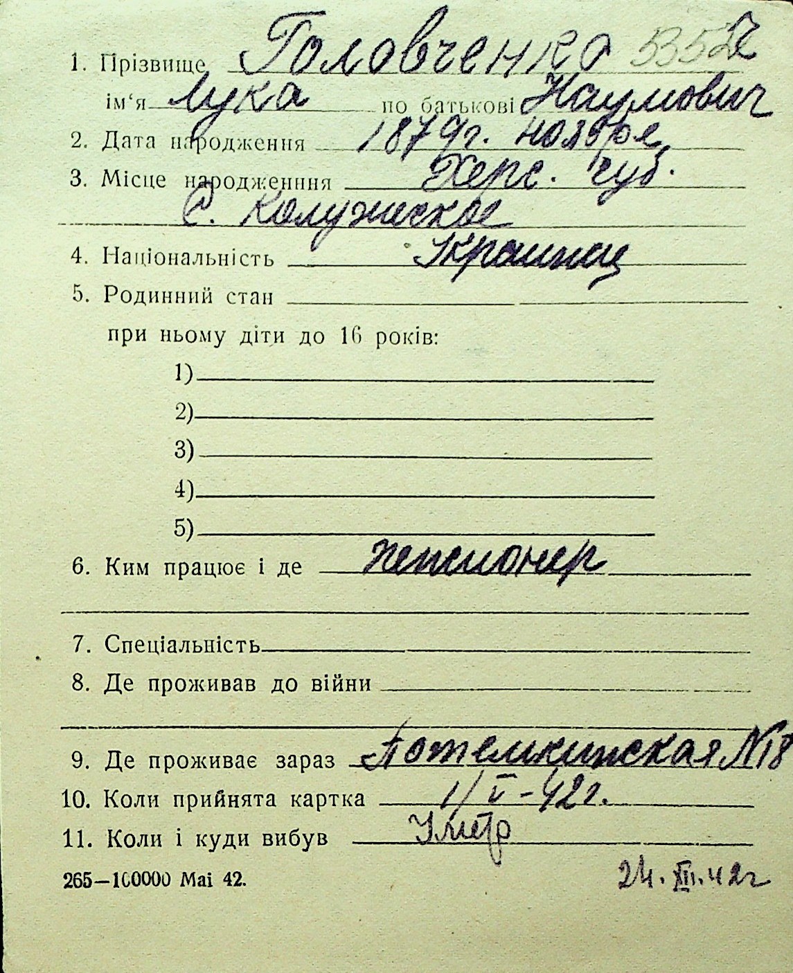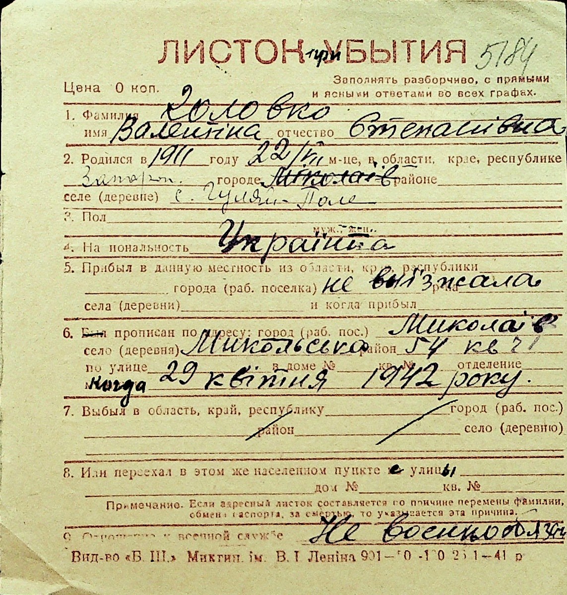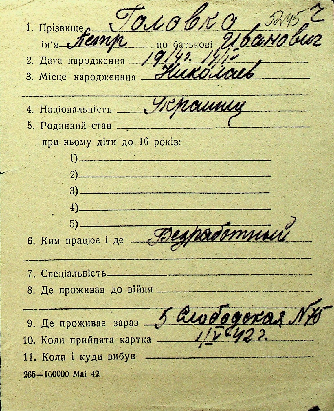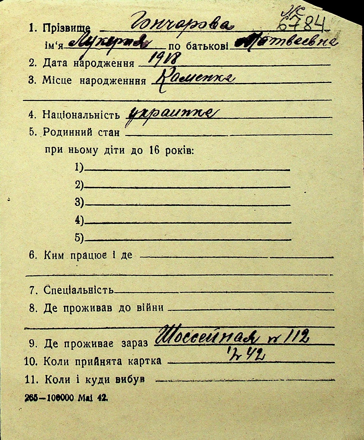 • • Перелік карток до фонду № Н-1016
