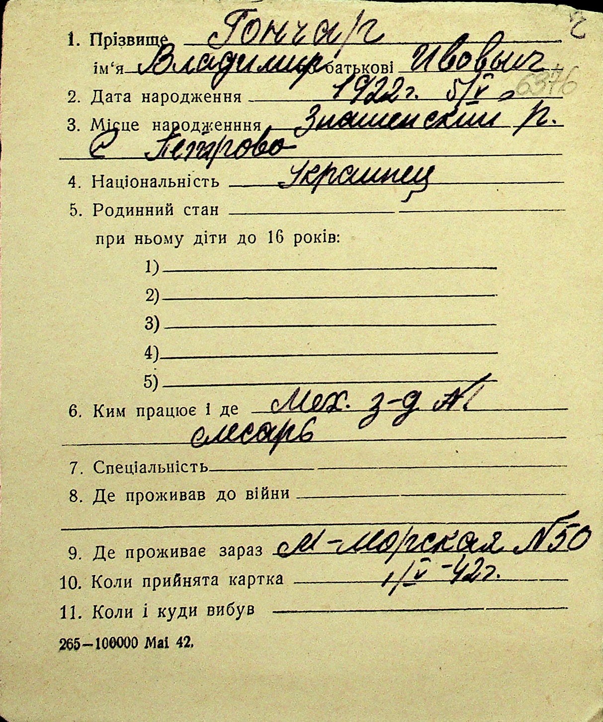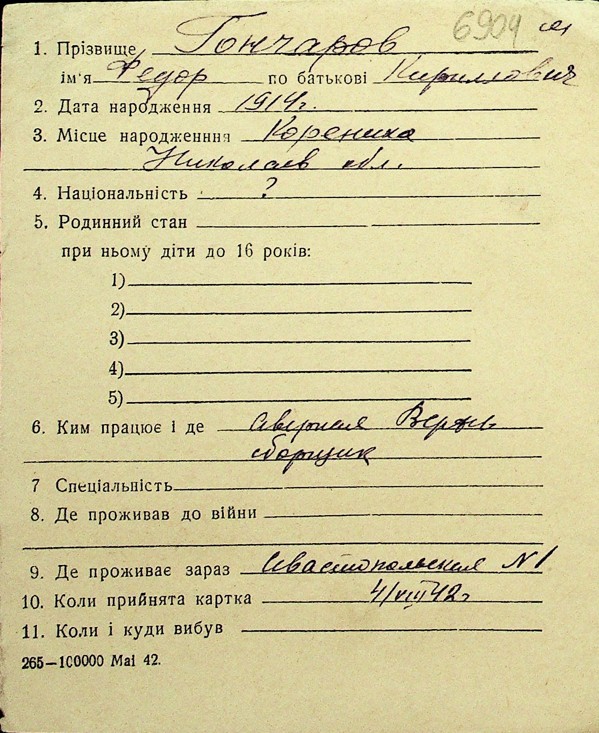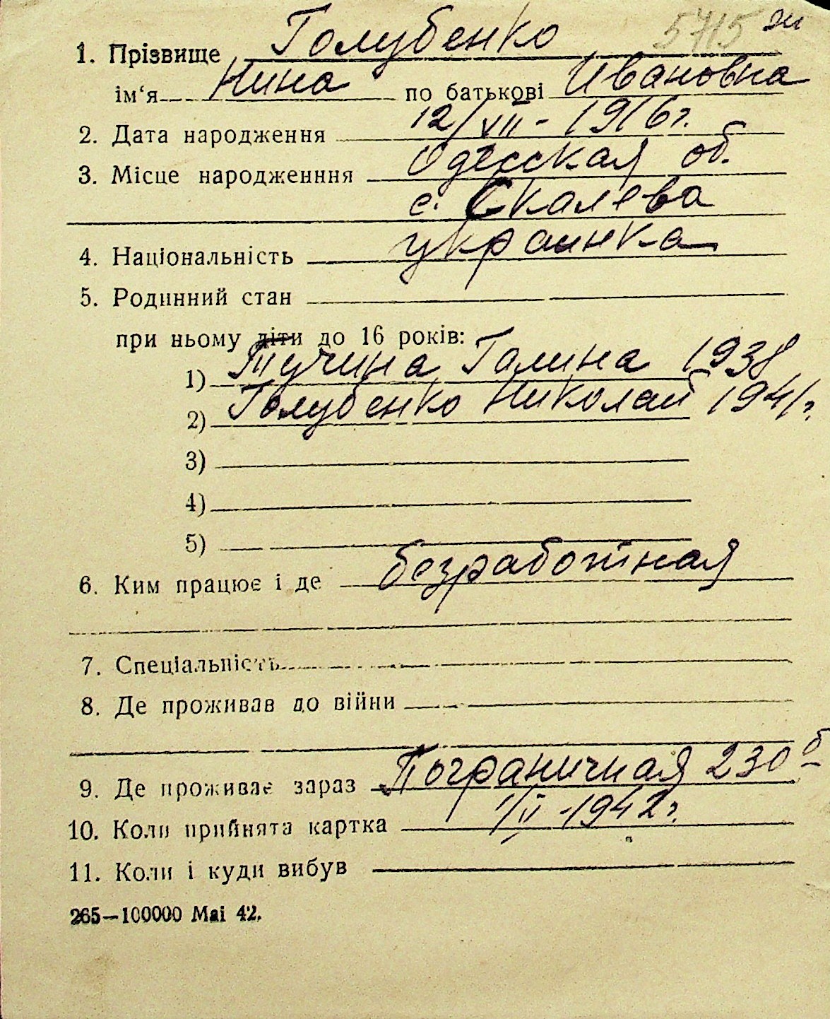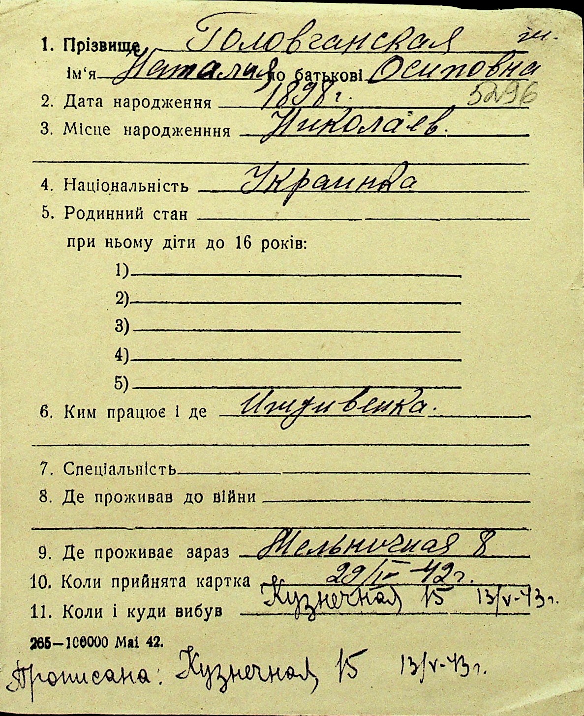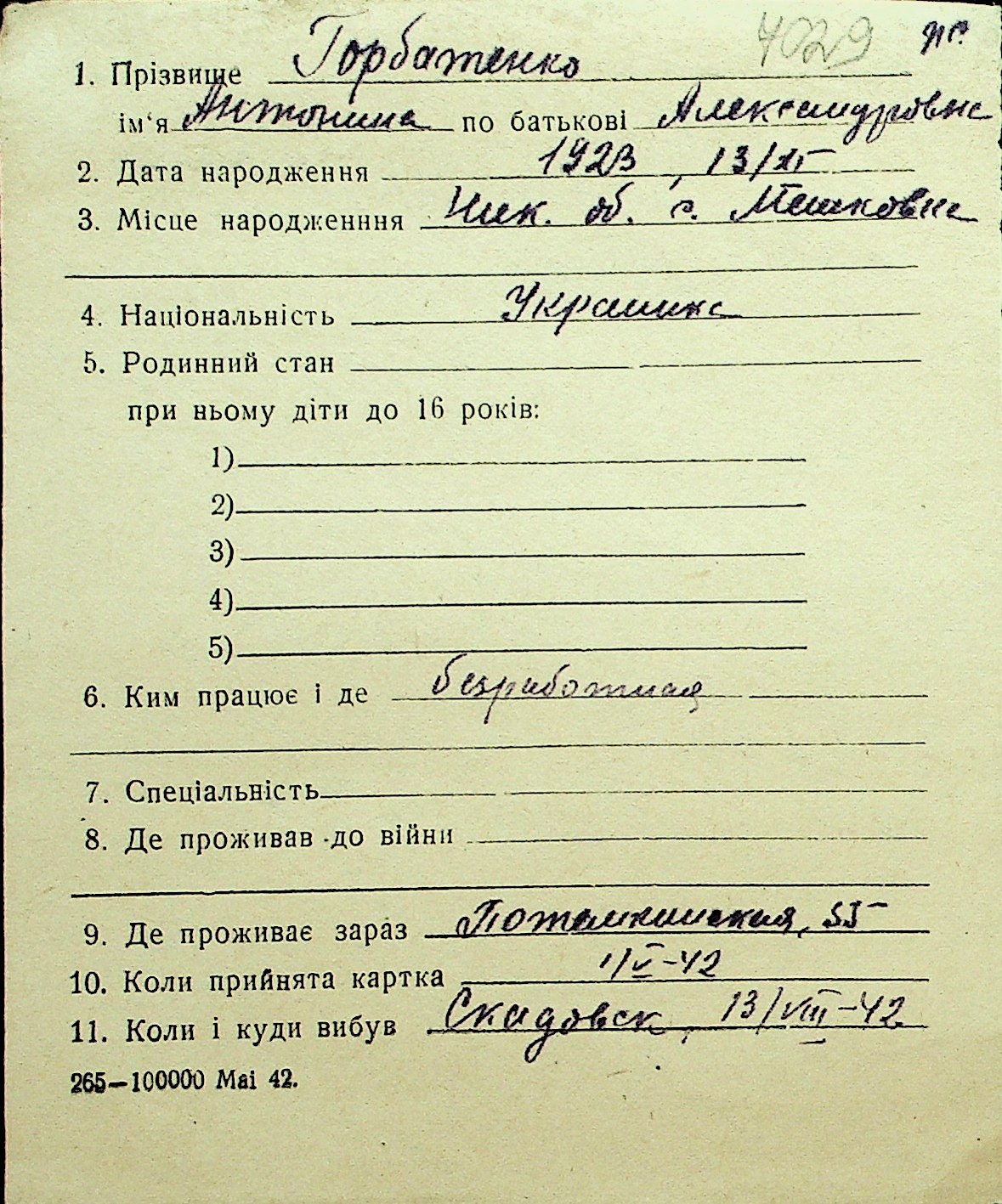 • • Перелік карток до фонду № Н-1016