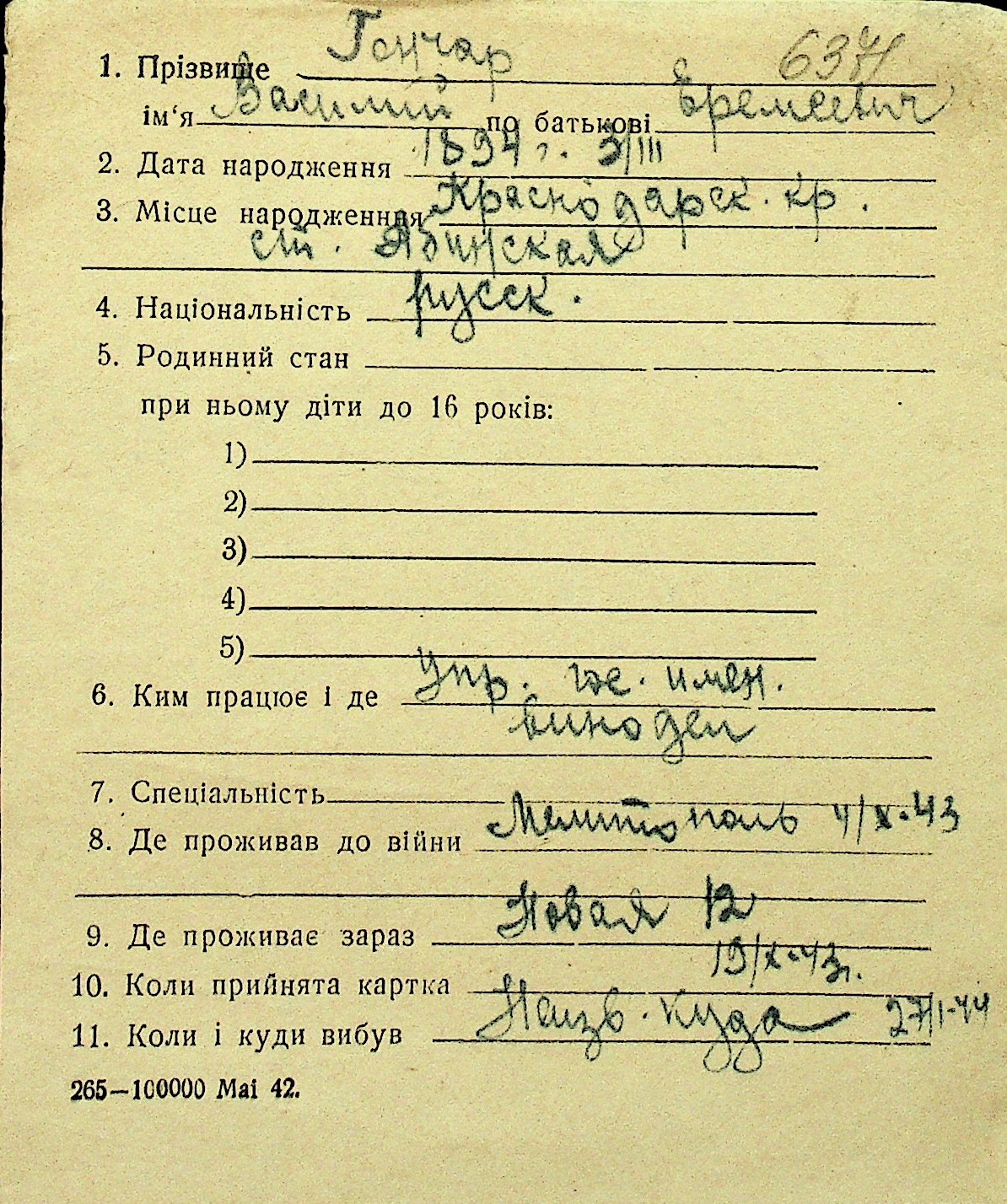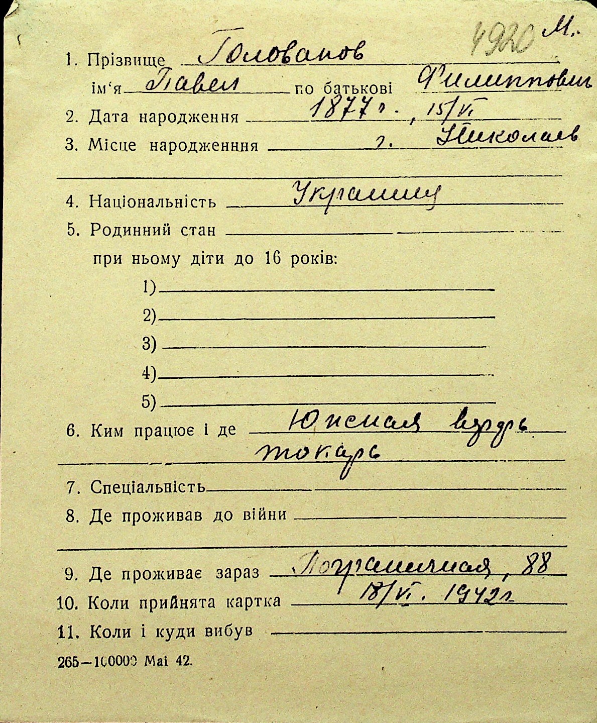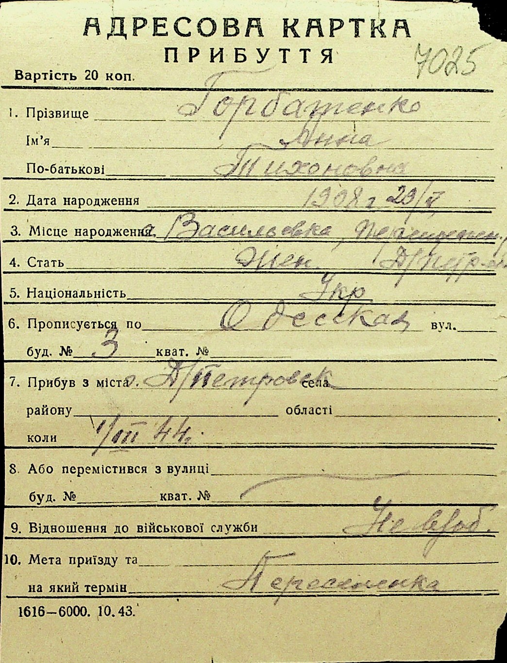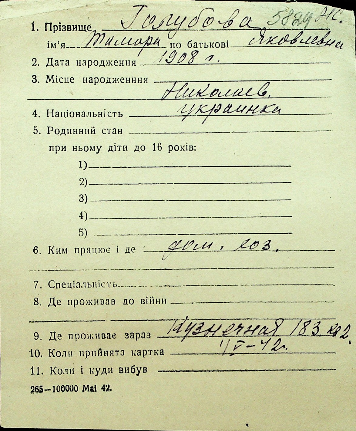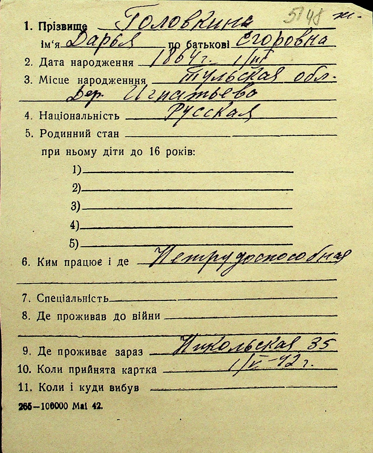 • • Перелік карток до фонду № Н-1016